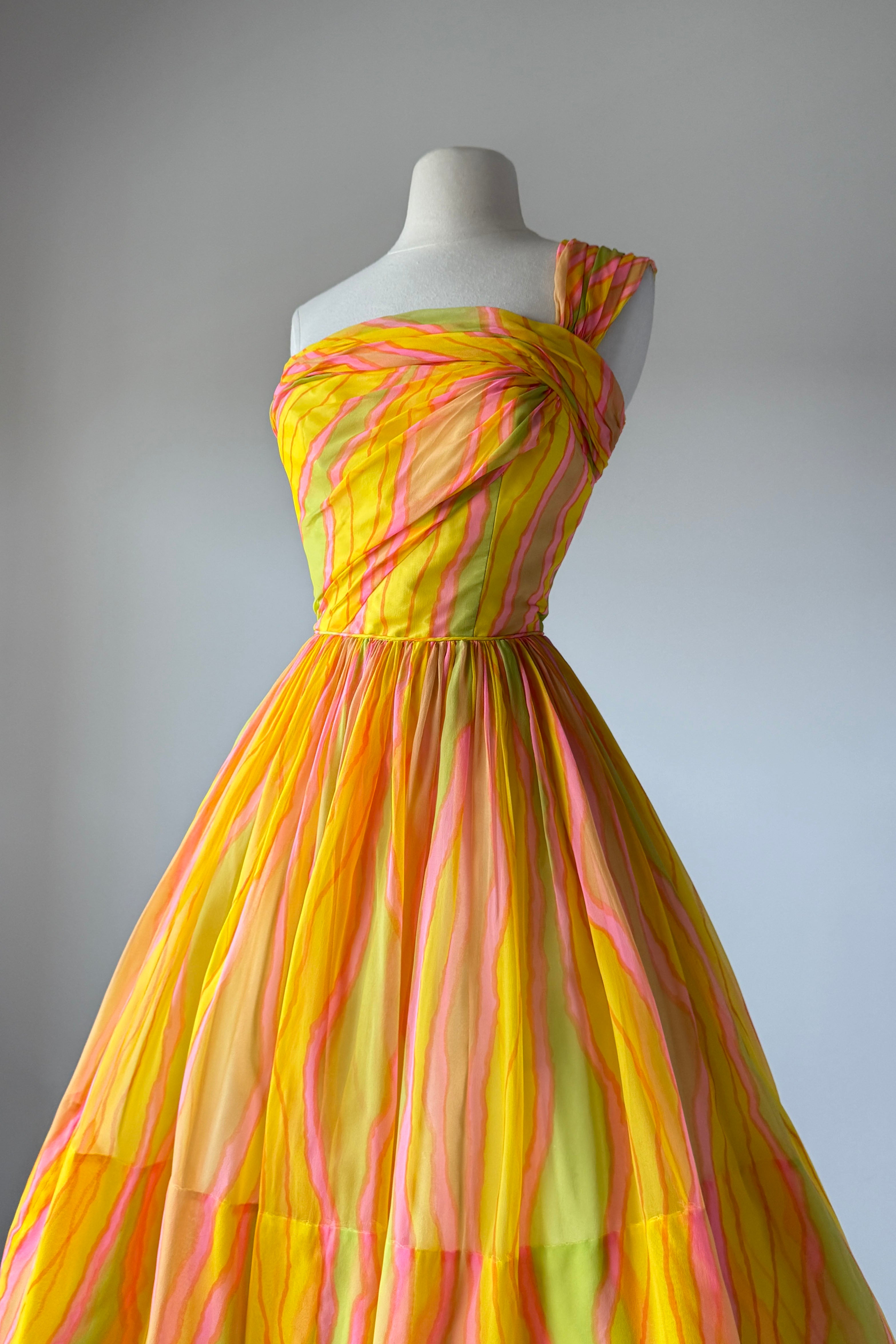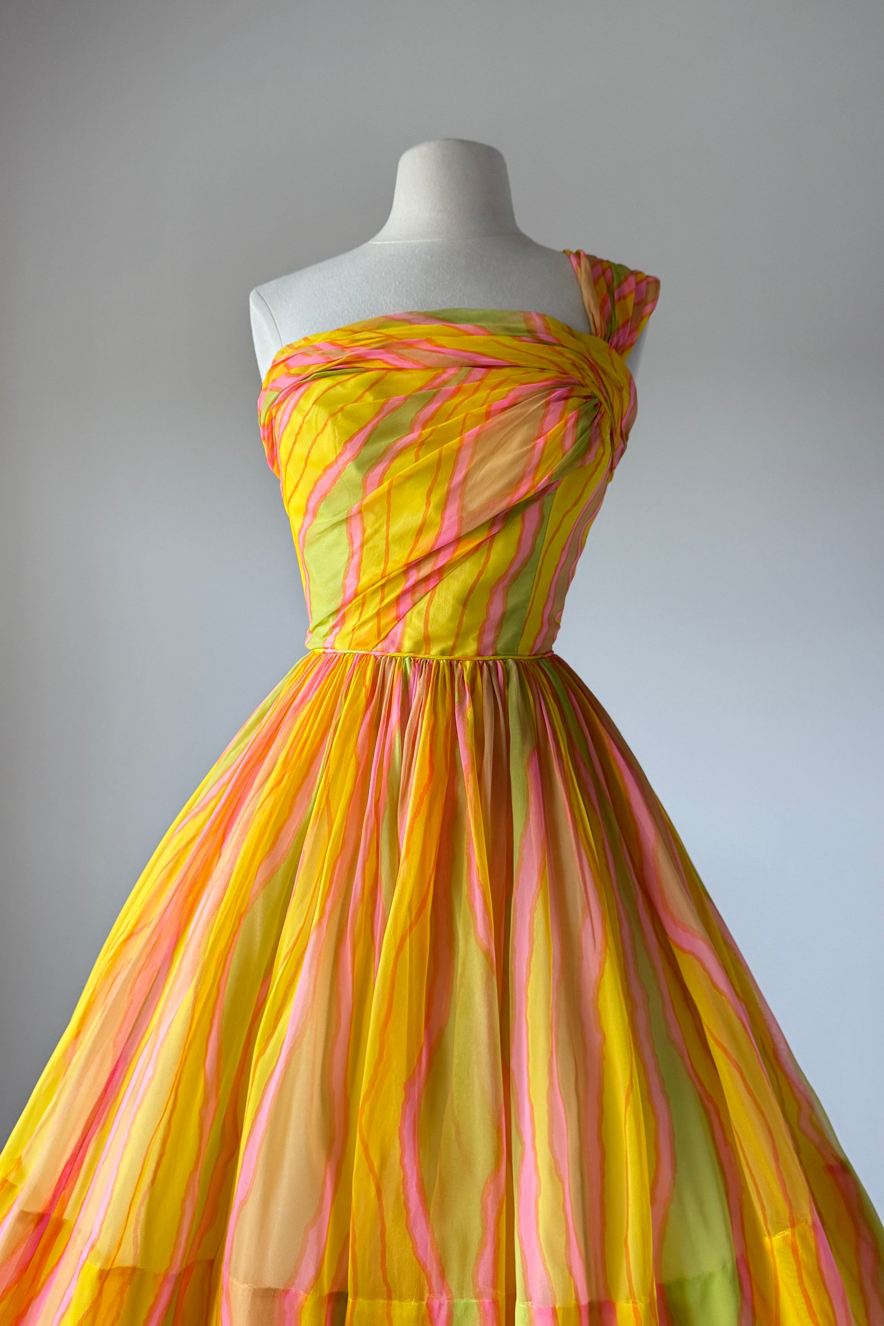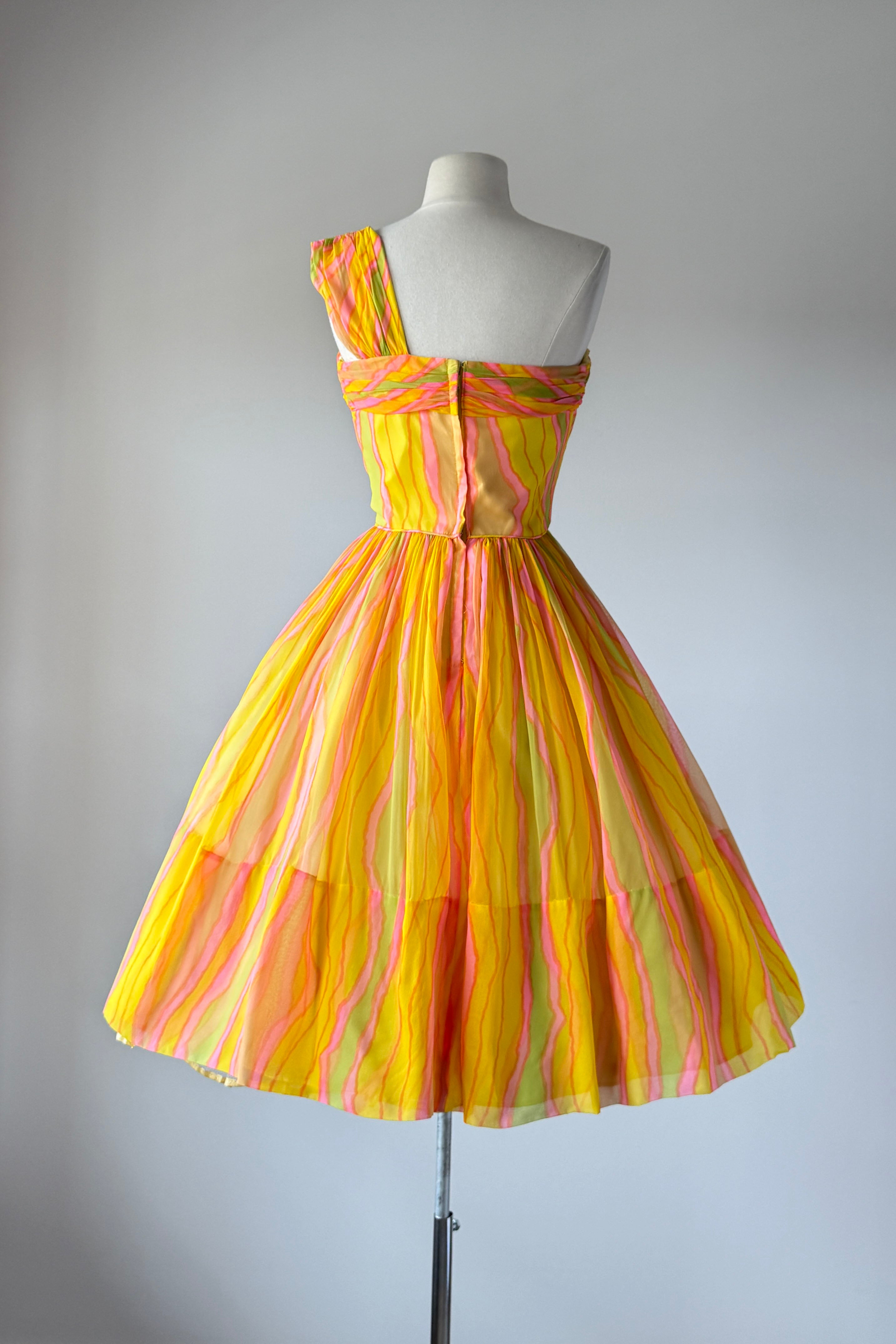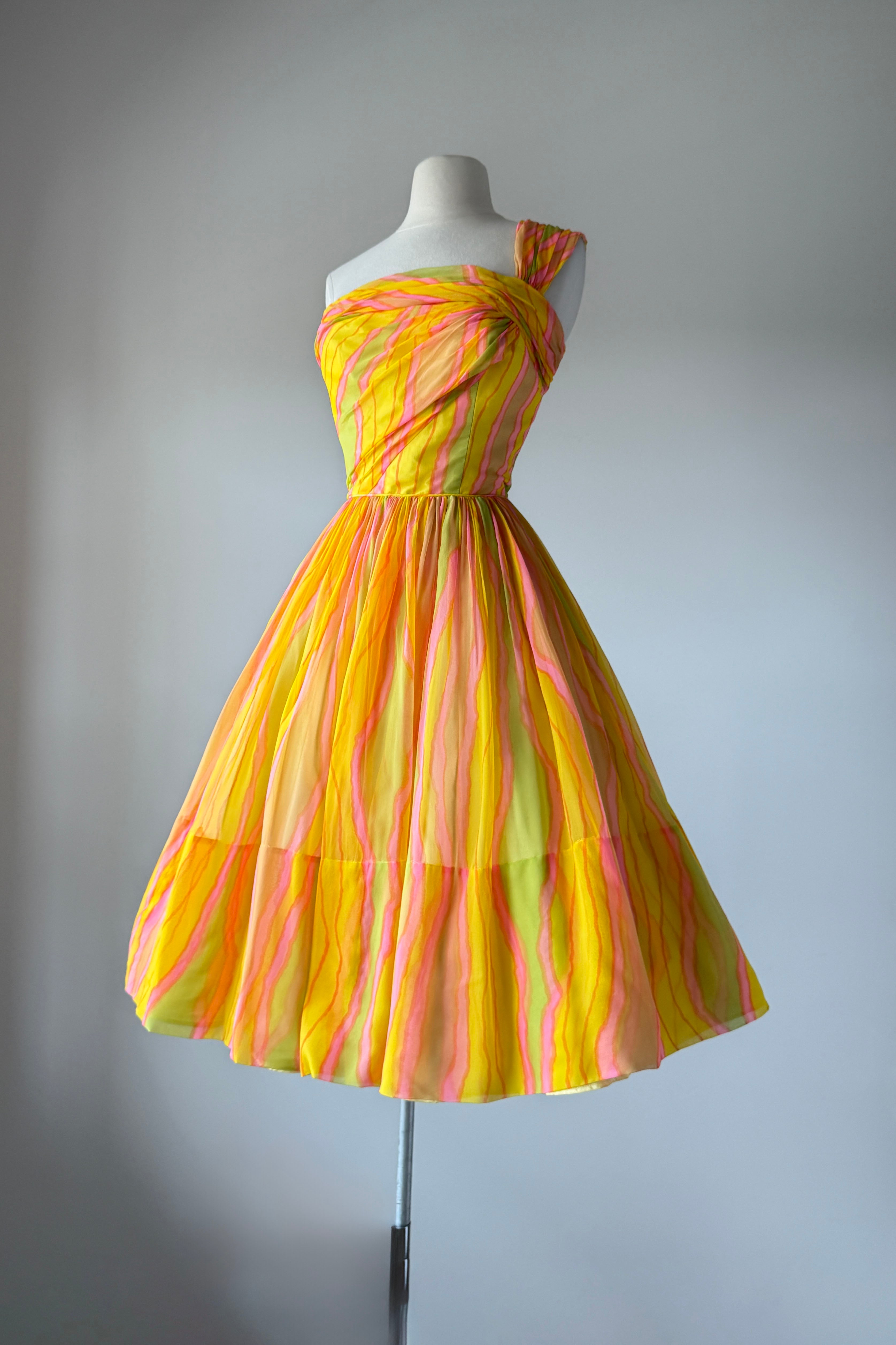 VINTAGE DRESSVintage 1950s dress. Features day-glo neon rayon crepe, acetate lining with detachable tulle petticoat. One shoulder design, metal back zipper. From Neusteter's.. Excellent condition. Fits like XS/S. Length 41.5Bodice 16Bust 34Waist 26As with all vintage, please expect wear consistent with age. All sales are final. No order cancellations.0921 | 2612