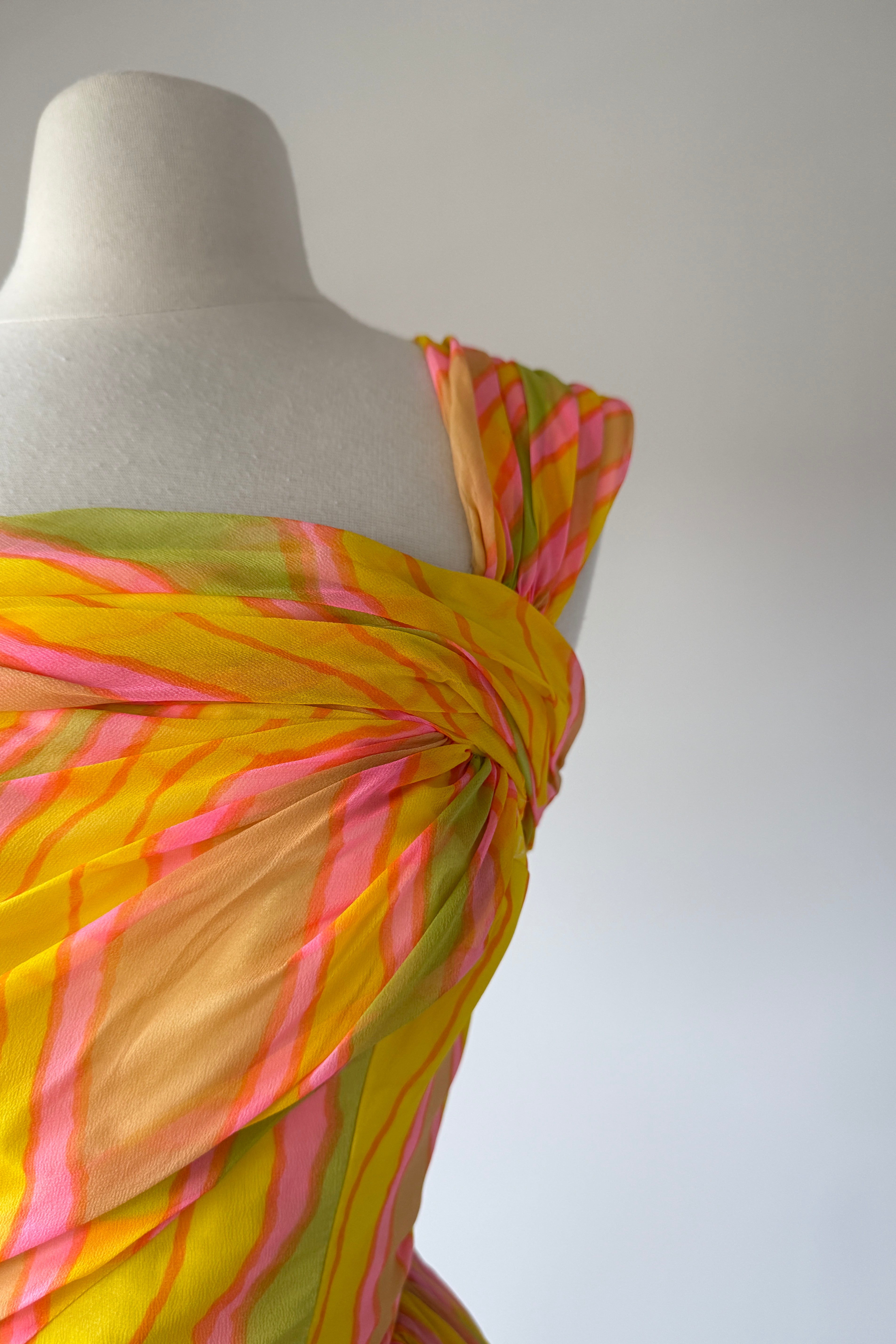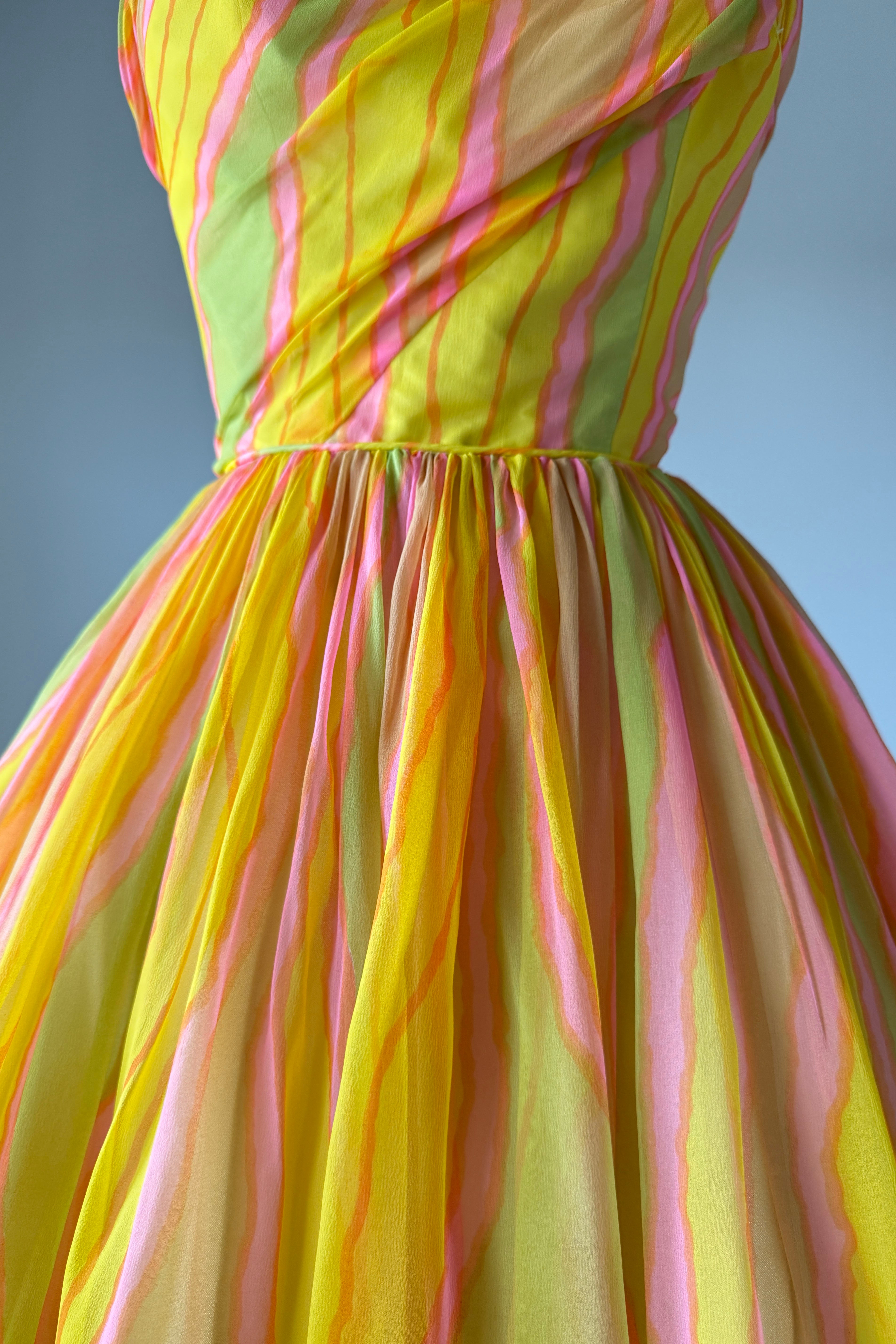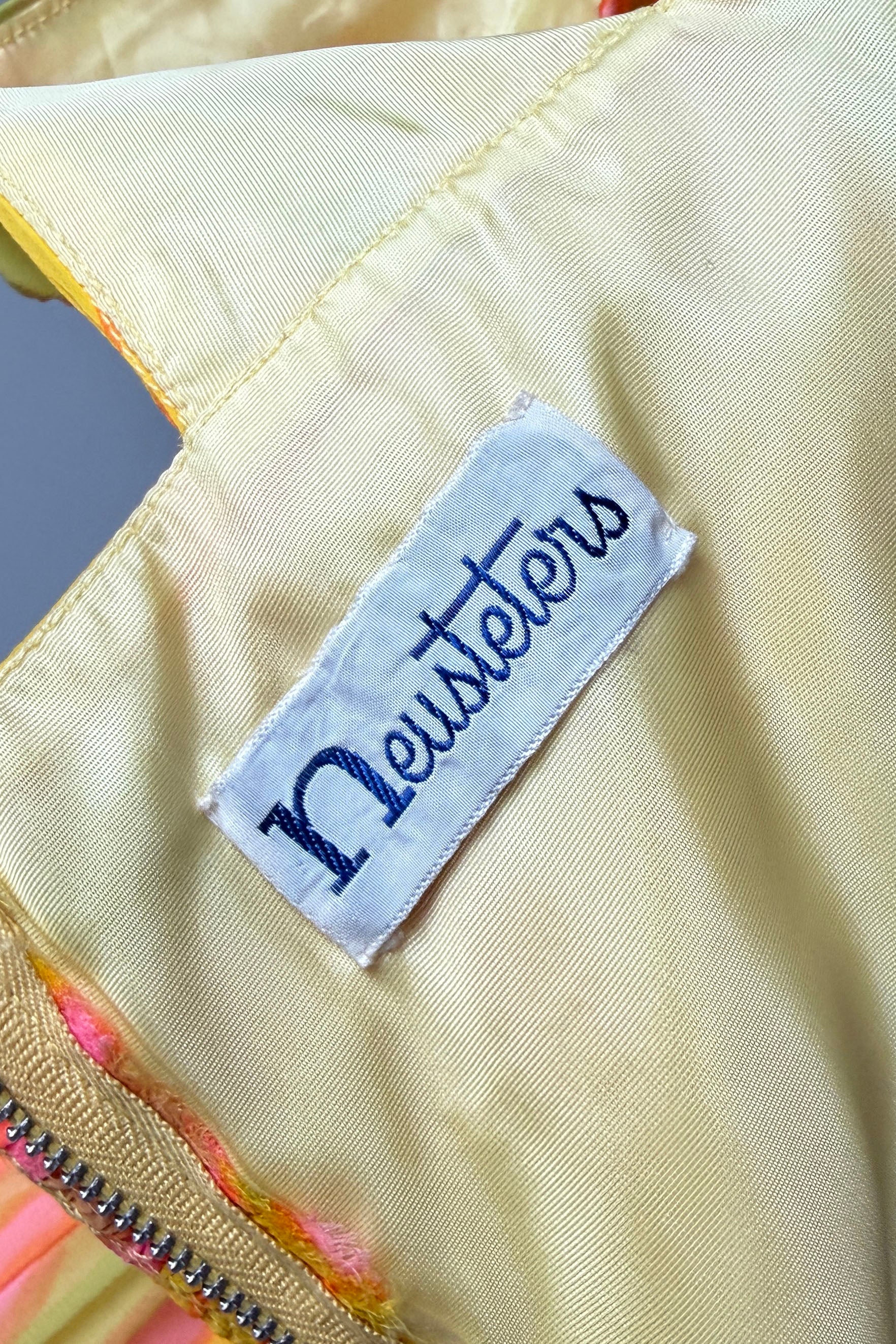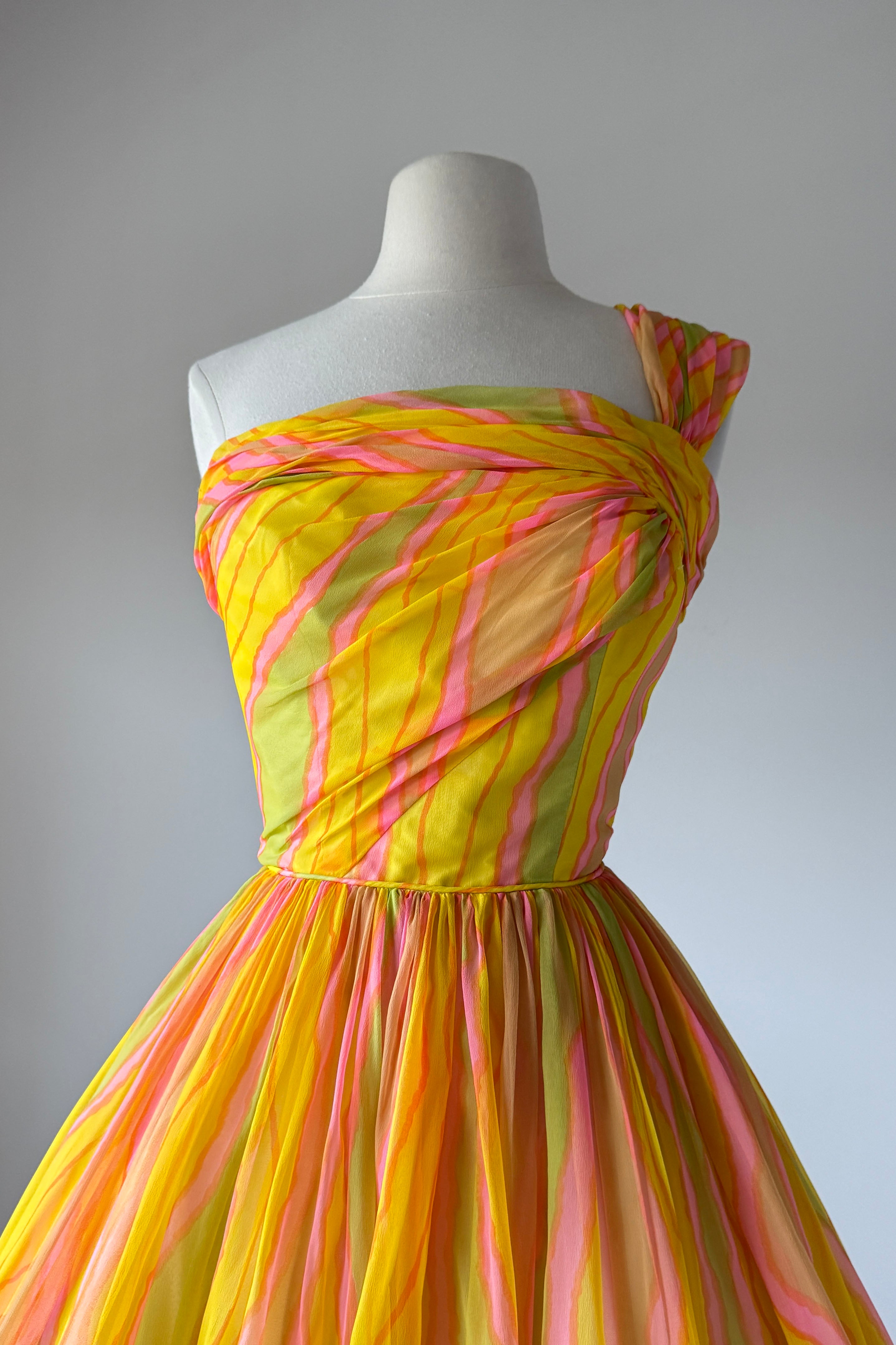 VINTAGE DRESSVintage 1950s dress. Features day-glo neon rayon crepe, acetate lining with detachable tulle petticoat. One shoulder design, metal back zipper. From Neusteter's.. Excellent condition. Fits like XS/S. Length 41.5Bodice 16Bust 34Waist 26As with all vintage, please expect wear consistent with age. All sales are final. No order cancellations.0921 | 2612