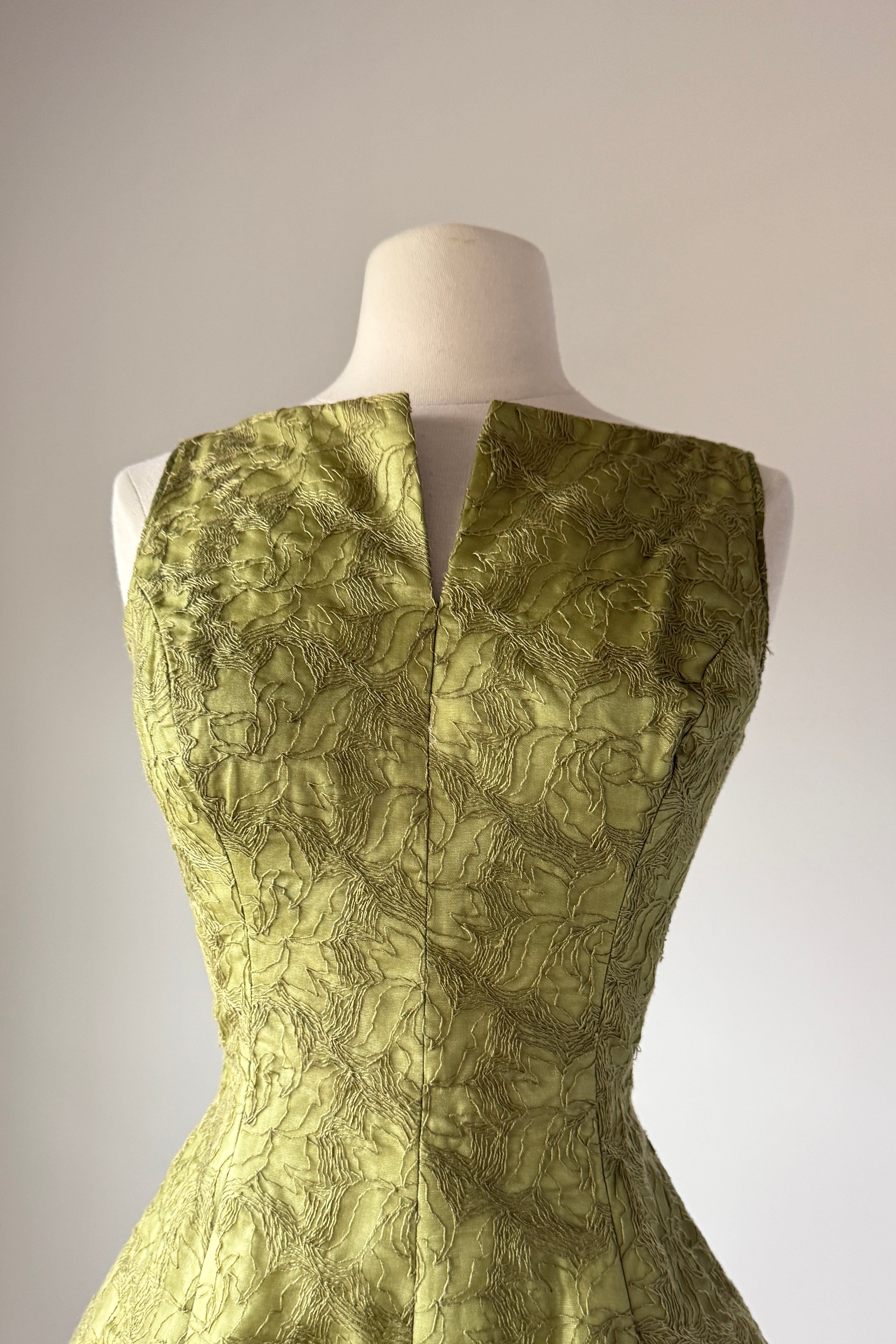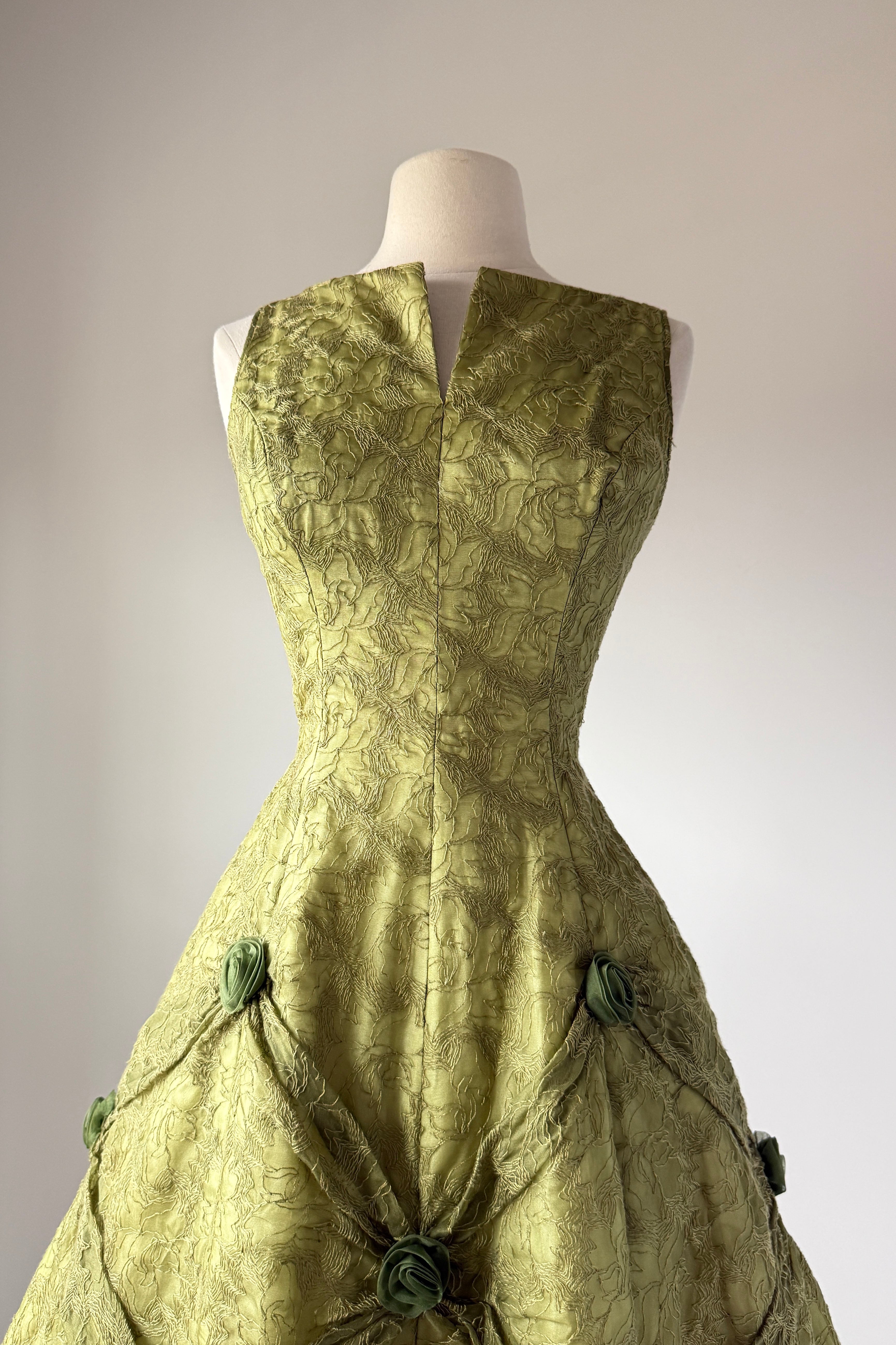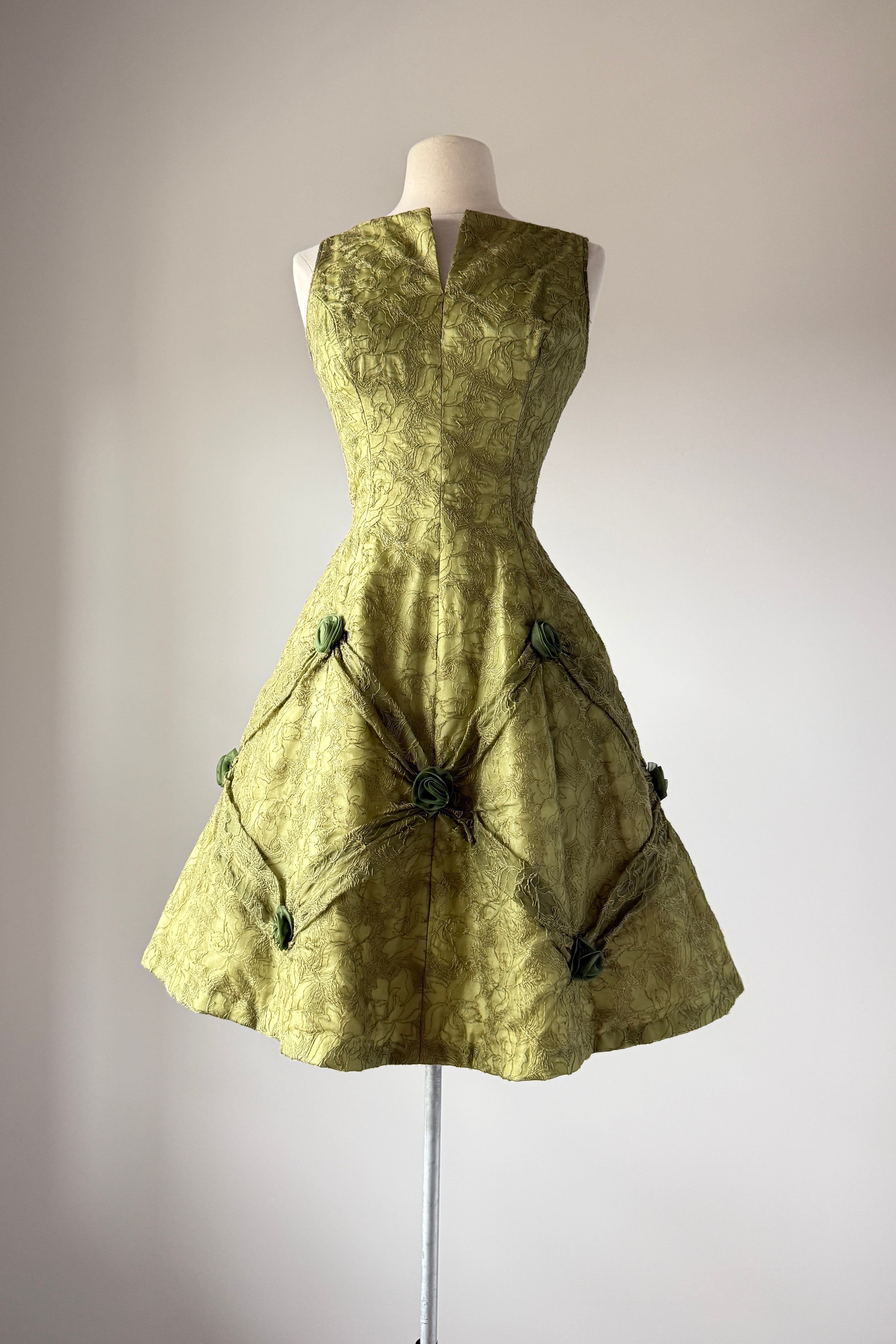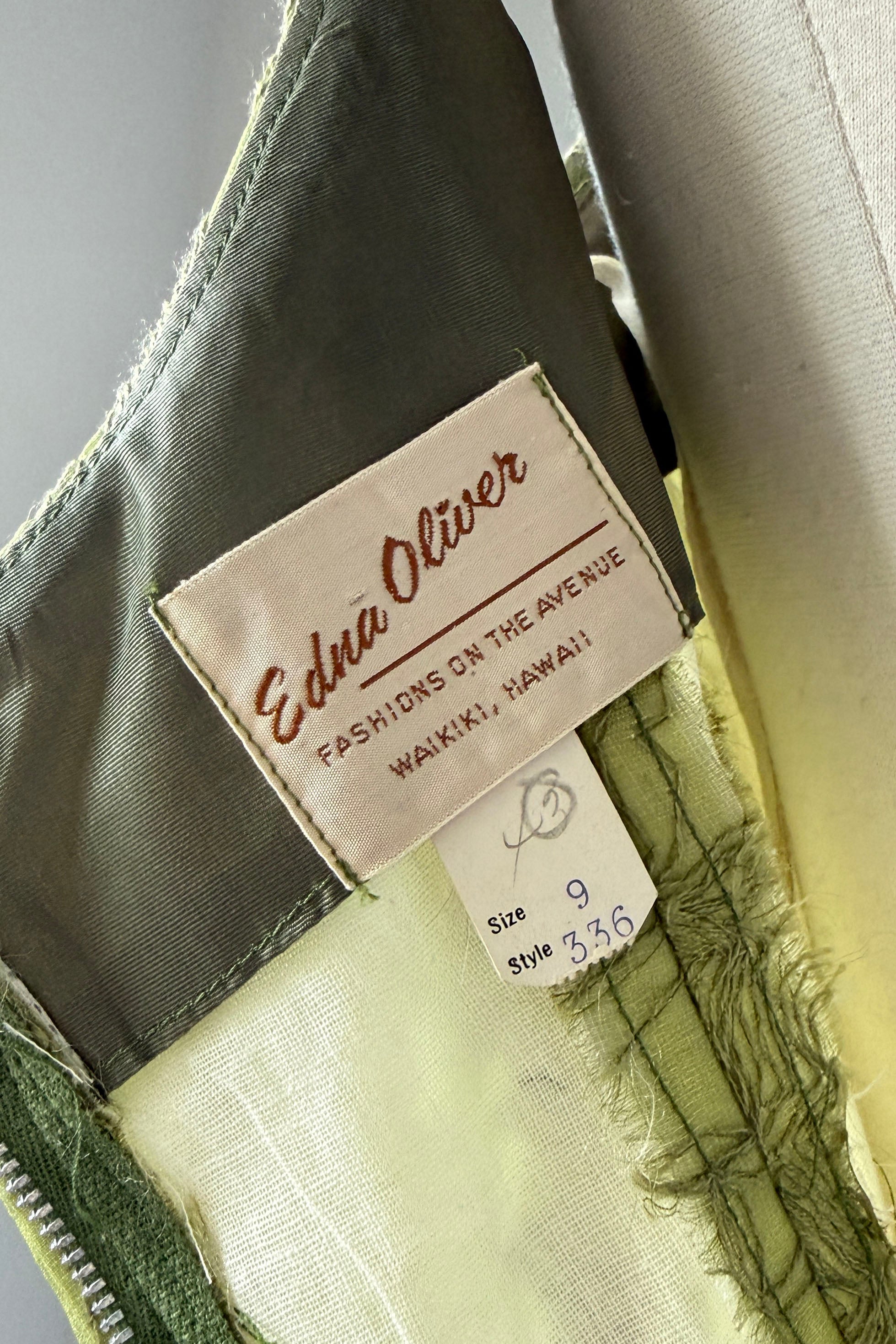 VINTAGE DRESSVintage 1950s dress. Features olive green embroidered chiffon over pelon backing, rosettes on skirt, metal back zipper. By Edna Oliver for Fashions on the Avenue of Waikiki.Excellent condition. One tiny hole in chiffon back skirt (please see photo).Fits like XS/S. Length 36Bodice 15Bust 34Waist 26As with all vintage, please expect wear consistent with age. All sales are final. No order cancellations.0902 | 2610