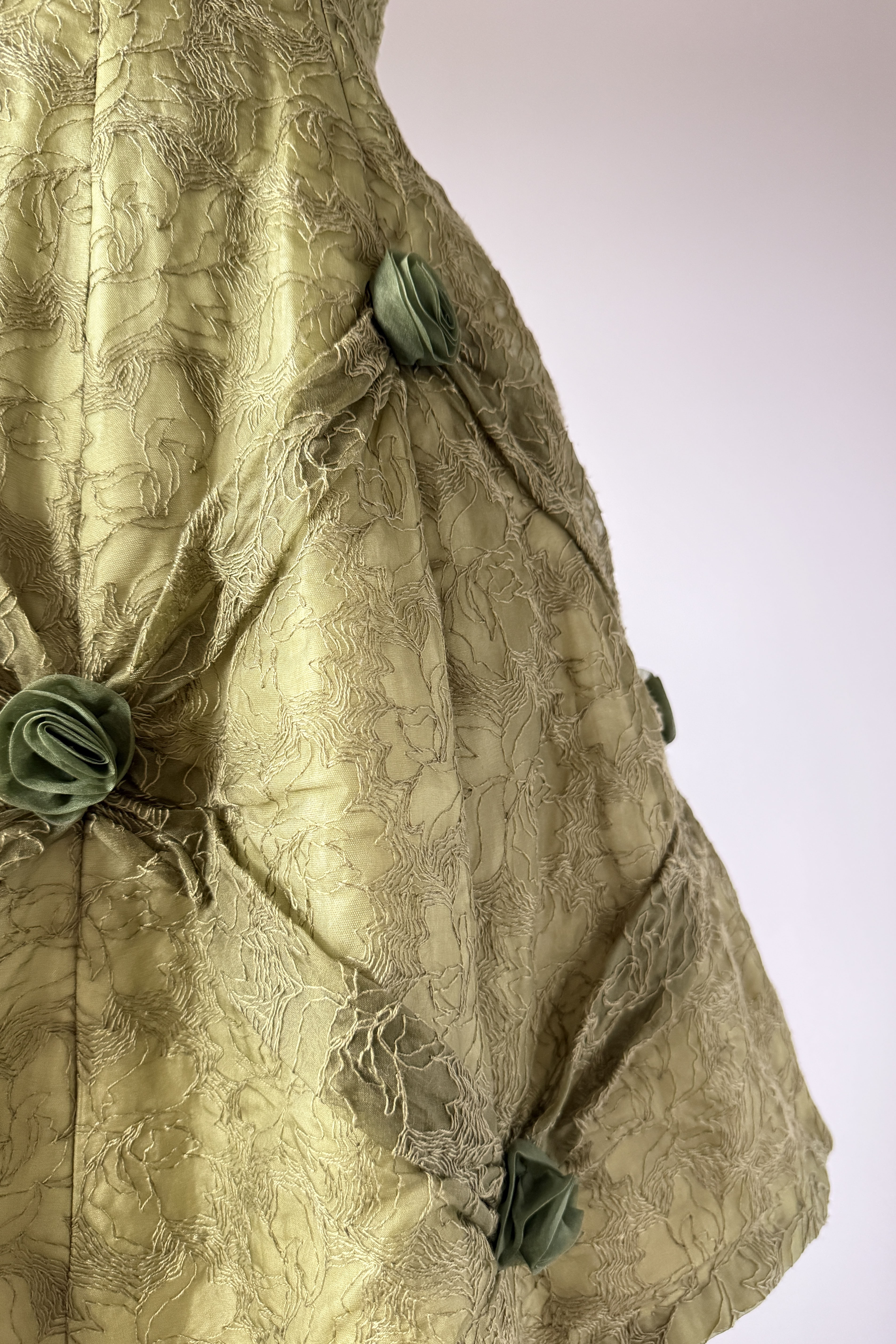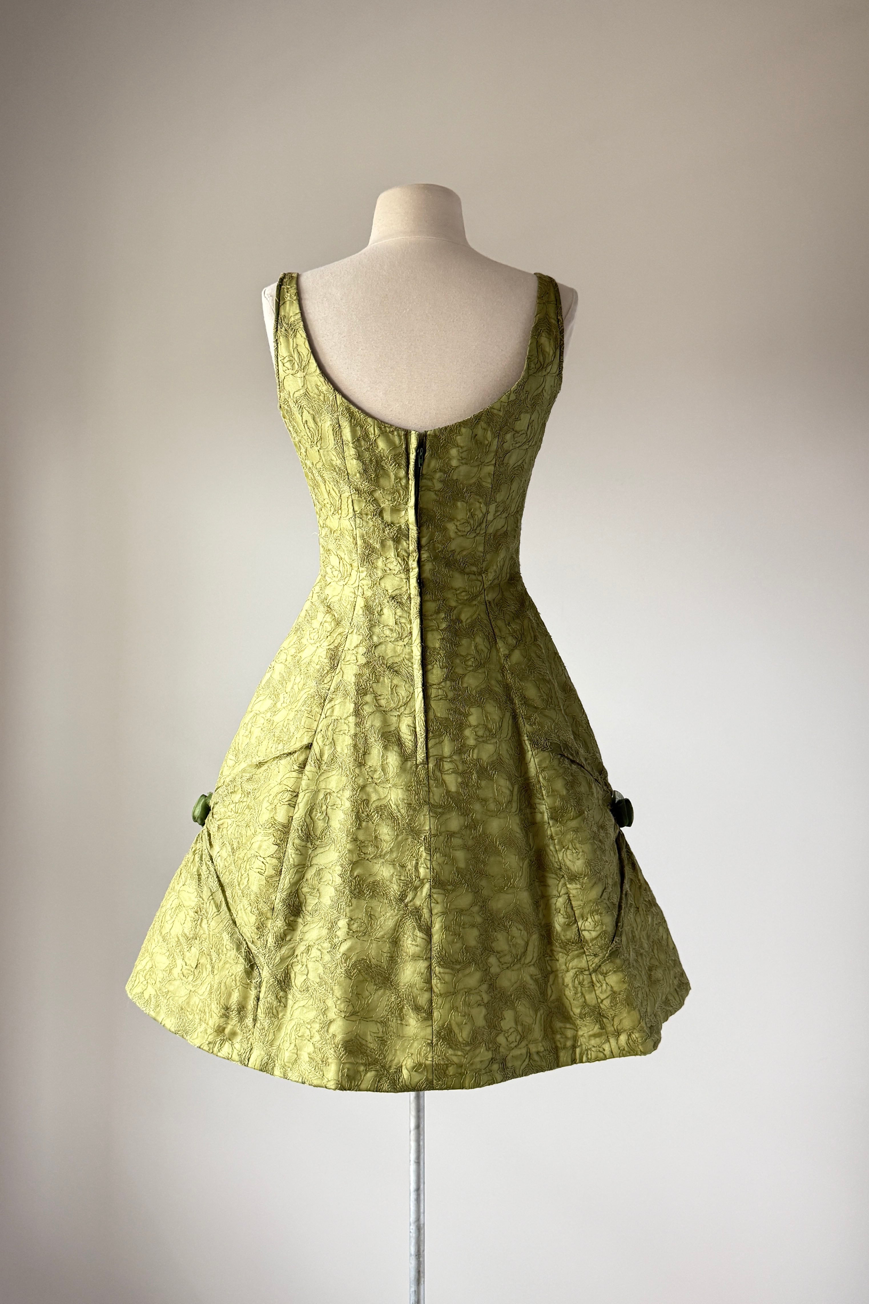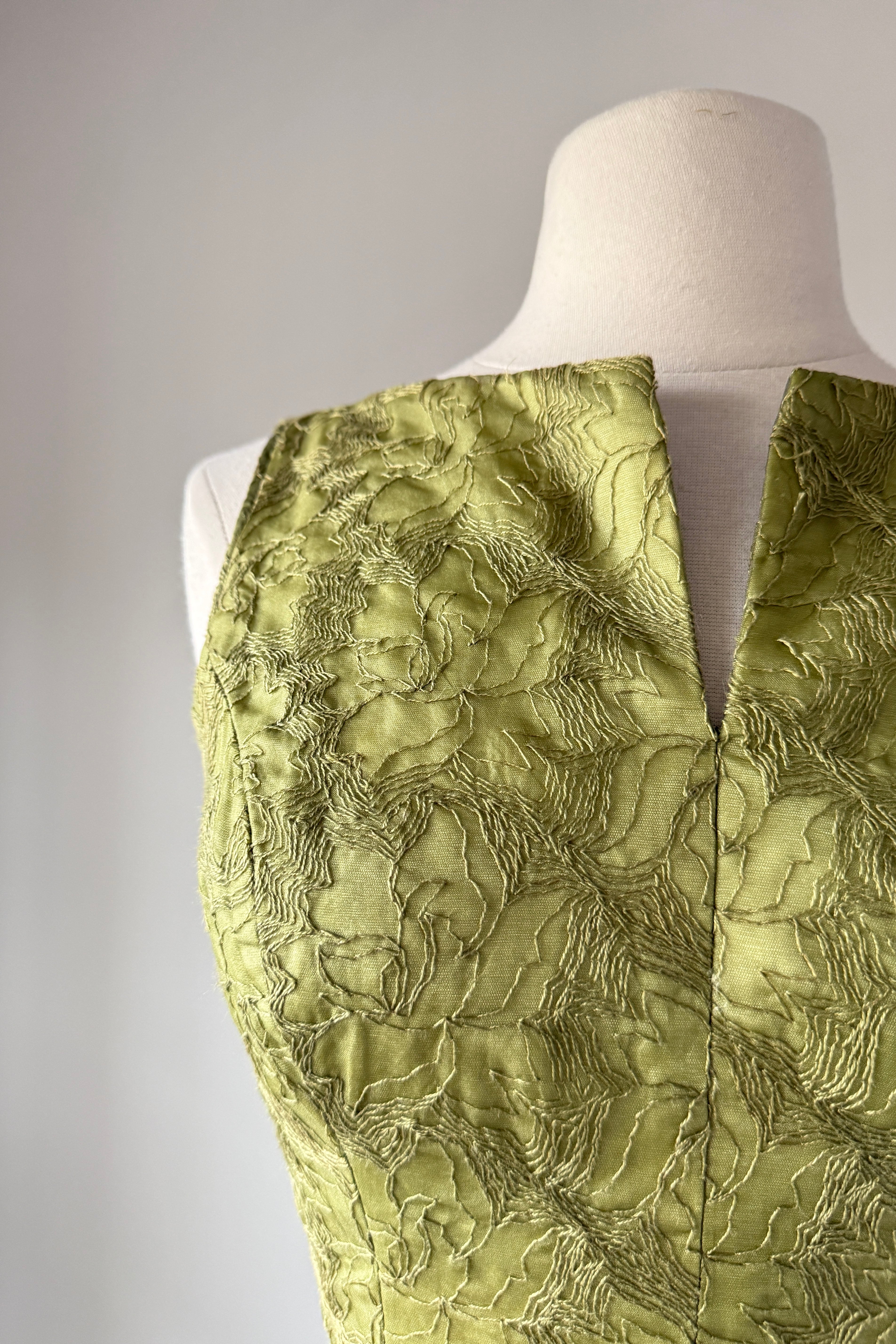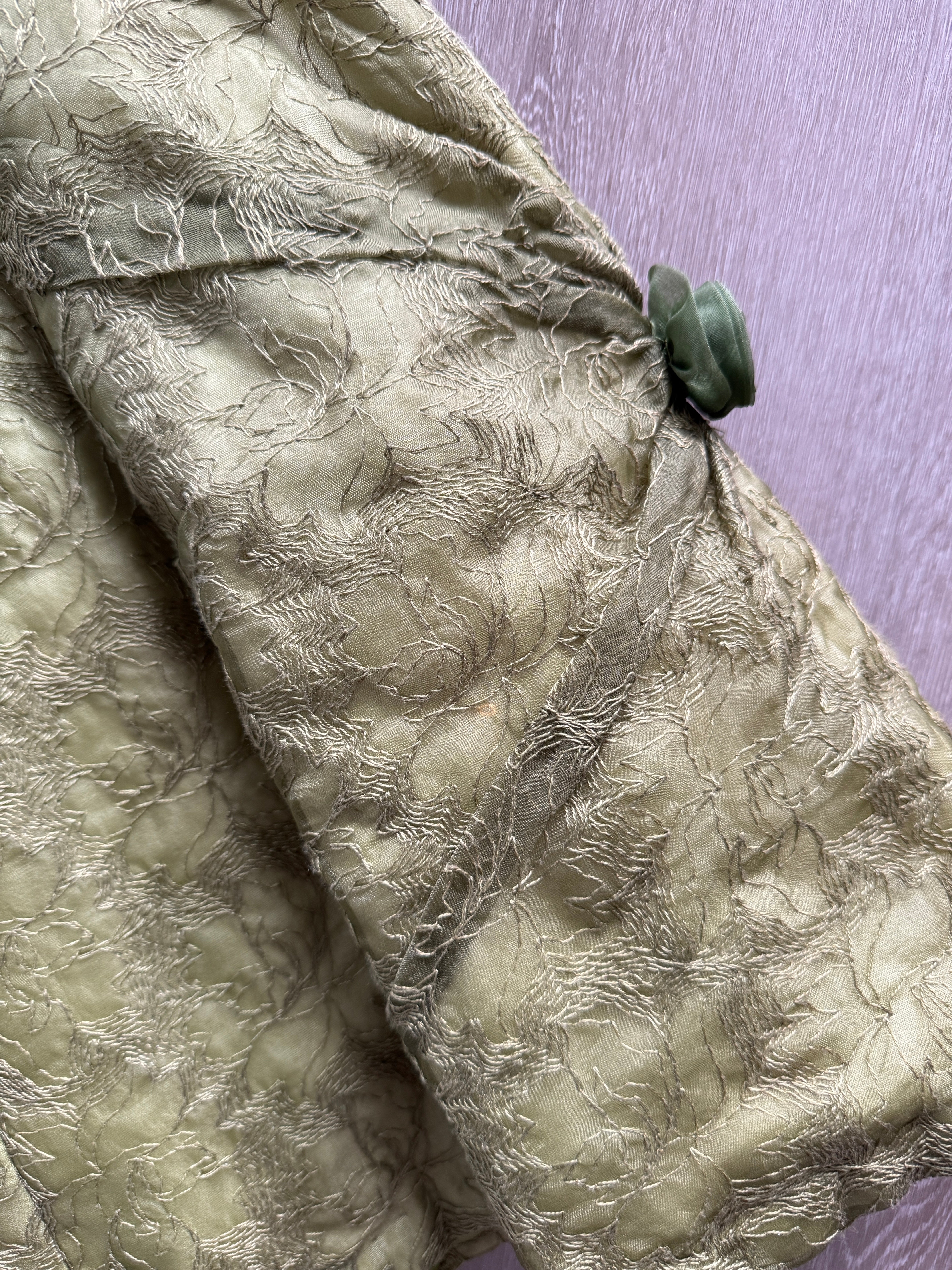 VINTAGE DRESSVintage 1950s dress. Features olive green embroidered chiffon over pelon backing, rosettes on skirt, metal back zipper. By Edna Oliver for Fashions on the Avenue of Waikiki.Excellent condition. One tiny hole in chiffon back skirt (please see photo).Fits like XS/S. Length 36Bodice 15Bust 34Waist 26As with all vintage, please expect wear consistent with age. All sales are final. No order cancellations.0902 | 2610