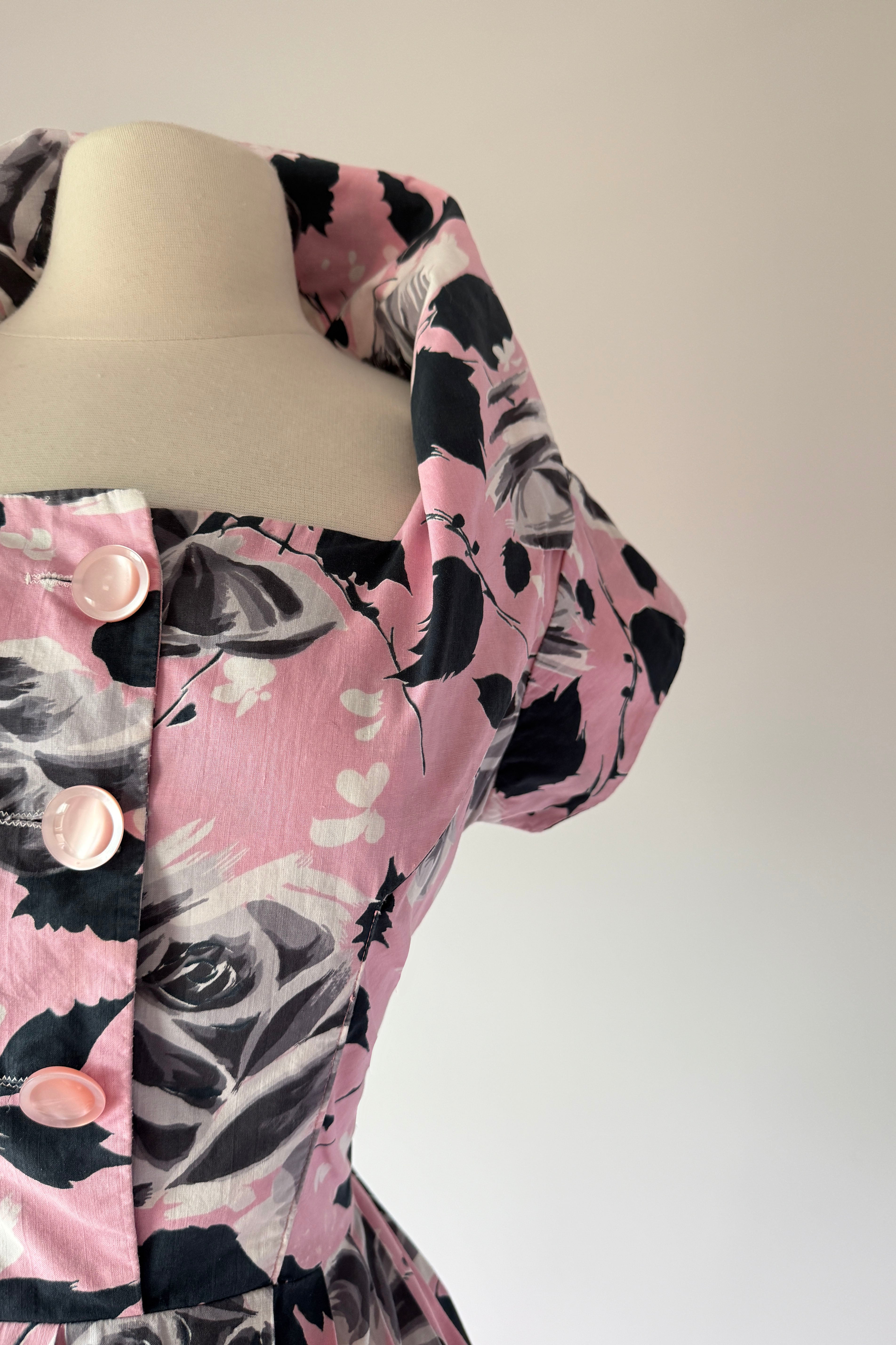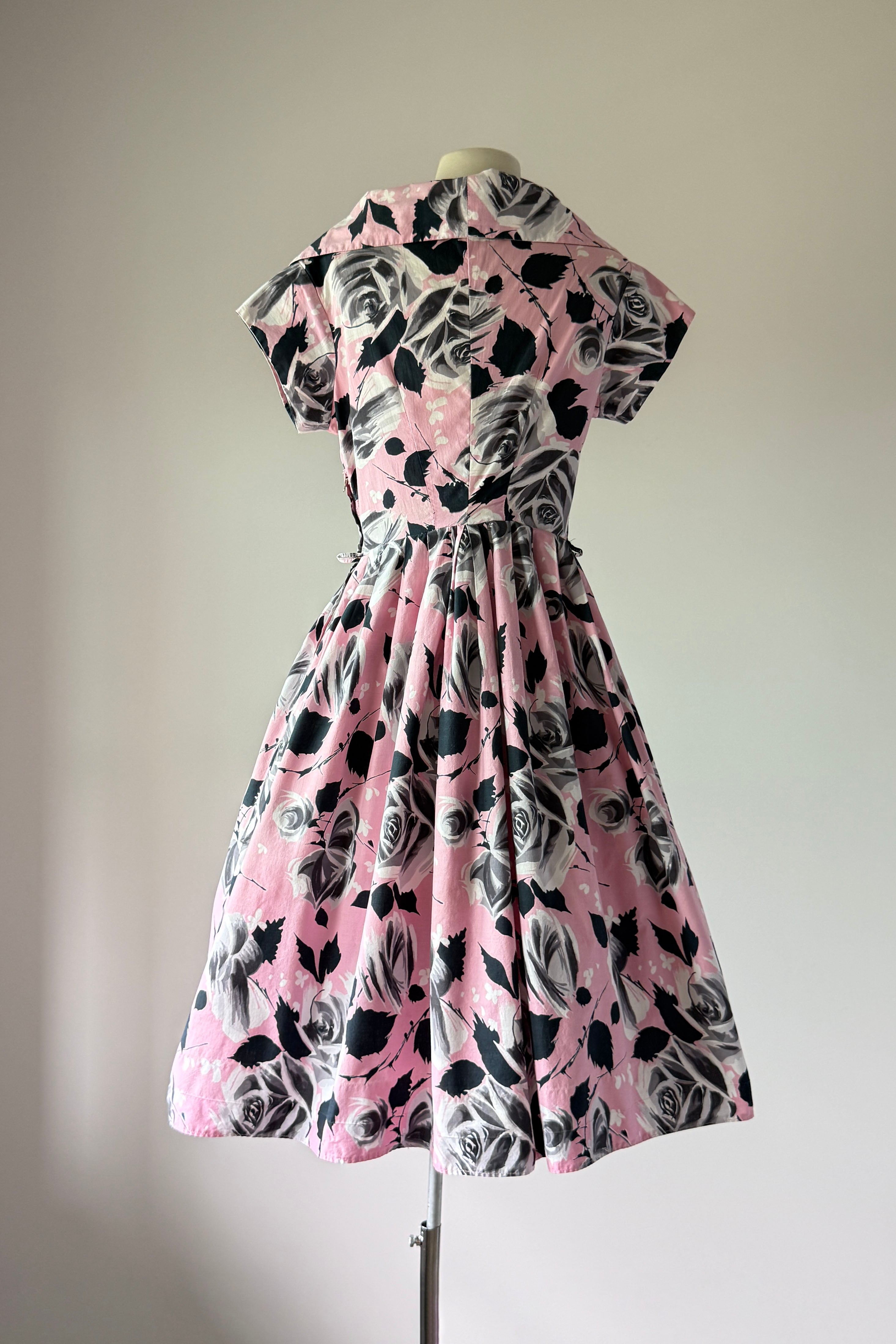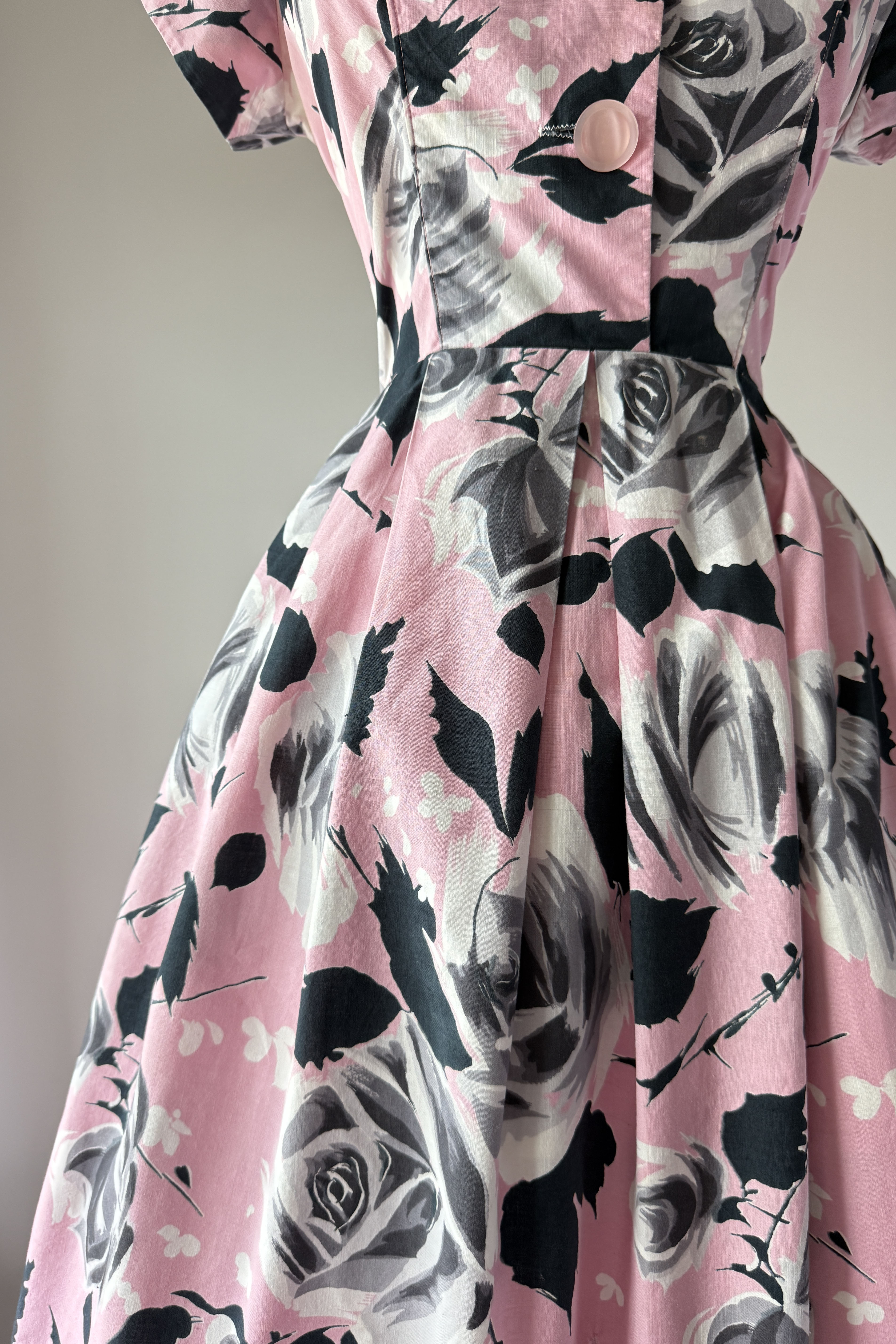 VINTAGE DRESS Vintage 1950s dress. Features large scale pink + black rose print, metal side zipper. Cotton. Great condition. Faint crease at hem where it's been let out. Fits like M/L.Length 43Bodice 15Bust 38-40Waist 29-30As with all vintage, please expect wear consistent with age. All sales are final. No order cancellations.0957 | 2614