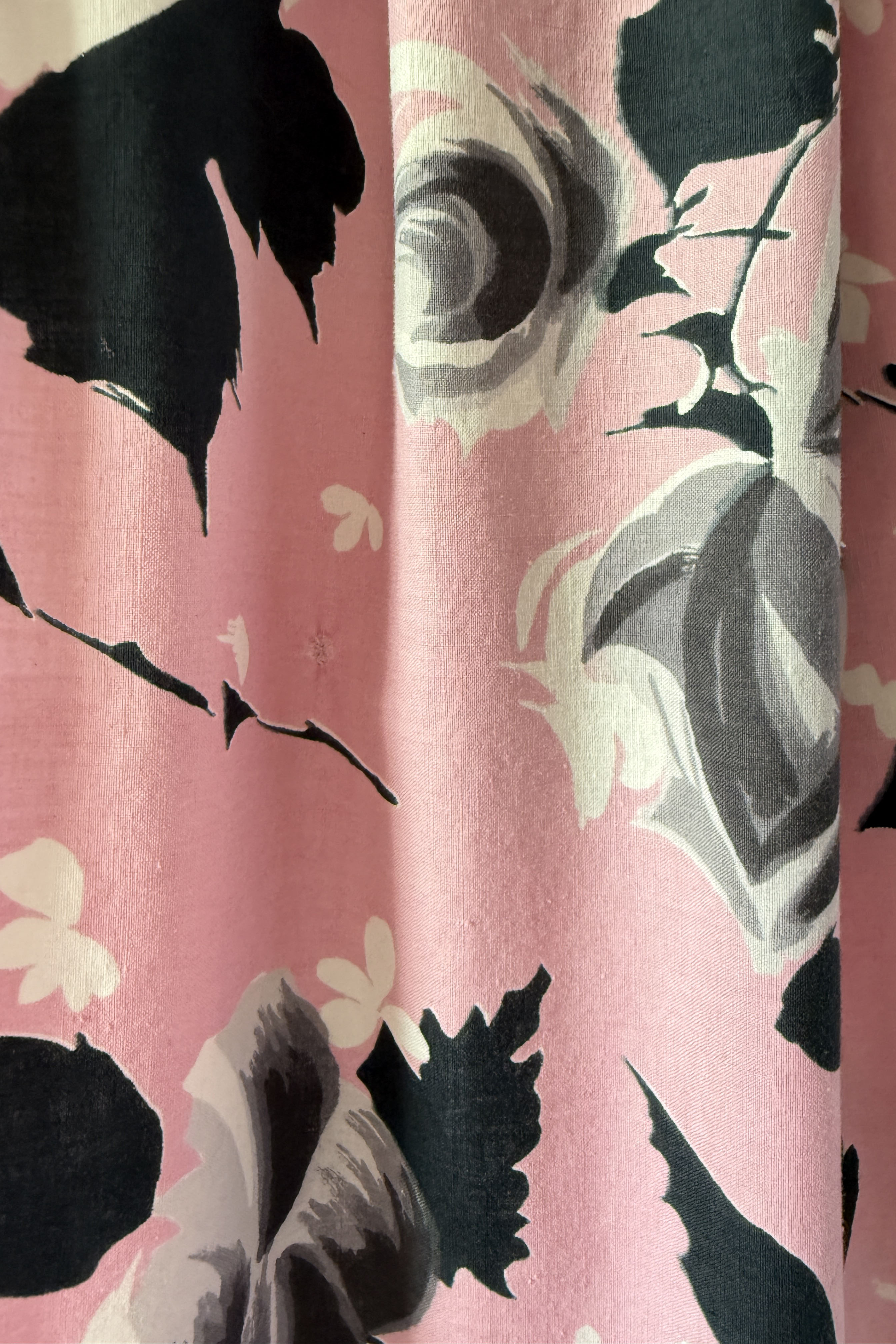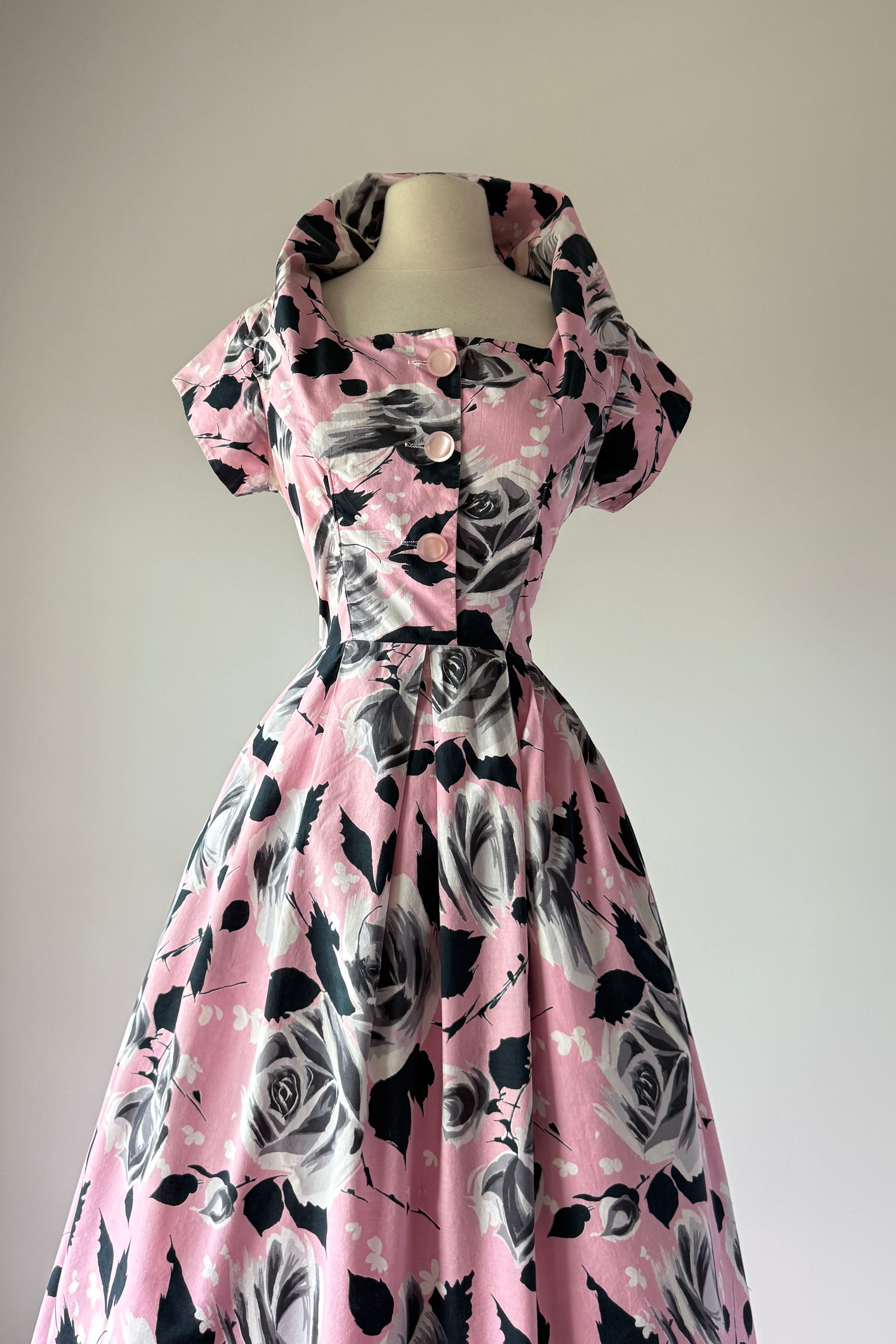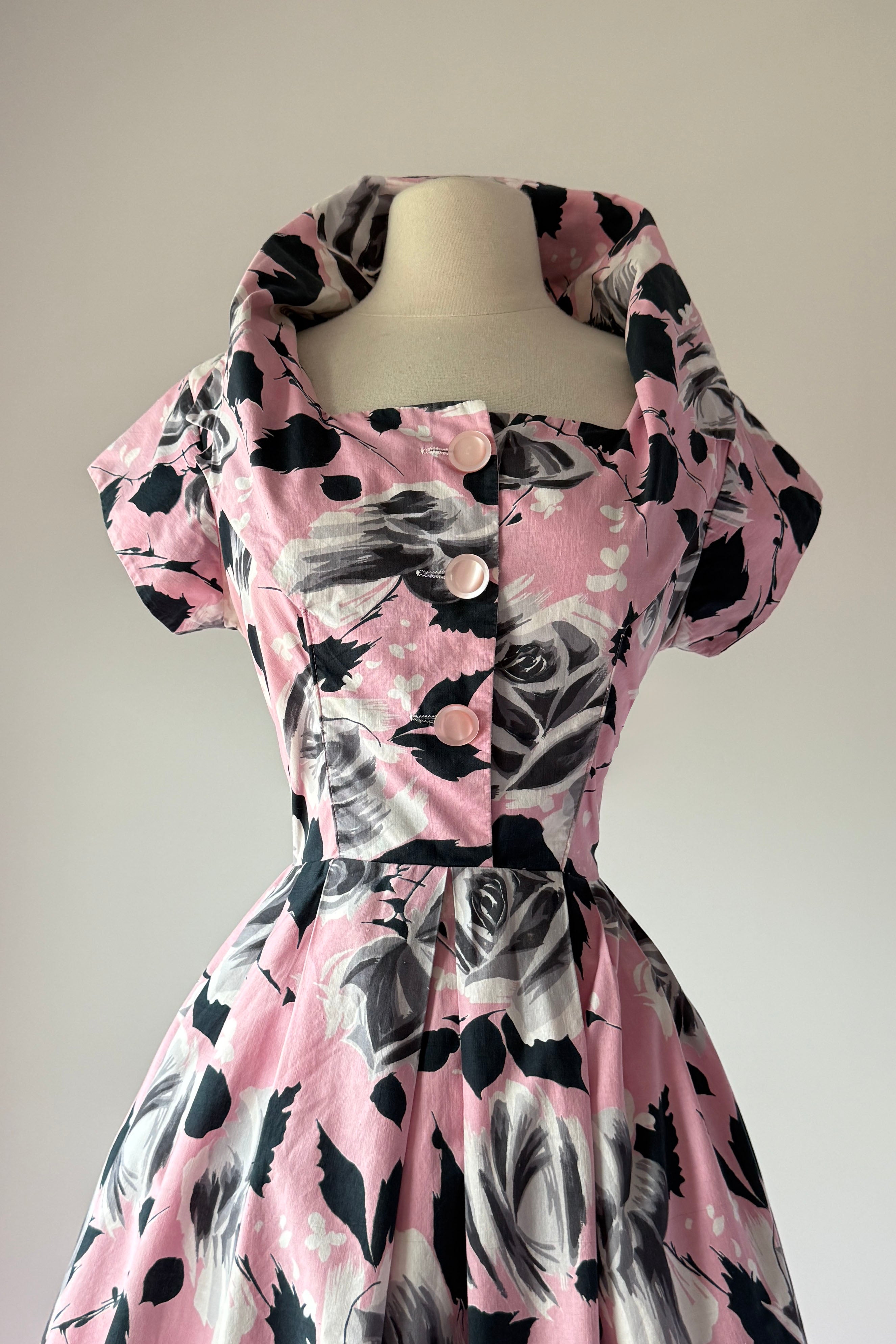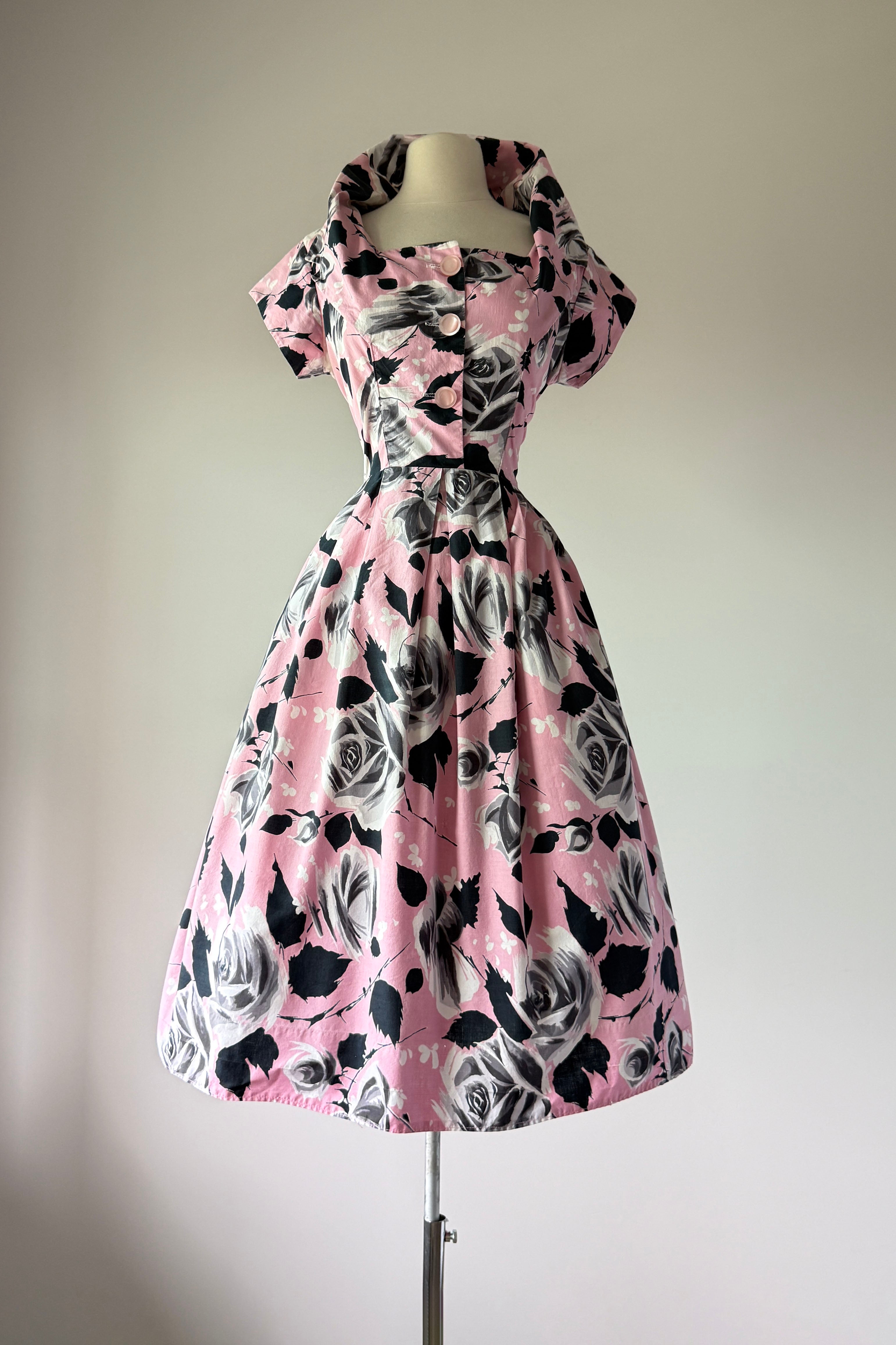 VINTAGE DRESS Vintage 1950s dress. Features large scale pink + black rose print, metal side zipper. Cotton. Great condition. Faint crease at hem where it's been let out. Fits like M/L.Length 43Bodice 15Bust 38-40Waist 29-30As with all vintage, please expect wear consistent with age. All sales are final. No order cancellations.0957 | 2614