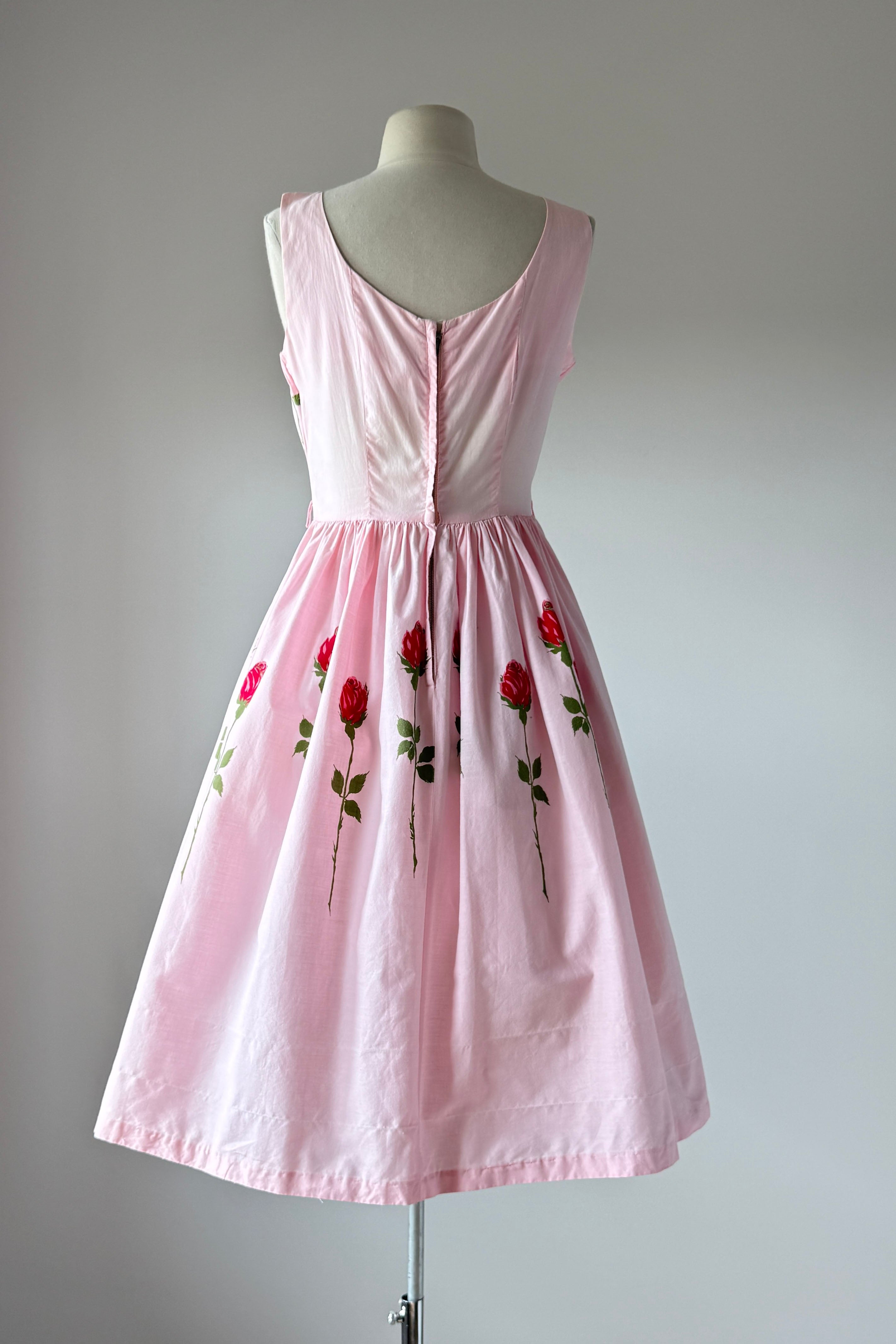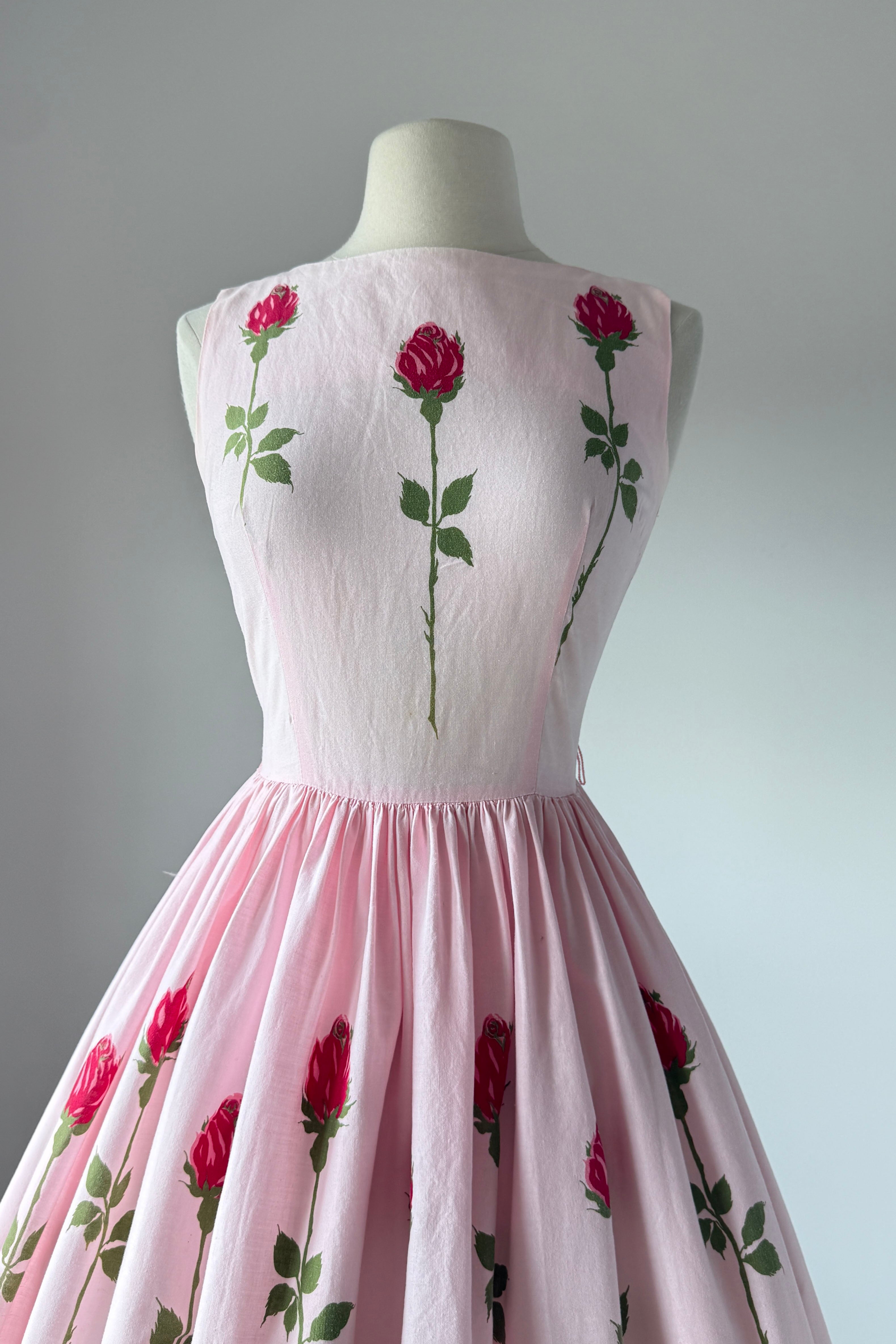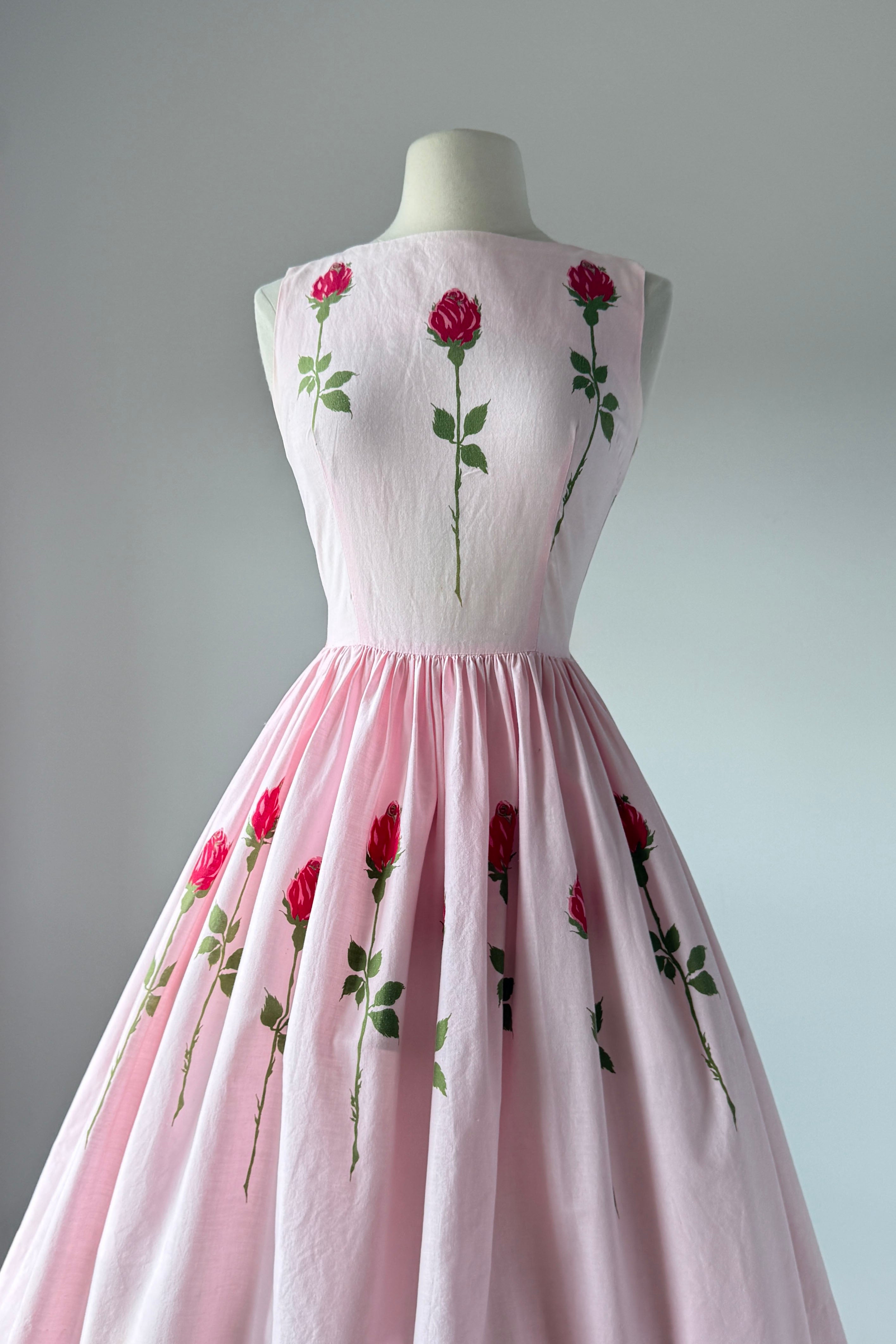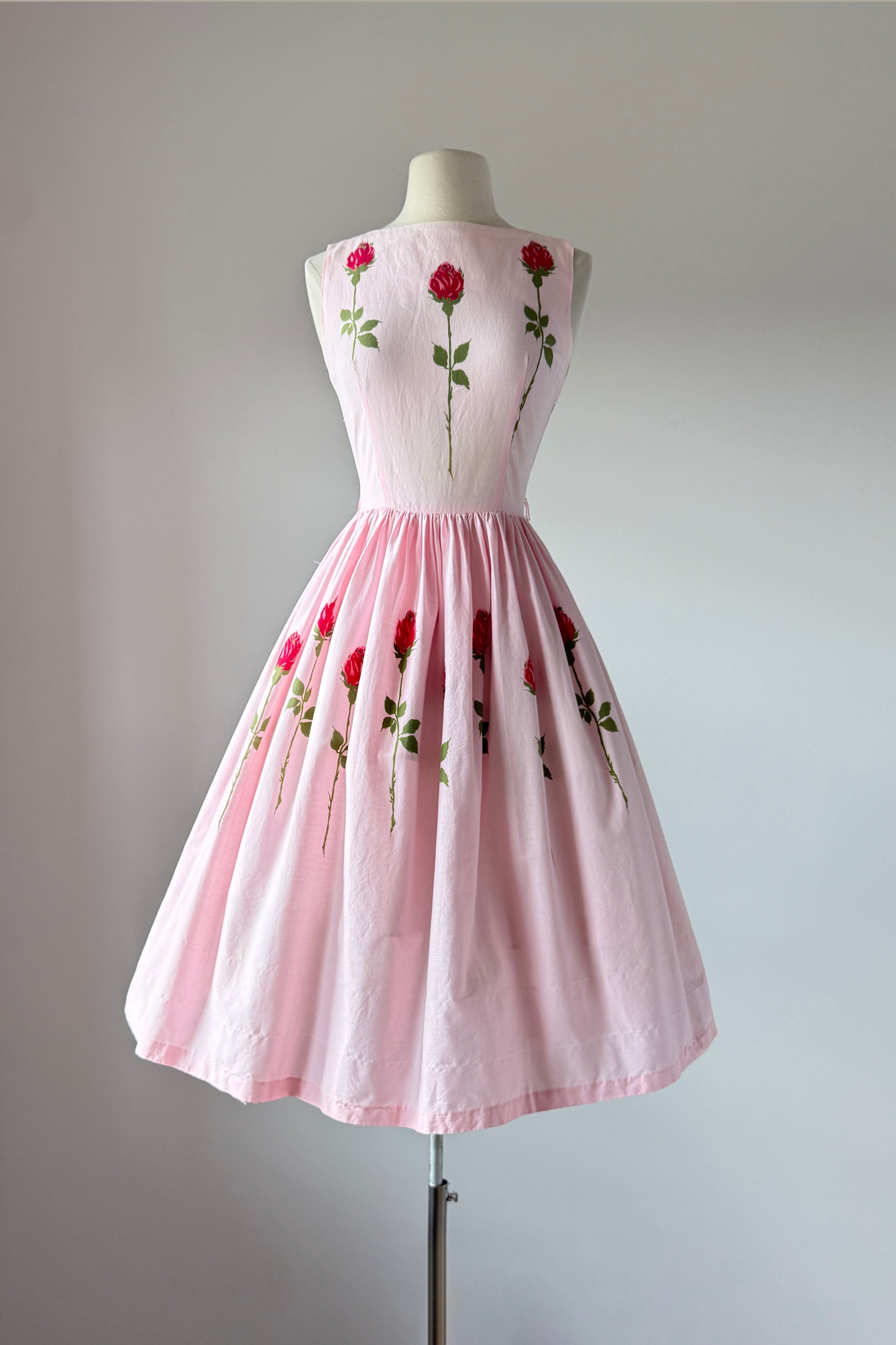 VINTAGE DRESS Vintage 1950s dress. Features pink with long stem red rose print, metal back zipper. Cotton. By Teena Paige. Great condition. Faint crease at hem and side bodice where seams have been let out. Slight color variation at bodice side seam.Fits like XS/S.Length 42Bodice 15Bust 36Waist 26As with all vintage, please expect wear consistent with age. All sales are final. No order cancellations.0962 | 2614