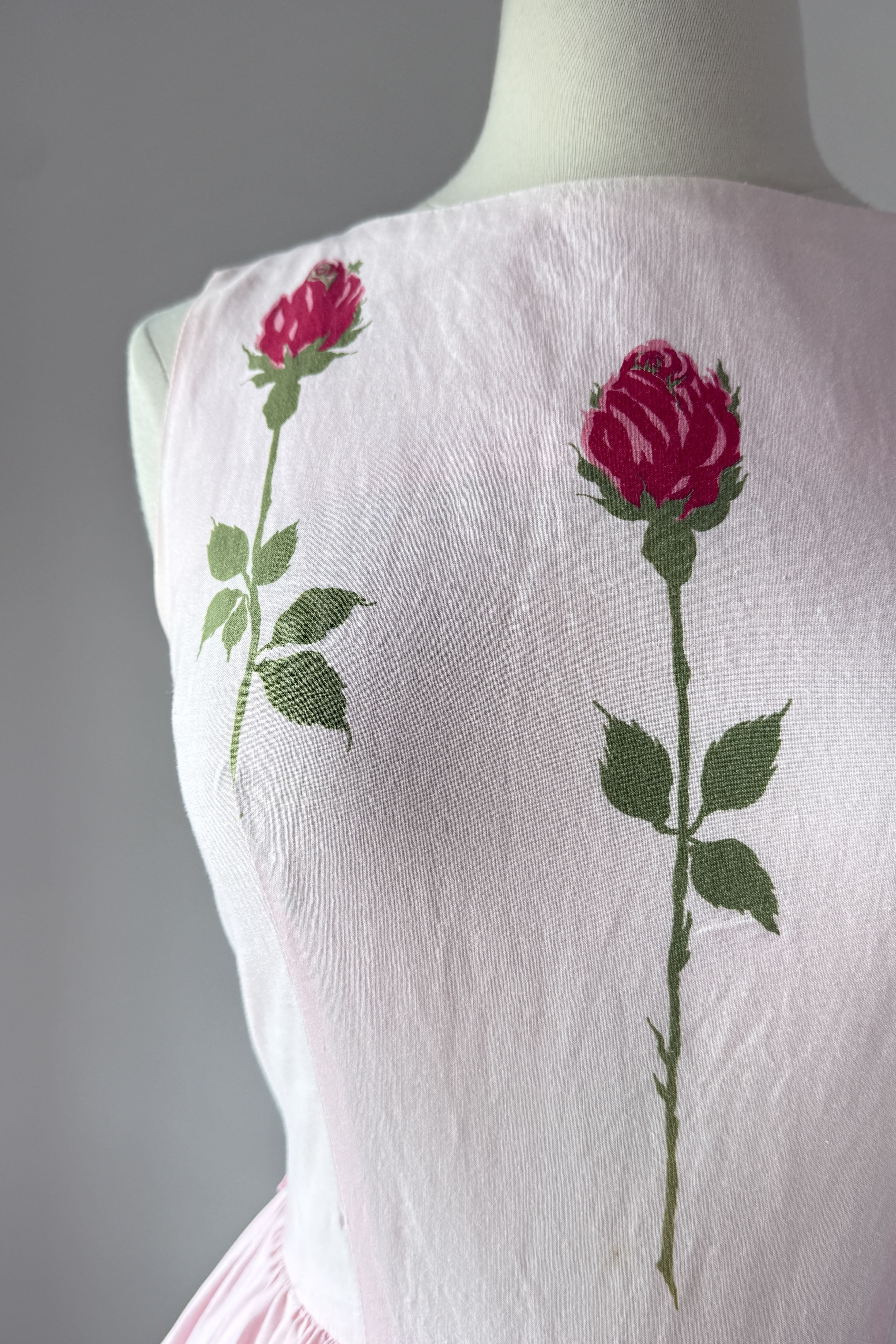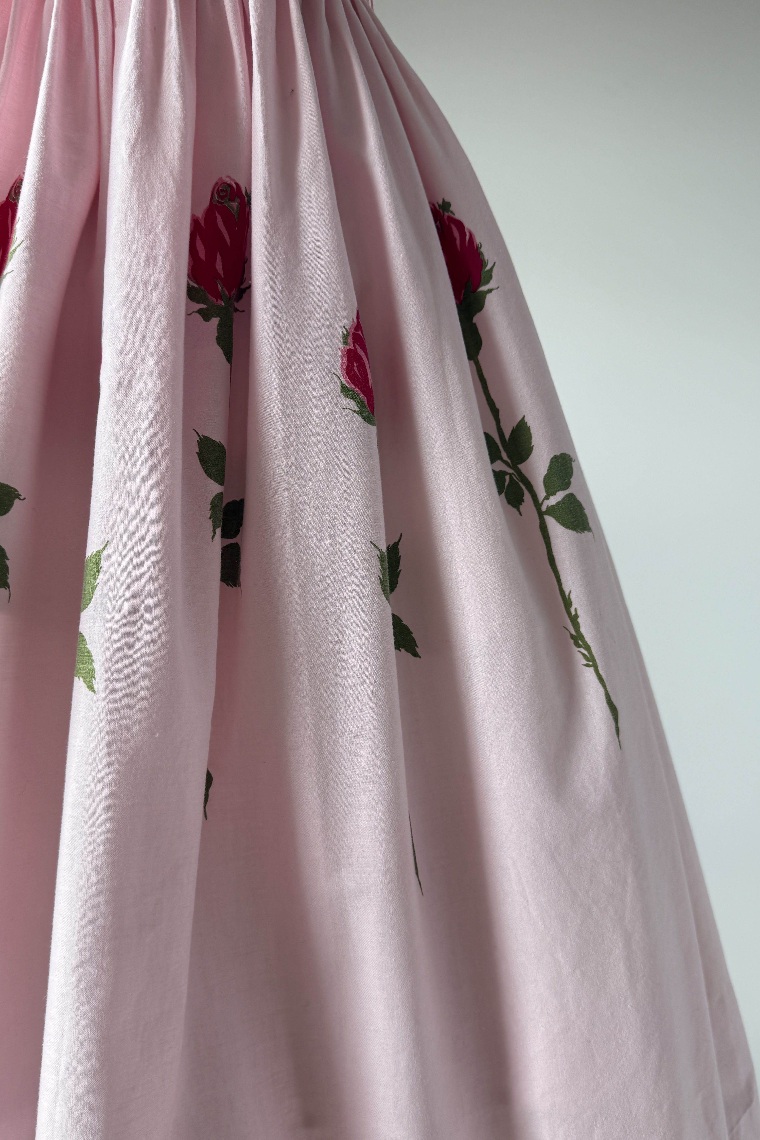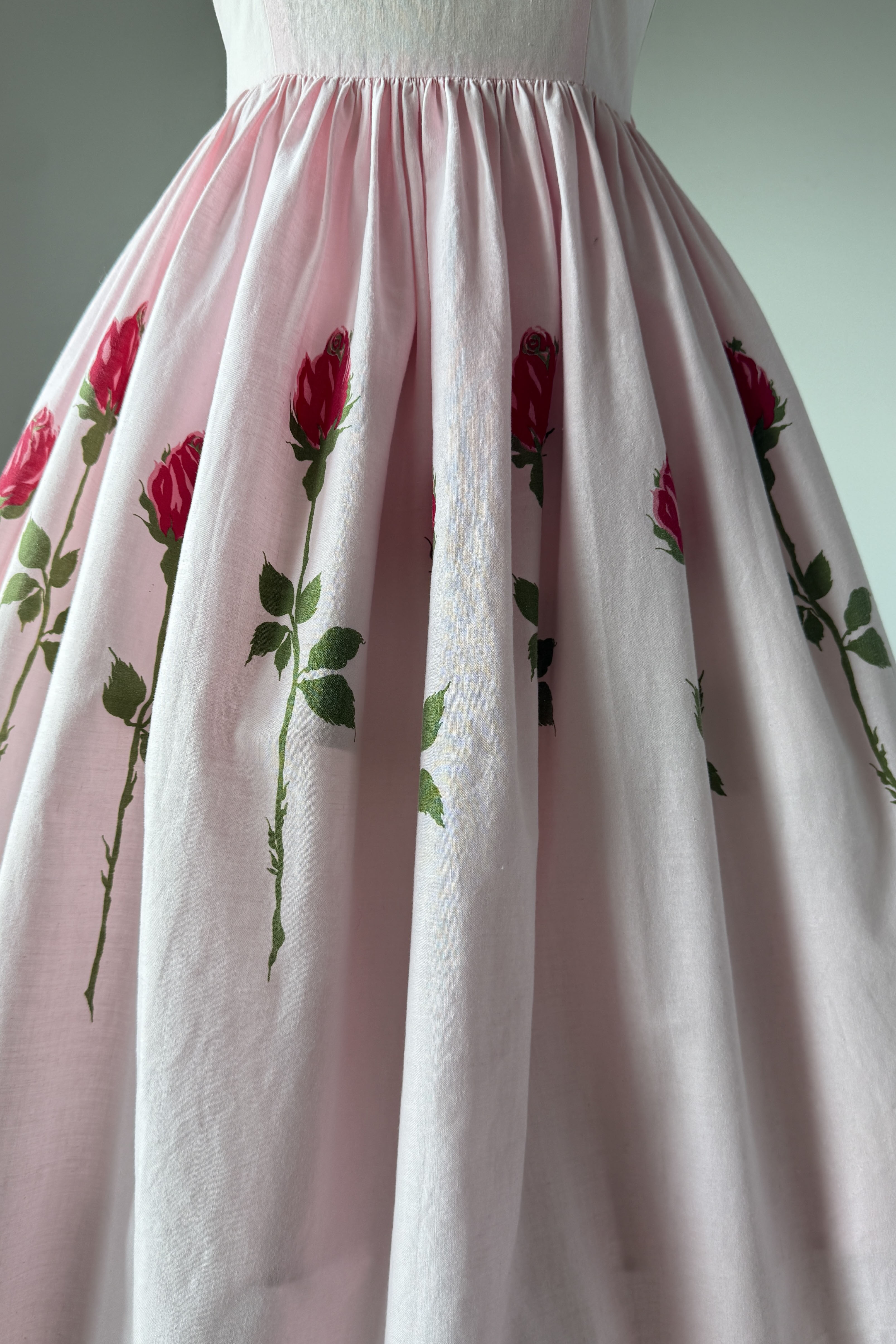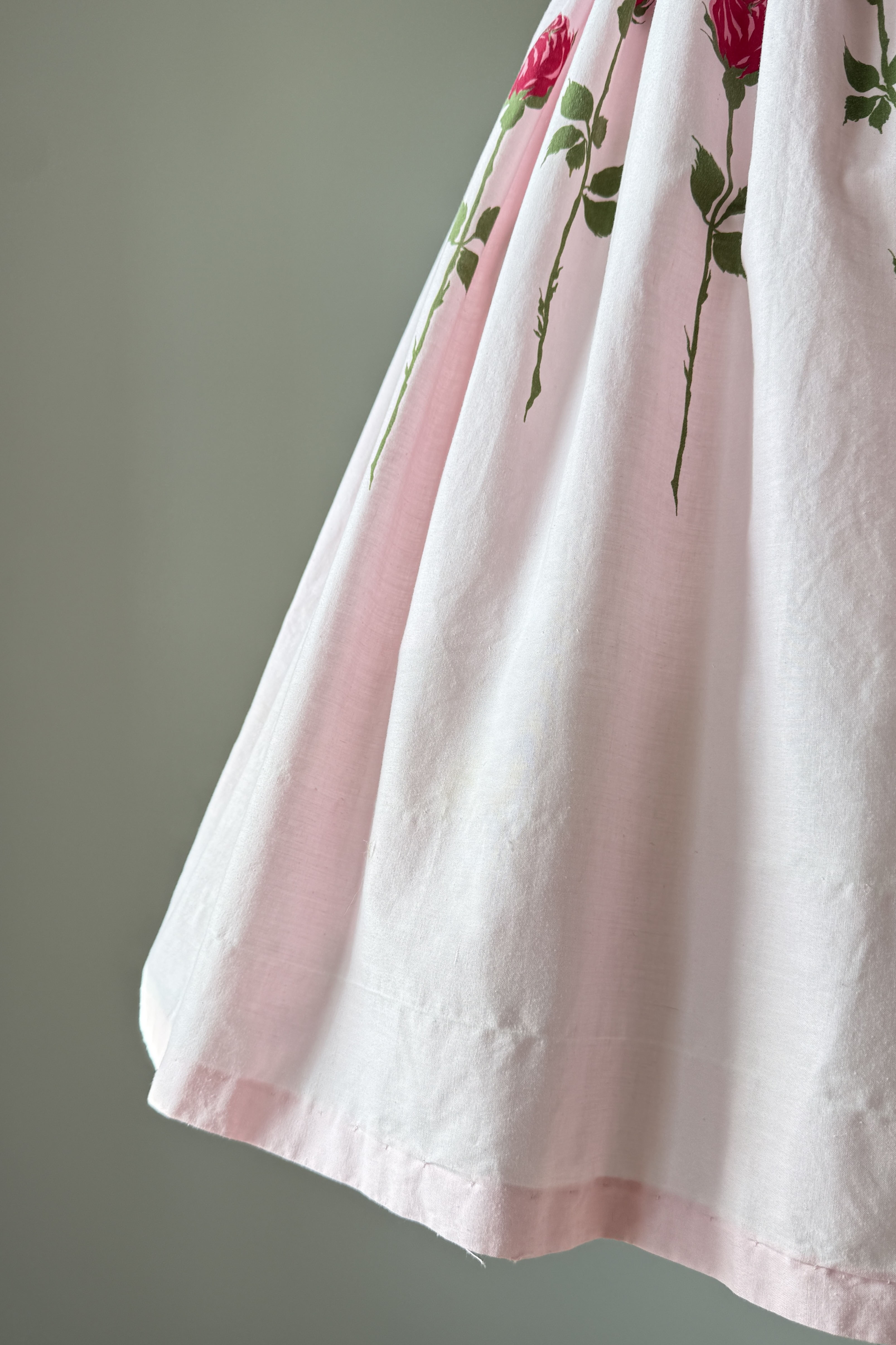 VINTAGE DRESS Vintage 1950s dress. Features pink with long stem red rose print, metal back zipper. Cotton. By Teena Paige. Great condition. Faint crease at hem and side bodice where seams have been let out. Slight color variation at bodice side seam.Fits like XS/S.Length 42Bodice 15Bust 36Waist 26As with all vintage, please expect wear consistent with age. All sales are final. No order cancellations.0962 | 2614