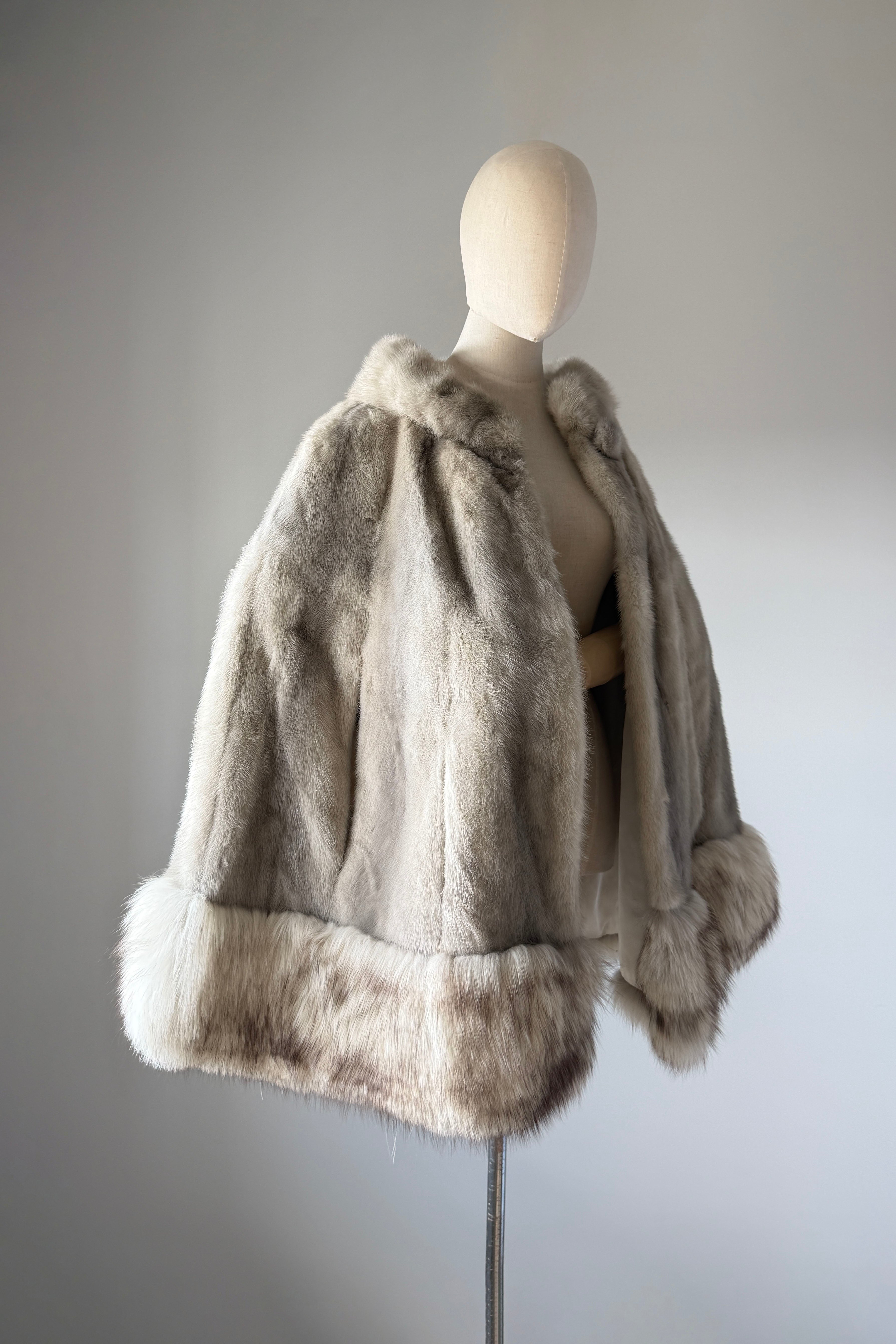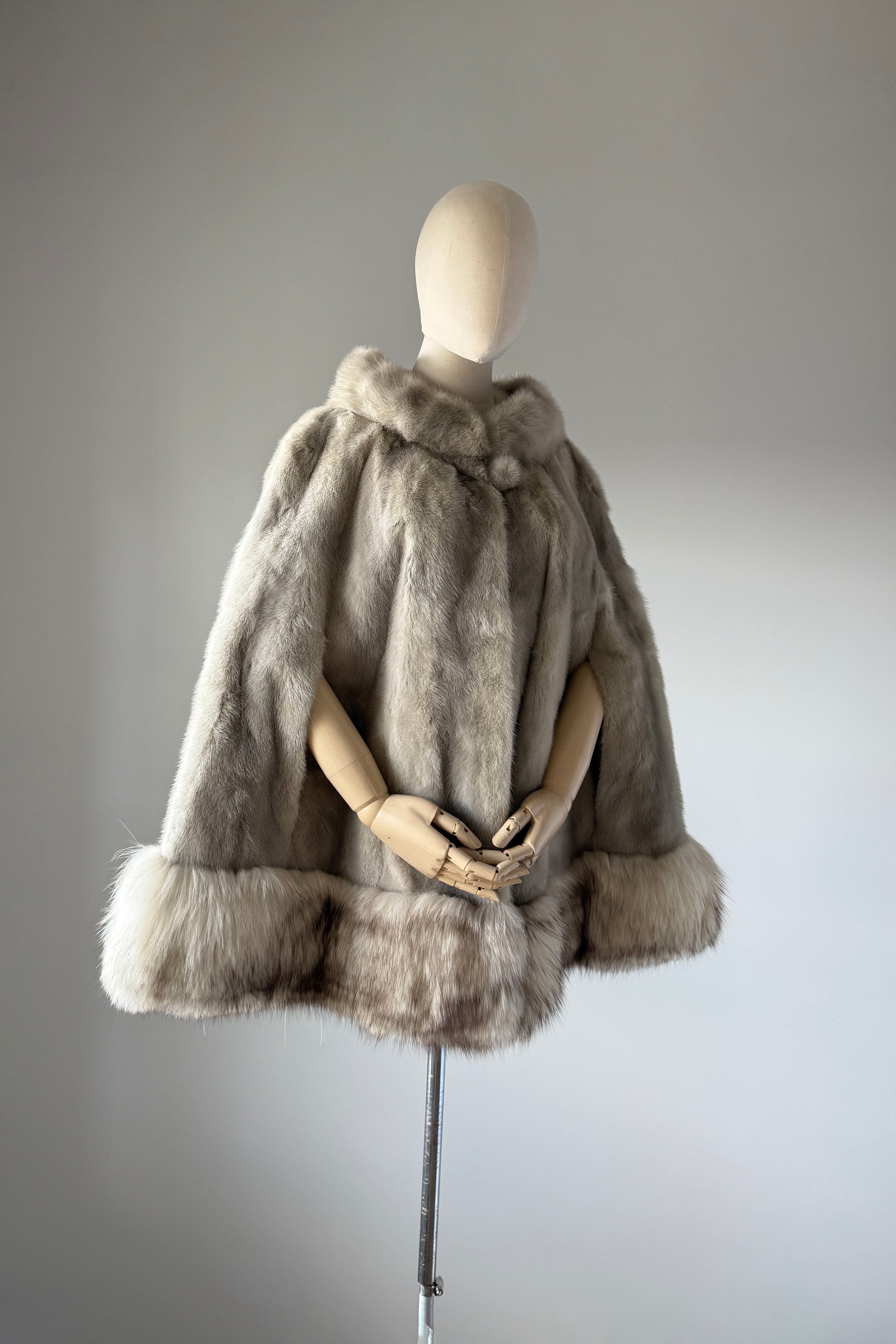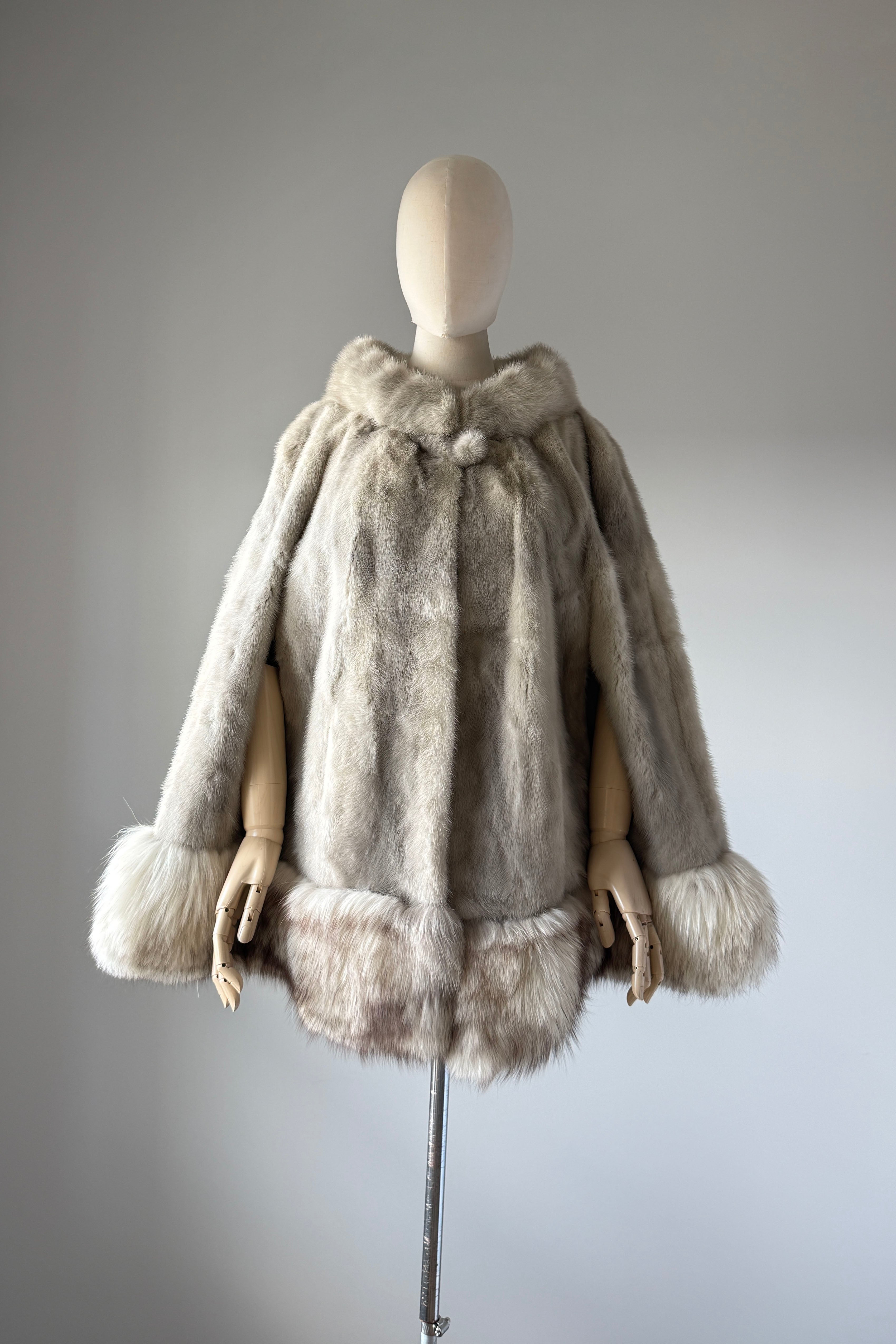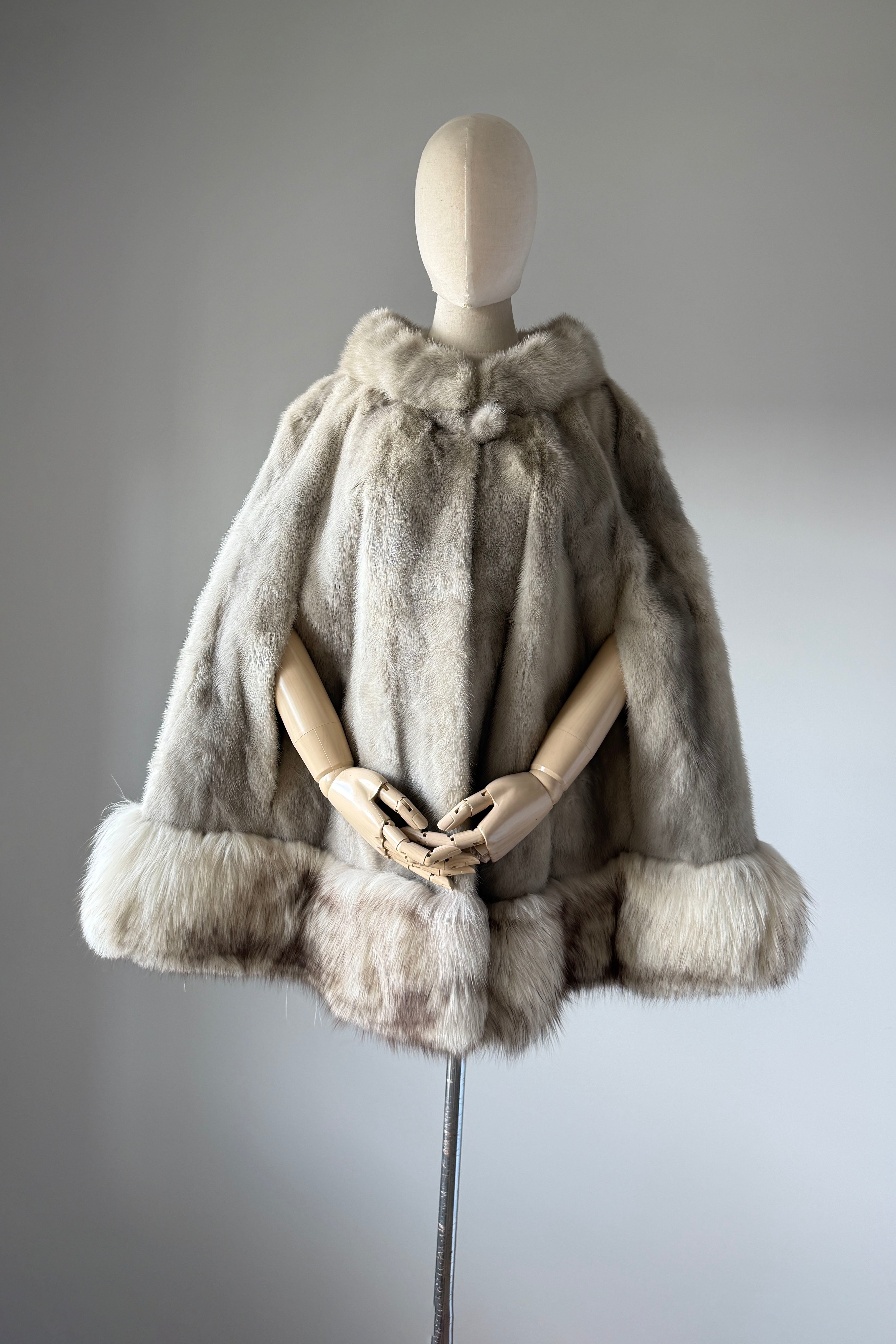 VINTAGE CAPEVintage 1950s cape. Features luxurious platinum silver mink and fox fur, arm slits at each side, satin lining, round fur button at neck. Excellent condition. OSFM. Length 26Shoulder 18As with all vintage, please expect wear consistent with age. All sales are final. No order cancellations.0841 | 2606