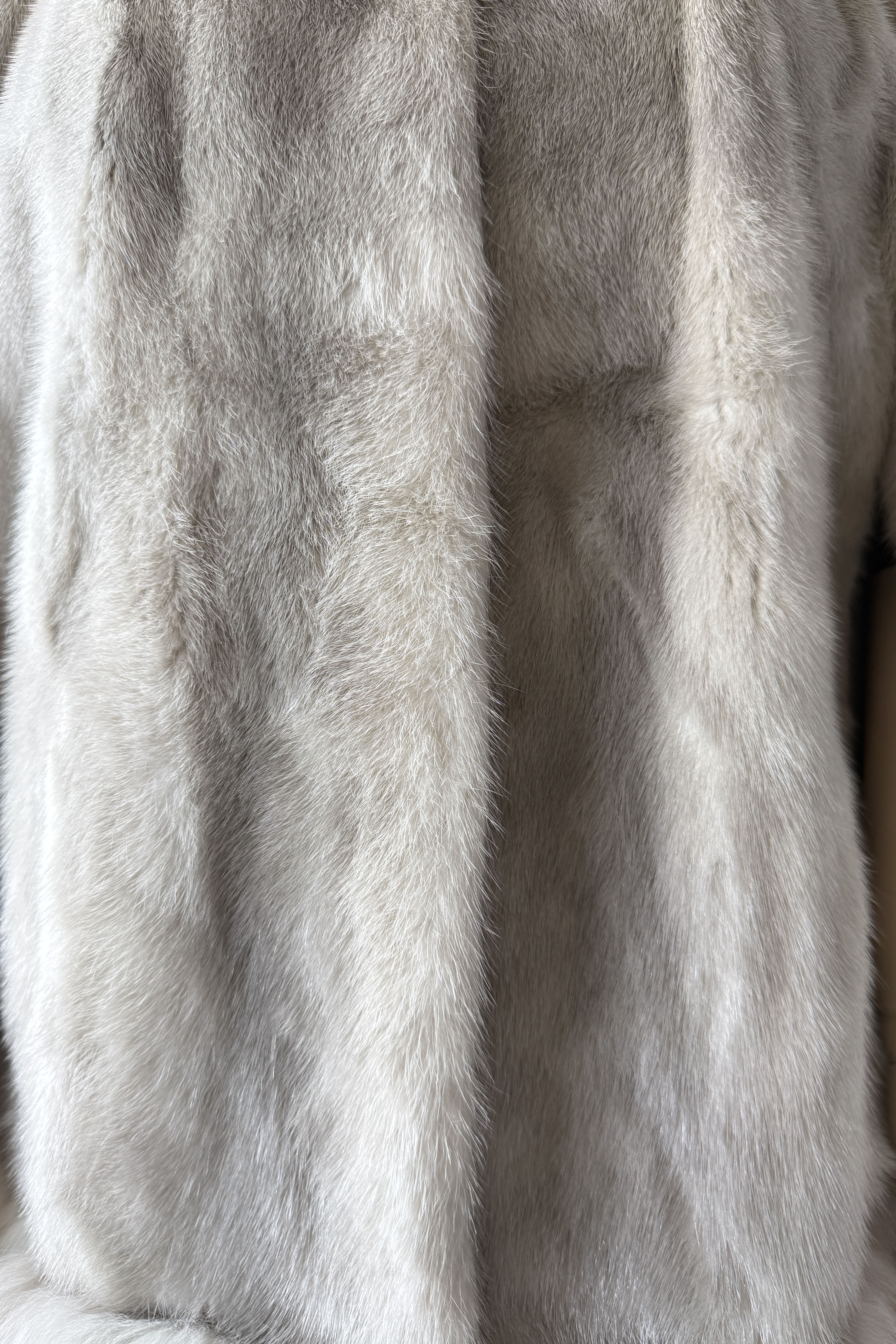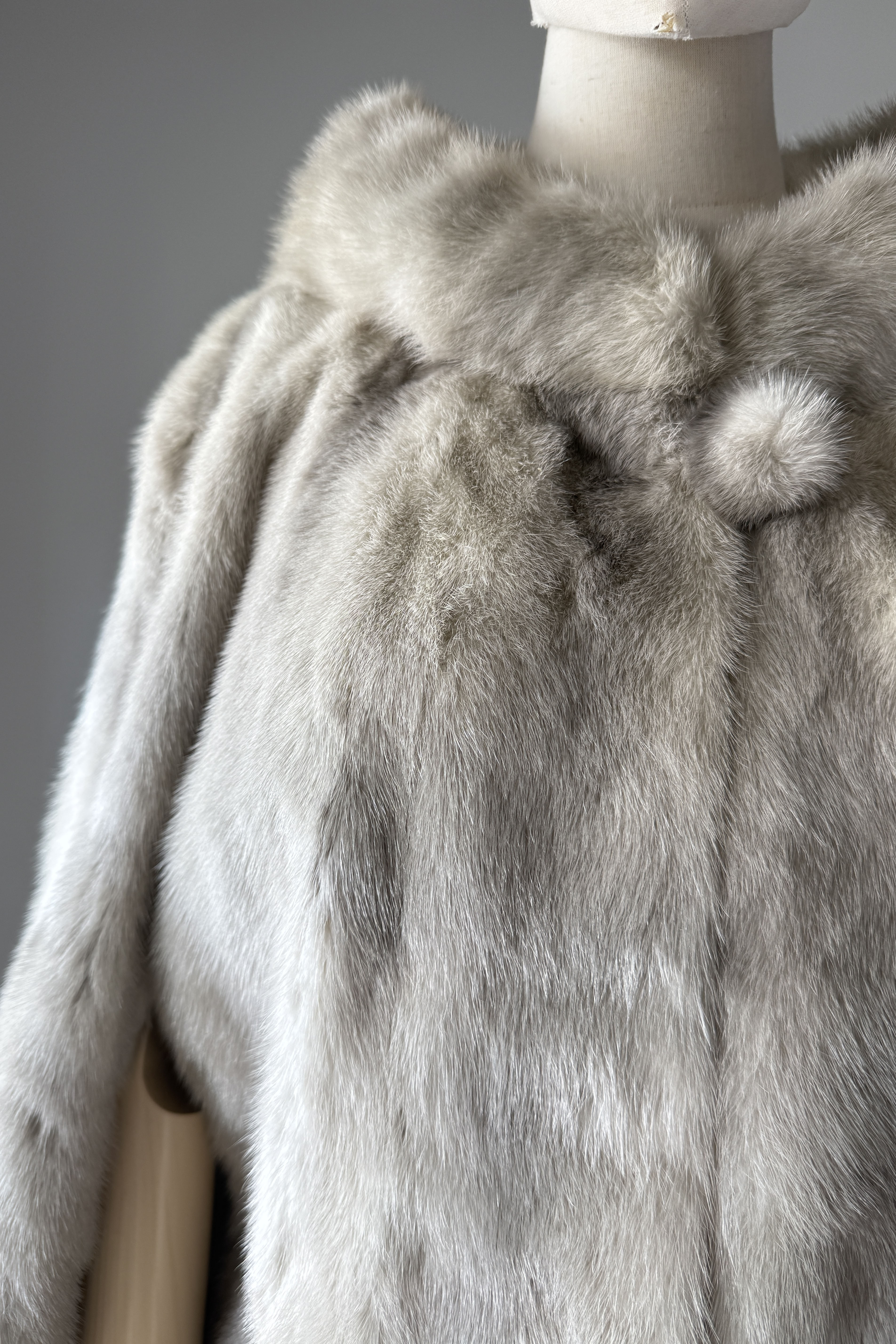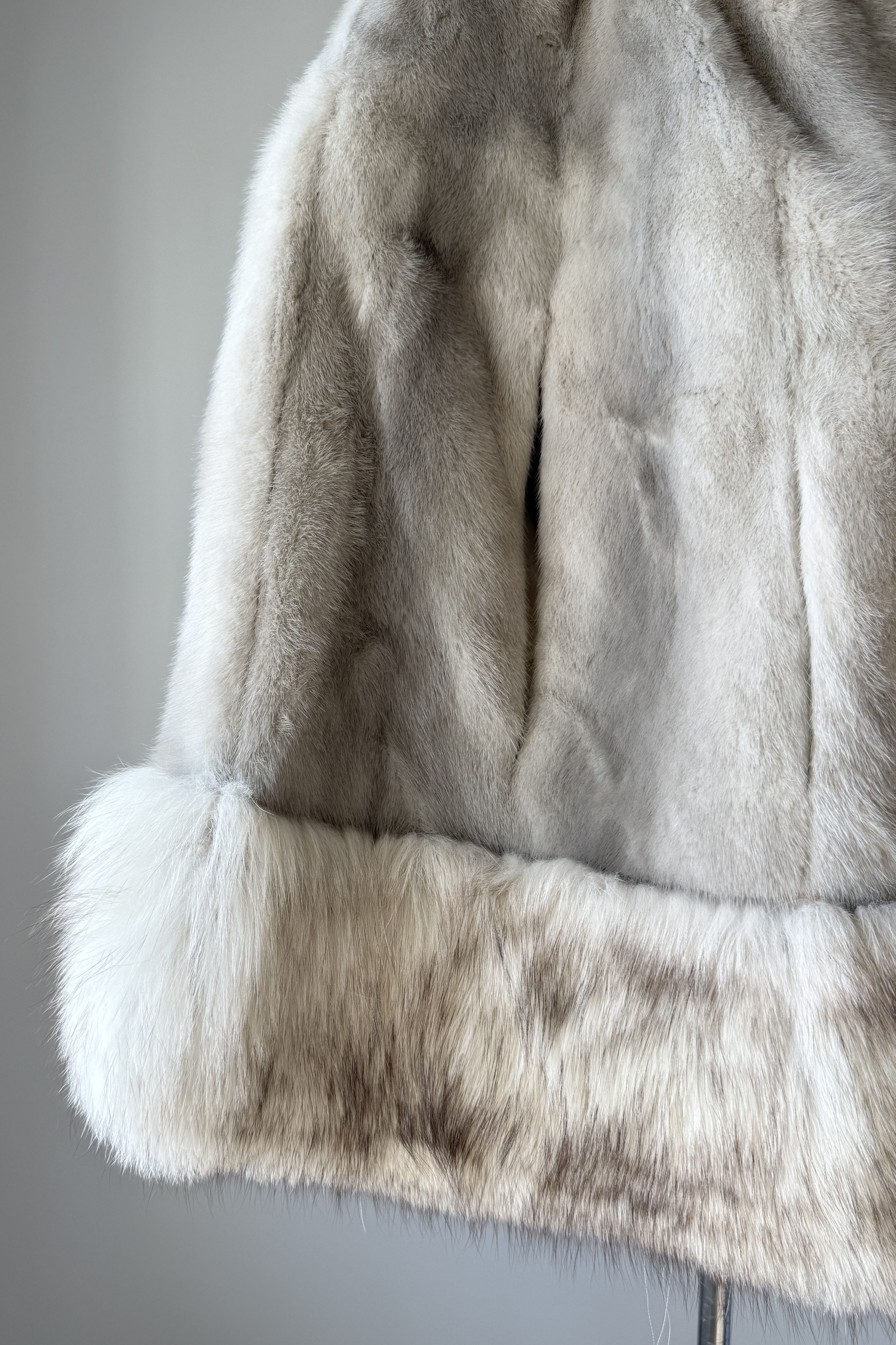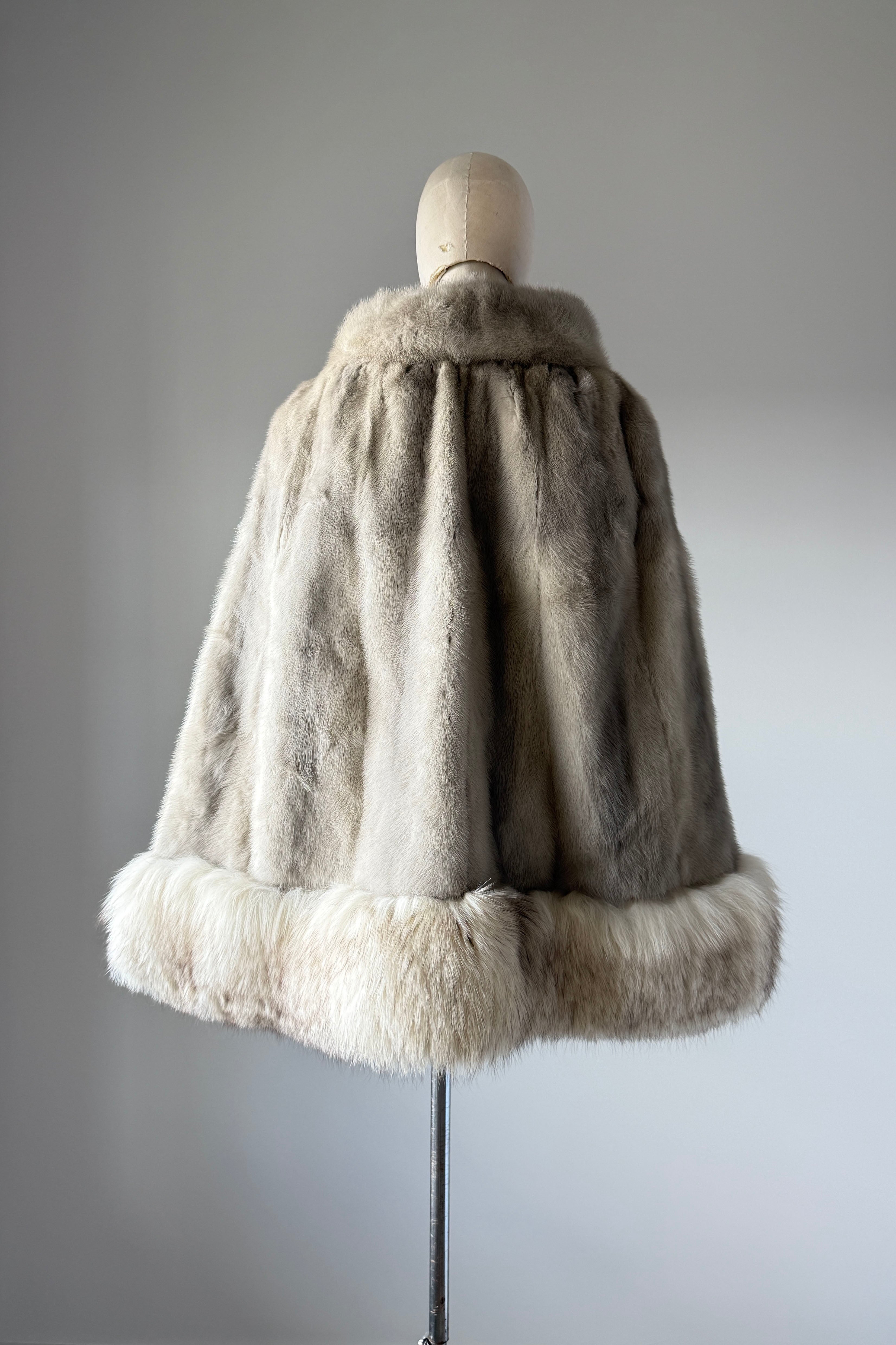 VINTAGE CAPEVintage 1950s cape. Features luxurious platinum silver mink and fox fur, arm slits at each side, satin lining, round fur button at neck. Excellent condition. OSFM. Length 26Shoulder 18As with all vintage, please expect wear consistent with age. All sales are final. No order cancellations.0841 | 2606
