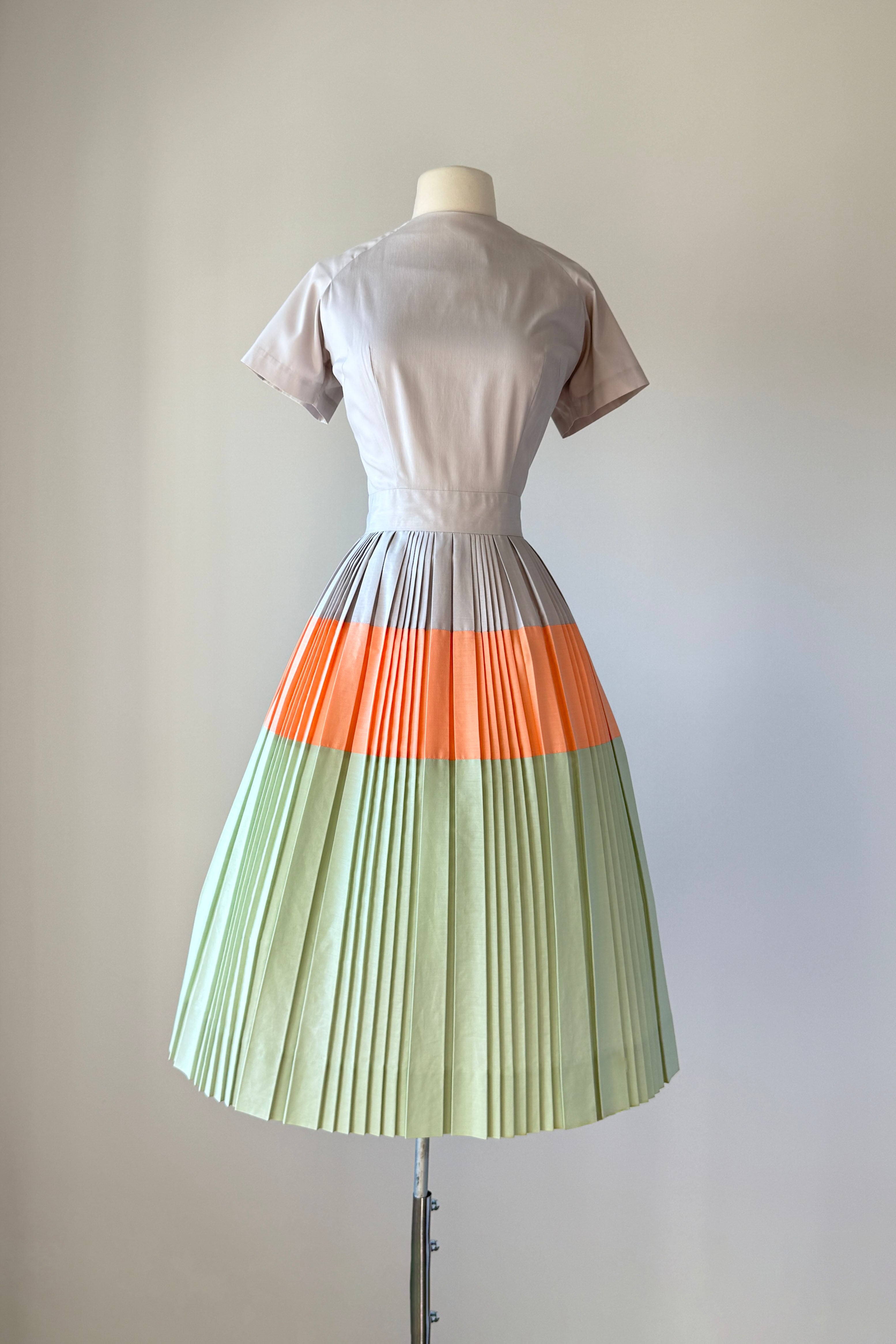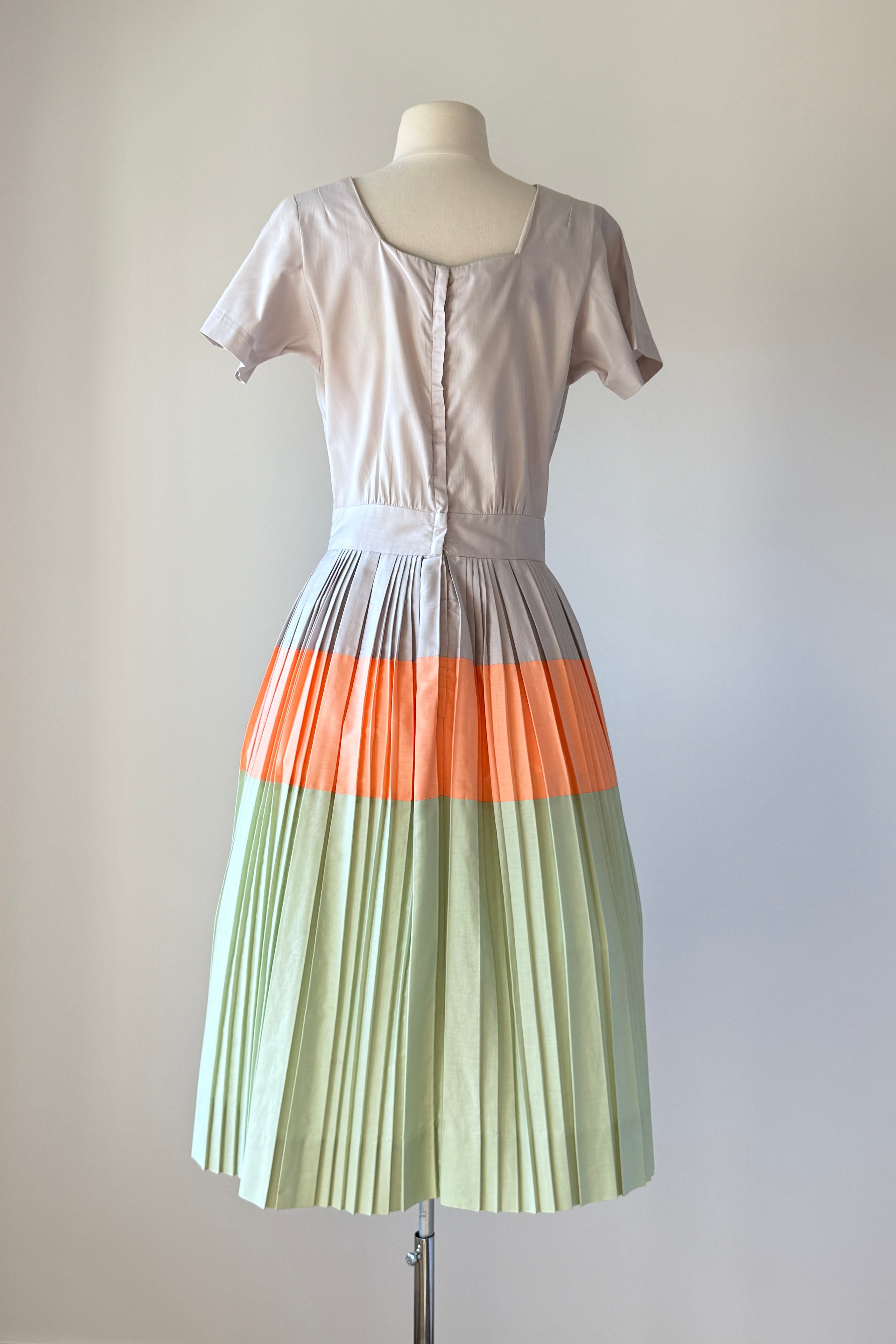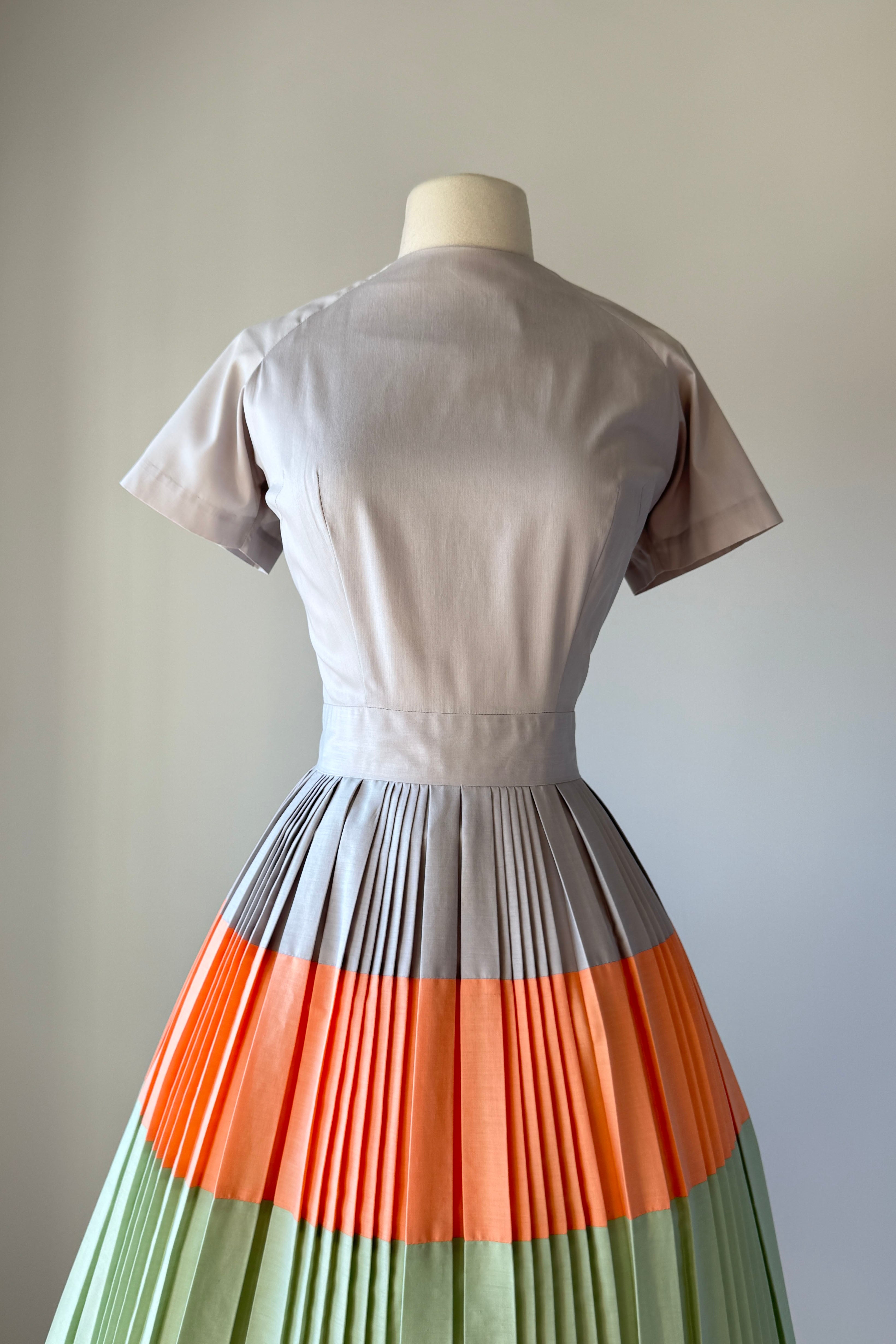 VINTAGE DRESS by MARION MCCOYVintage 1950s dress with pleated skirt, cap sleeves, metal back zipper. Wide horizontal stripe pattern. Cotton/poly. By Marion McCoy.Excellent condition. Freshly laundered and ready to wear.Fits like medium.Length 45Bodice 16Bust 38Waist 28As with all vintage, please expect wear consistent with age. All sales are final. No order cancellations.0656 | 2603