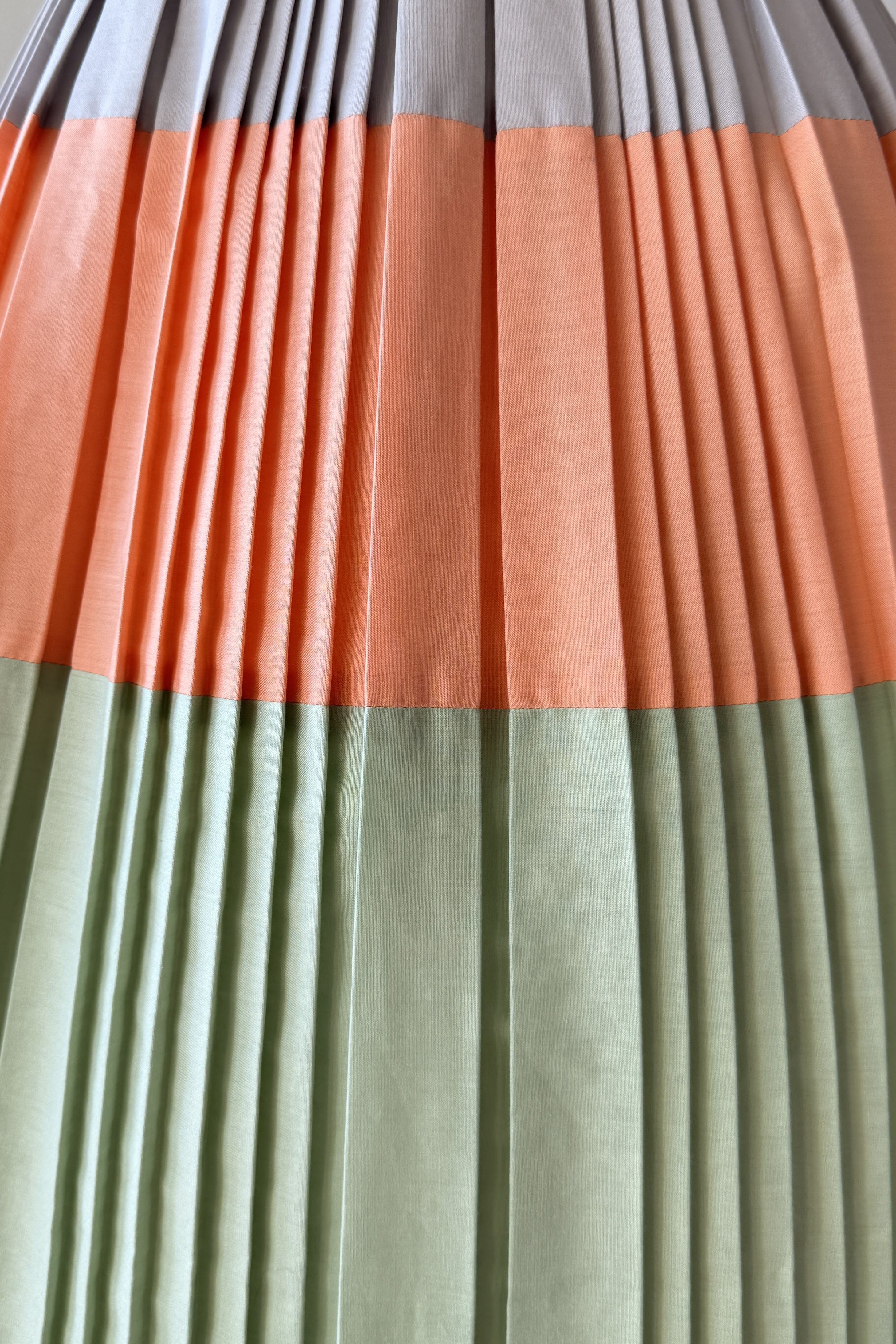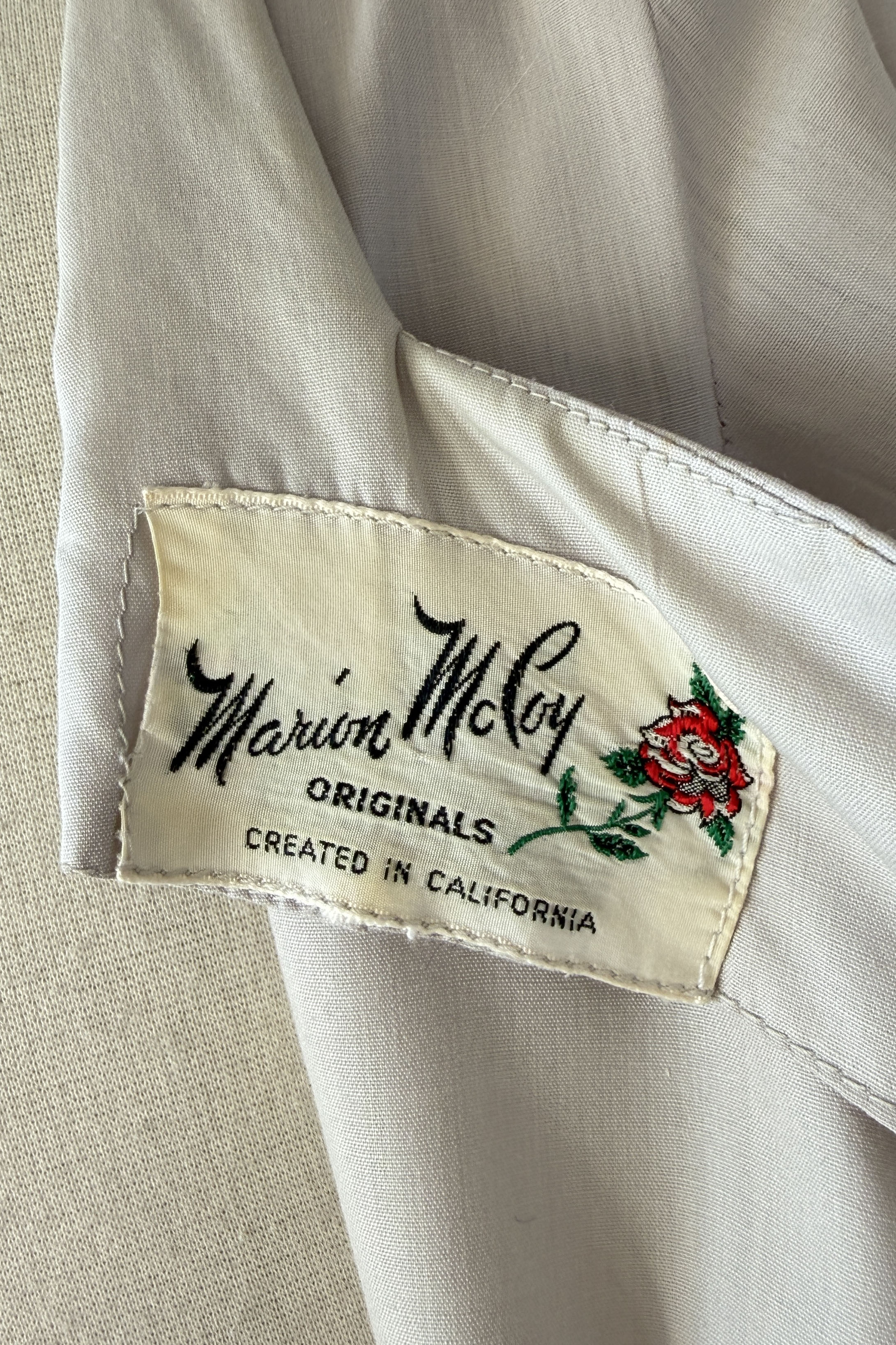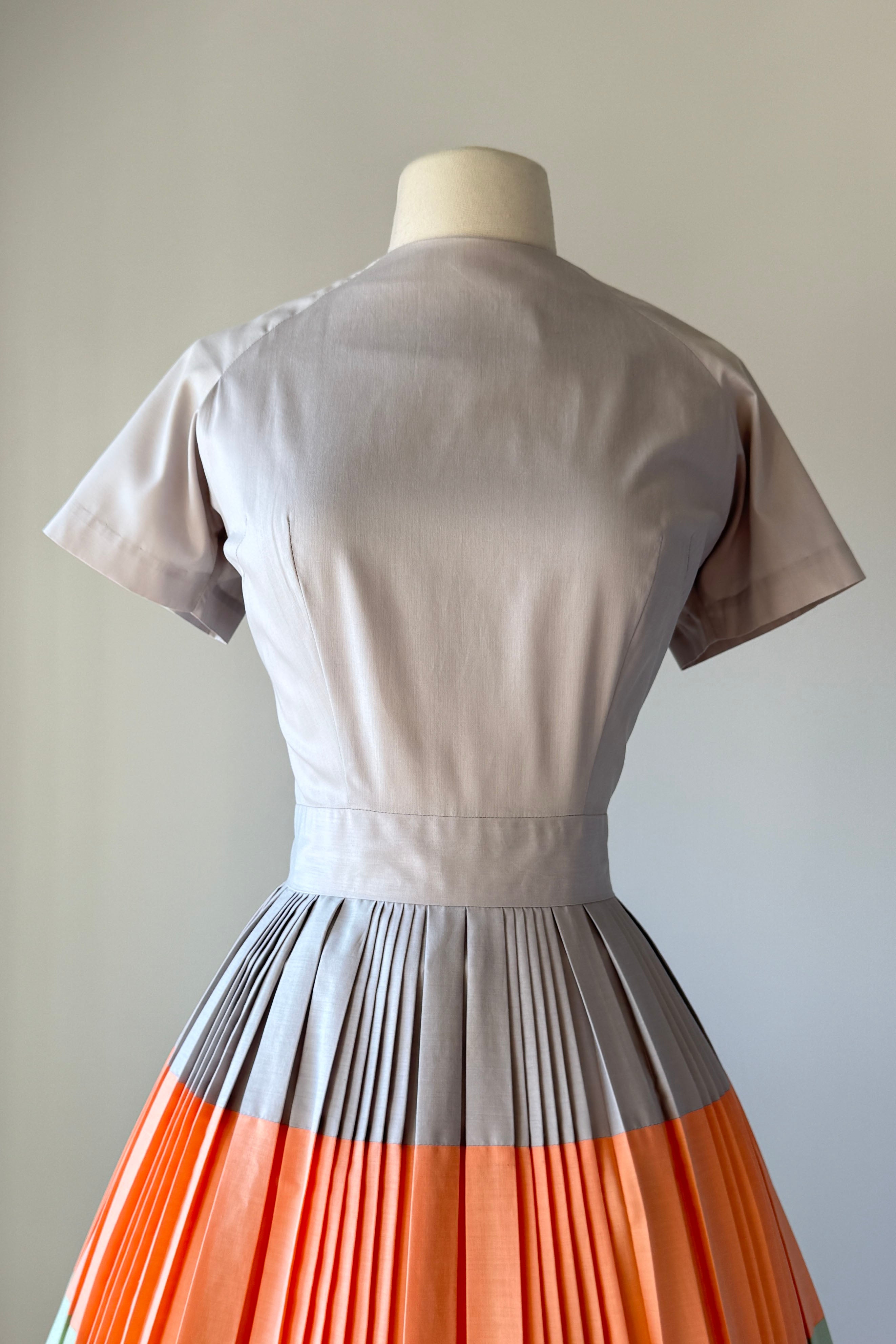 VINTAGE DRESS by MARION MCCOYVintage 1950s dress with pleated skirt, cap sleeves, metal back zipper. Wide horizontal stripe pattern. Cotton/poly. By Marion McCoy.Excellent condition. Freshly laundered and ready to wear.Fits like medium.Length 45Bodice 16Bust 38Waist 28As with all vintage, please expect wear consistent with age. All sales are final. No order cancellations.0656 | 2603
