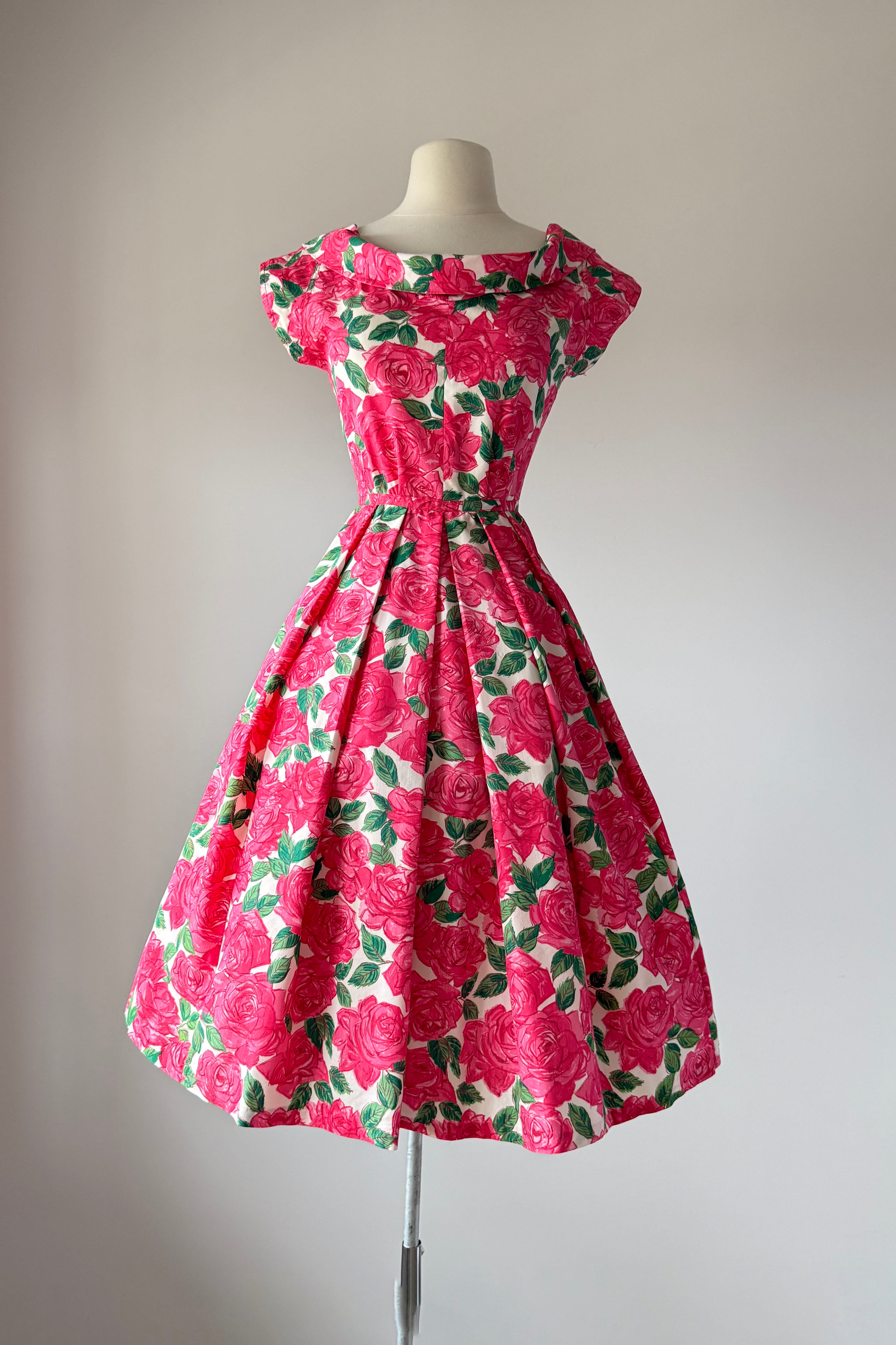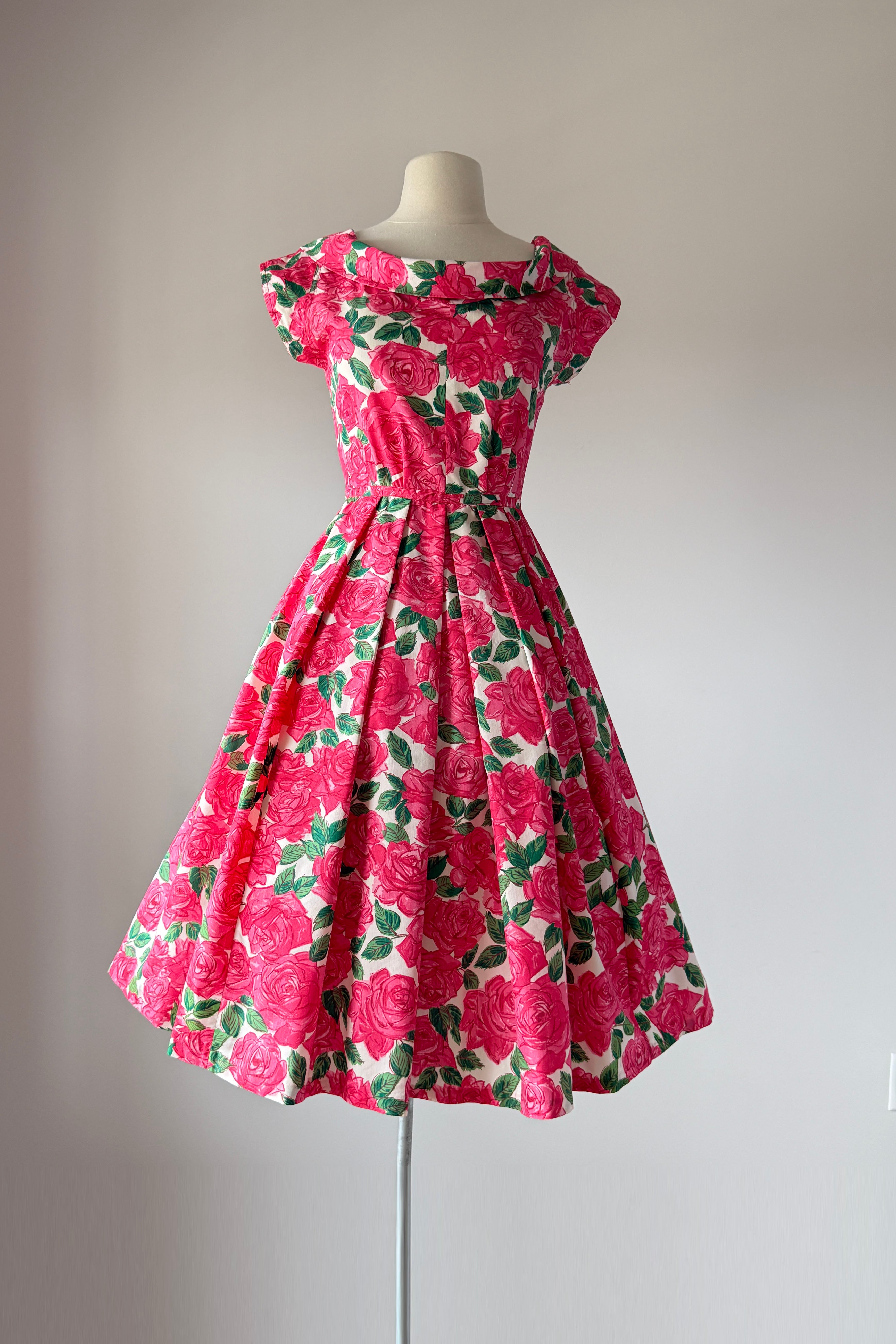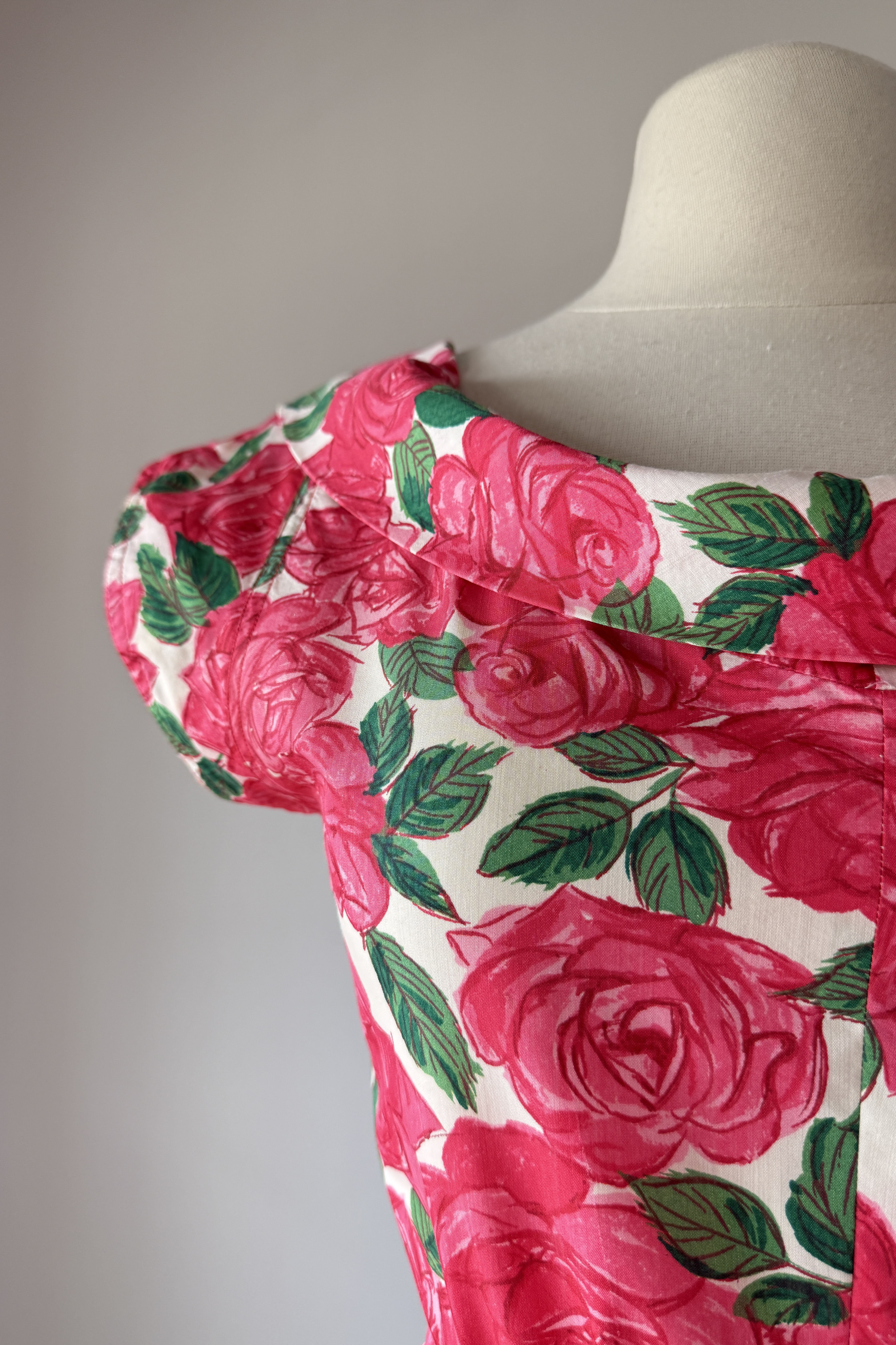 VINTAGE DRESSVintage 1950s dress. Features saturated pink rose print on white background, rolled collar with tie at back of neck, metal back zipper. Cotton.Excellent condition. SMALL. Length 41Bodice 15Bust 37-38Waist 27As with all vintage, please expect wear consistent with age. All sales are final. No order cancellations.0798 | 2607