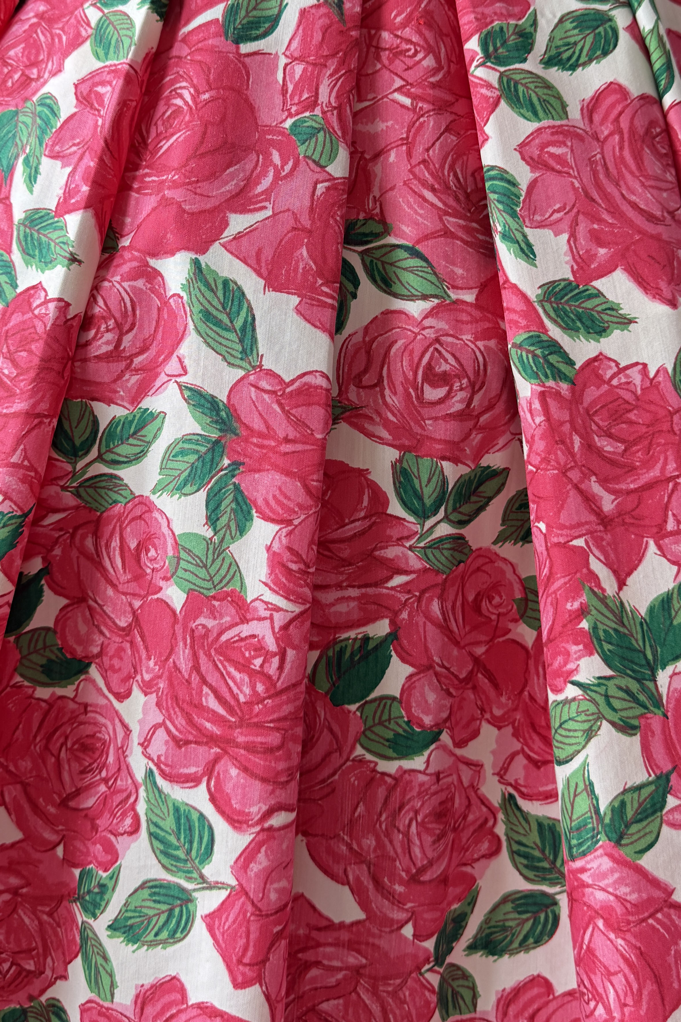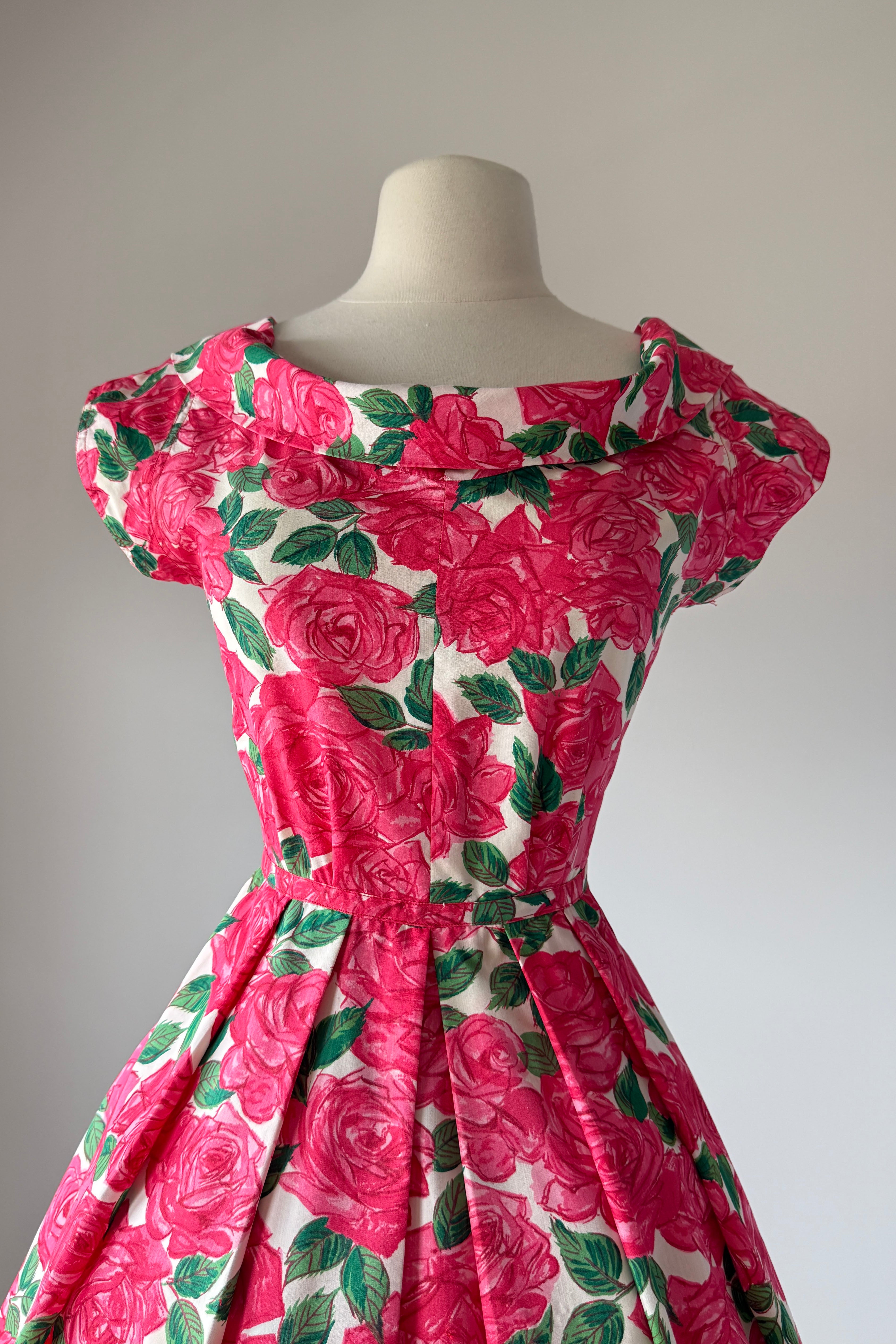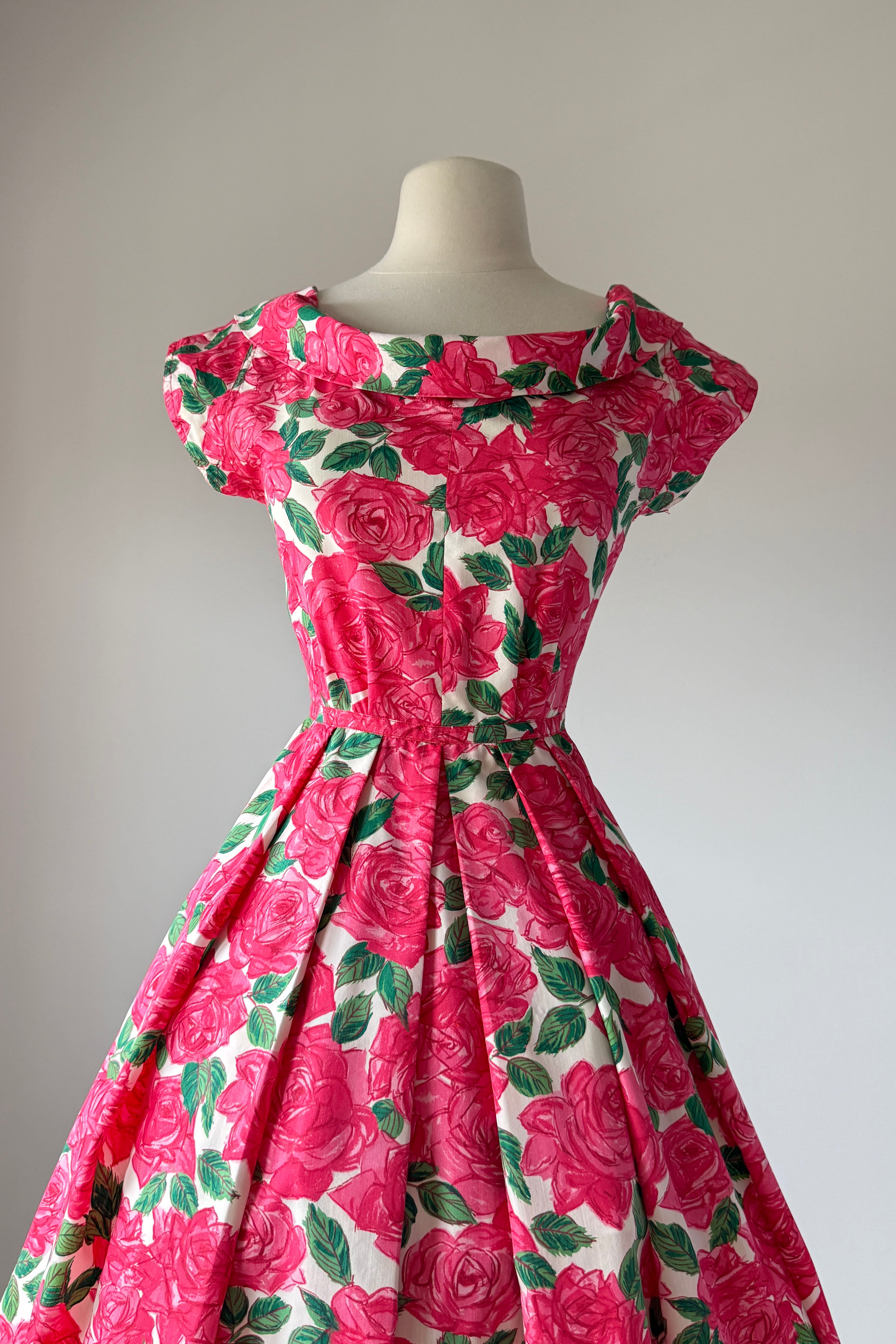 VINTAGE DRESSVintage 1950s dress. Features saturated pink rose print on white background, rolled collar with tie at back of neck, metal back zipper. Cotton.Excellent condition. SMALL. Length 41Bodice 15Bust 37-38Waist 27As with all vintage, please expect wear consistent with age. All sales are final. No order cancellations.0798 | 2607
