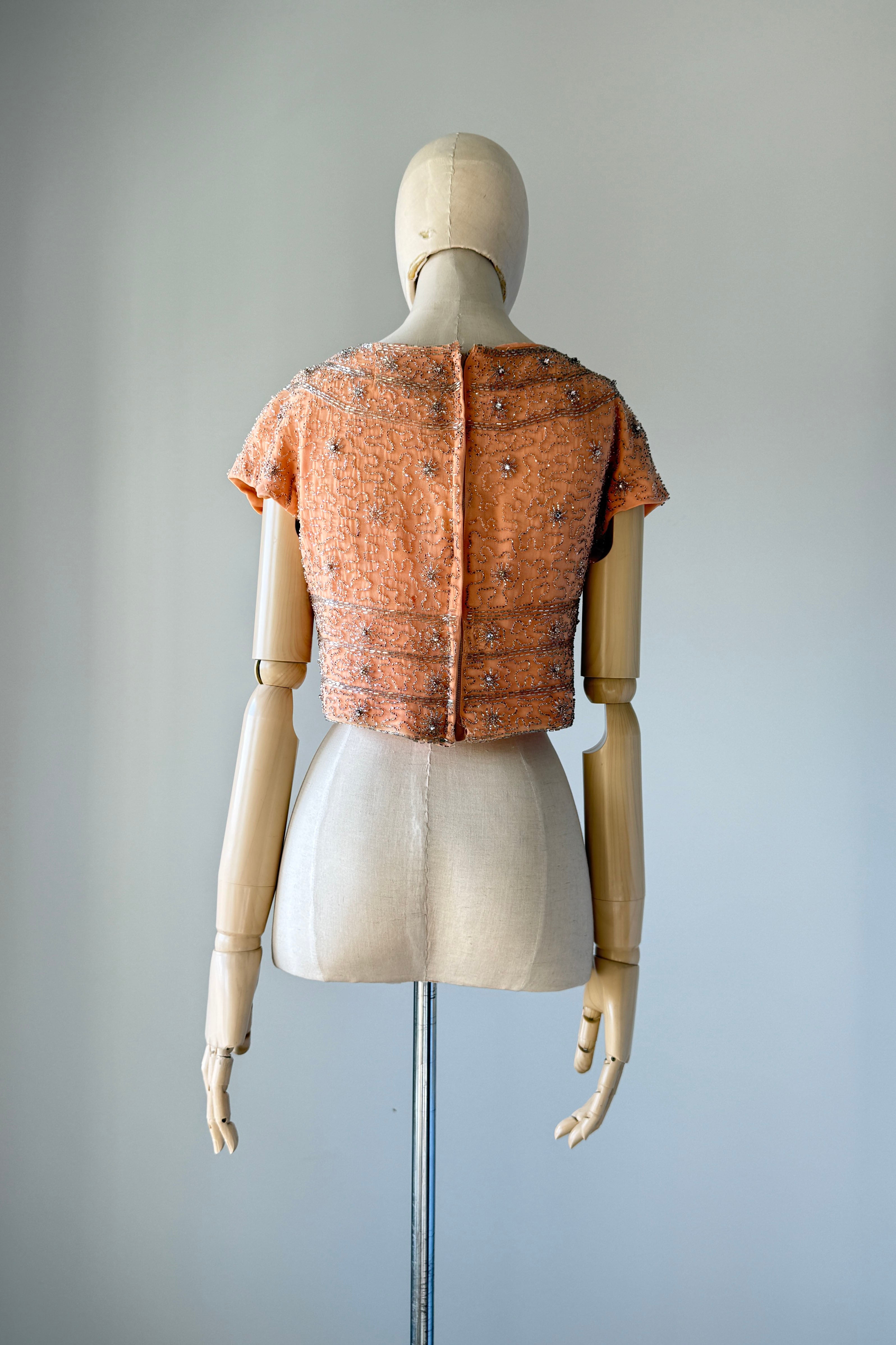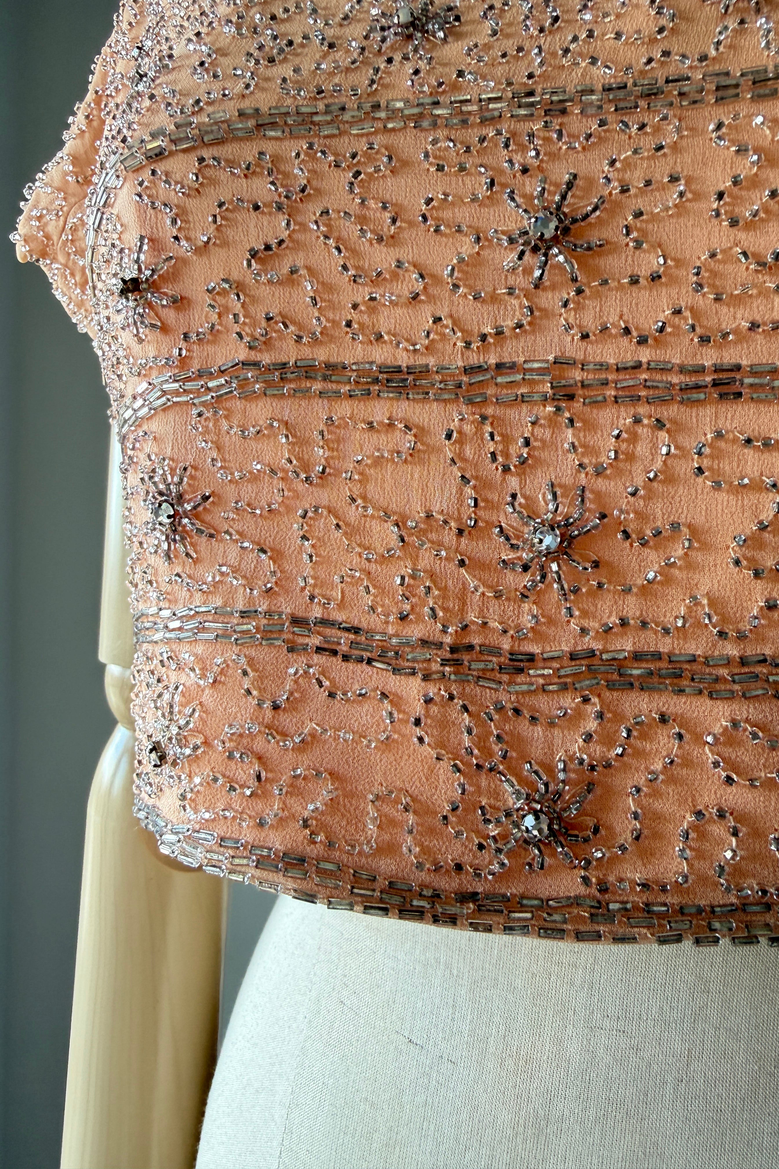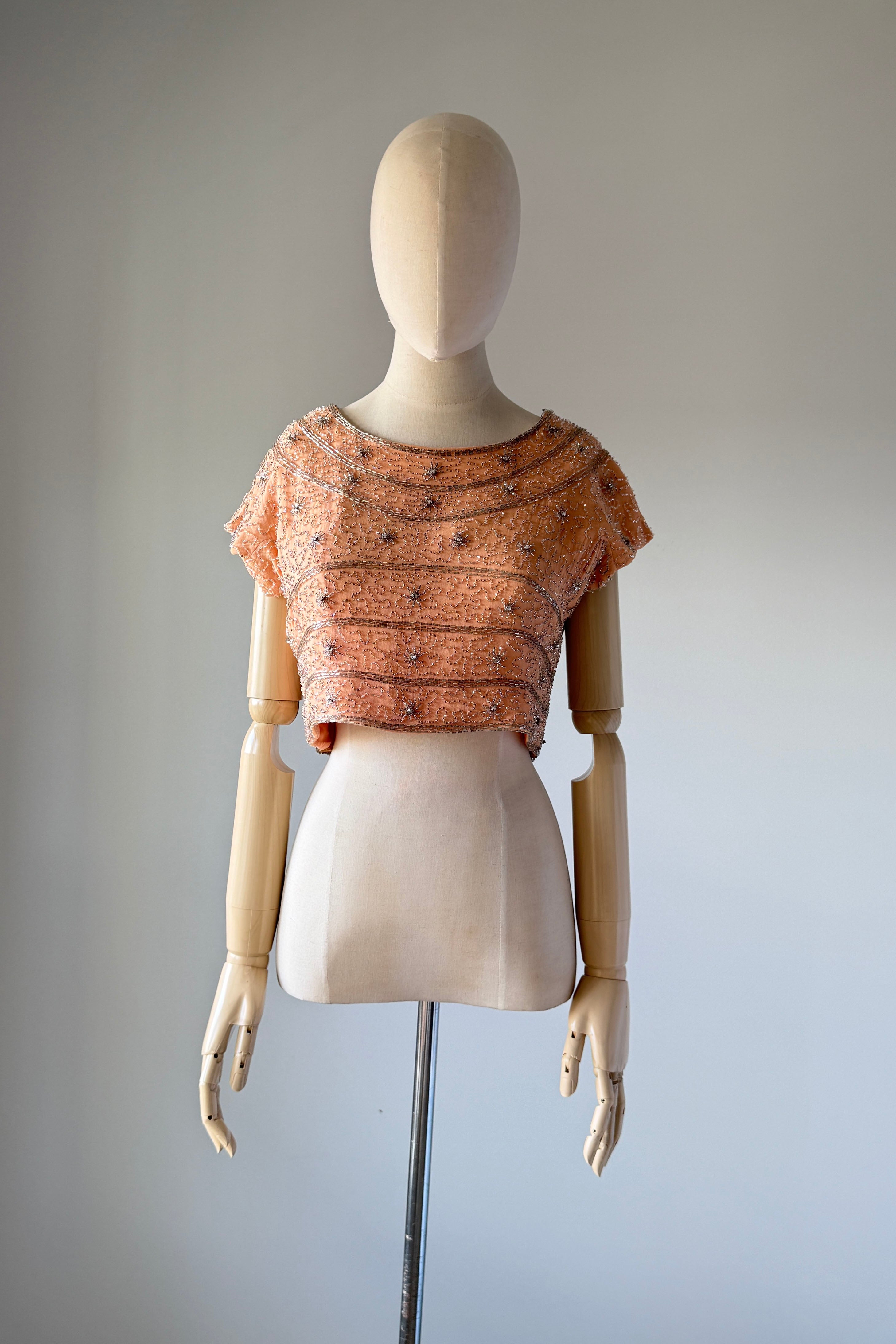 VINTAGE SILK TOPVintage 1960s apricot silk crepe top with glass beads and rhinestones, lined in cotton with metal back zipper. Excellent condition aside from some very minor bead loss.Fits like xs/s. Length 15Bust 34-36As with all vintage, please expect wear consistent with age. All sales are final. No order cancellations.0820 | 2605