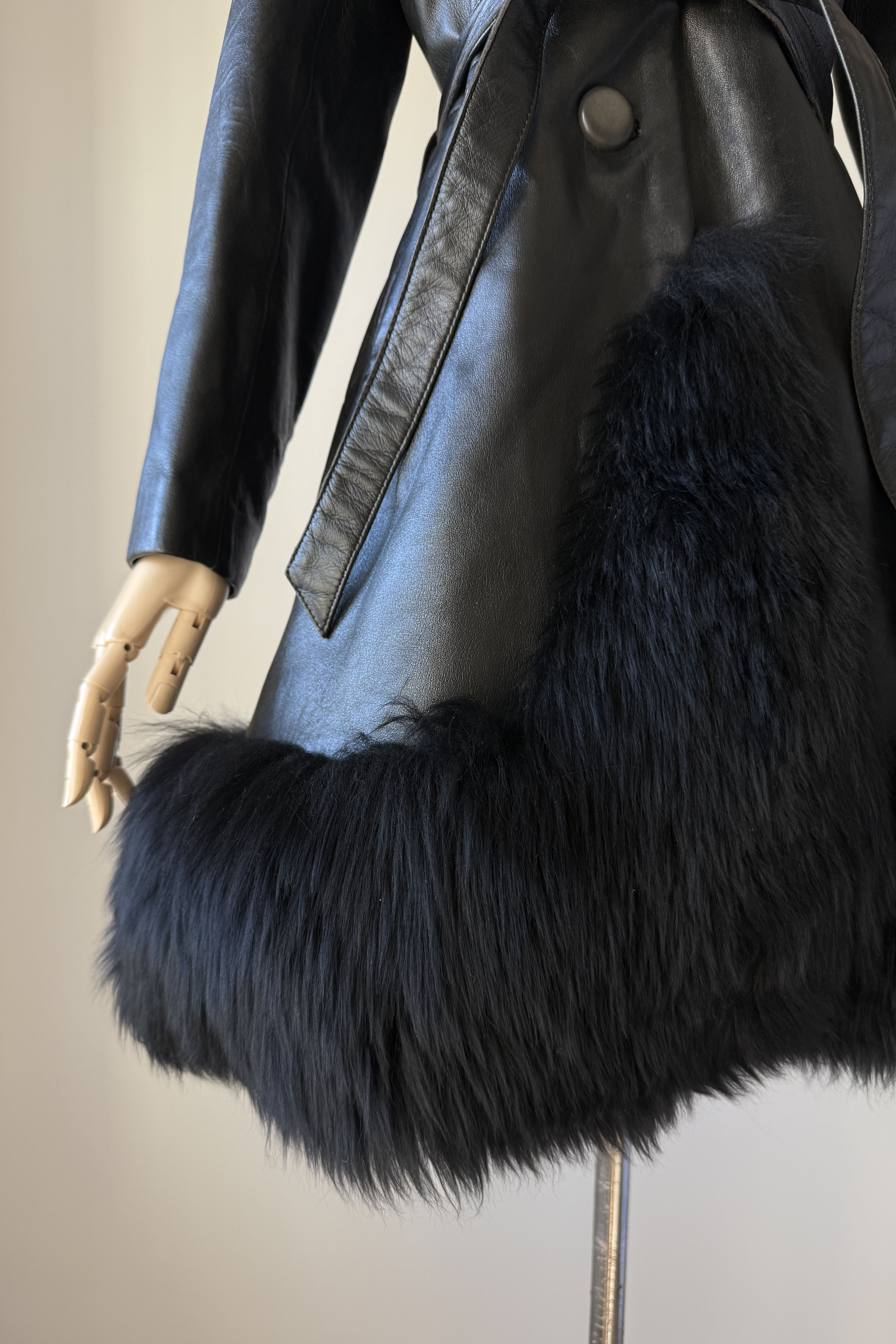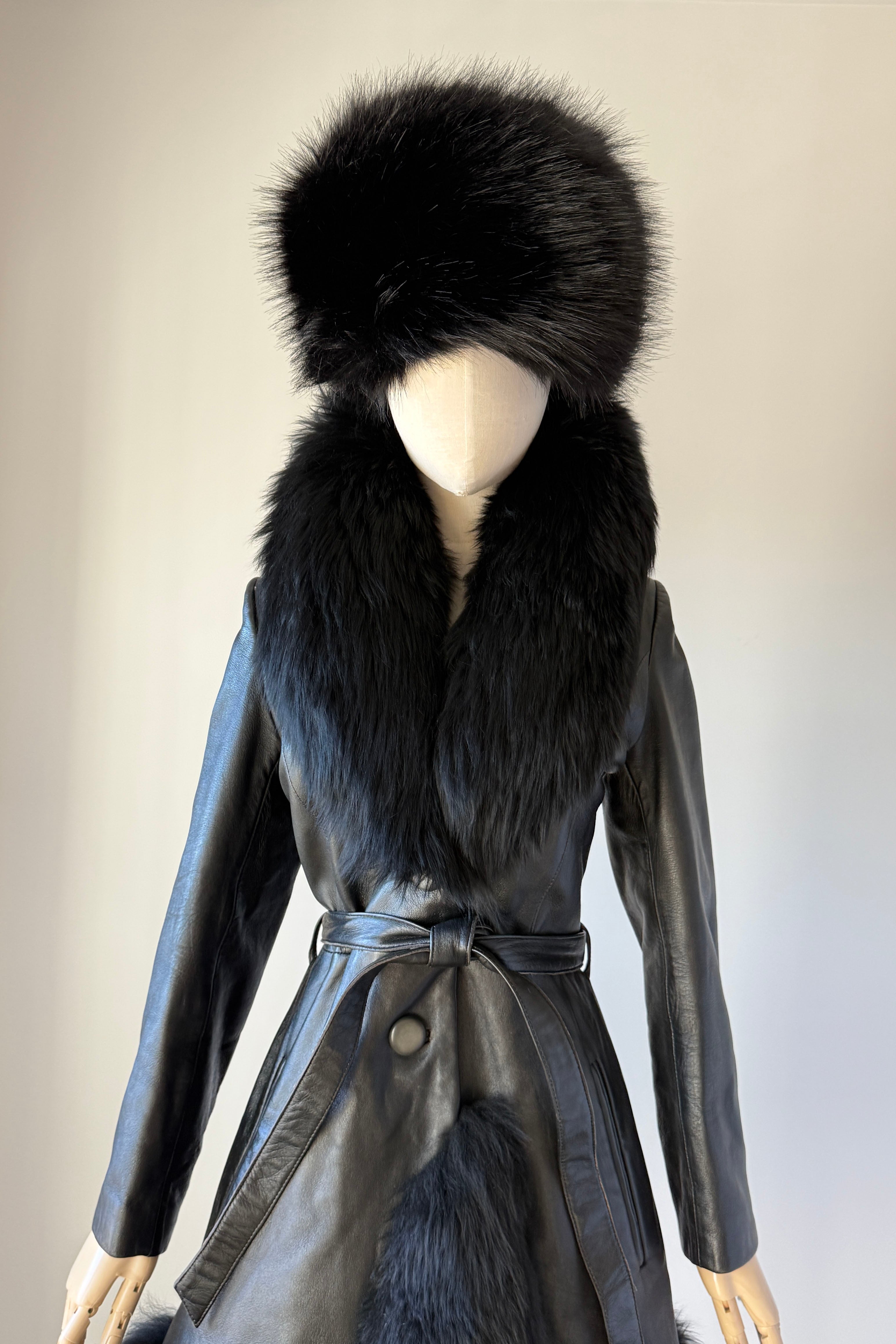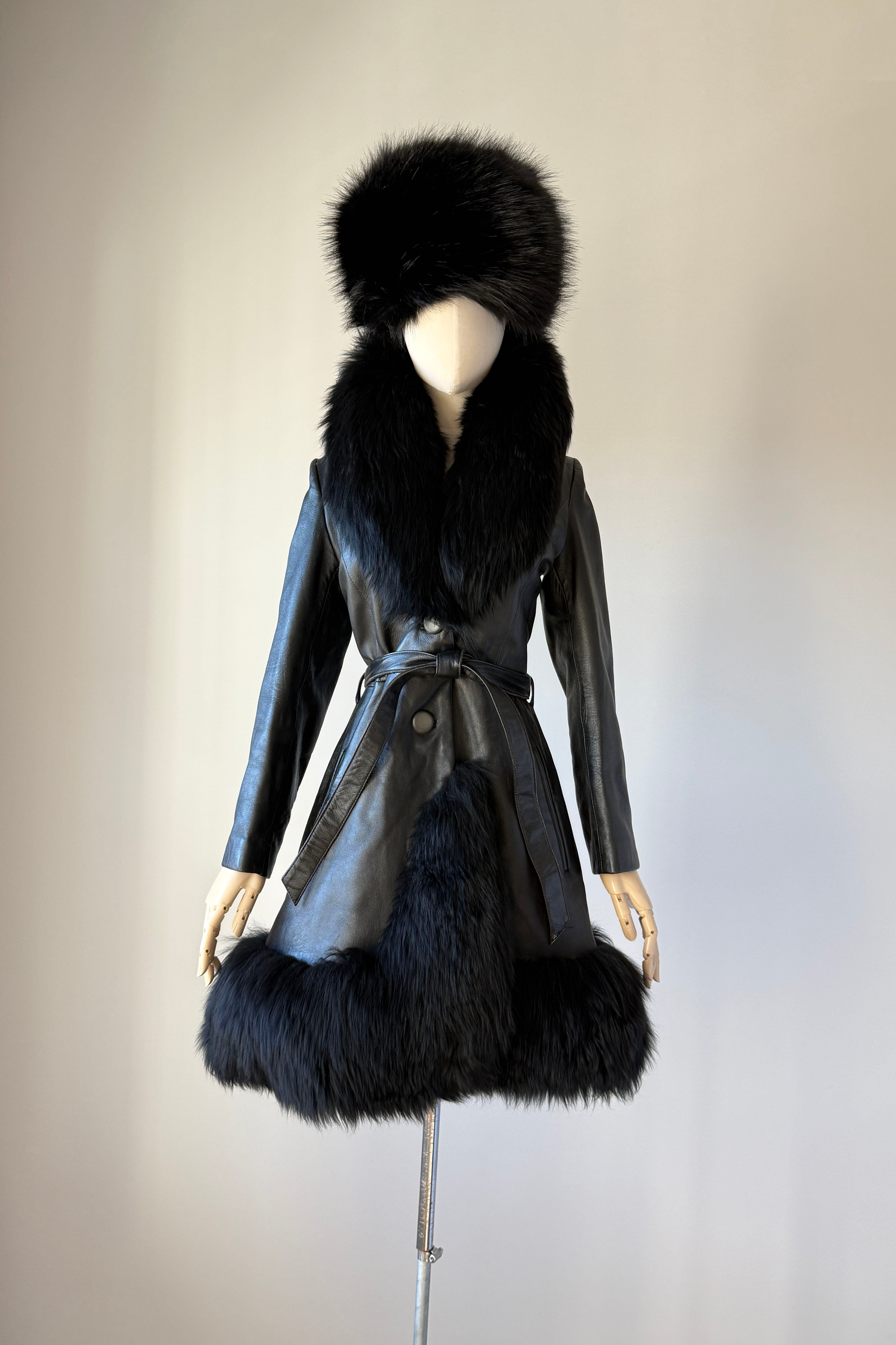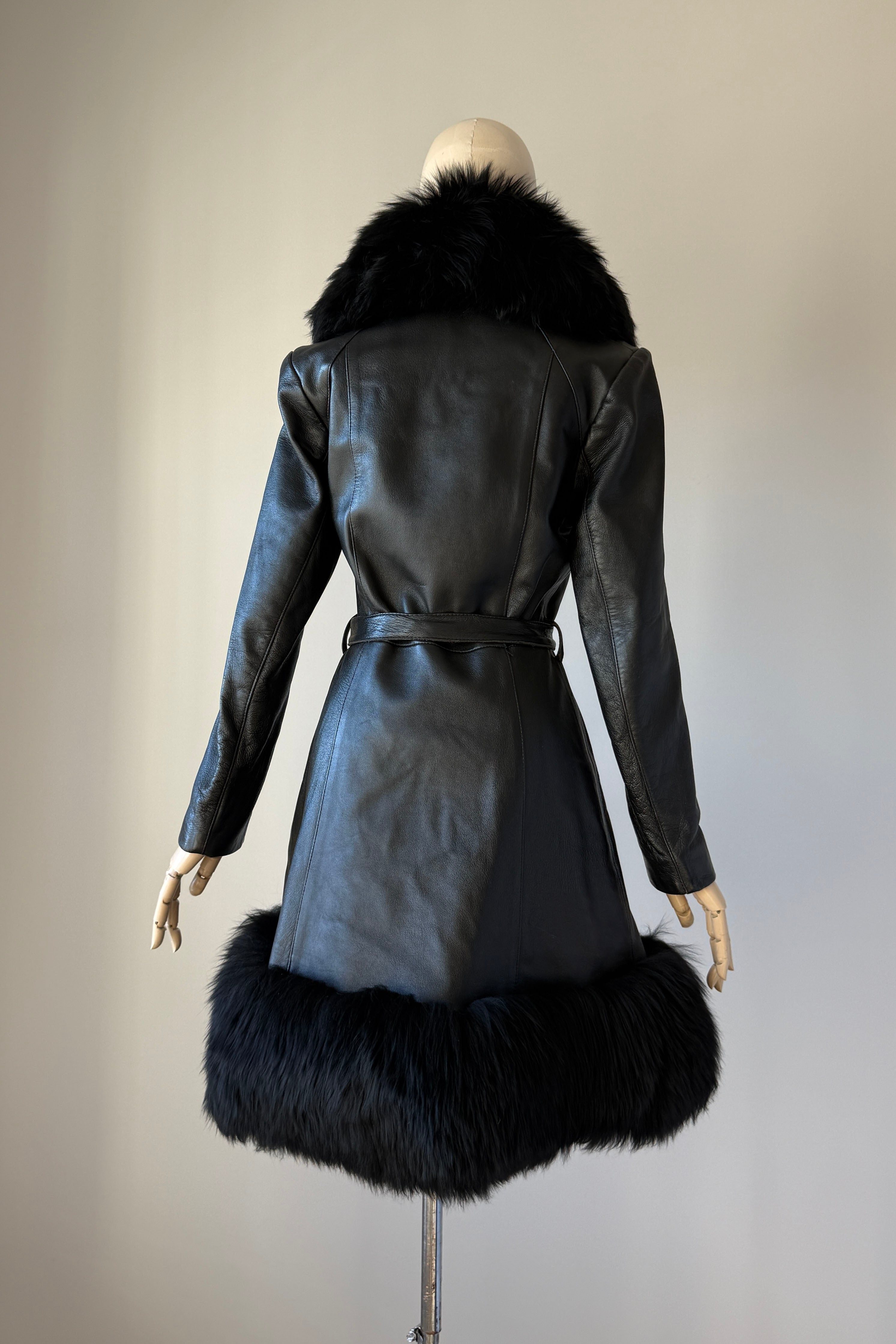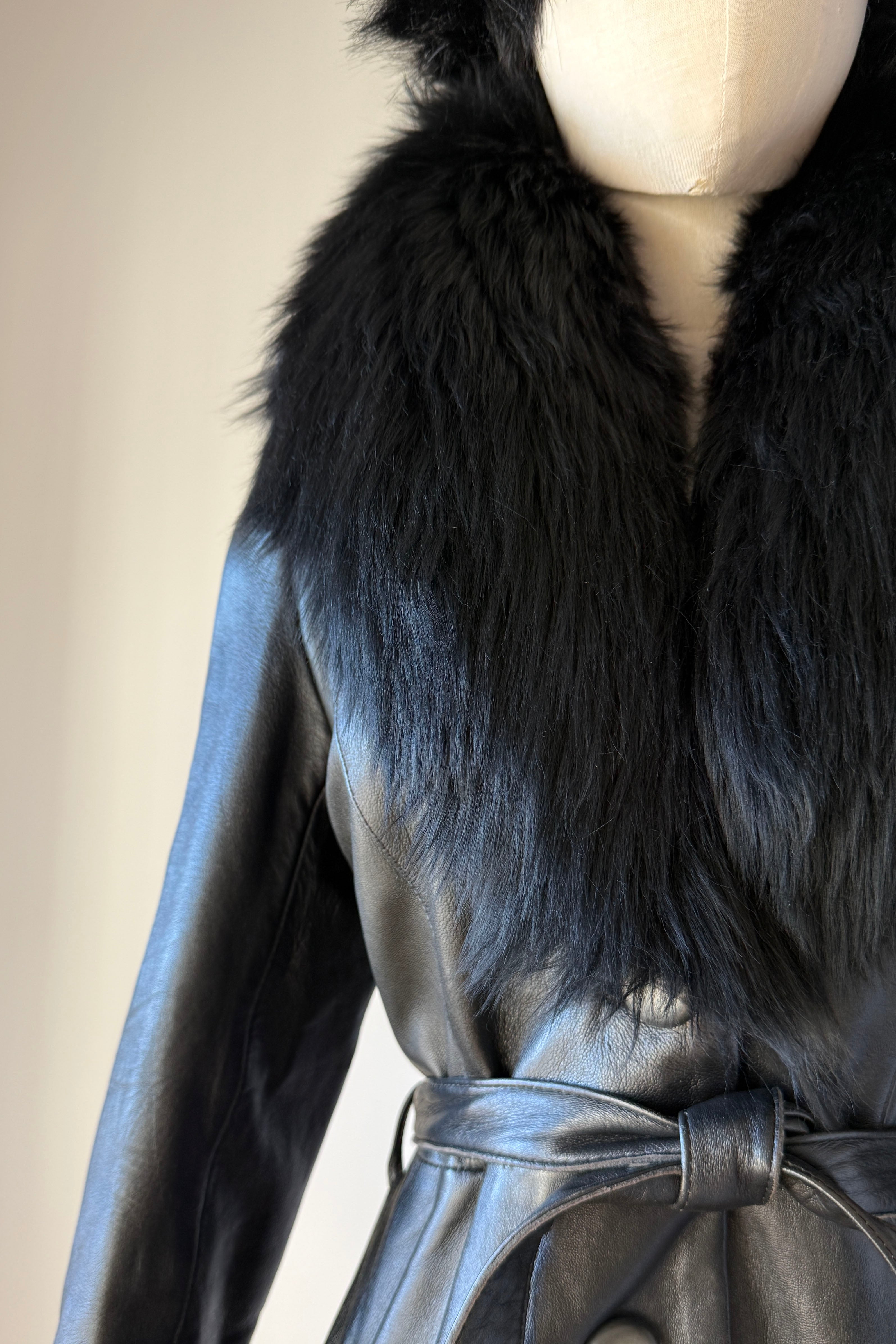 VINTAGE LEATHER + SHEARLING COATVintage black leather with wide shearling fur trim. Two buttons at waist, adjustable tie belt, acetate lining, pockets.Excellent condition. Fits like xs/s.Length 36Bodice 16Shoulder 16Sleeve 21Bust 34-36Waist 28As with all vintage, please expect wear consistent with age. All sales are final. No order cancellations.0791 | 2603