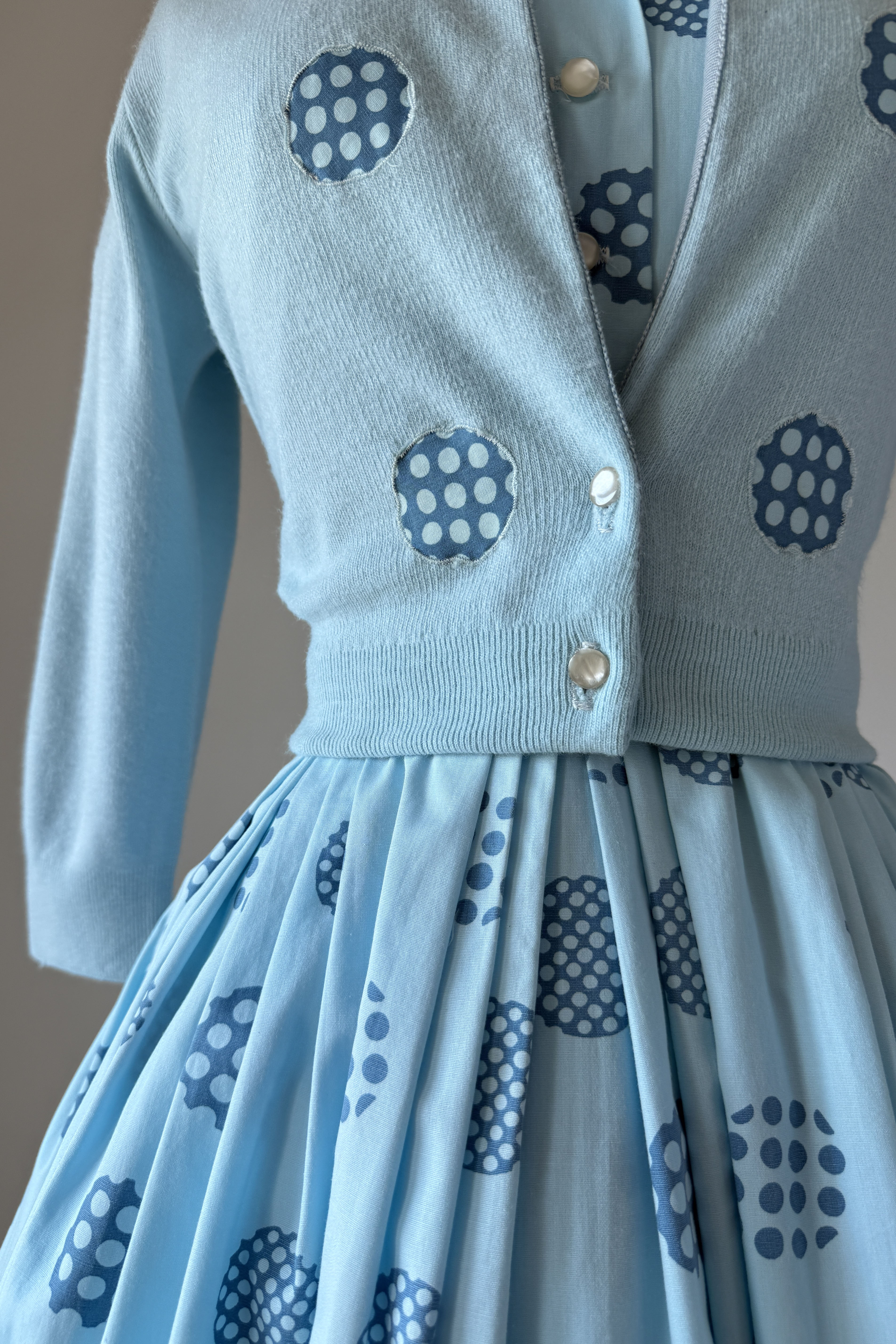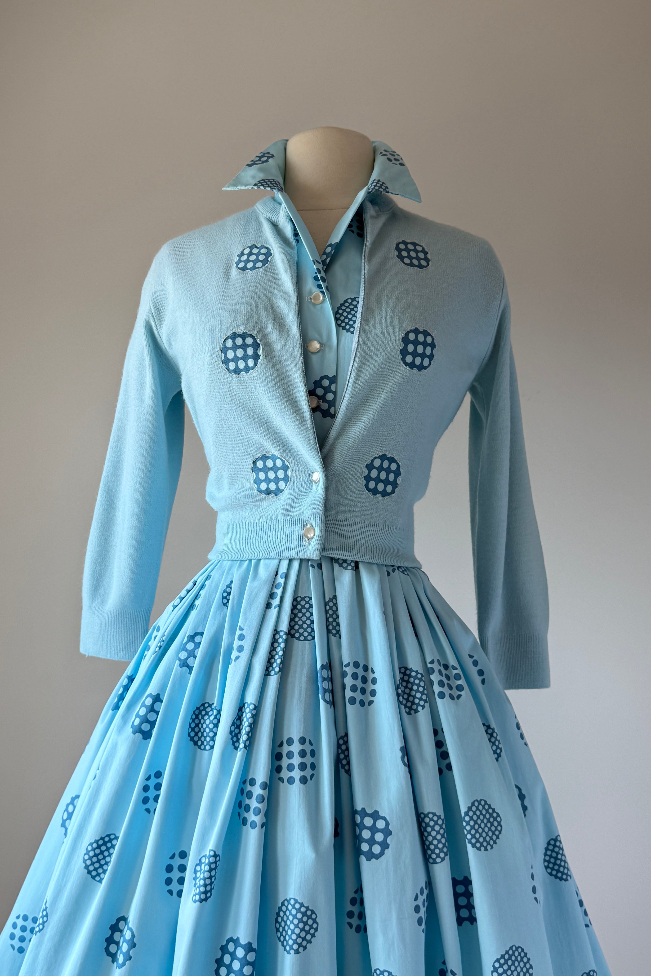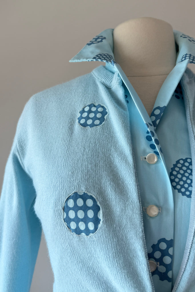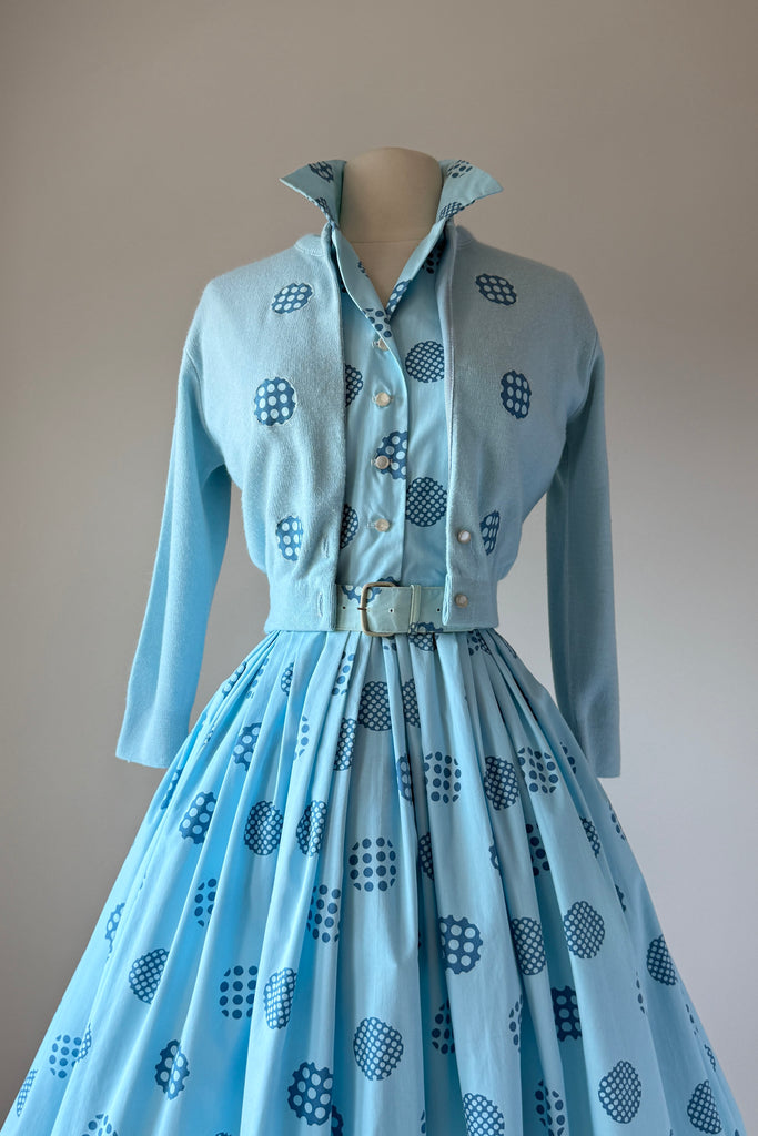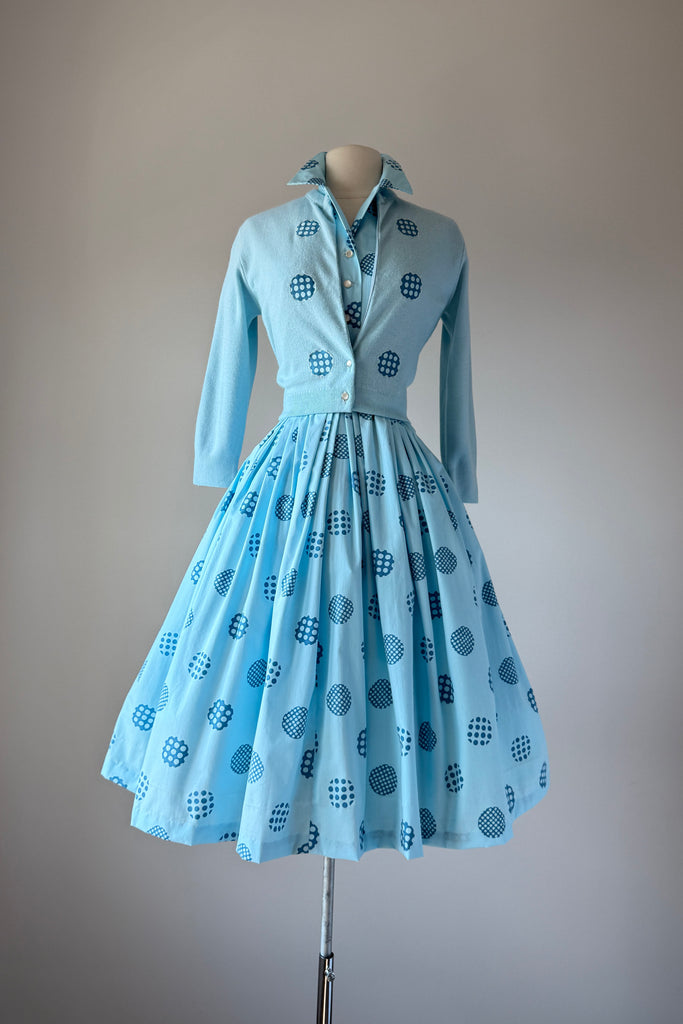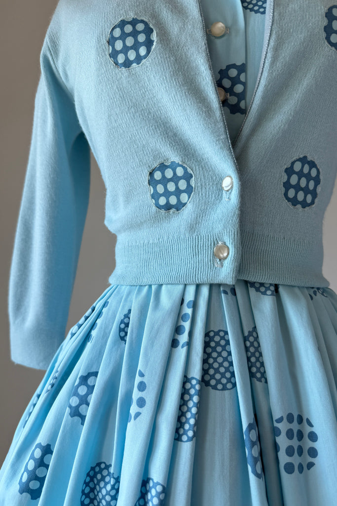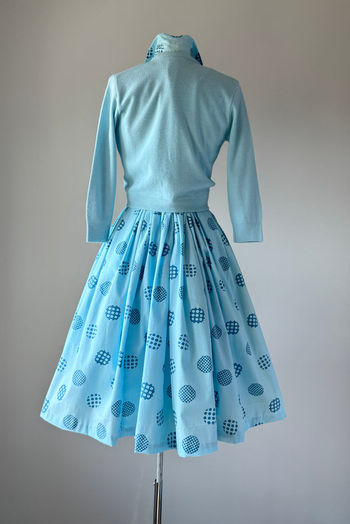 1960s Harry Rosenfeld Blue Polka Dot Dress and Sweater Set
