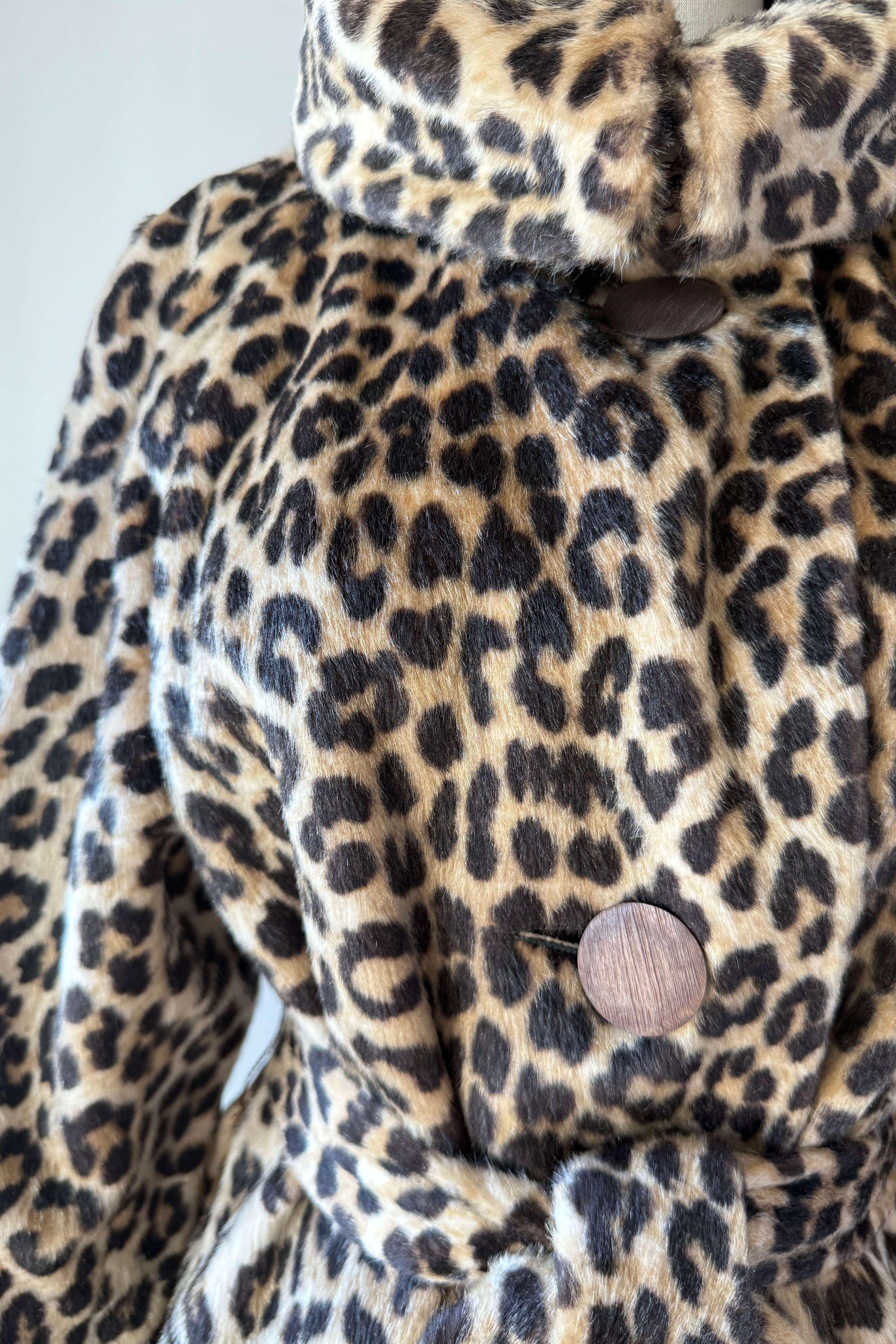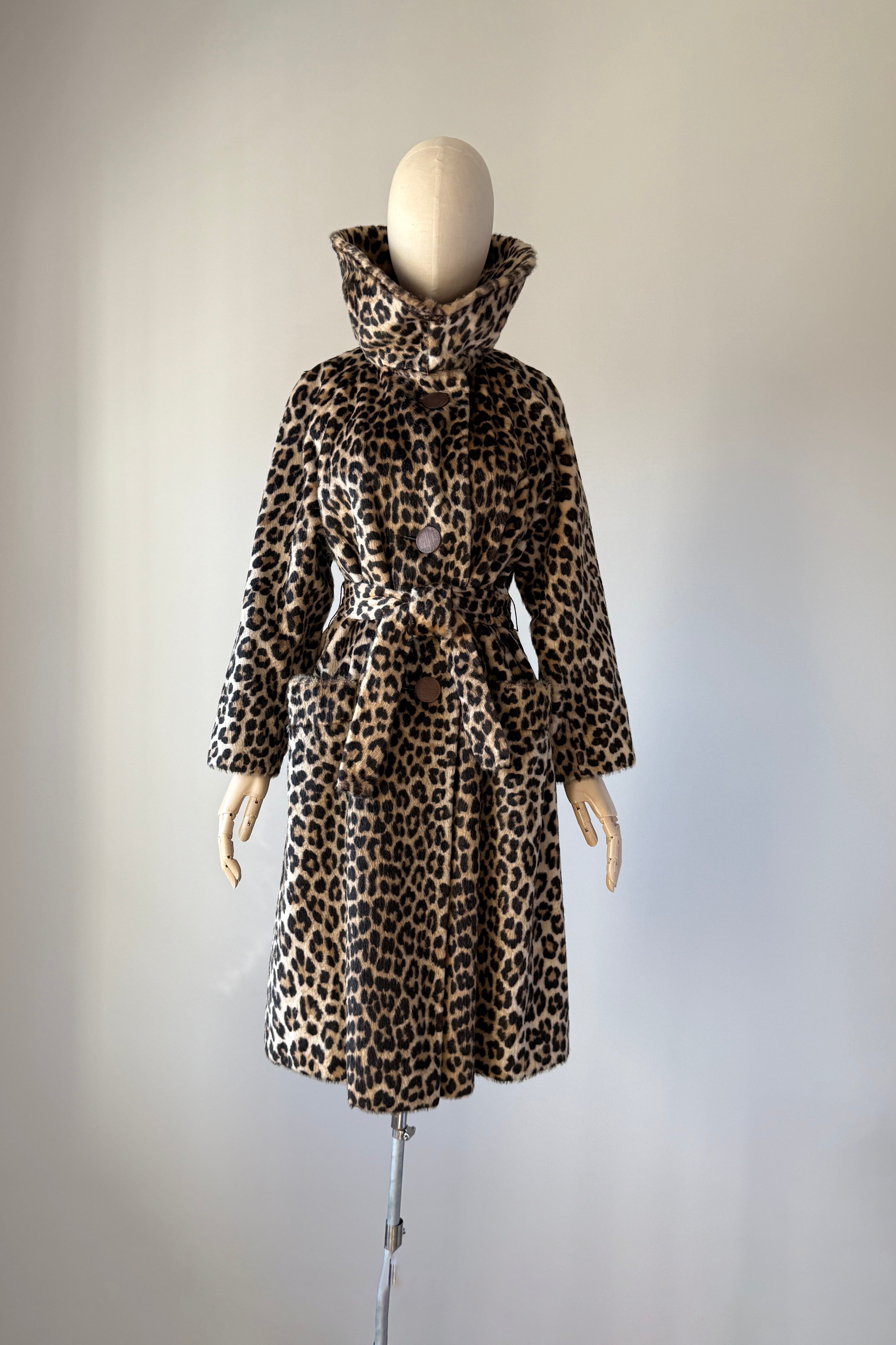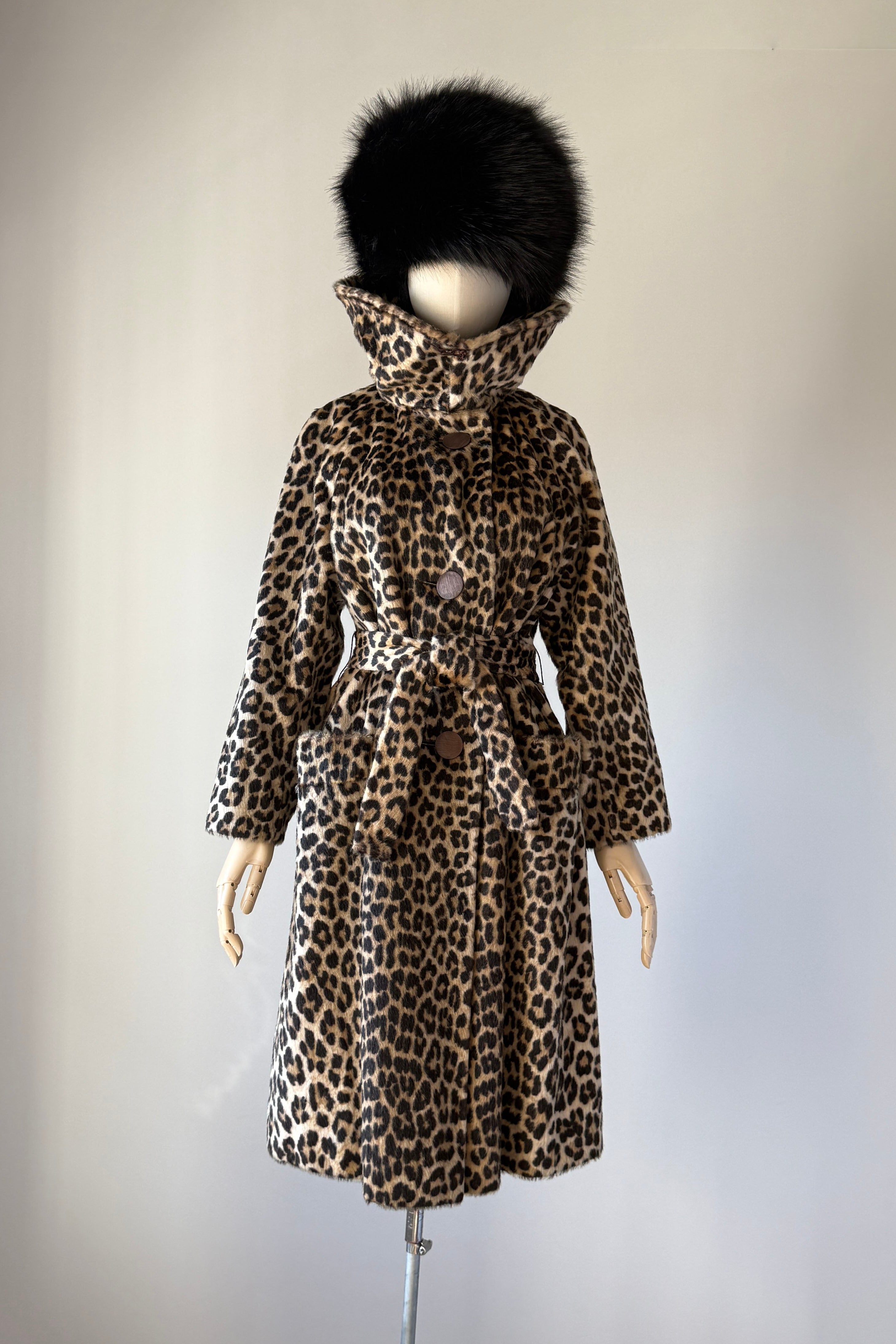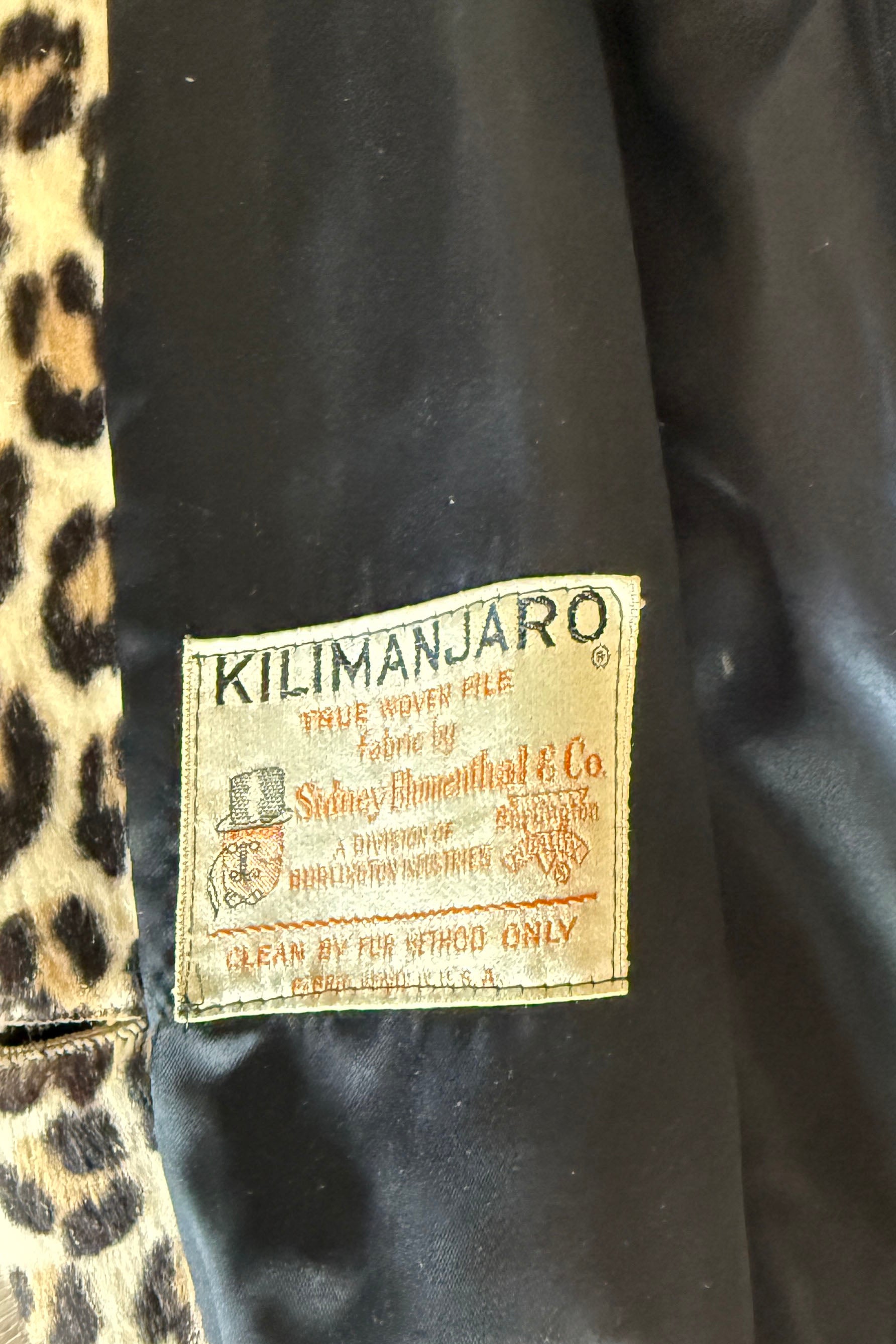 VINTAGE LEOPARD COATVintage 1960s leopard faux fur coat by Kilimanjaro. Collar can be worn up or folded (hook/eye closure), front button, detachable tie belt, exterior pockets. Fully lined in acetate. Great condition - a few small holes in the lining otherwise no flaws.Fits like MEDIUMLength 39Shoulder 17Sleeve 29Bust 42Waist 48Hip 54As with all vintage, please expect wear consistent with age. All sales are final. No order cancellations.0767 | 2602