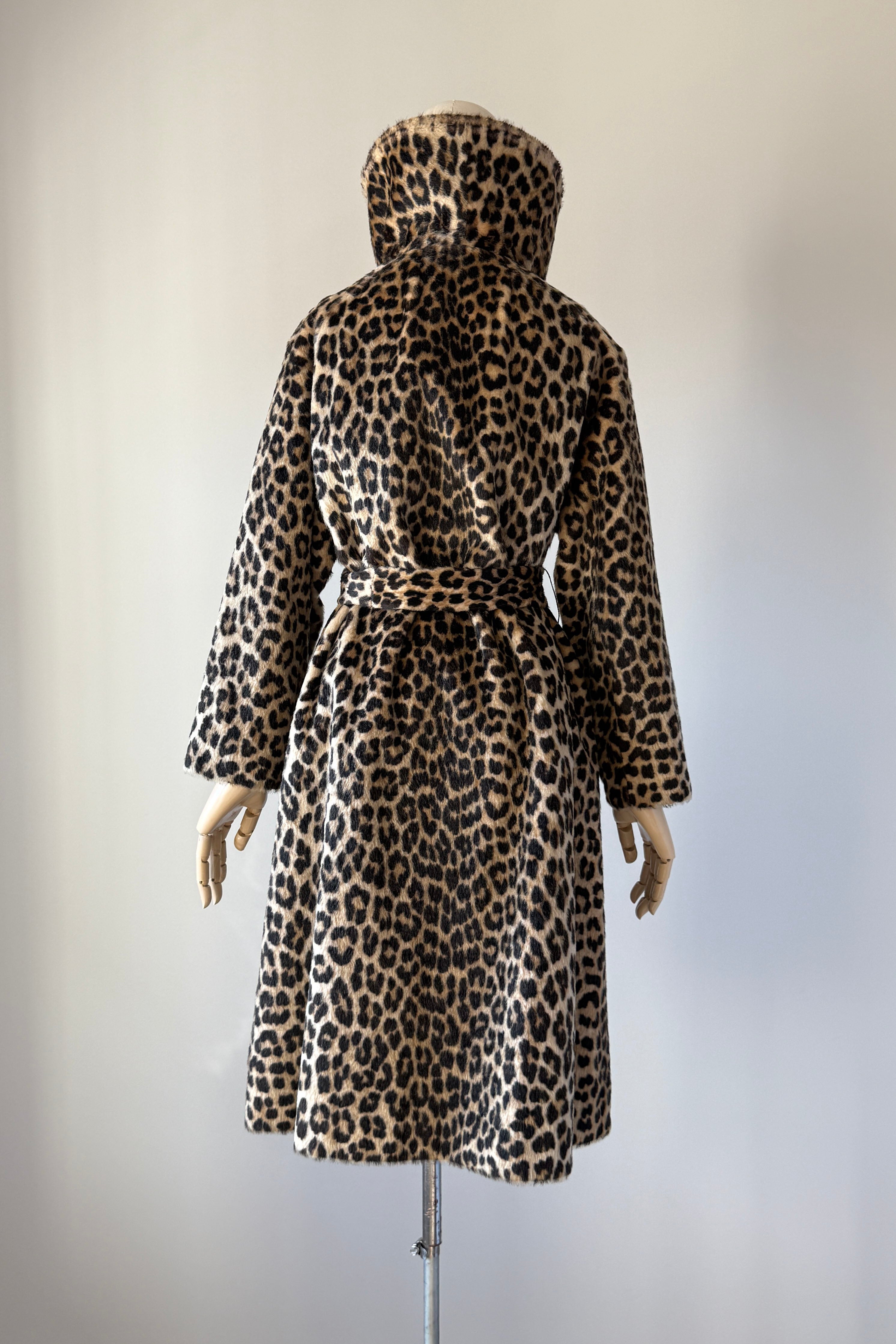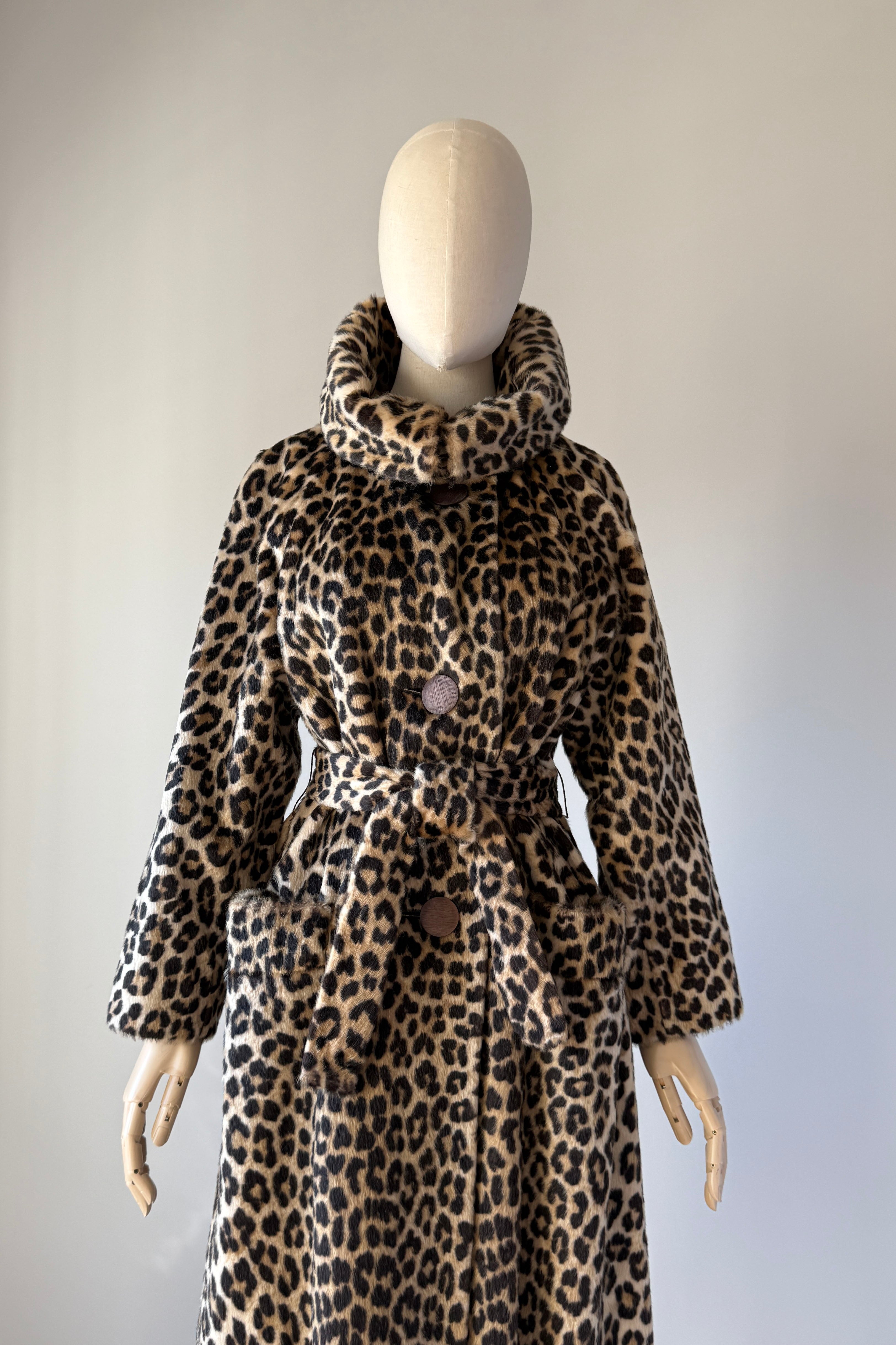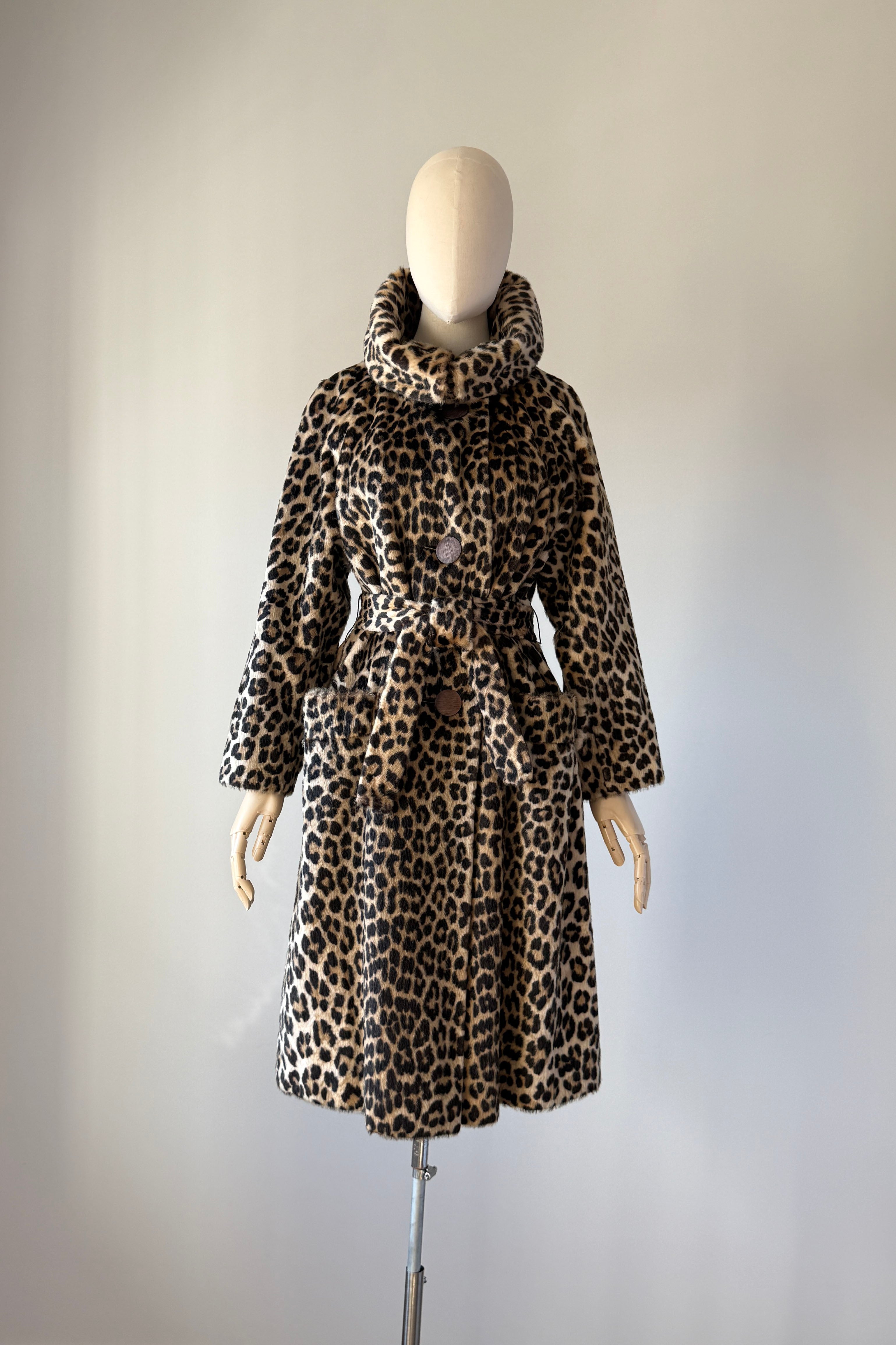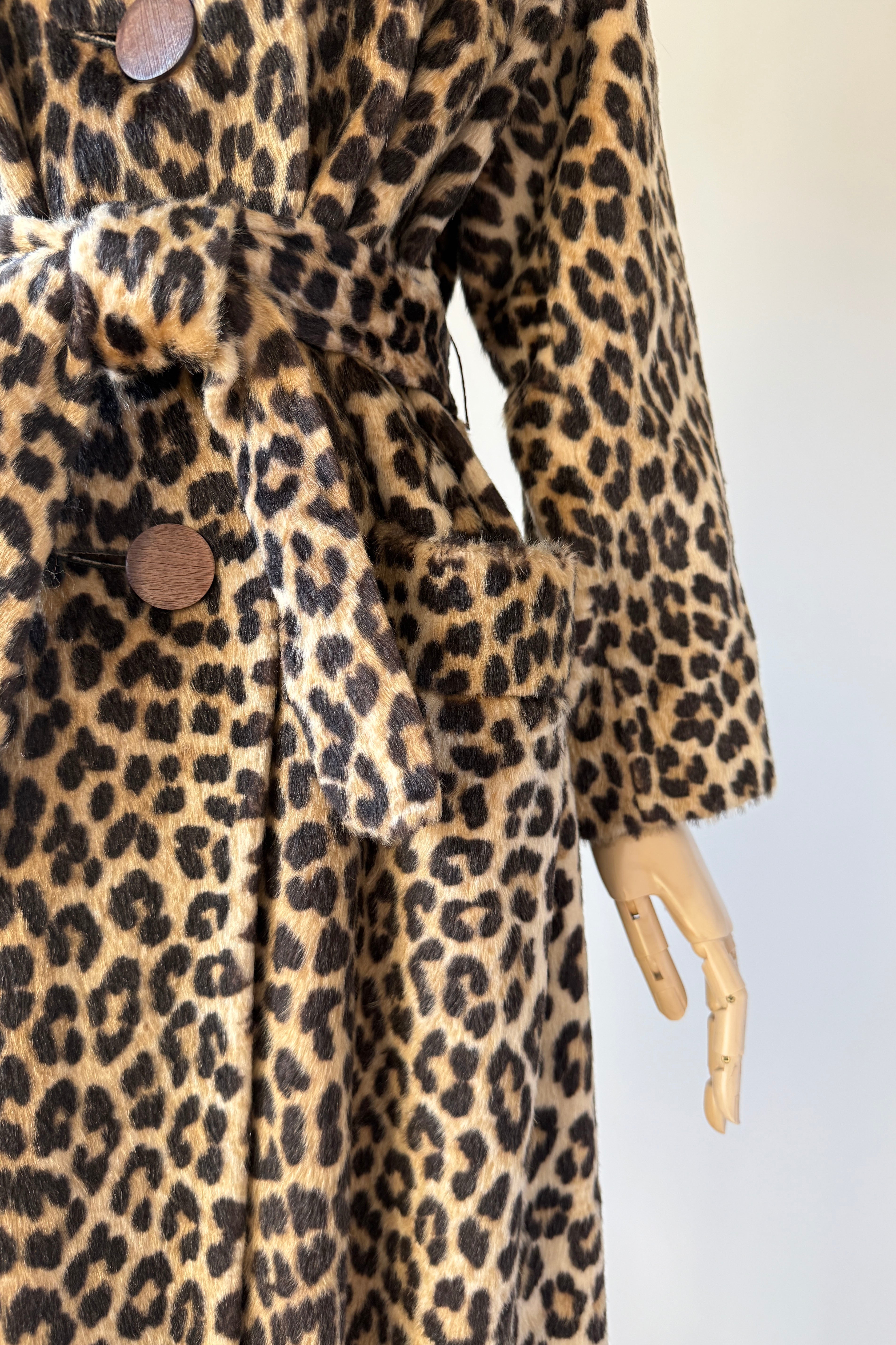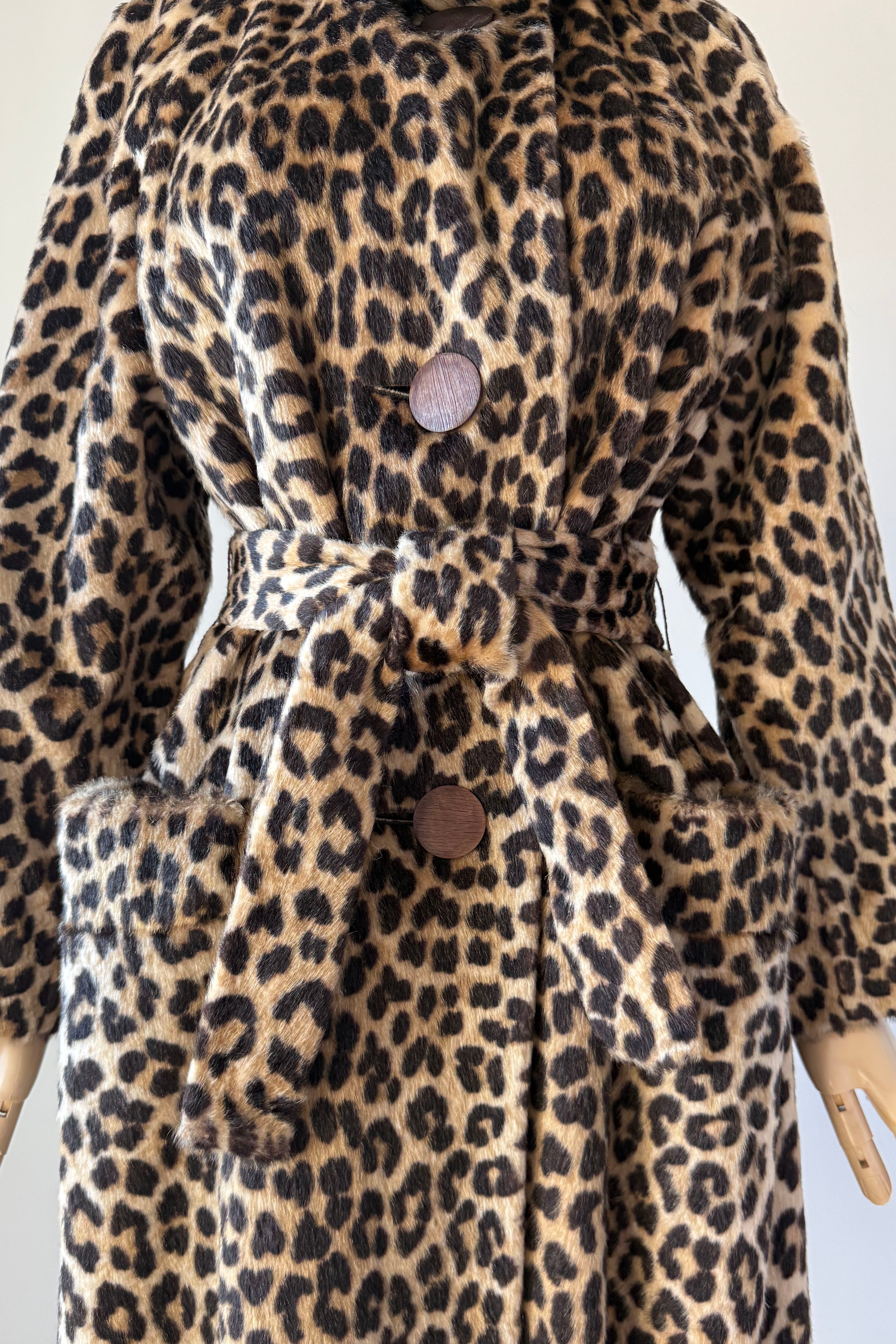 VINTAGE LEOPARD COATVintage 1960s leopard faux fur coat by Kilimanjaro. Collar can be worn up or folded (hook/eye closure), front button, detachable tie belt, exterior pockets. Fully lined in acetate. Great condition - a few small holes in the lining otherwise no flaws.Fits like MEDIUMLength 39Shoulder 17Sleeve 29Bust 42Waist 48Hip 54As with all vintage, please expect wear consistent with age. All sales are final. No order cancellations.0767 | 2602
