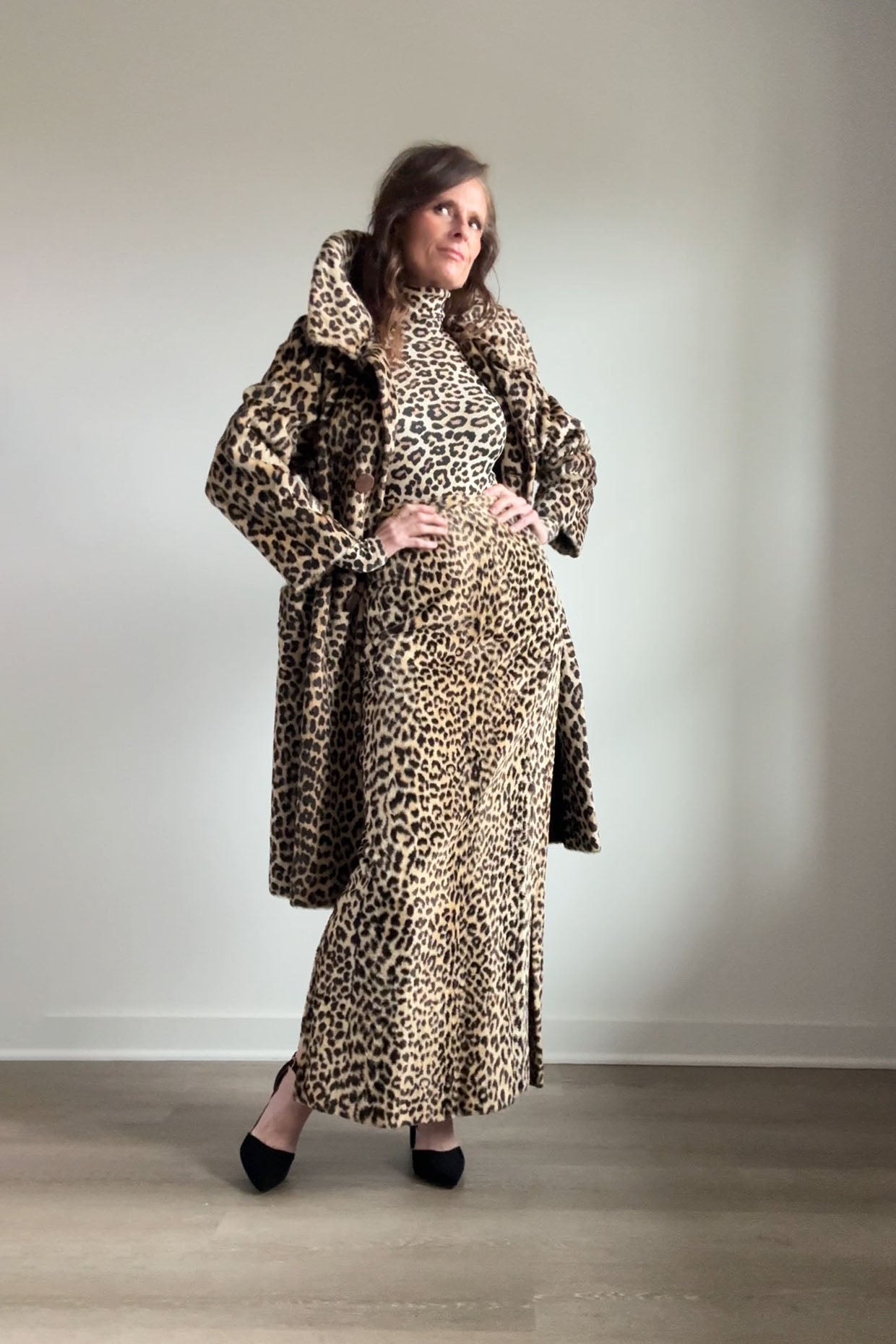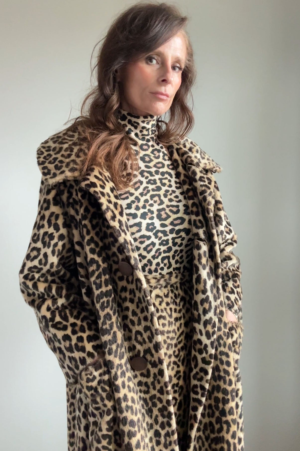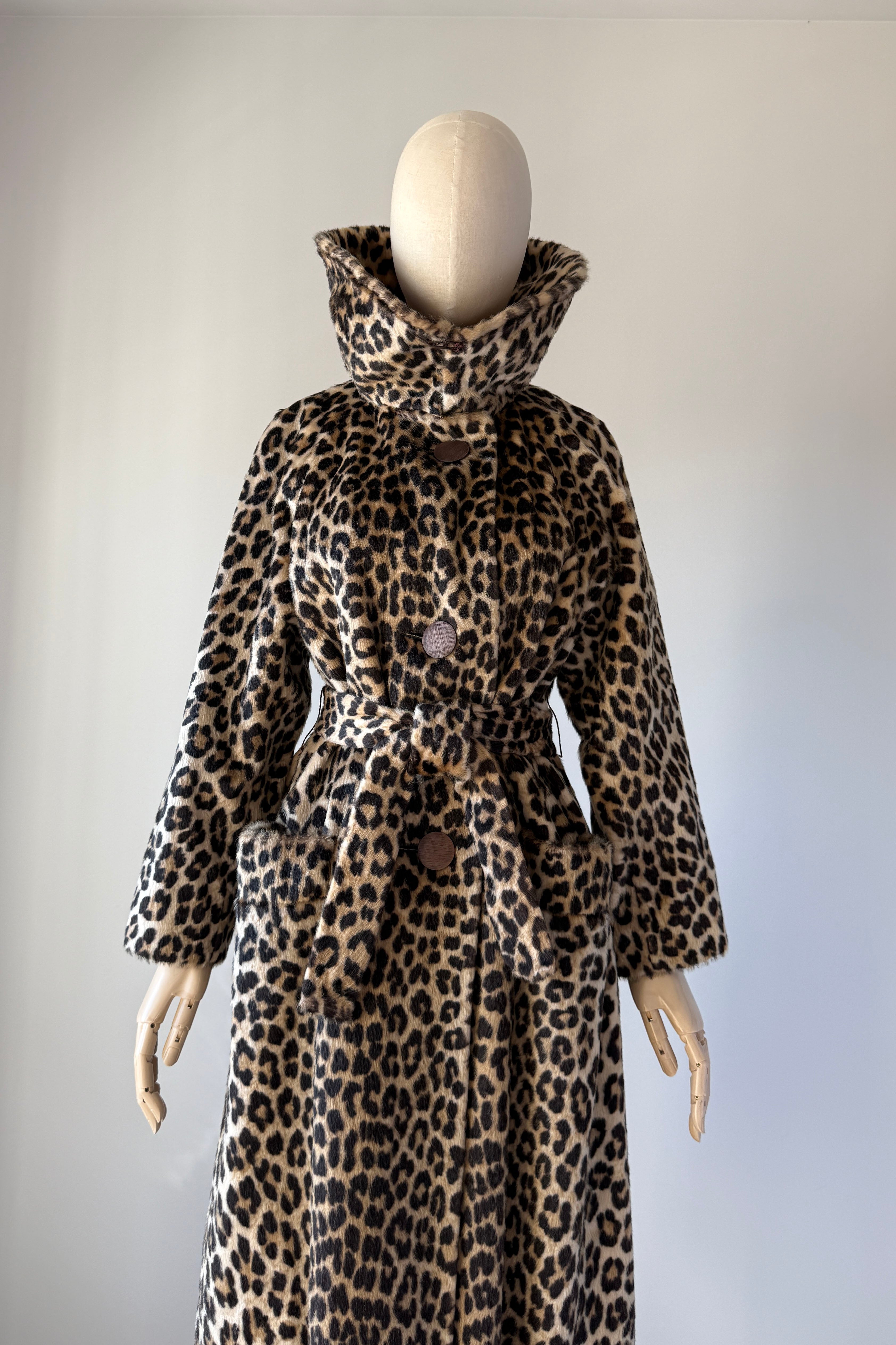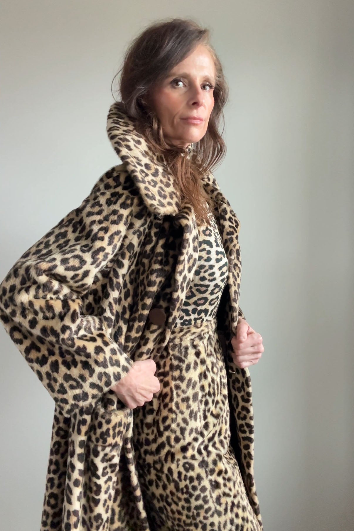 VINTAGE LEOPARD COATVintage 1960s leopard faux fur coat by Kilimanjaro. Collar can be worn up or folded (hook/eye closure), front button, detachable tie belt, exterior pockets. Fully lined in acetate. Great condition - a few small holes in the lining otherwise no flaws.Fits like MEDIUMLength 39Shoulder 17Sleeve 29Bust 42Waist 48Hip 54As with all vintage, please expect wear consistent with age. All sales are final. No order cancellations.0767 | 2602