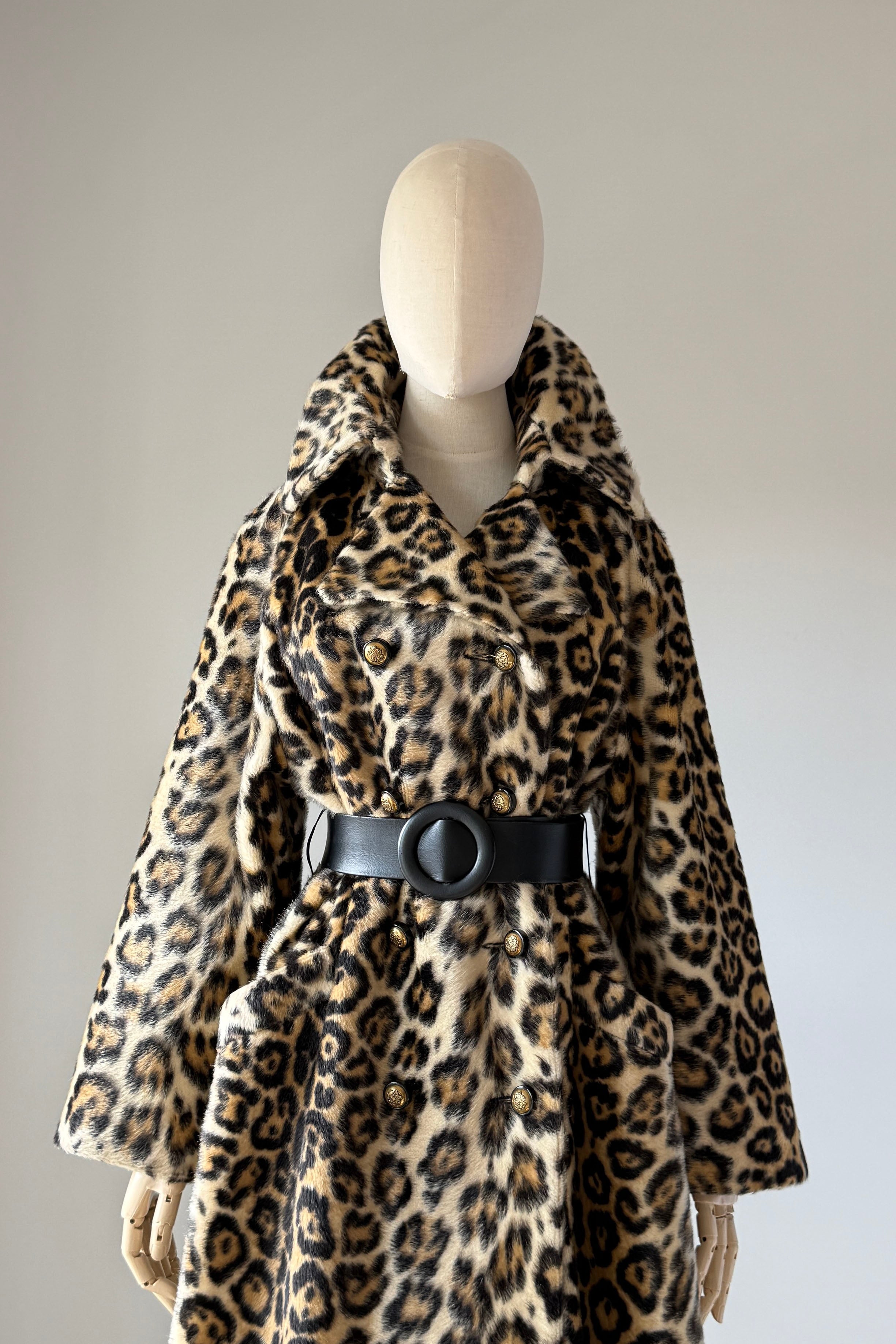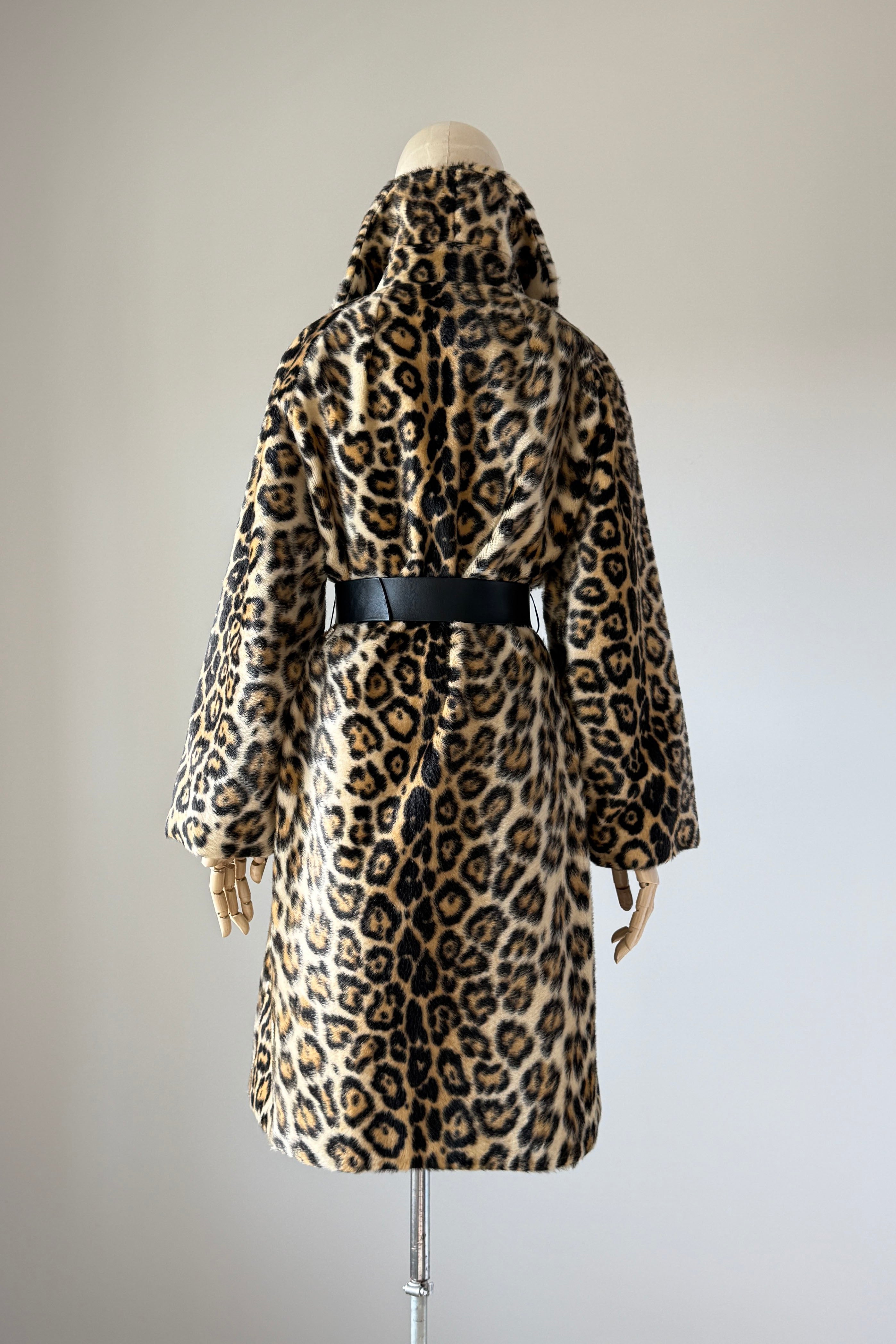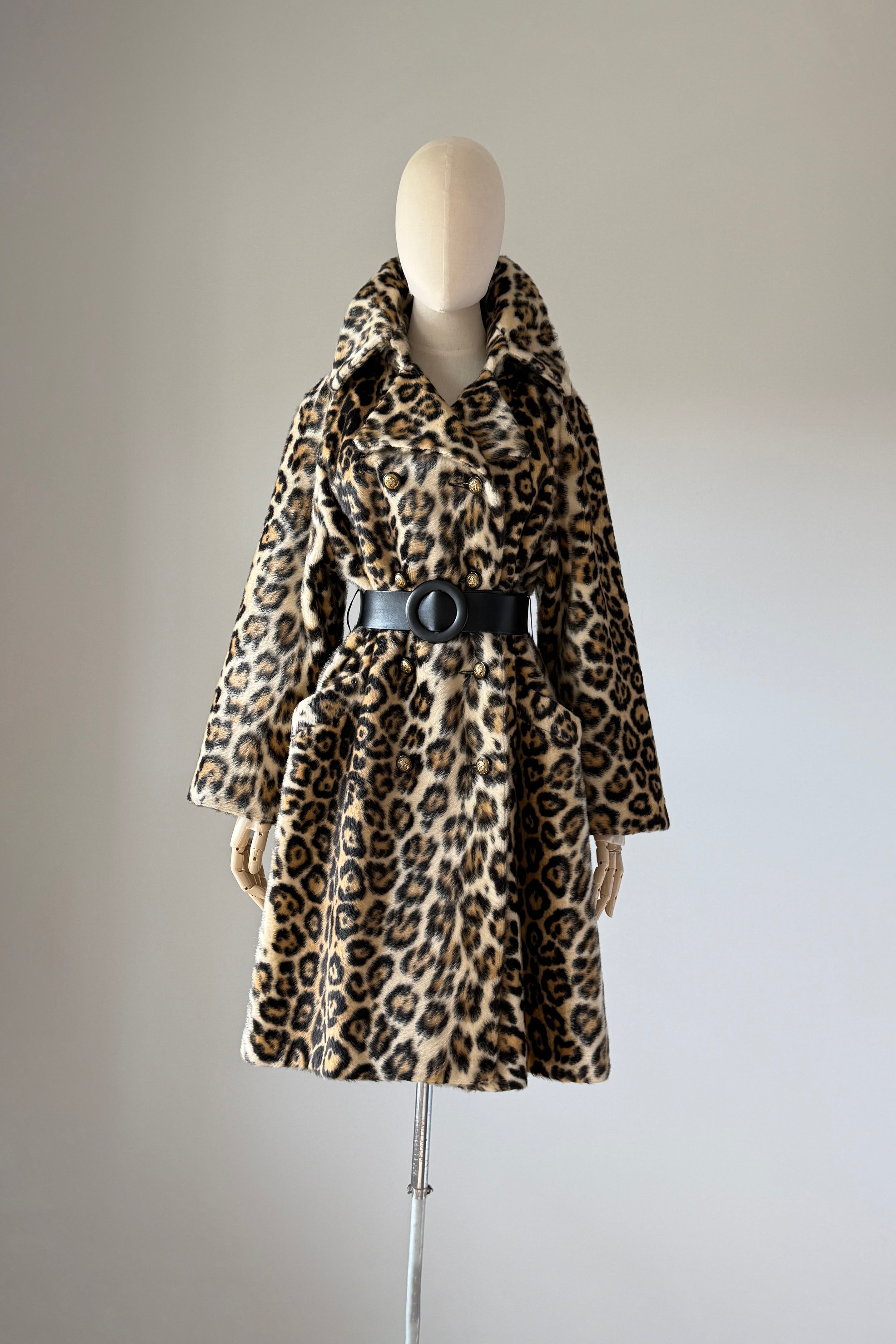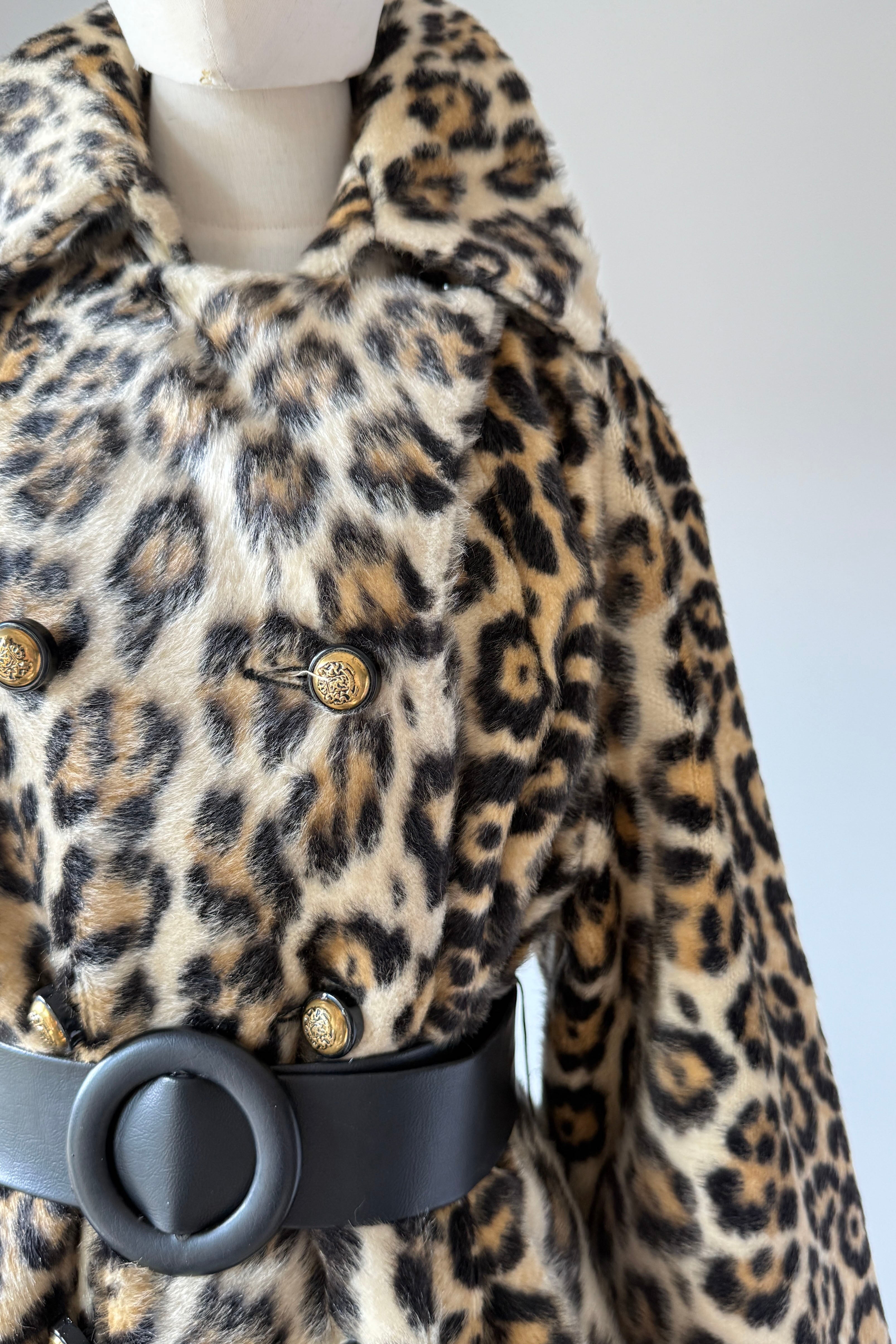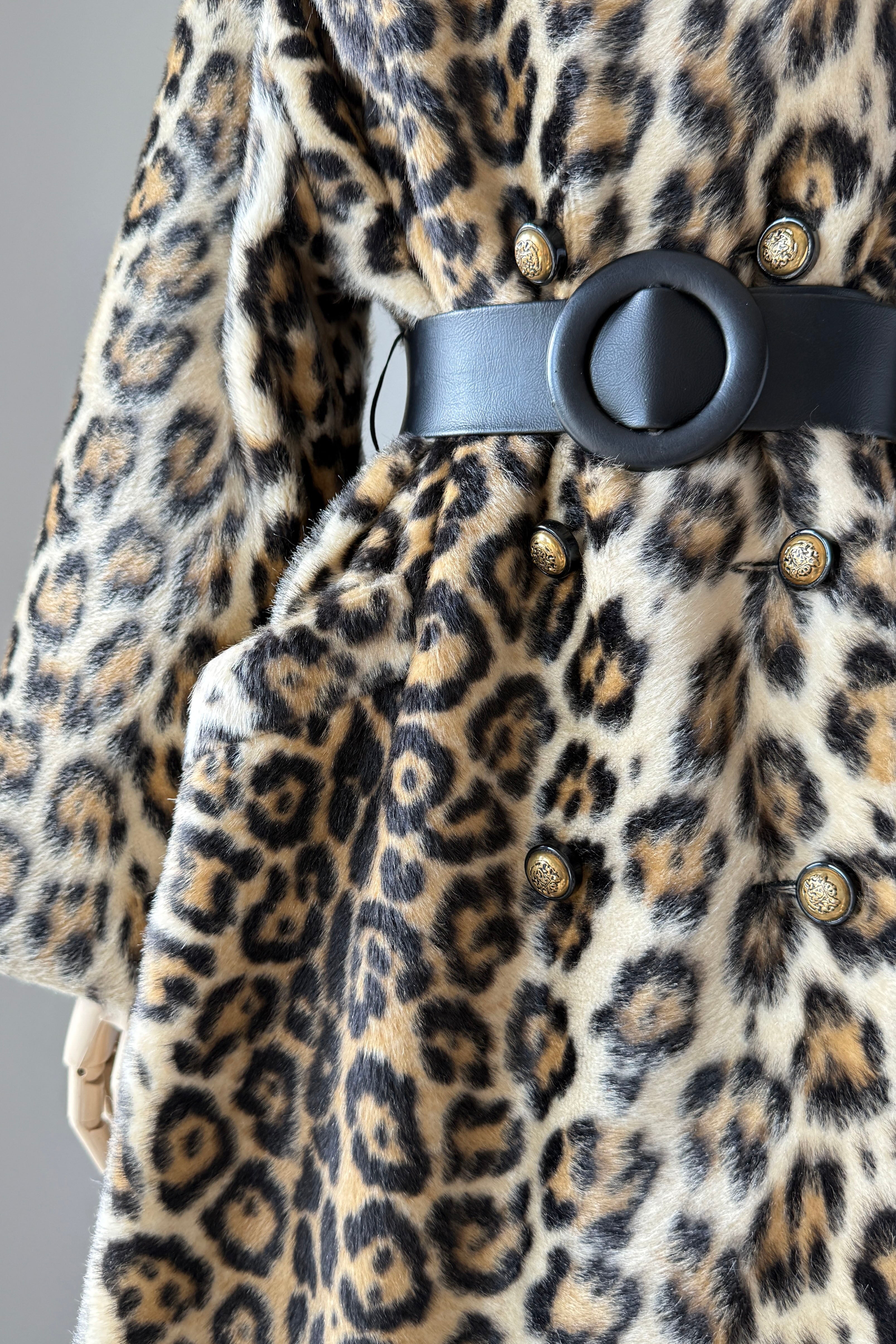VINTAGE COAT Vintage 1960s coat. Features faux leopard fur, button front closure, pockets, wide belt, acetate lining. Excellent condition. Fits like M/L. Length 39Bodice 17Shoulder 17Sleeve 21Bust 44Waist 40 unbeltedAs with all vintage, please expect wear consistent with age. All sales are final. No order cancellations.0934 | 2611