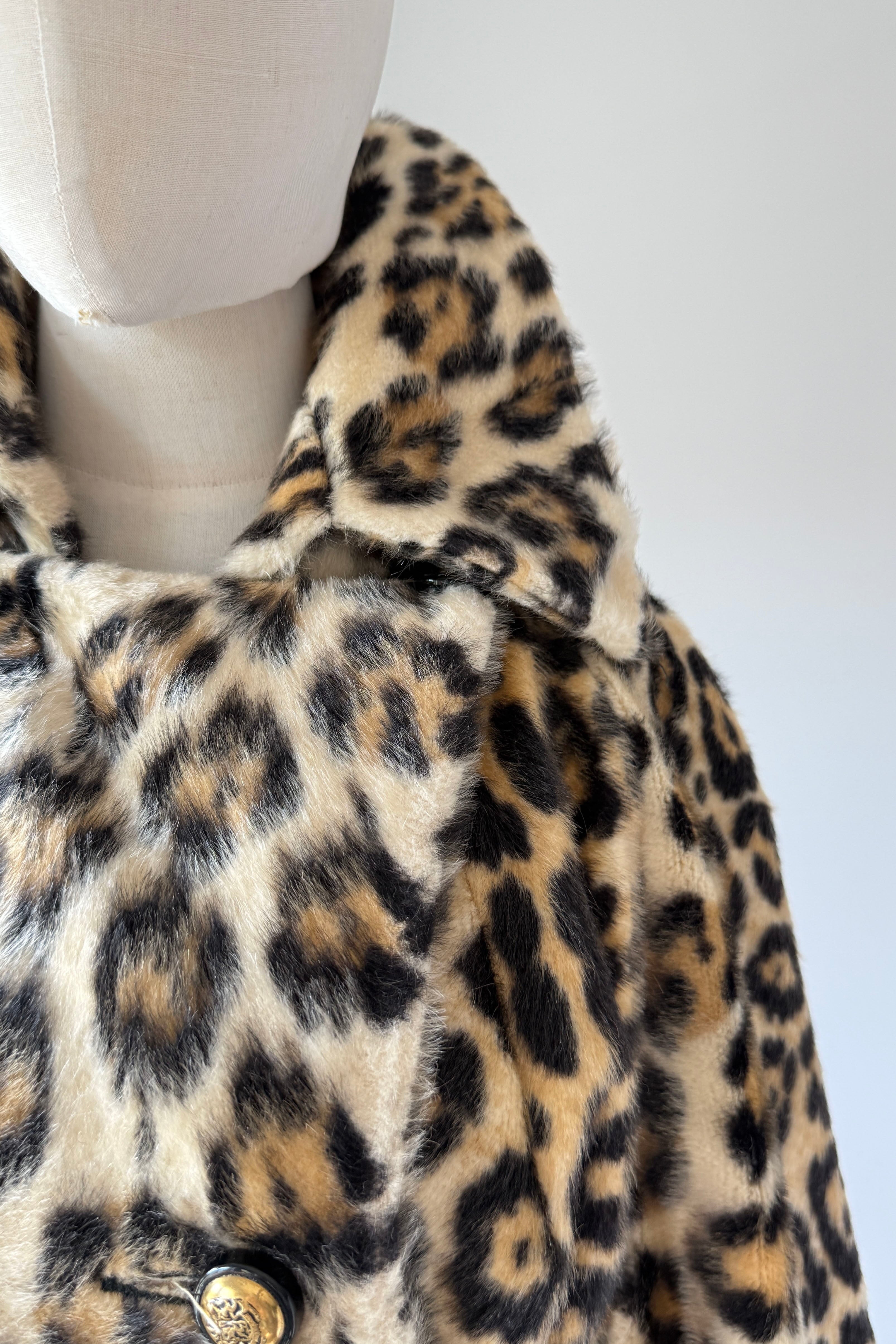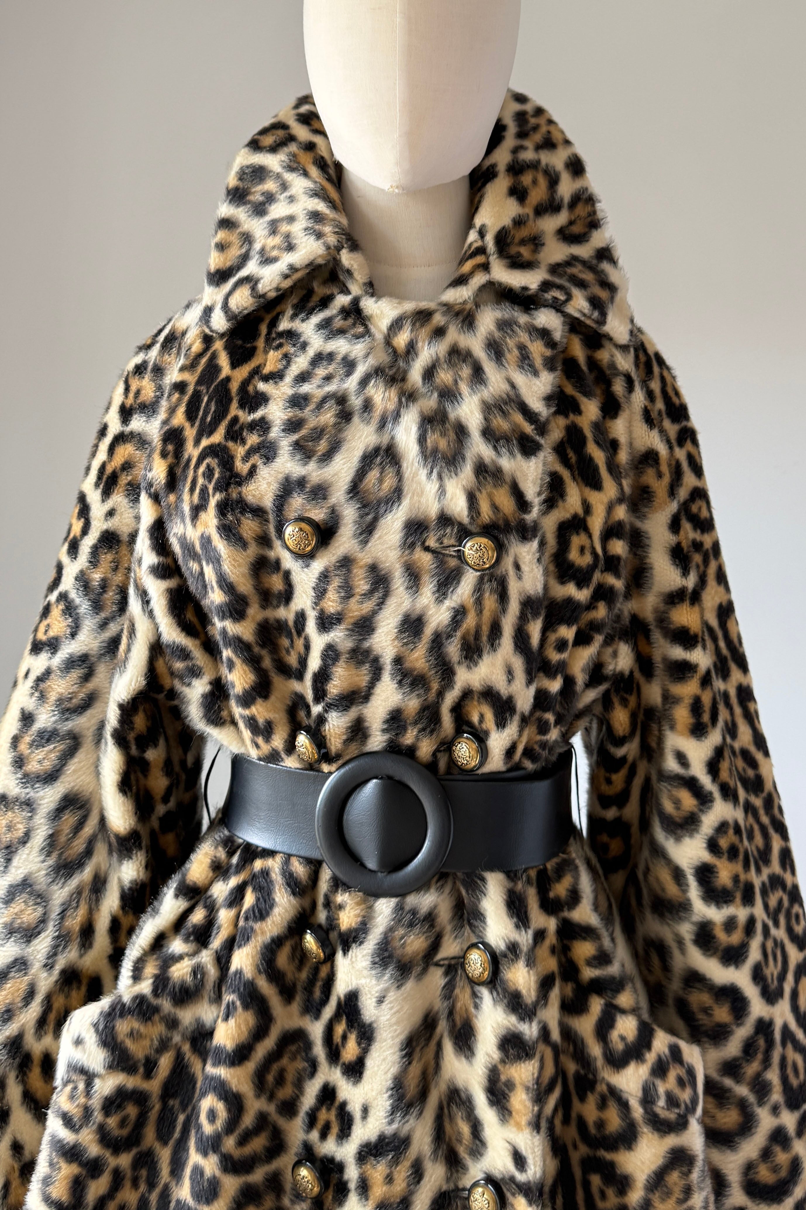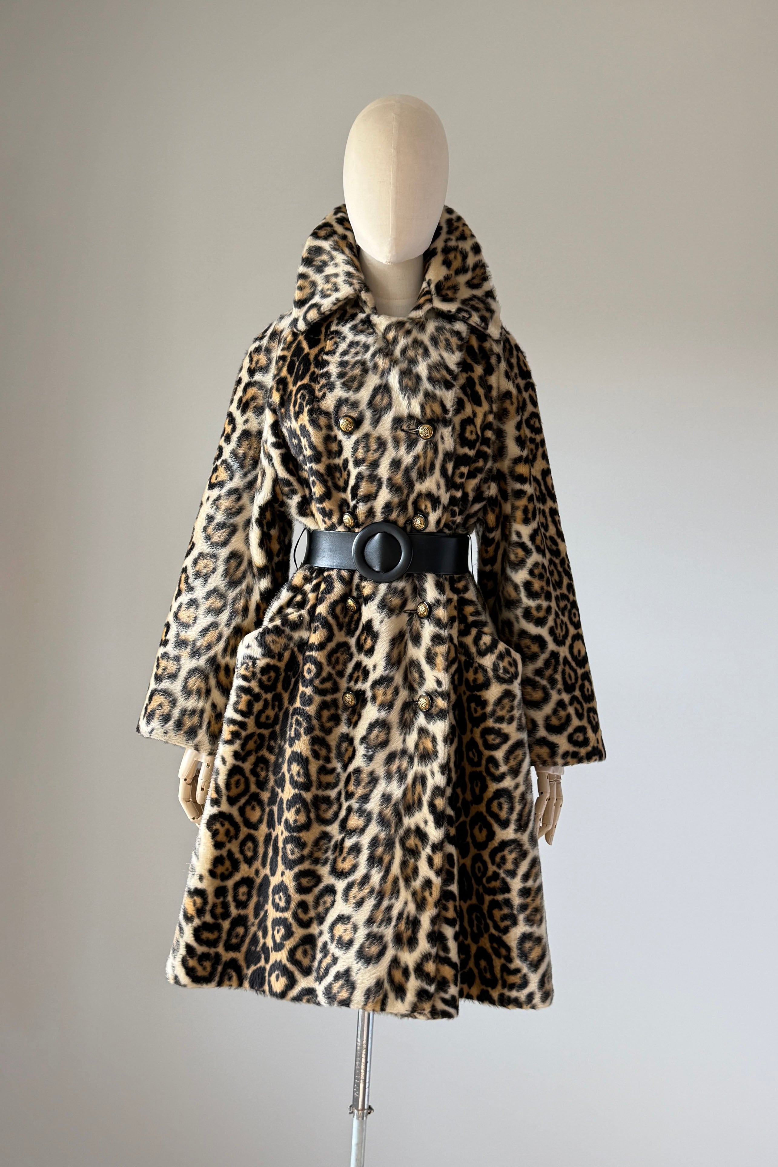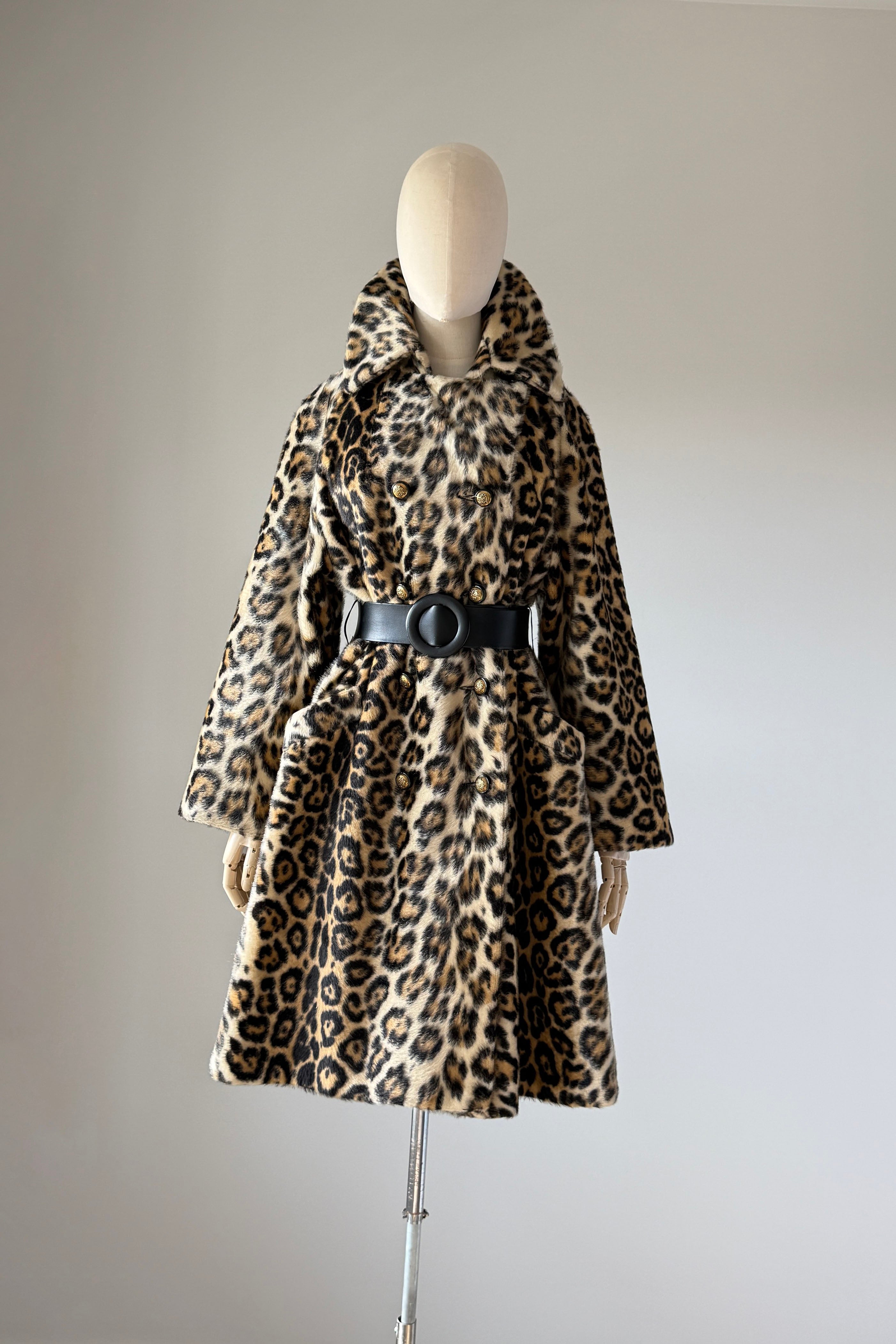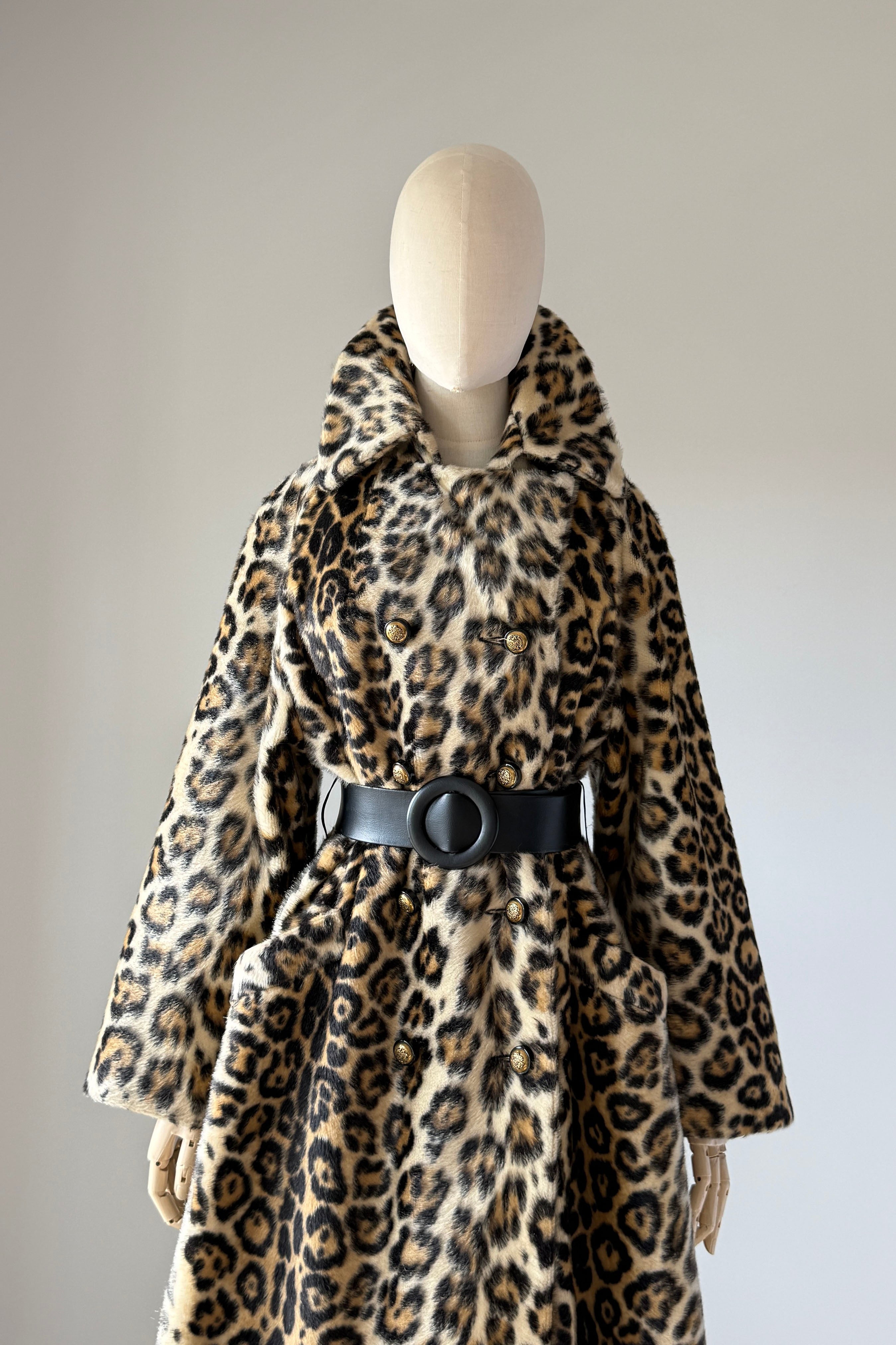 VINTAGE COAT Vintage 1960s coat. Features faux leopard fur, button front closure, pockets, wide belt, acetate lining. Excellent condition. Fits like M/L. Length 39Bodice 17Shoulder 17Sleeve 21Bust 44Waist 40 unbeltedAs with all vintage, please expect wear consistent with age. All sales are final. No order cancellations.0934 | 2611