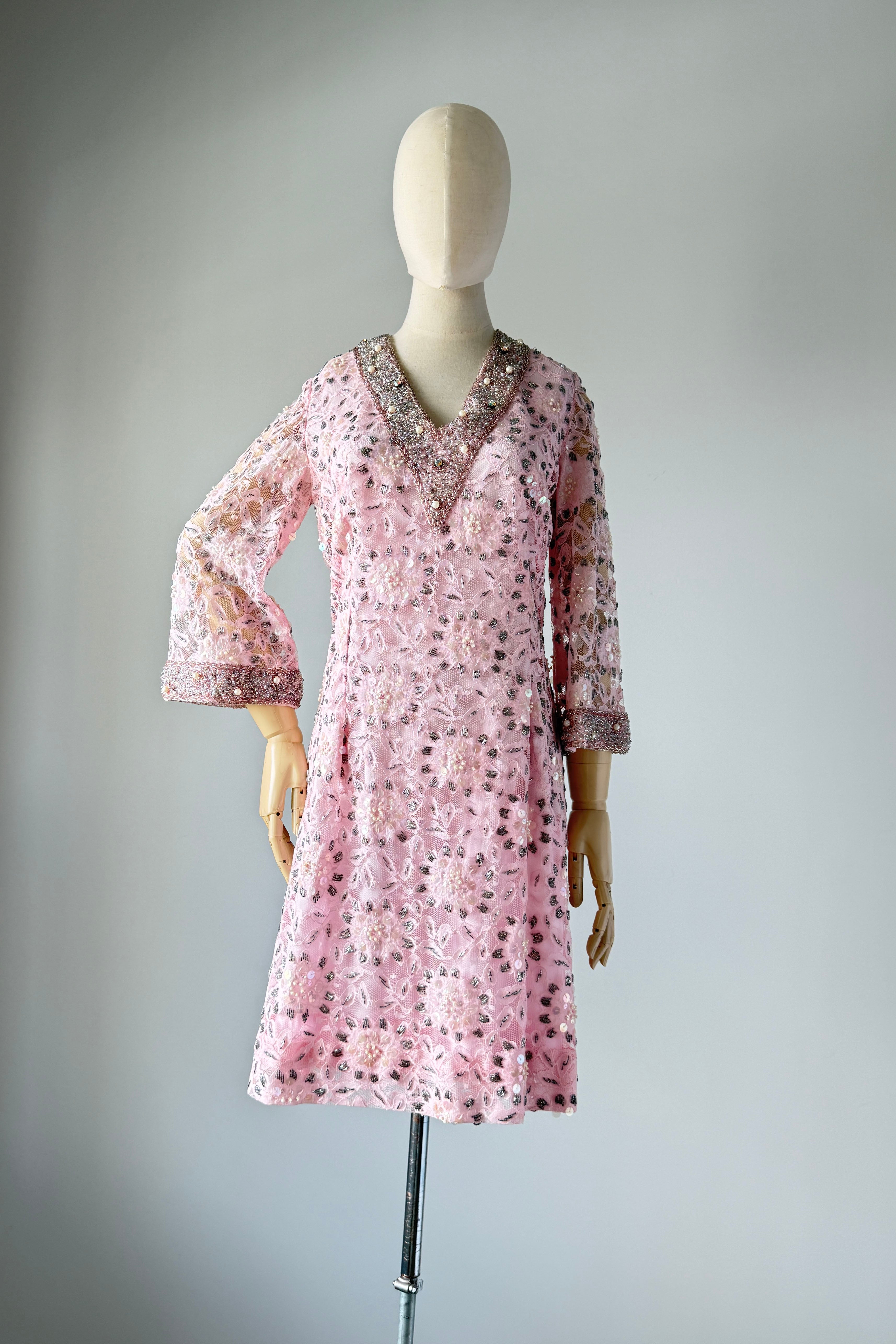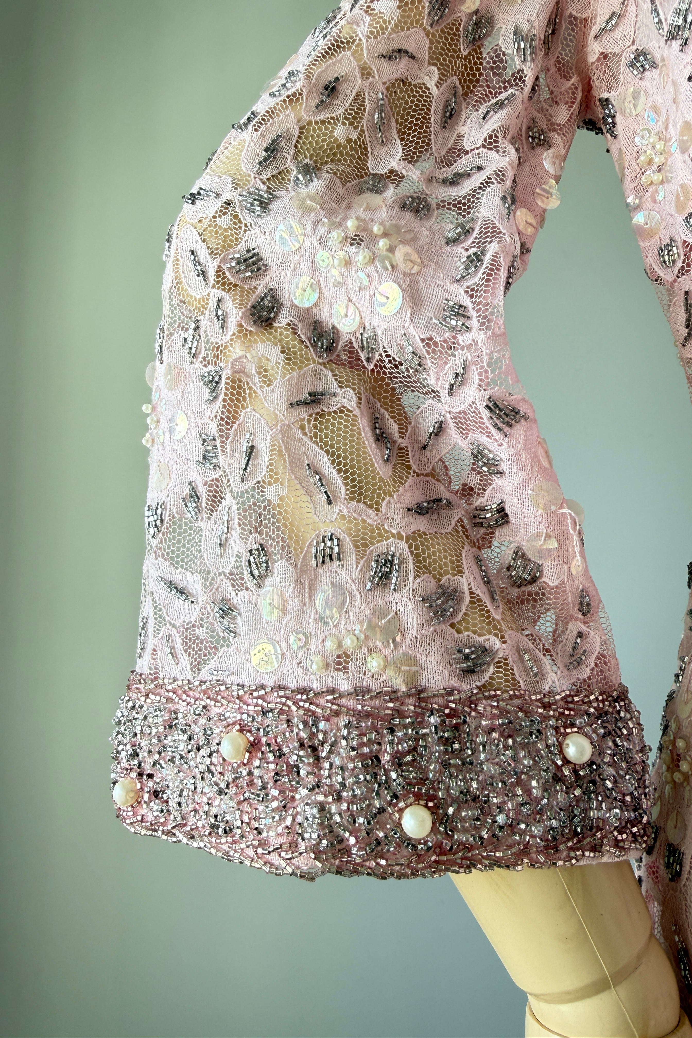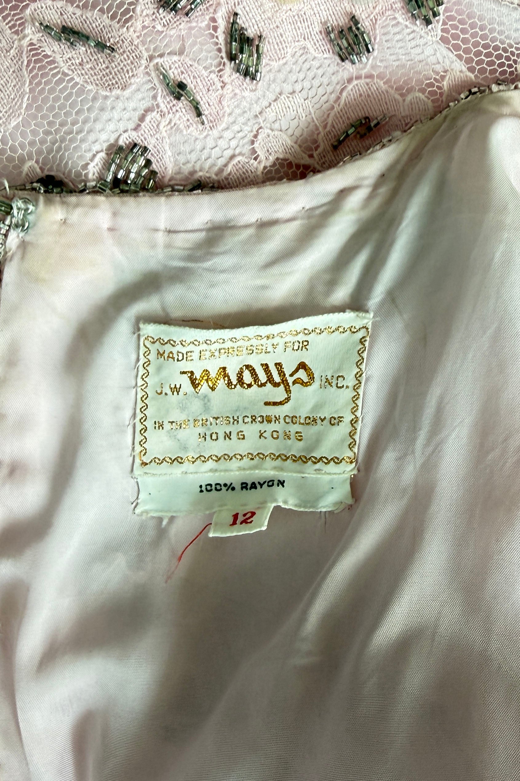 VINTAGE BEADED DRESSVintage 1950s lace dress dripping in sequins and beadwork. Lined in acetate with 3/4 length sleeves with subtle bell silhouette. Metal back zipper. Bodice fully lined. By JW Mays.Great condition - a few marks on lining not visible when worn. Freshly hand washed and ready to wear.Fits like small.Length 37Shoulder 16Sleeve 18Bust 36-37Waist 33Hip 40As with all vintage, please expect wear consistent with age. All sales are final. No order cancellations.0620 | 2604