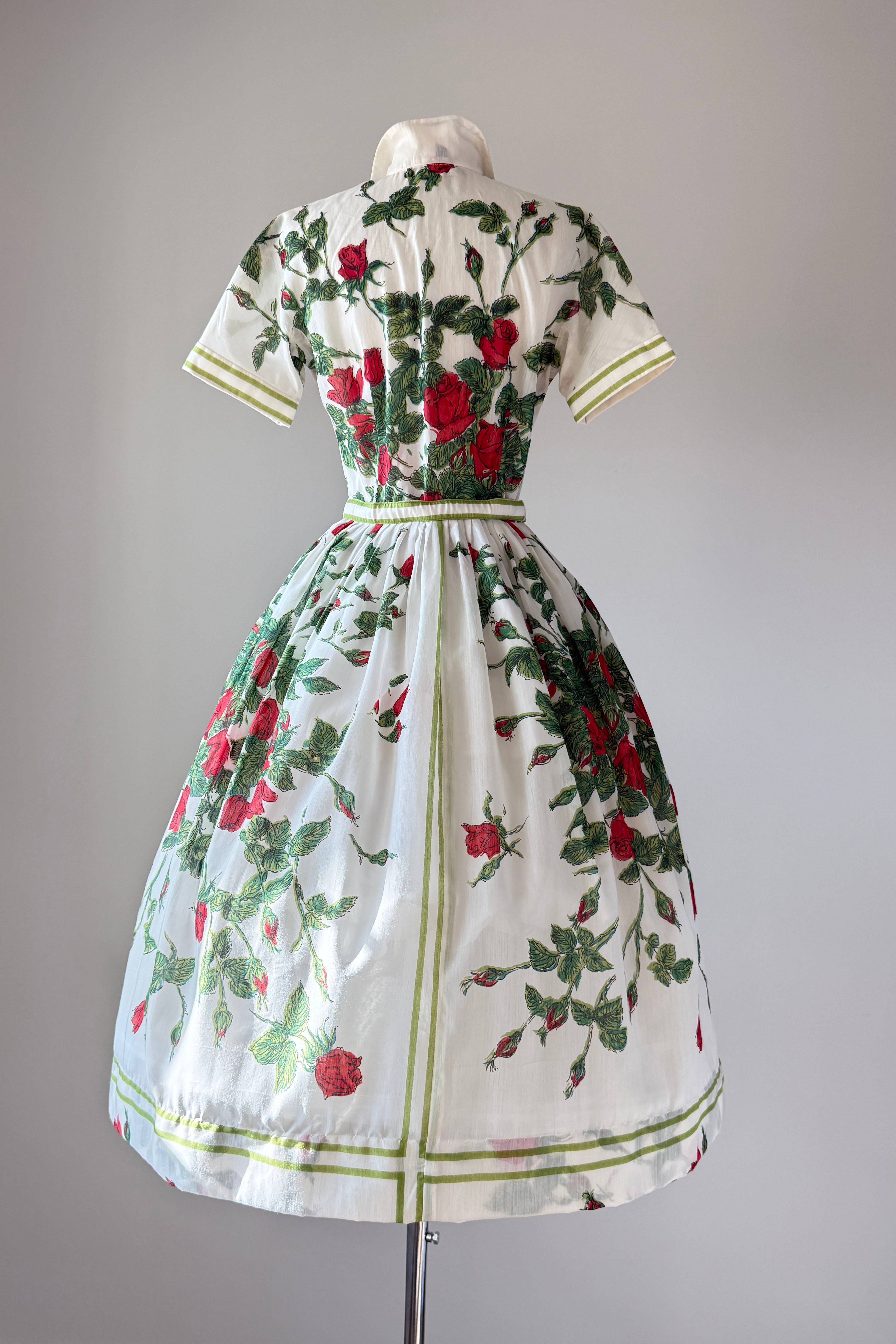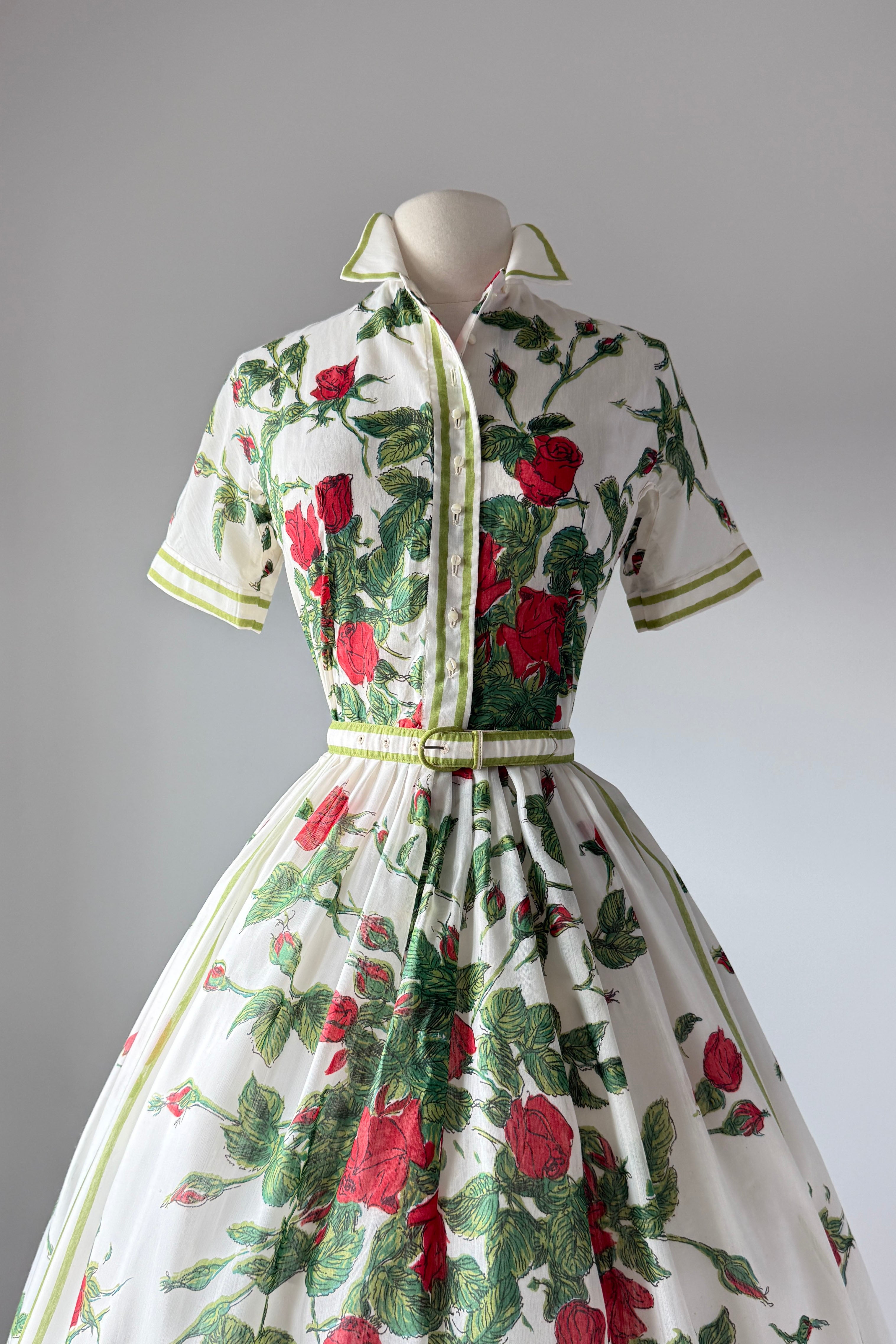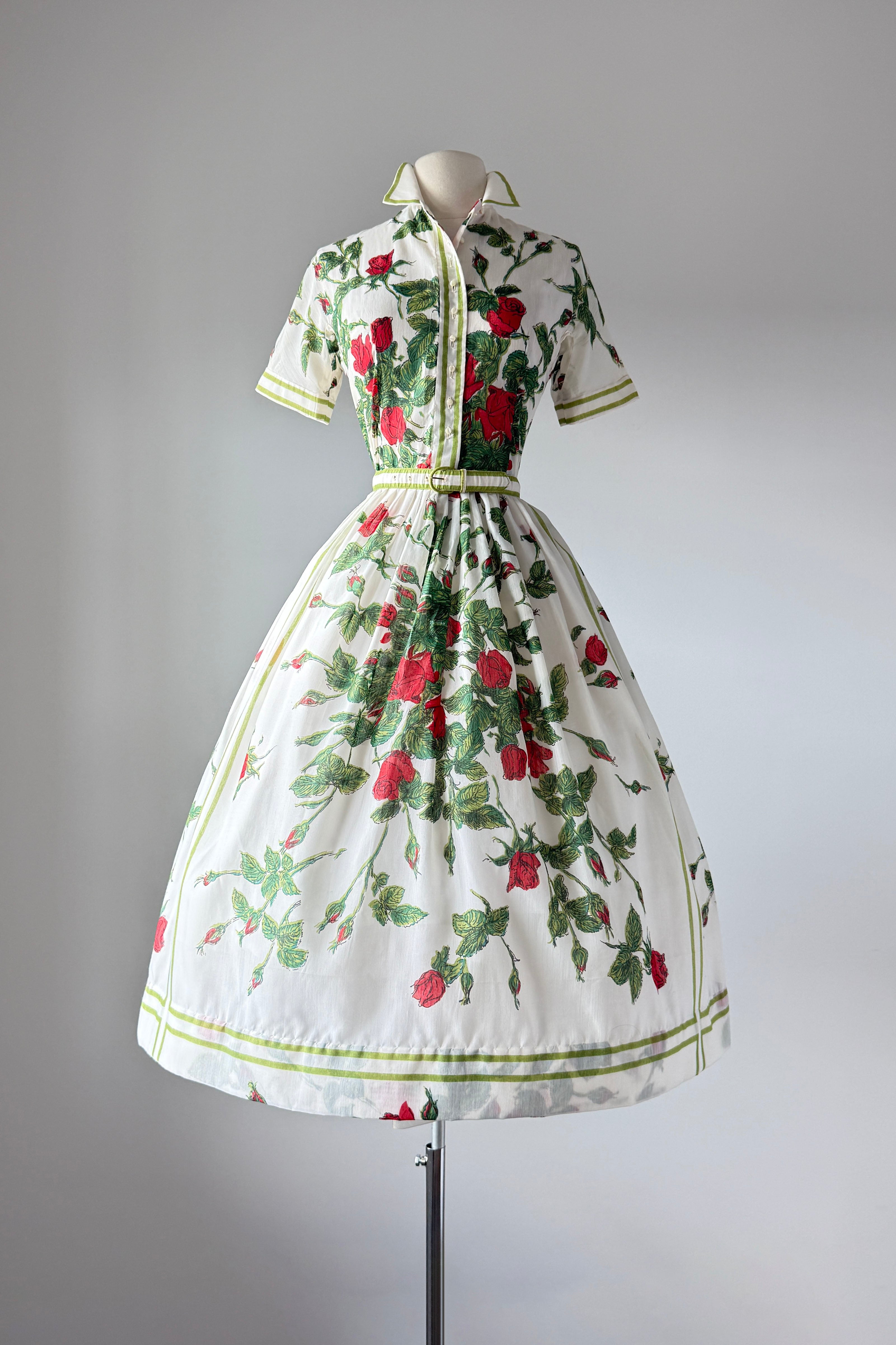 VINTAGE DRESSVintage 1960s dress. Features cotton/poly blend, button bodice with snap at waist, red rose print, original belt. By L'Aiglon. Excellent condition. Medium. Length 46Bodice 16Bust 38-39Waist 28As with all vintage, please expect wear consistent with age. All sales are final. No order cancellations.0832 | 2606