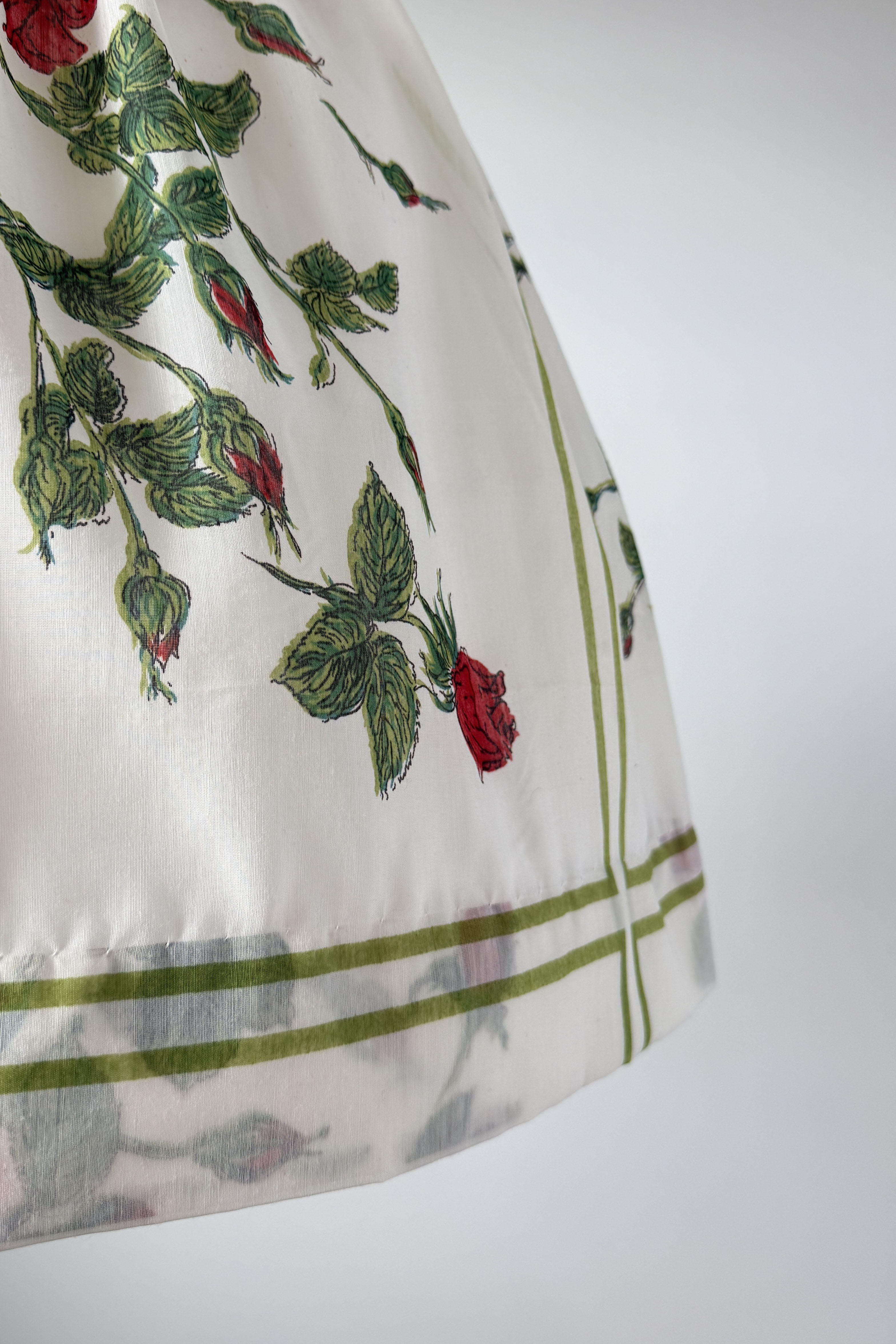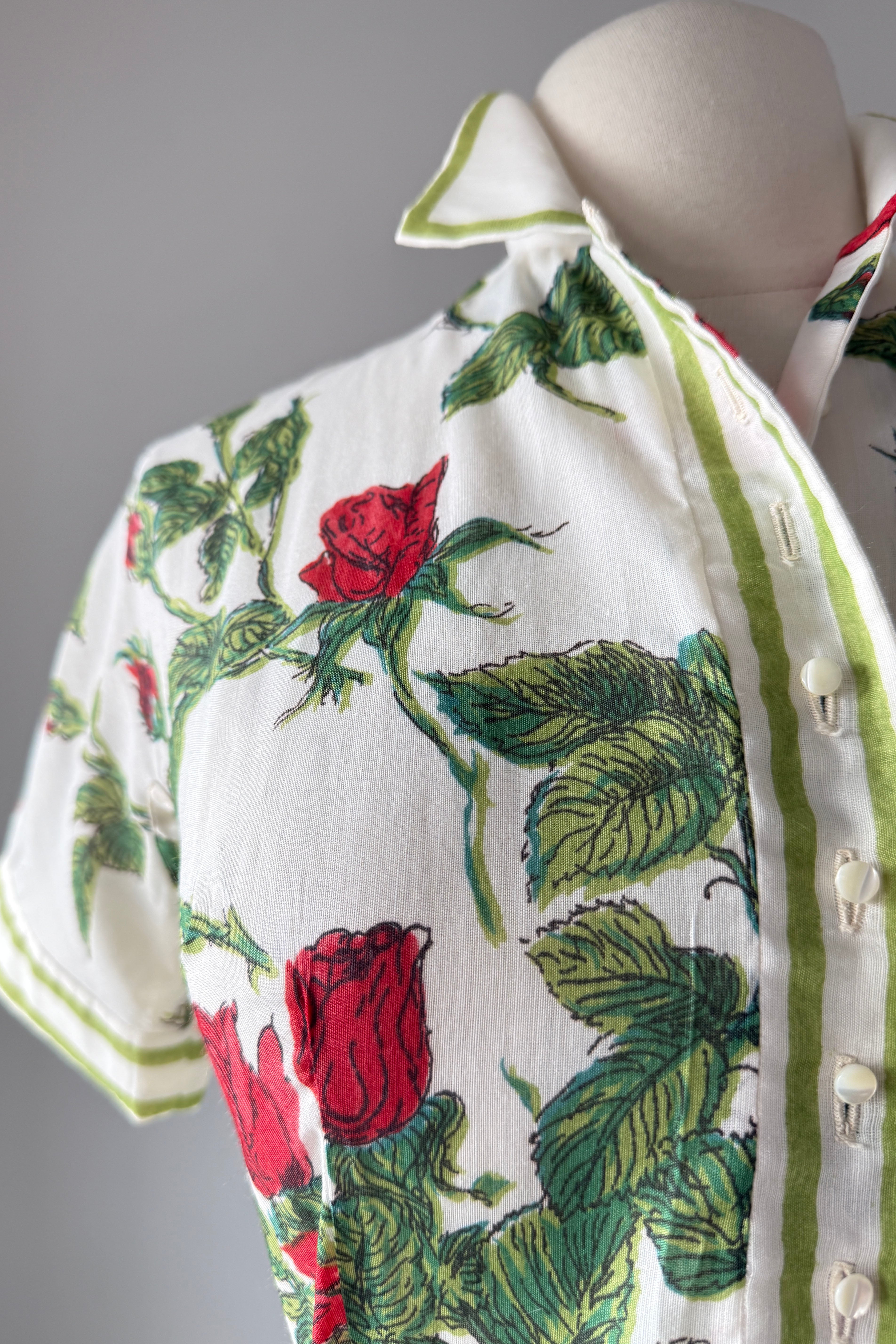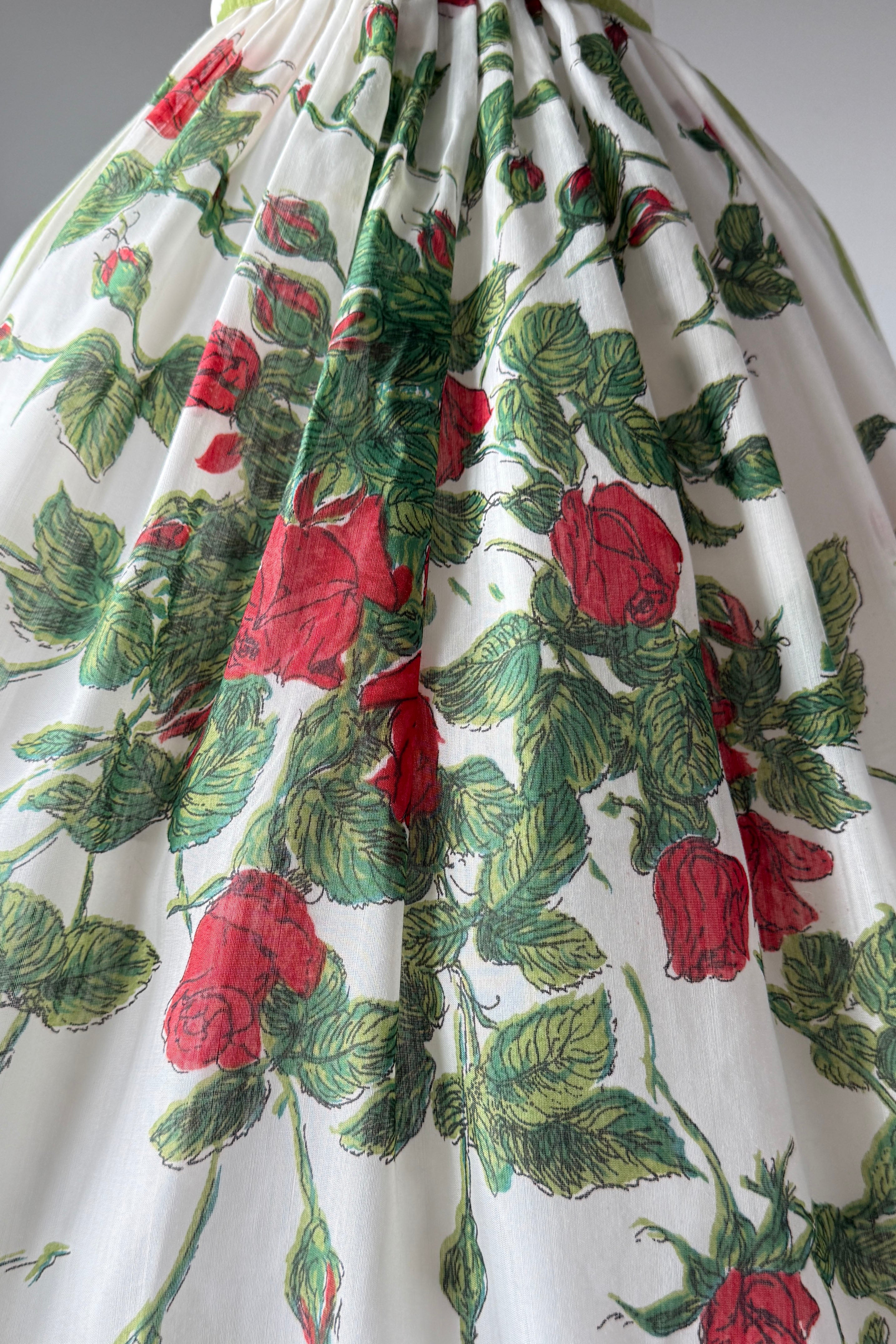 VINTAGE DRESSVintage 1960s dress. Features cotton/poly blend, button bodice with snap at waist, red rose print, original belt. By L'Aiglon. Excellent condition. Medium. Length 46Bodice 16Bust 38-39Waist 28As with all vintage, please expect wear consistent with age. All sales are final. No order cancellations.0832 | 2606