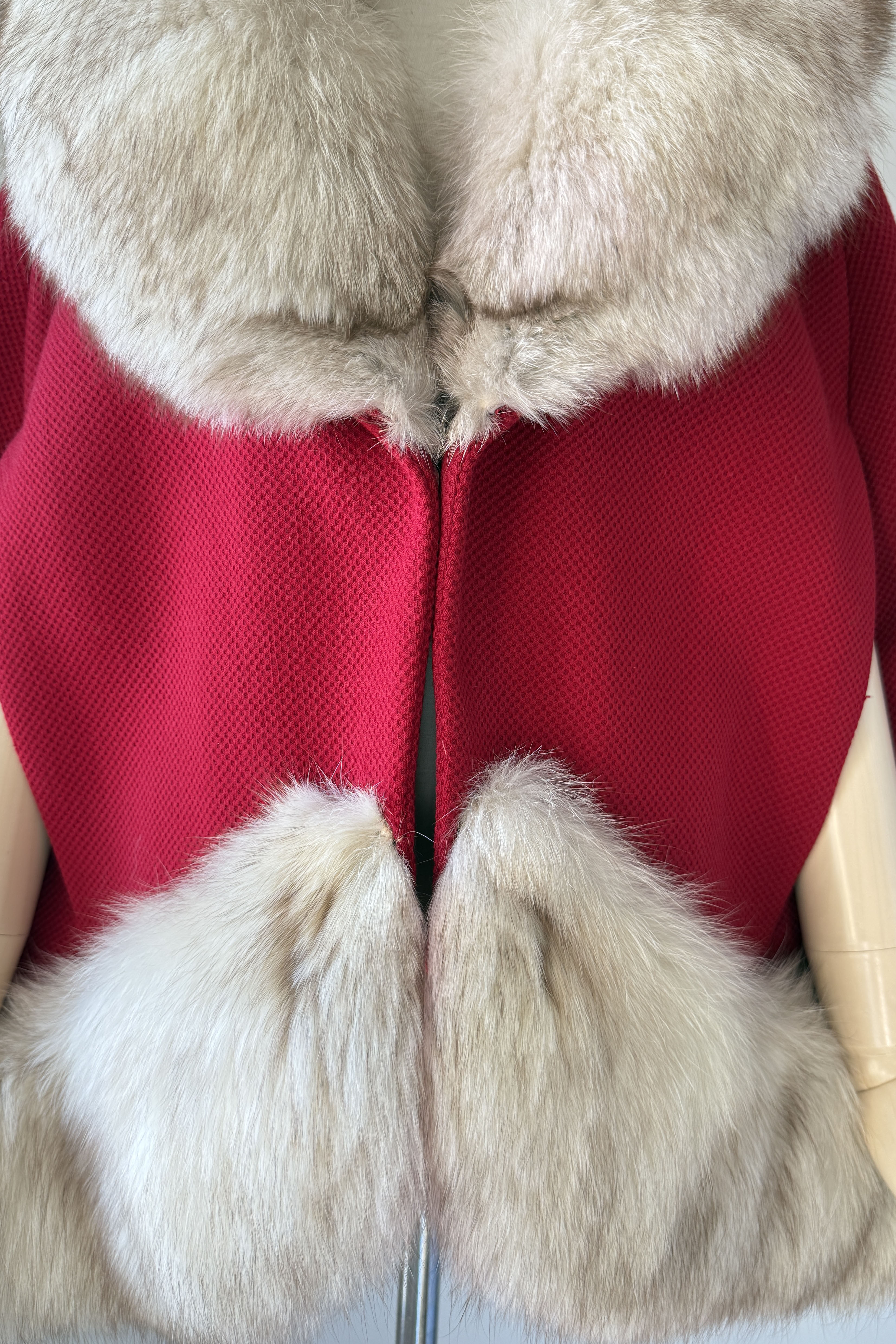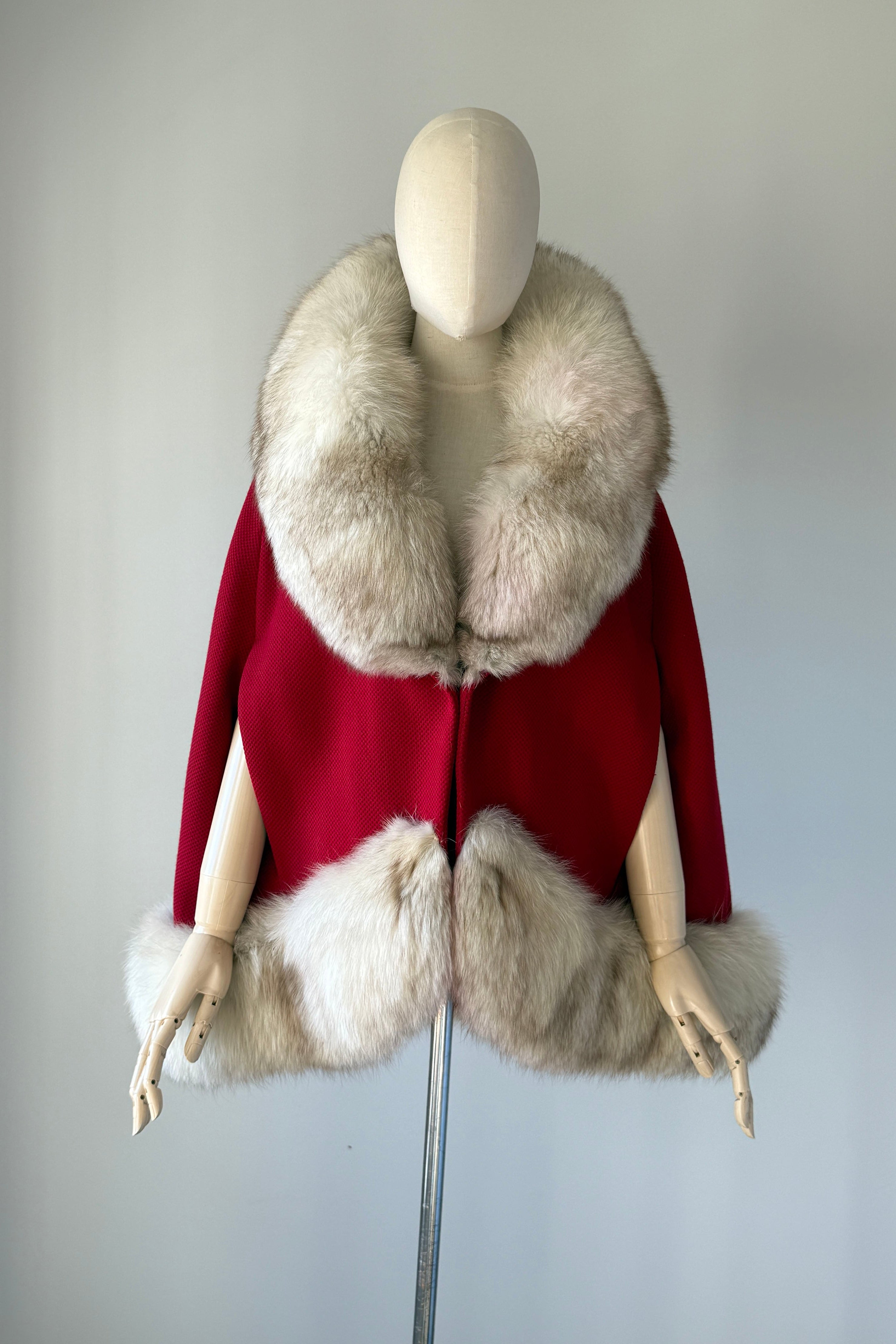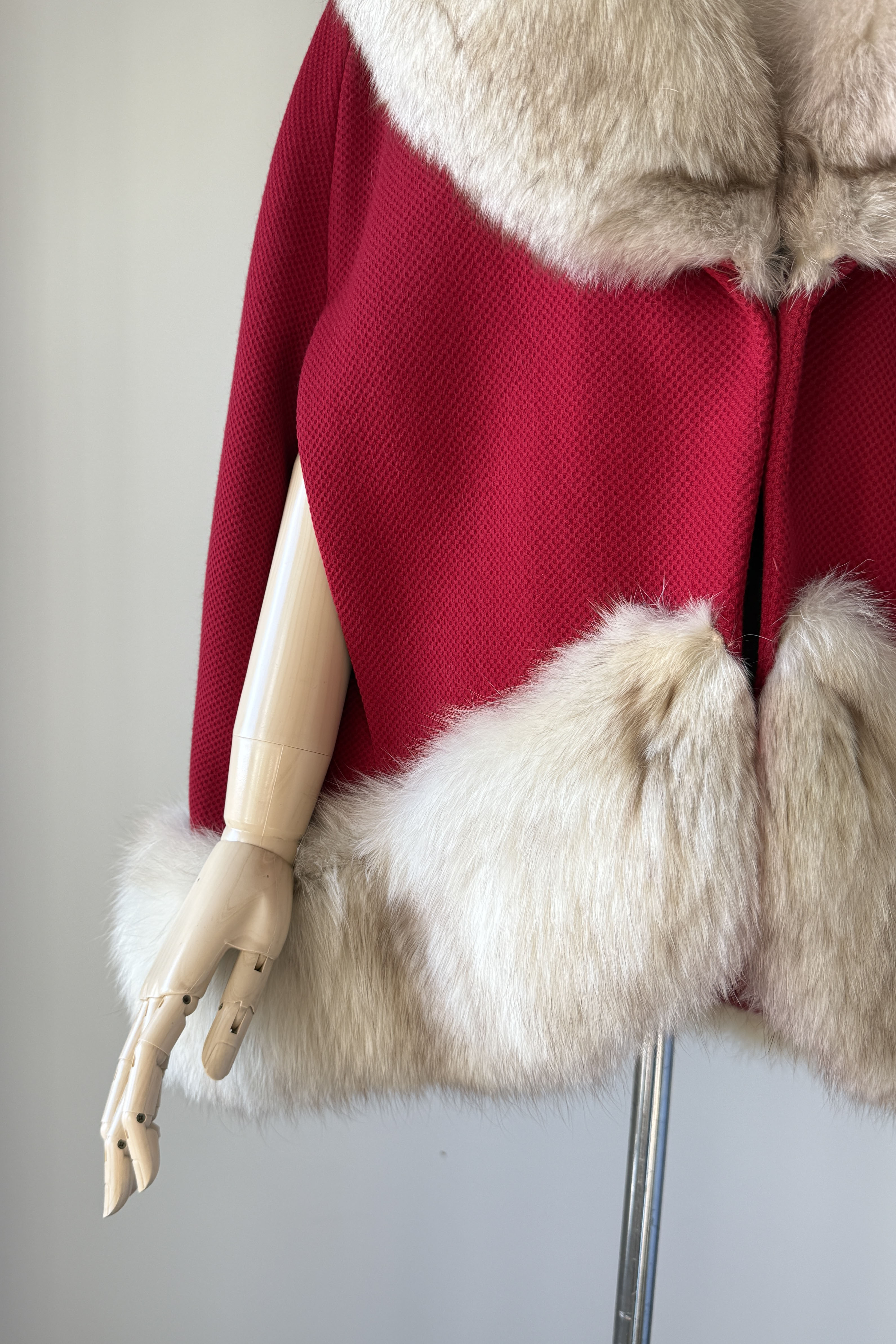 VINTAGE WOOL CAPEVintage 1960s red wool cape with silver fox fur trim. Silk crepe lining, hook/eye closure. Excellent condition. Some light fur shedding as is typical of items this age.Fits like XS-LLength 27Shoulder 16As with all vintage, please expect wear consistent with age. All sales are final. No order cancellations.0780 | 2602