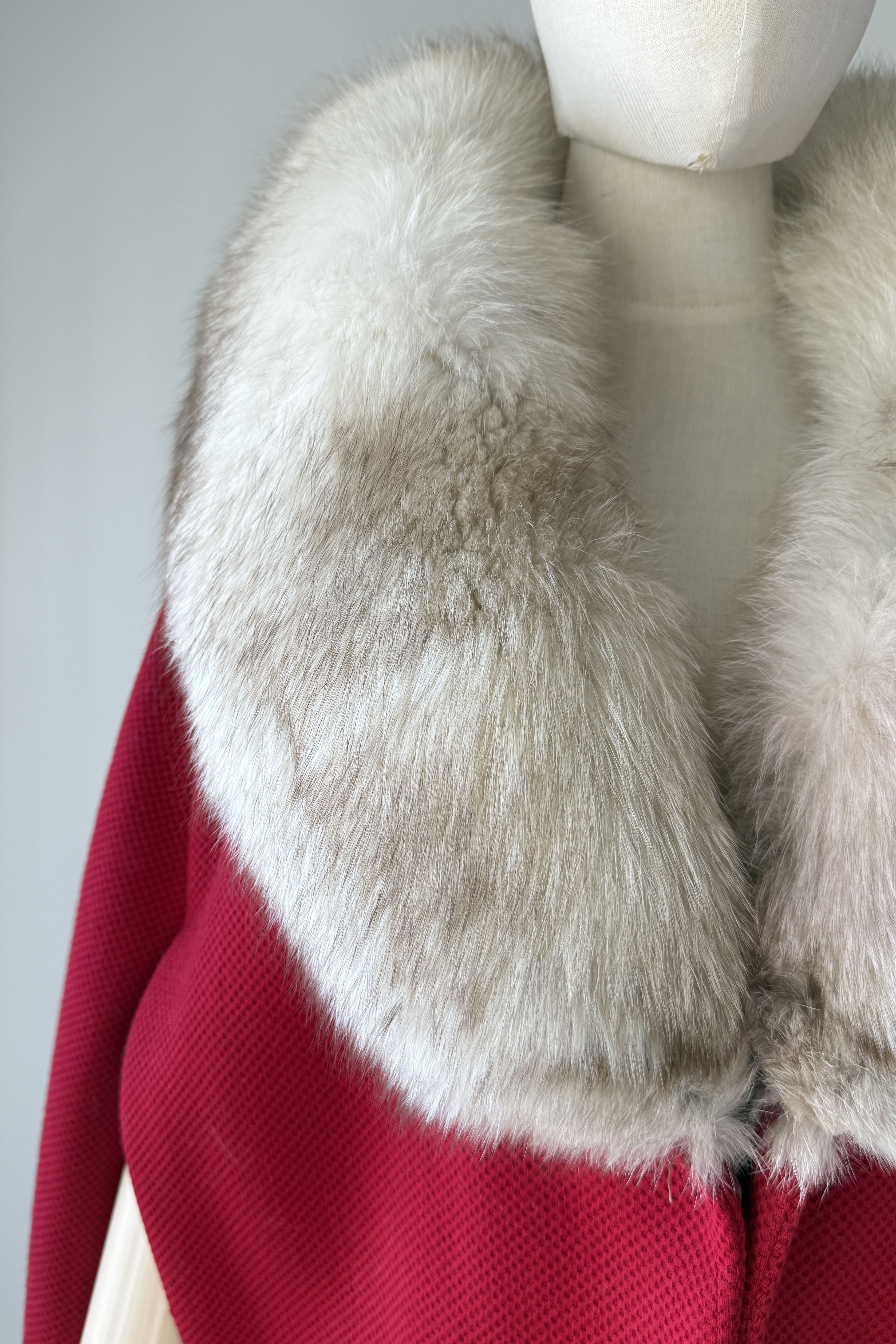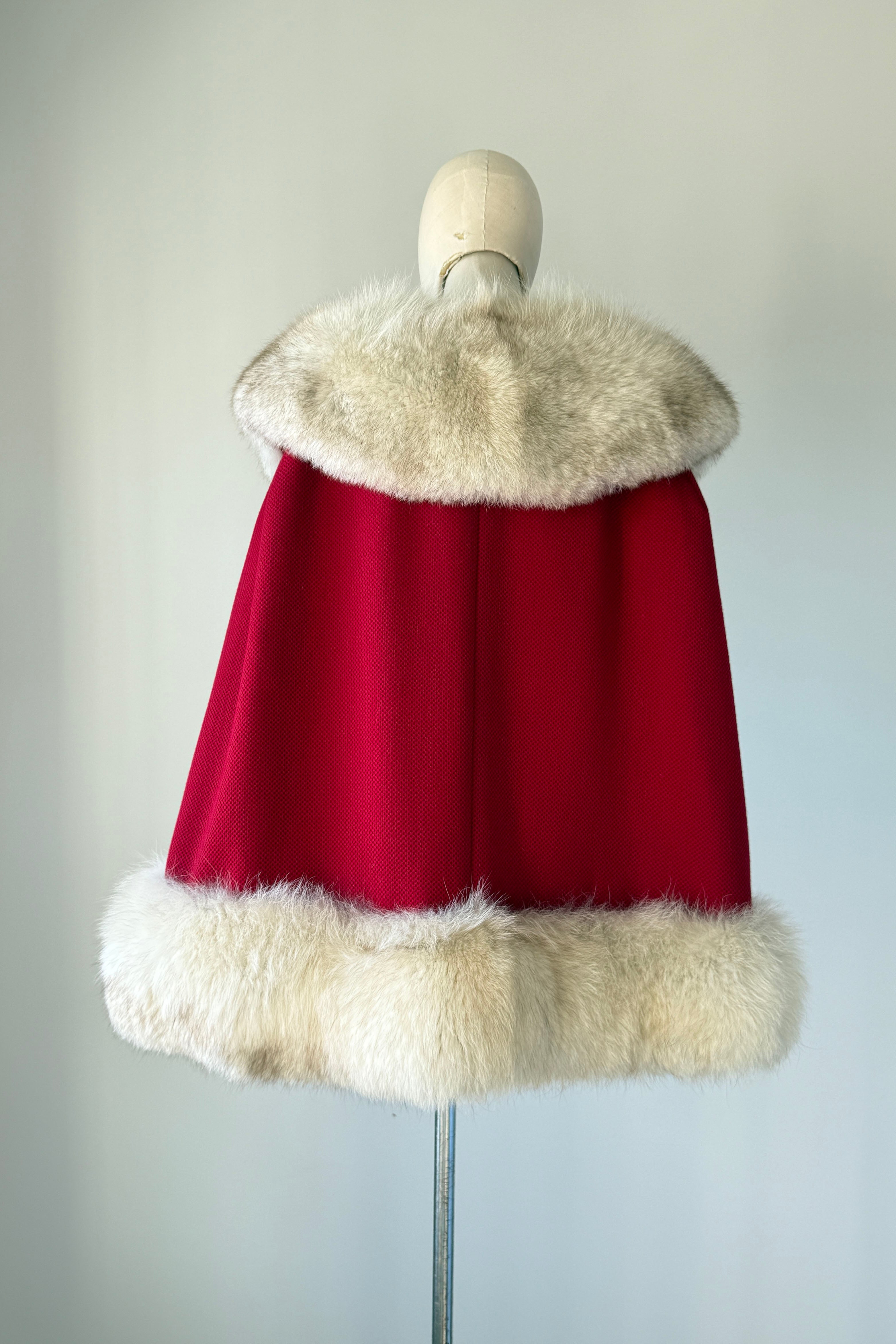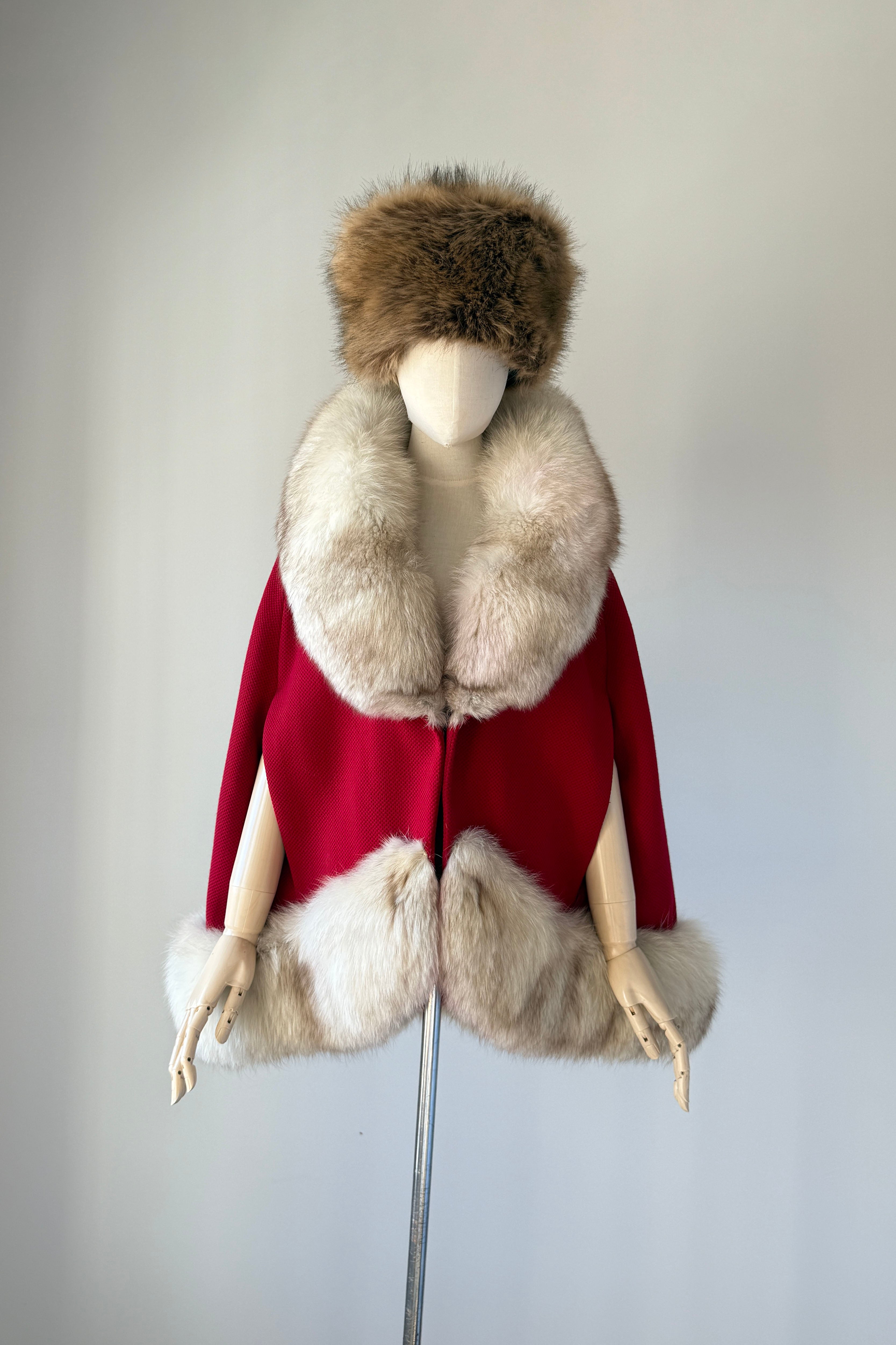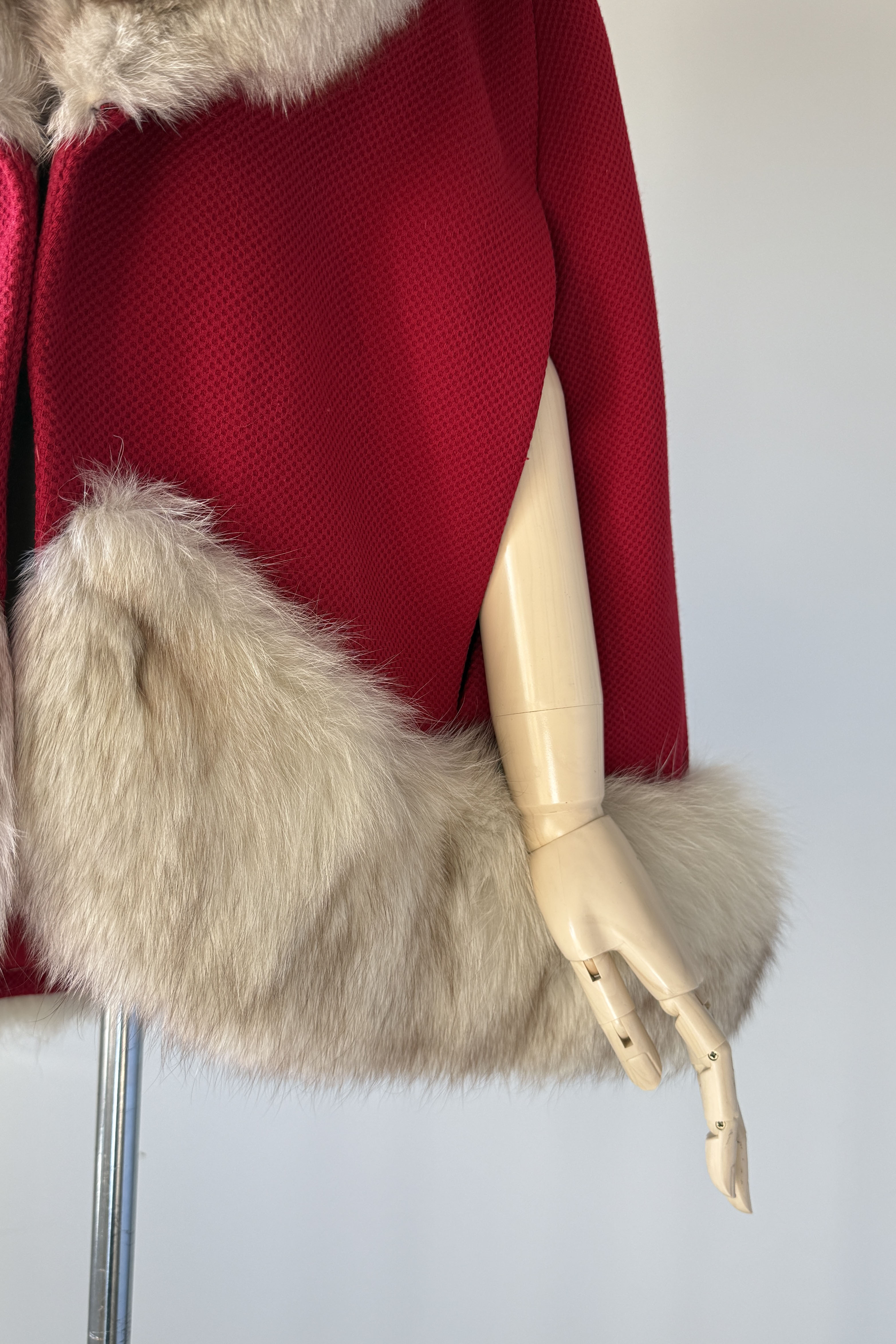 VINTAGE WOOL CAPEVintage 1960s red wool cape with silver fox fur trim. Silk crepe lining, hook/eye closure. Excellent condition. Some light fur shedding as is typical of items this age.Fits like XS-LLength 27Shoulder 16As with all vintage, please expect wear consistent with age. All sales are final. No order cancellations.0780 | 2602