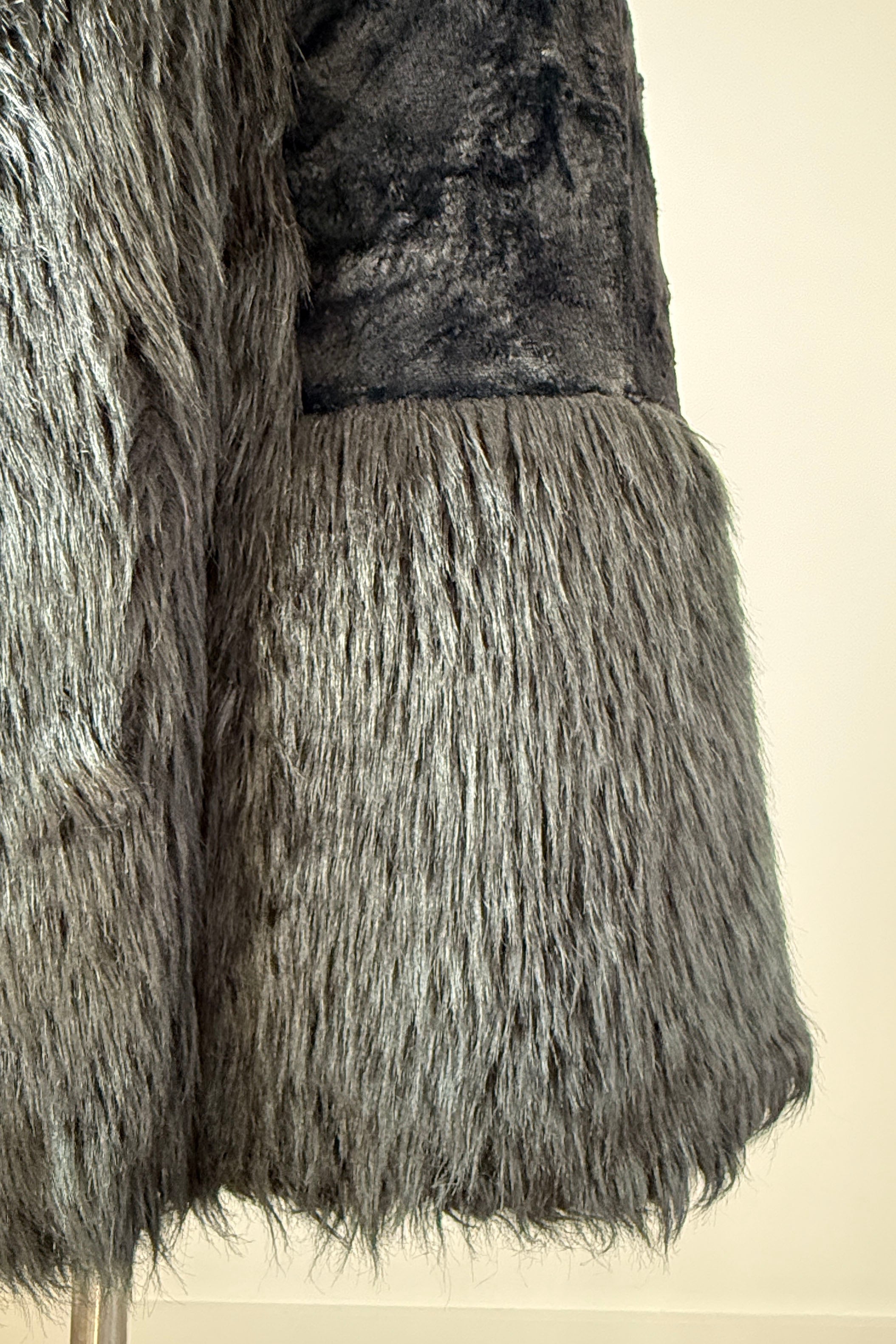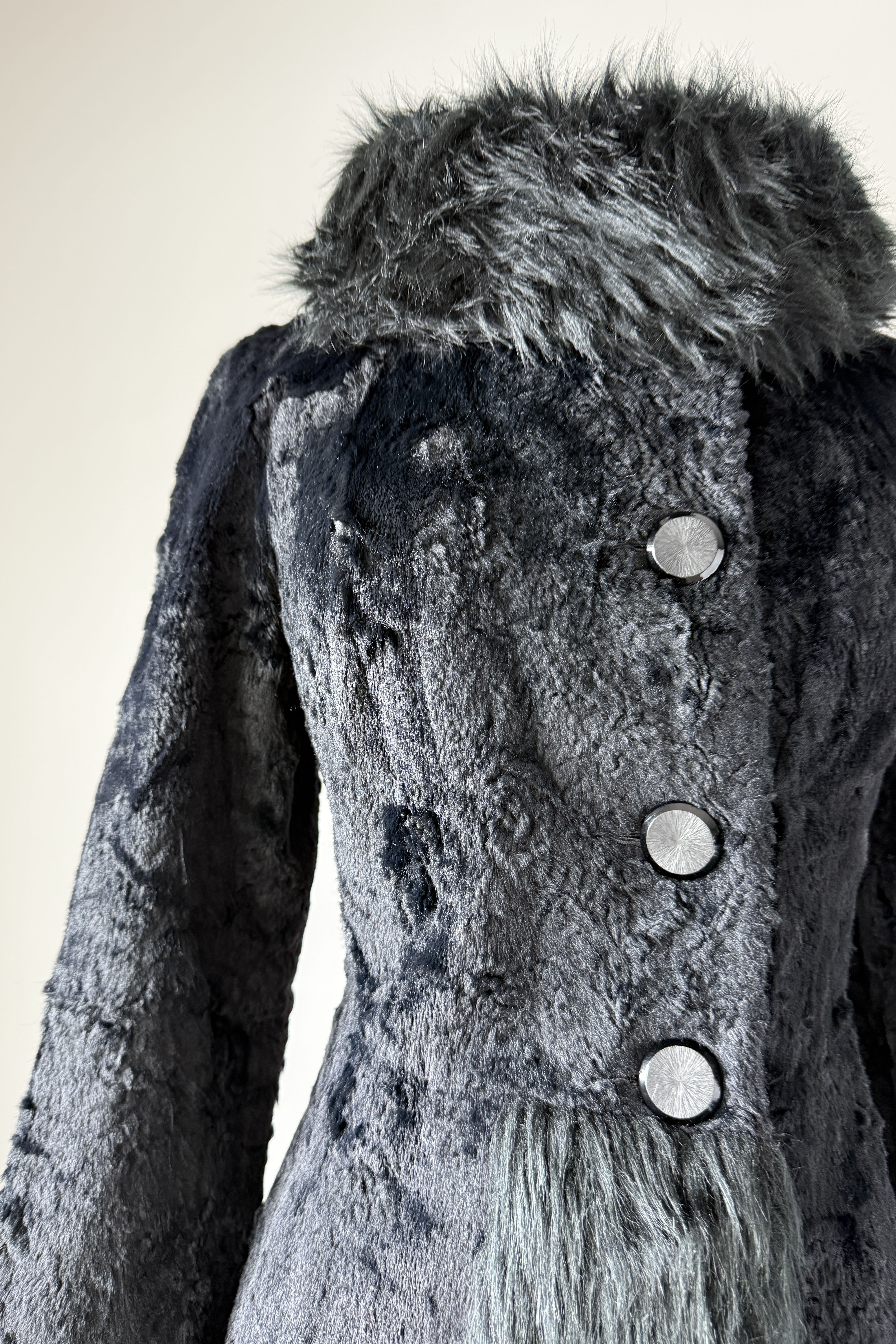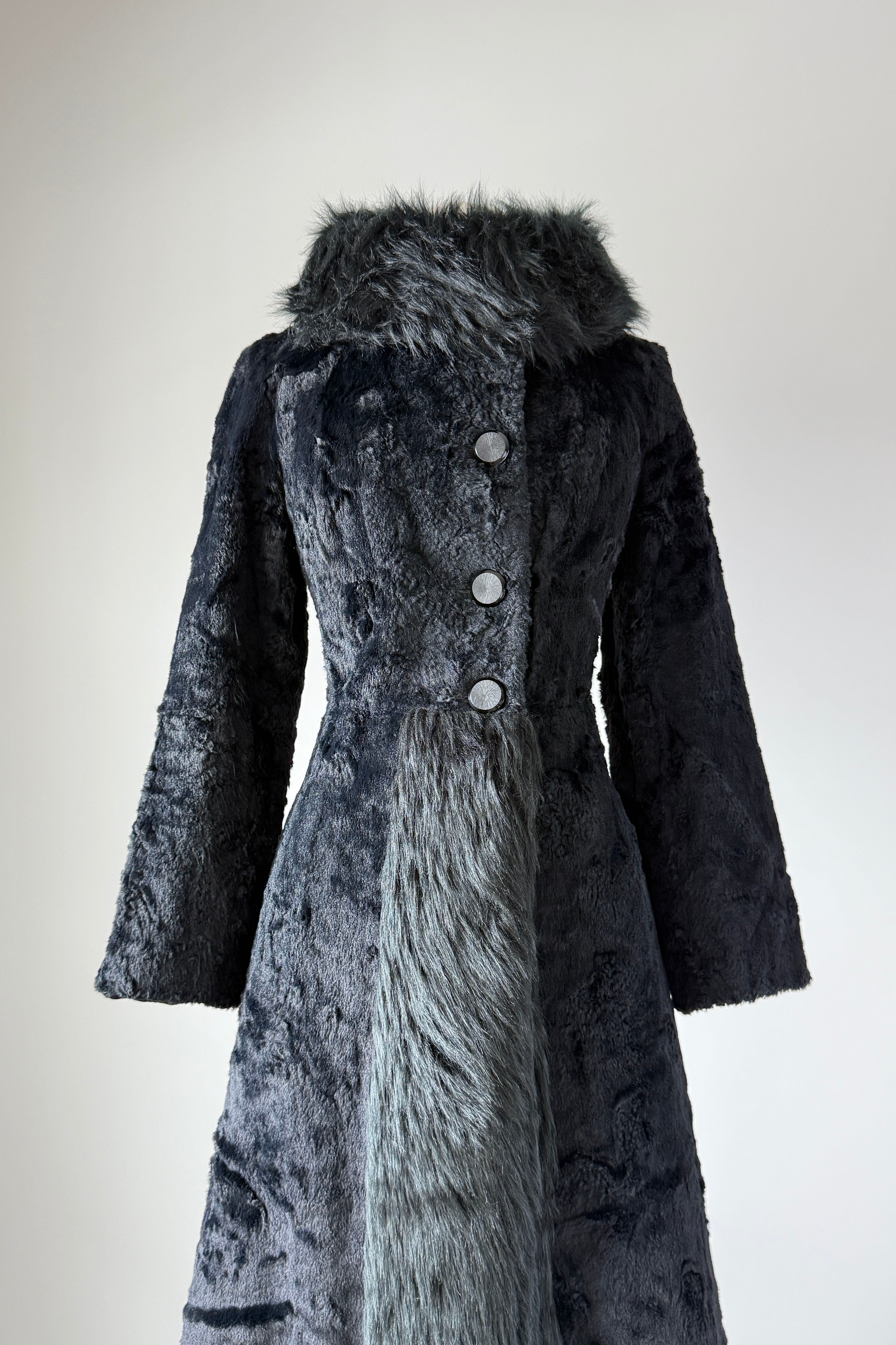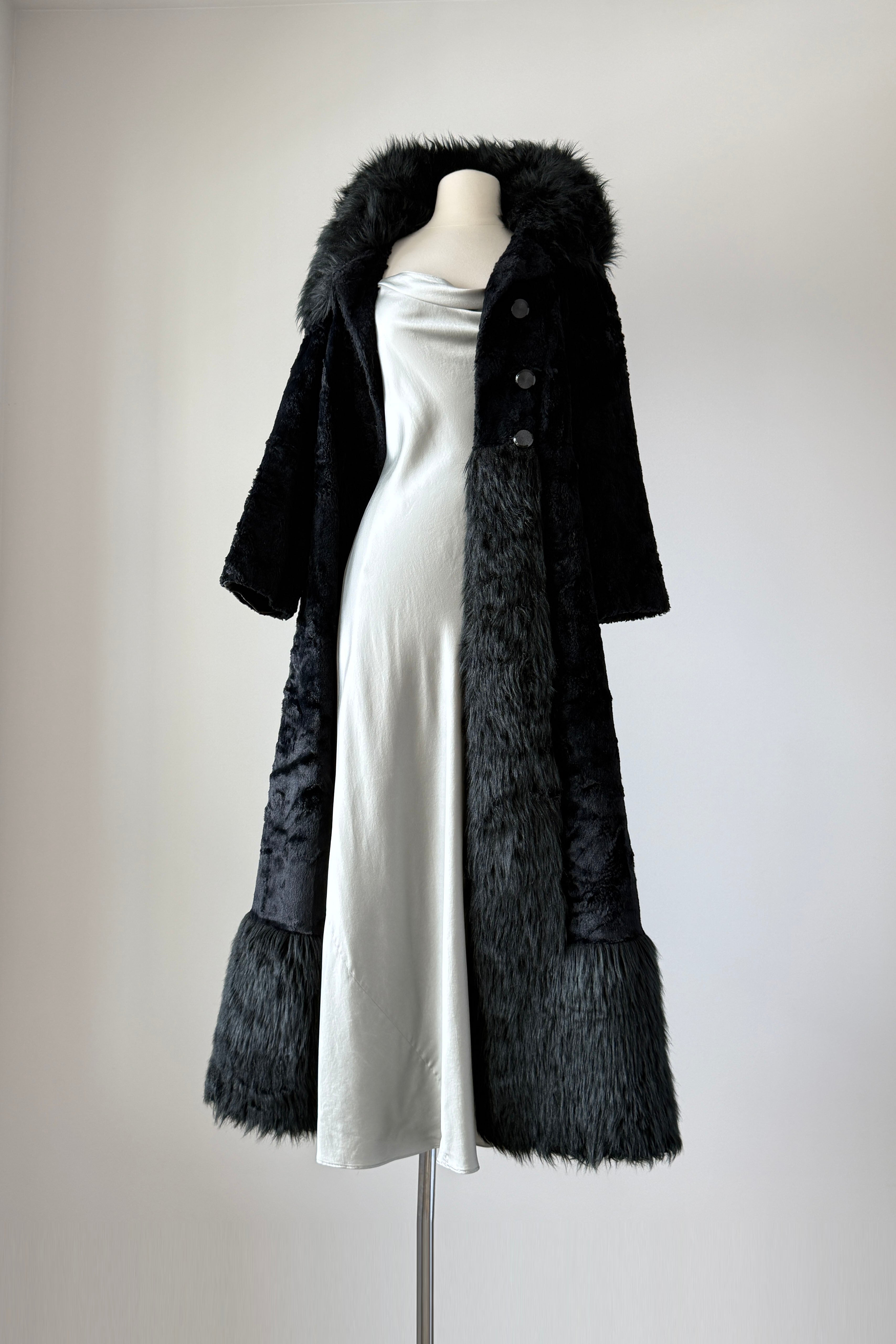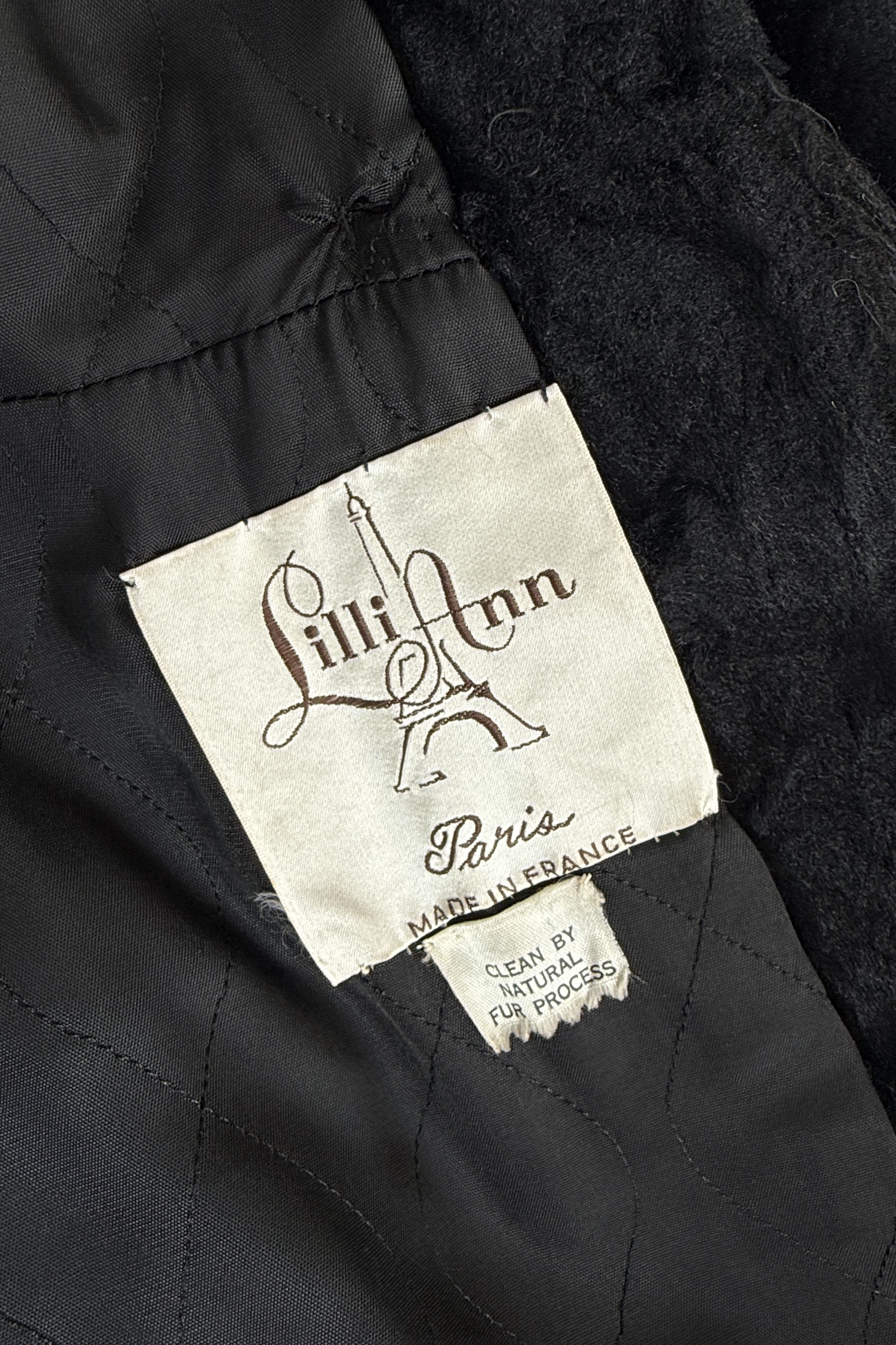 VINTAGE LILLI ANN COATVintage 1970s black faux fur maxi coat. Full length with button closure, hook/eye at collar, fitted at waist, pockets, quilted lining. Mid-weight perfect for transitional seasons. Made in France by Lilli Ann.Excellent condition.Fits like small.Length 53Bodice 16Shoulder 16Sleeve 22Bust 38Waist 32Hip 44As with all vintage, please expect wear consistent with age. All sales are final. No order cancellations.0794 | 2604
