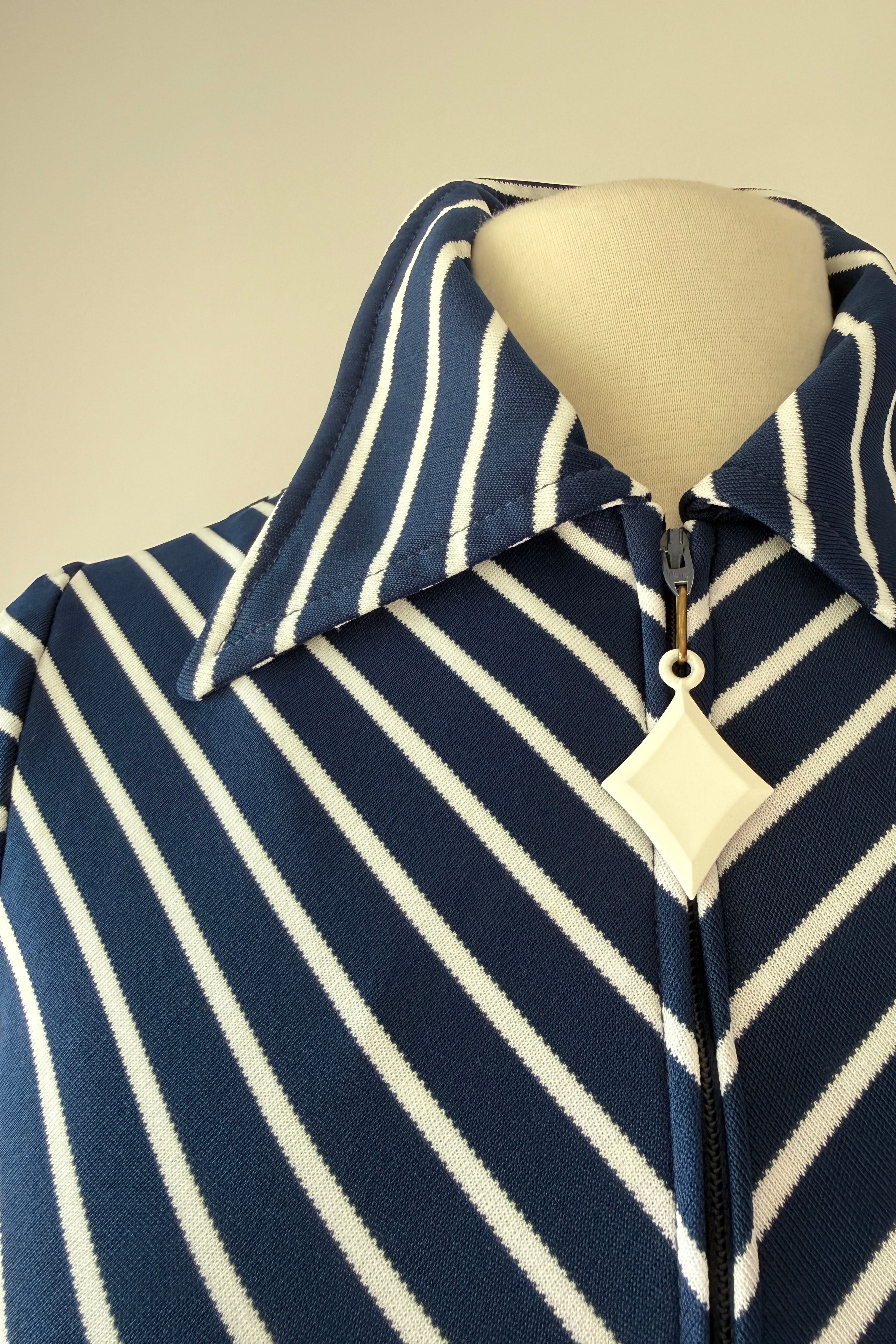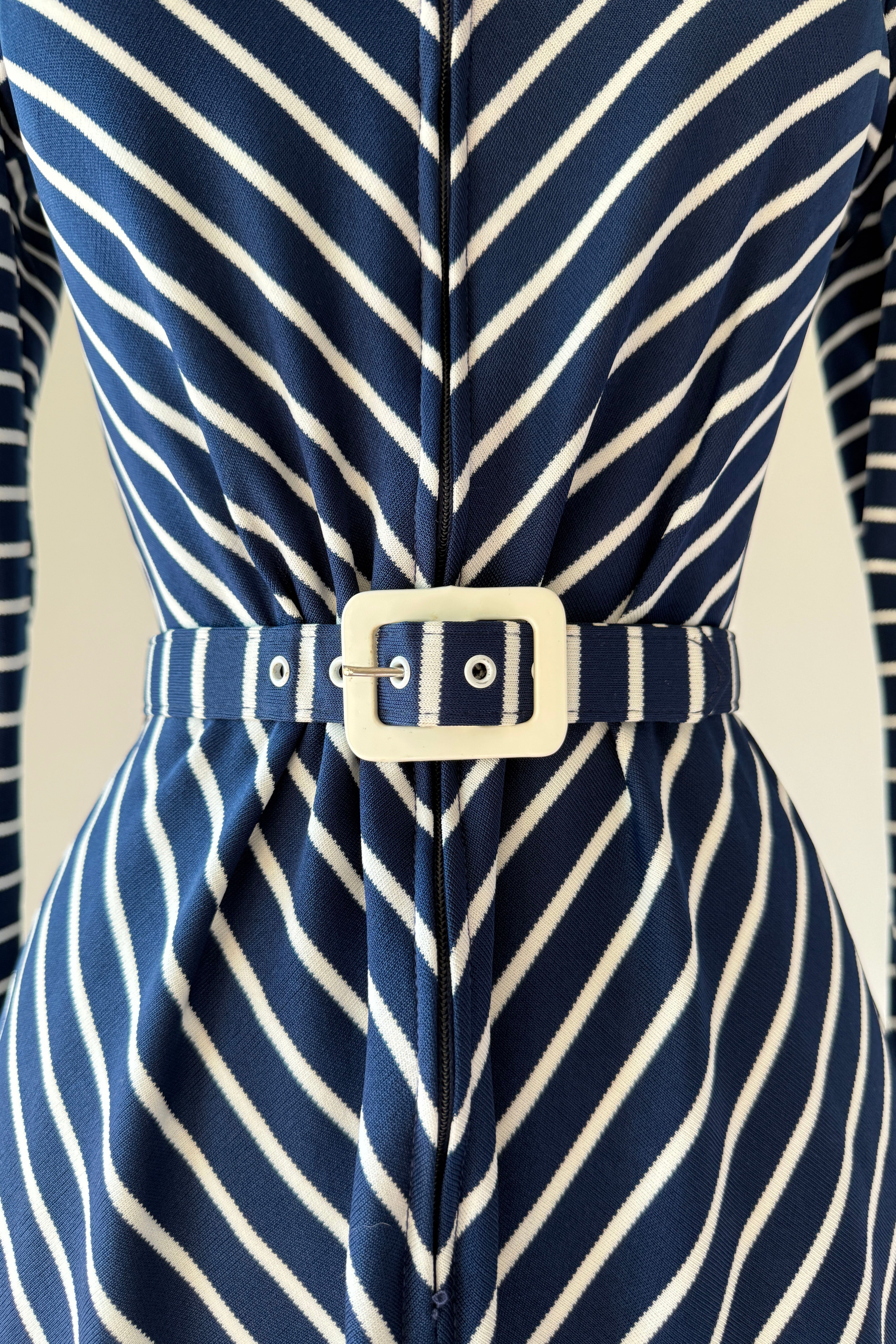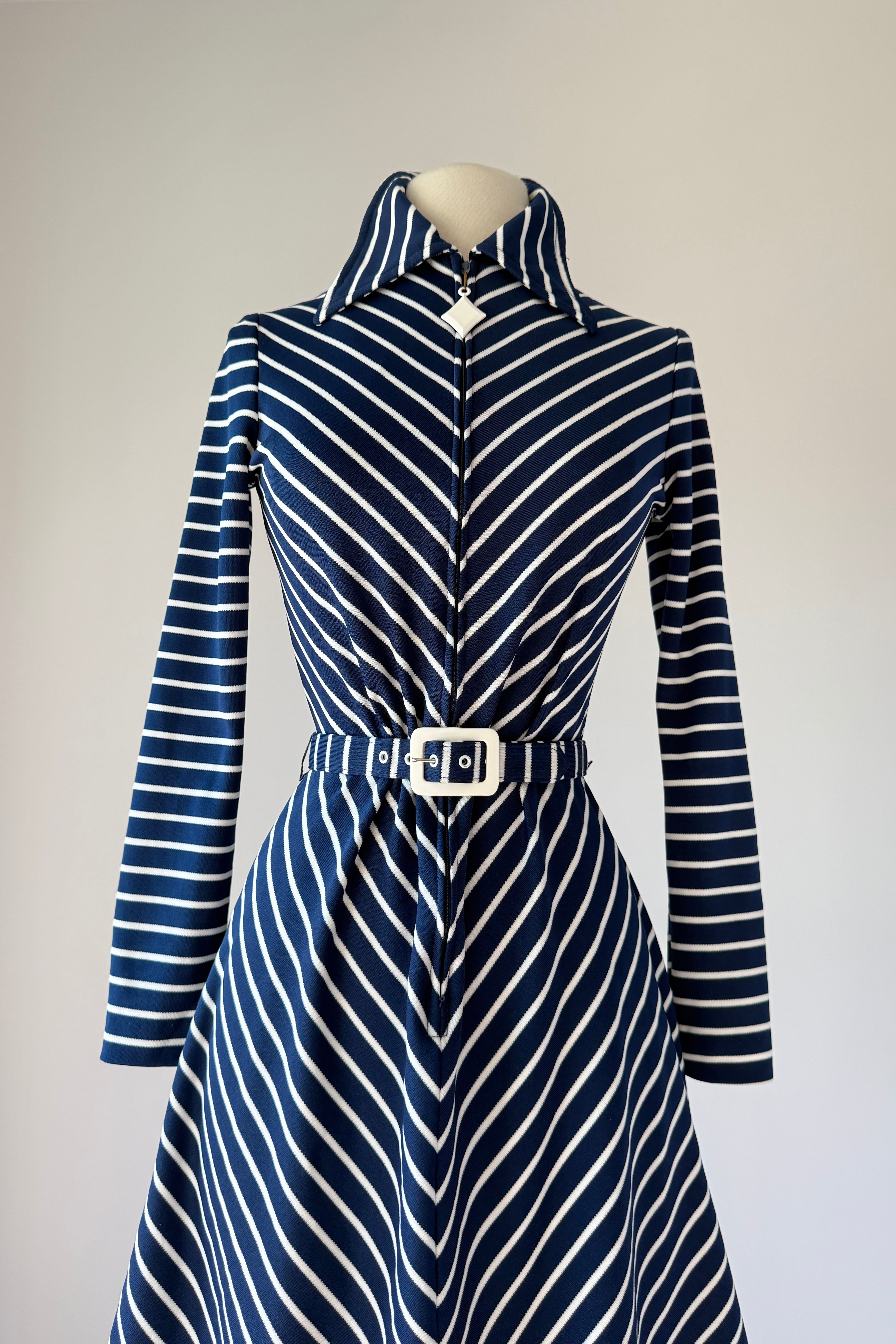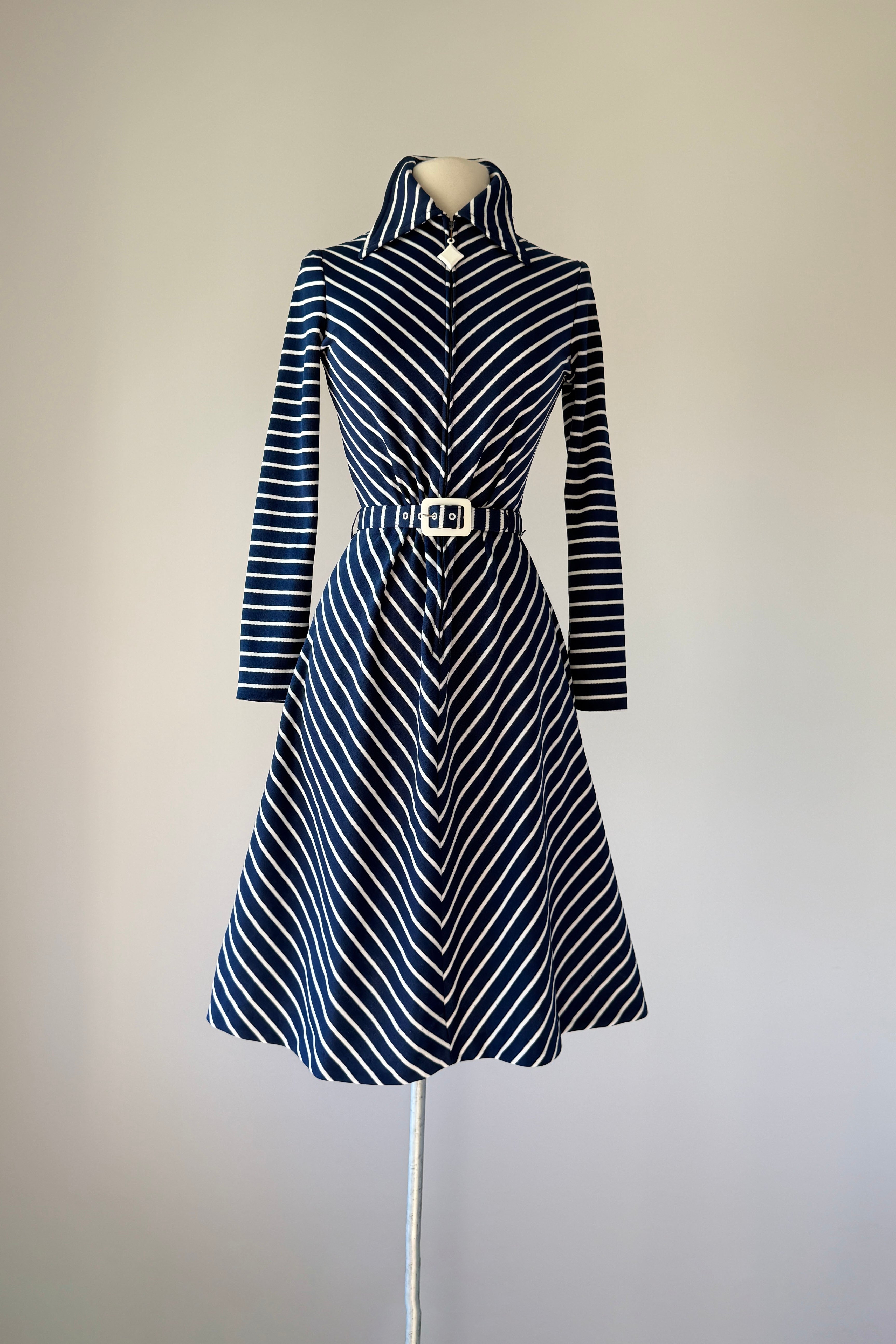 VINTAGE DRESSVintage 1970s dress. Features blue and white stripe pattern on poly, front zipper with diamond pull, original belt. Excellent condition. SMALL. Length 39Bodice 16Shoulder 14Sleeve 22Bust 36-38Waist 30 looseHip up to 44As with all vintage, please expect wear consistent with age. All sales are final. No order cancellations.0738 | 2607