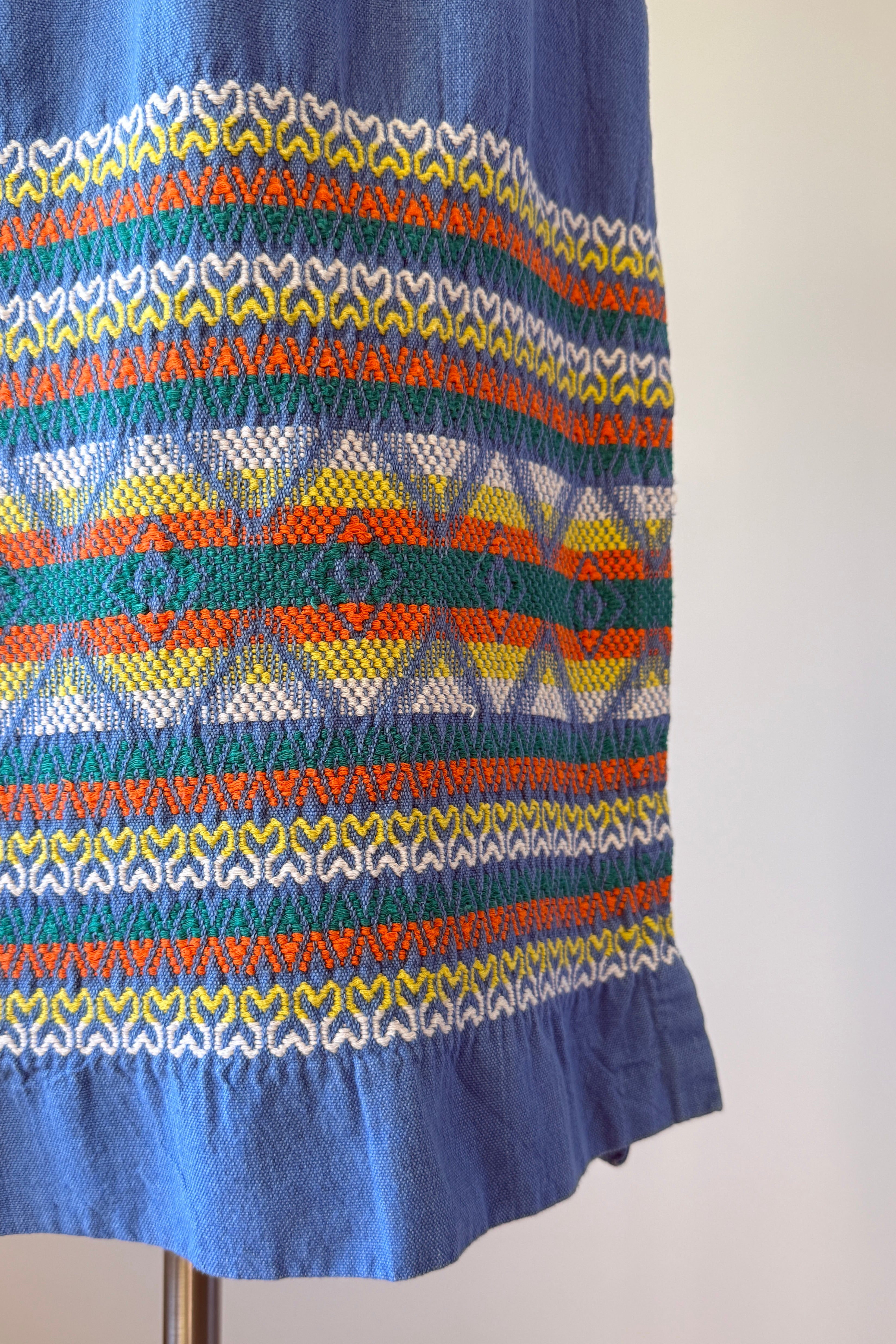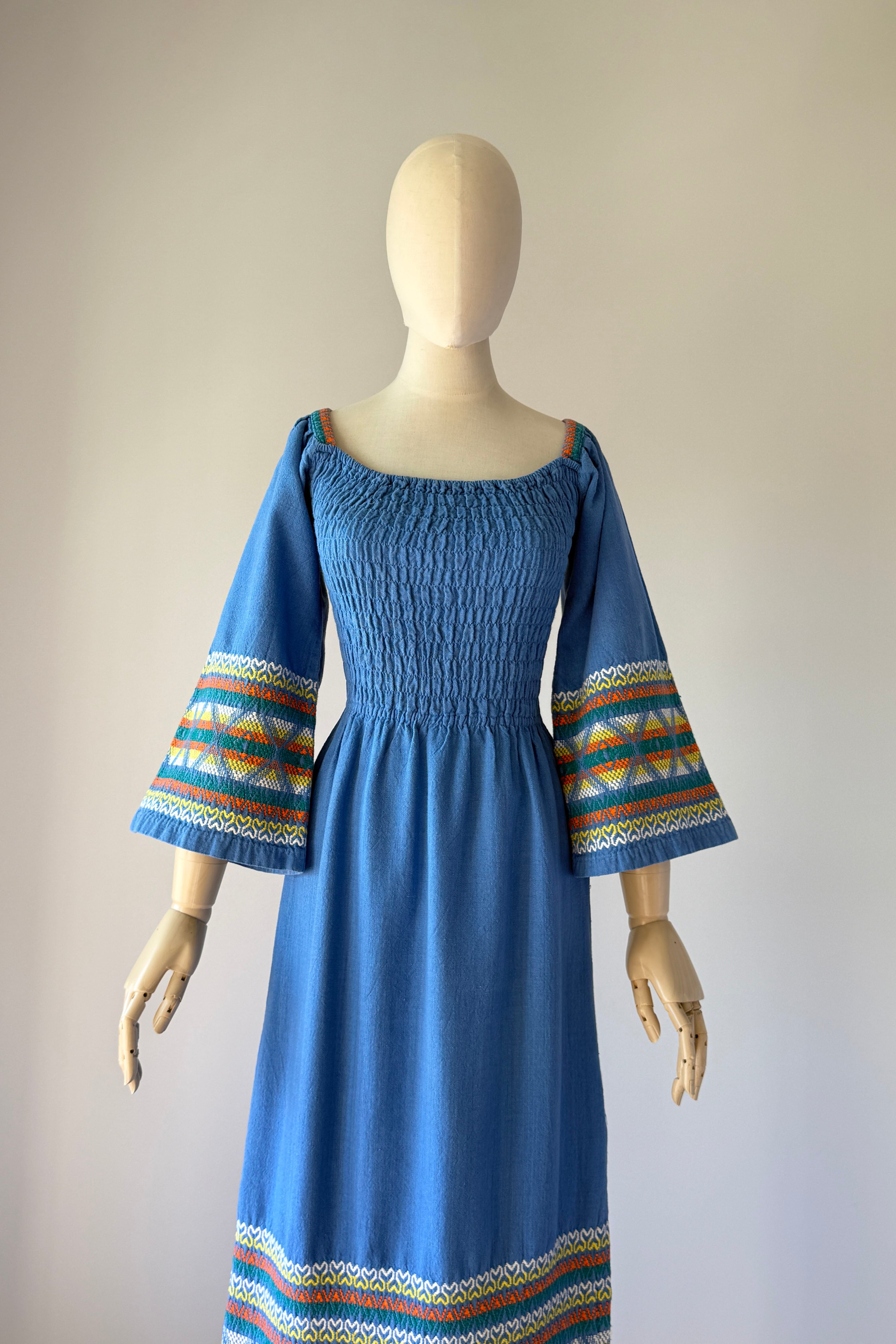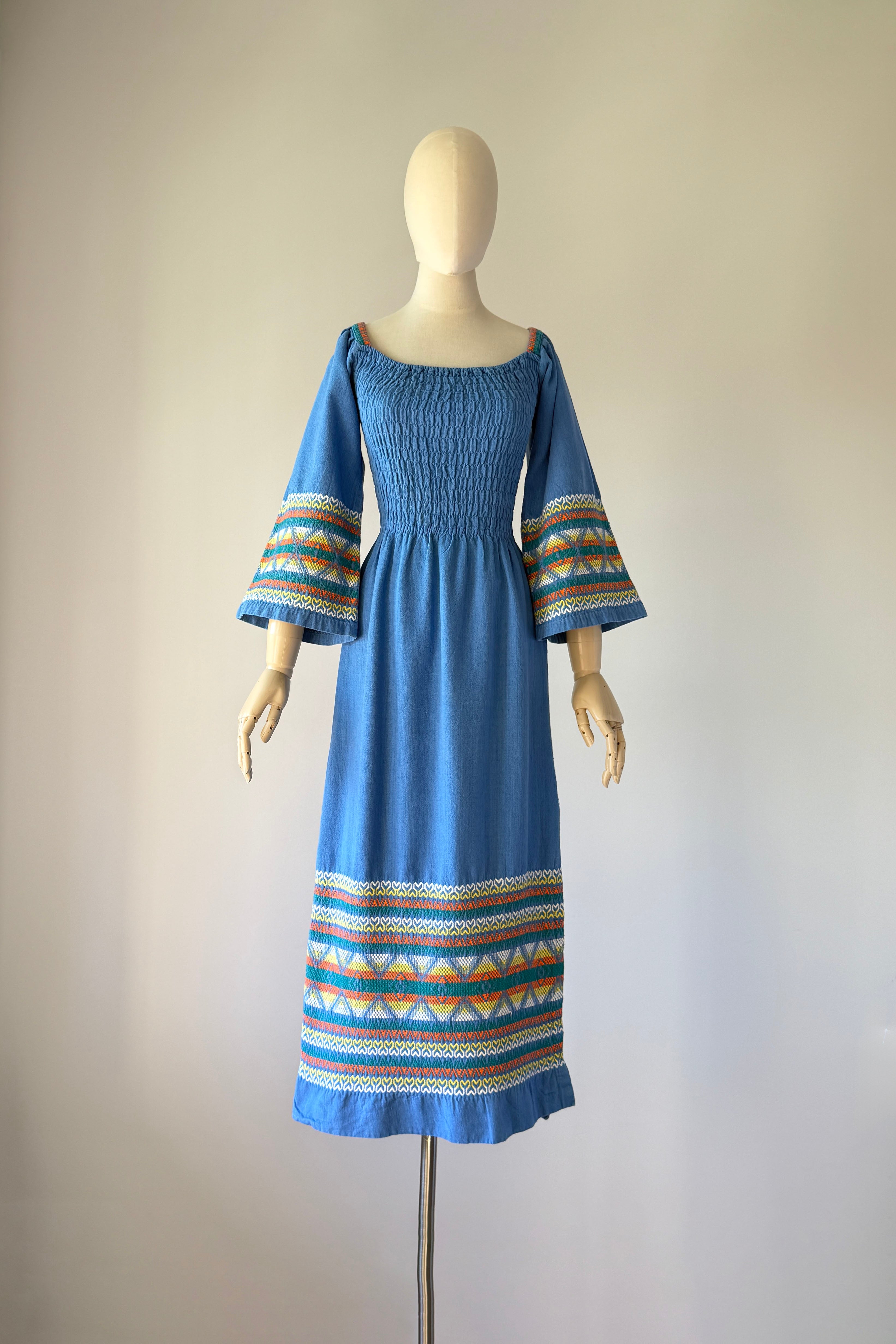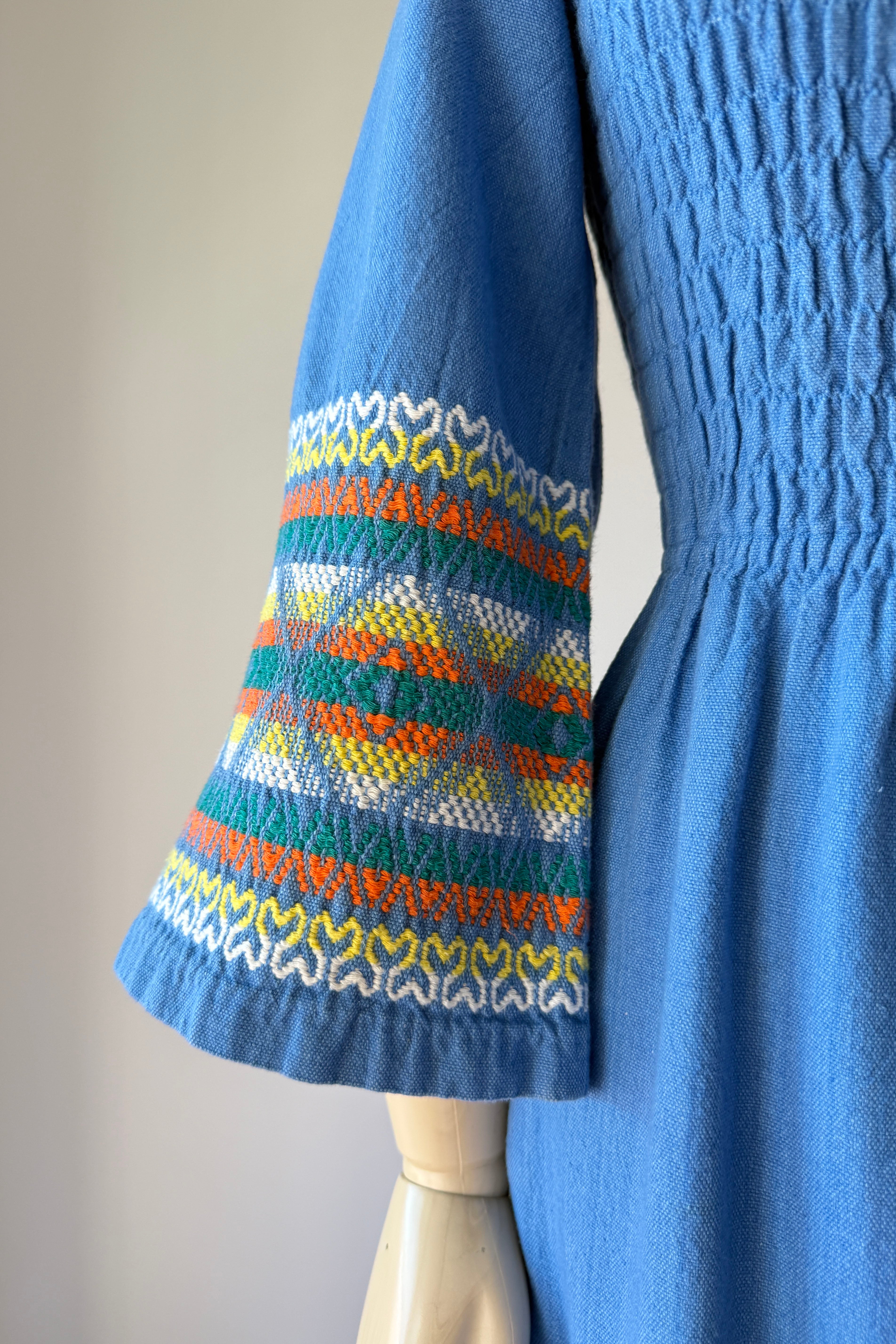 VINTAGE DRESSVintage 1970s dress. Features angel sleeves, colorful embroidery, smocked bodice, slit at left hem. 100% Guatemalans cotton. Excellent condition. SMALL. Length 50Bodice 16Bust up to 40Waist 26-30Hip 40As with all vintage, please expect wear consistent with age. All sales are final. No order cancellations.0873 | 2607