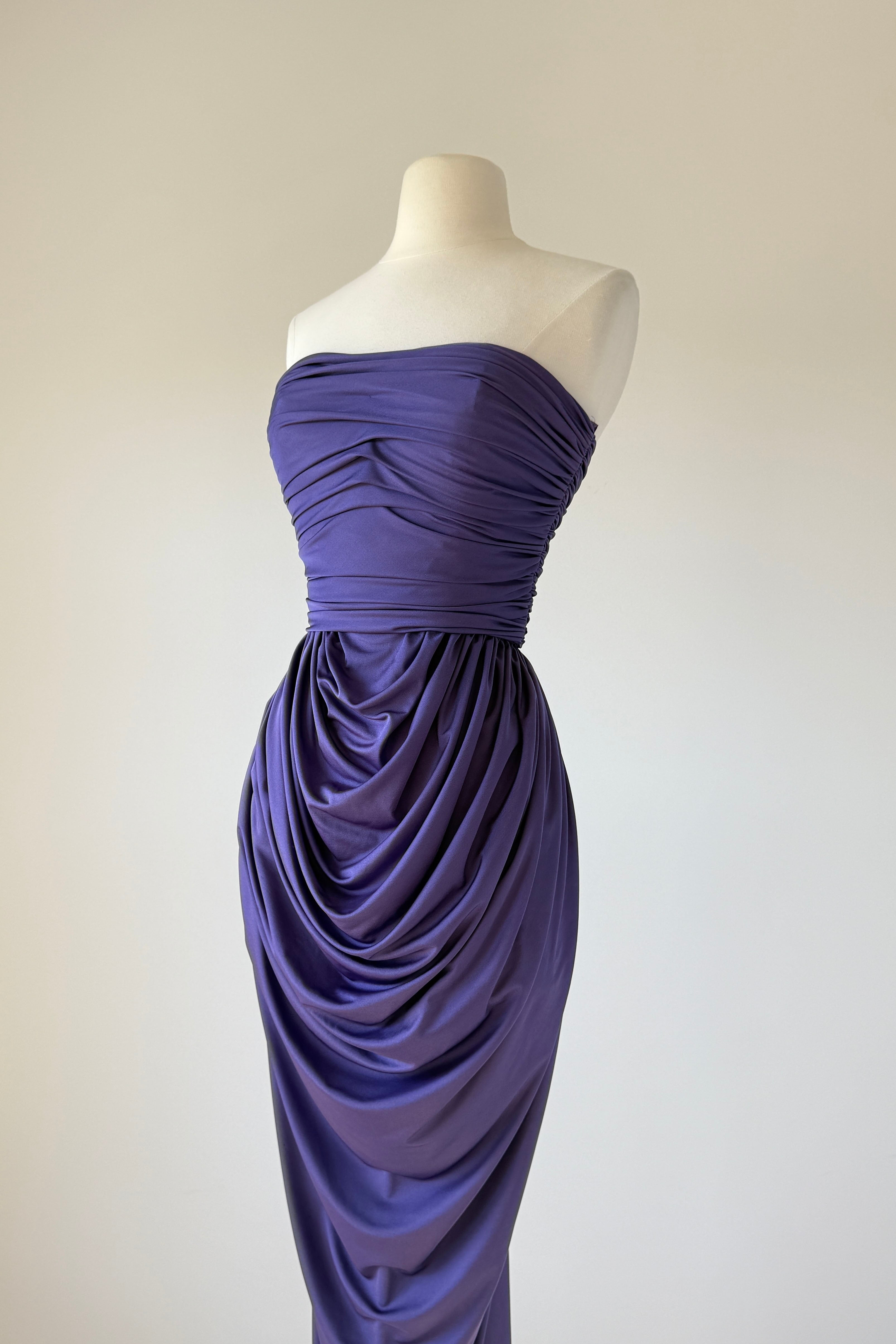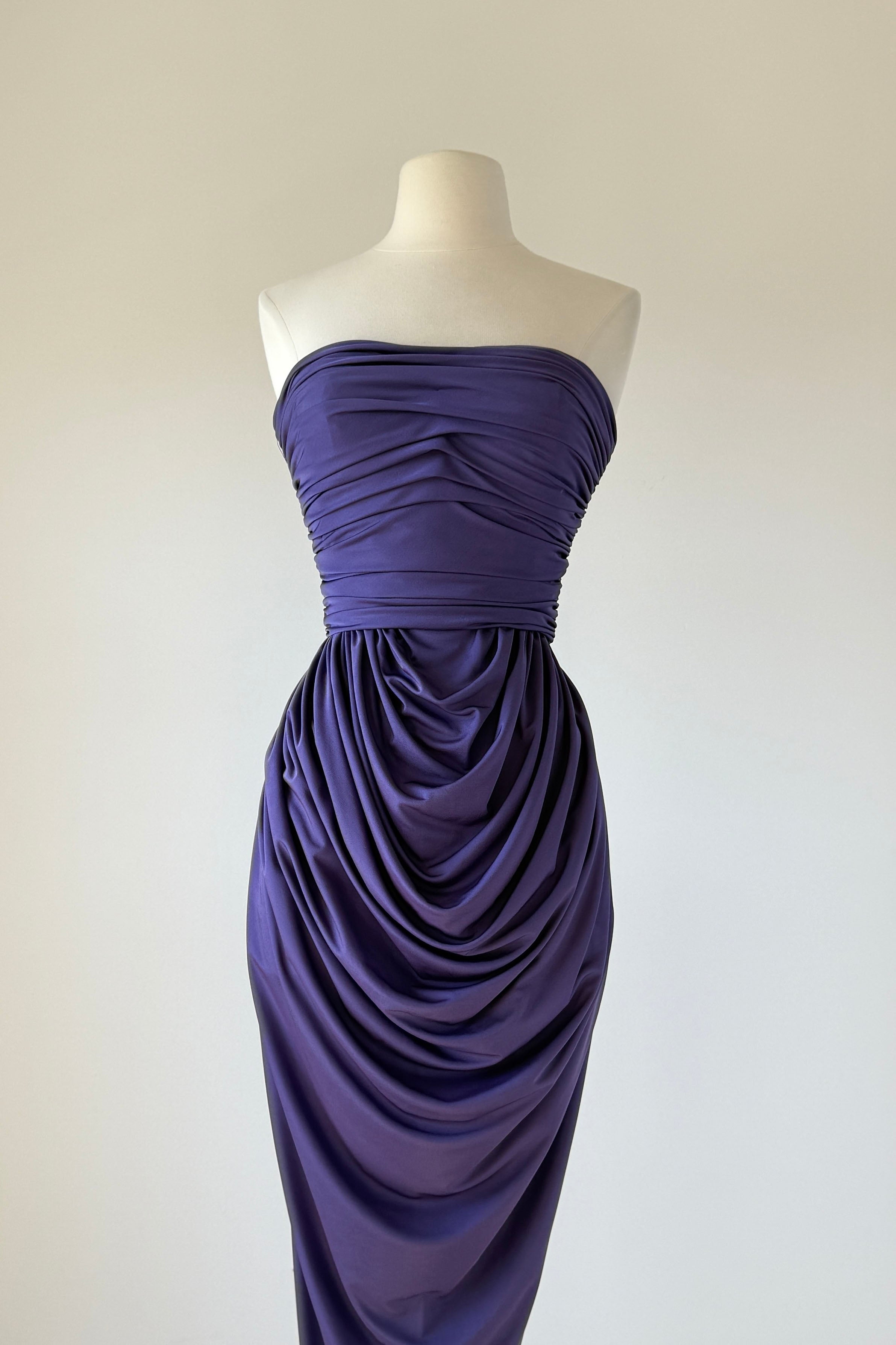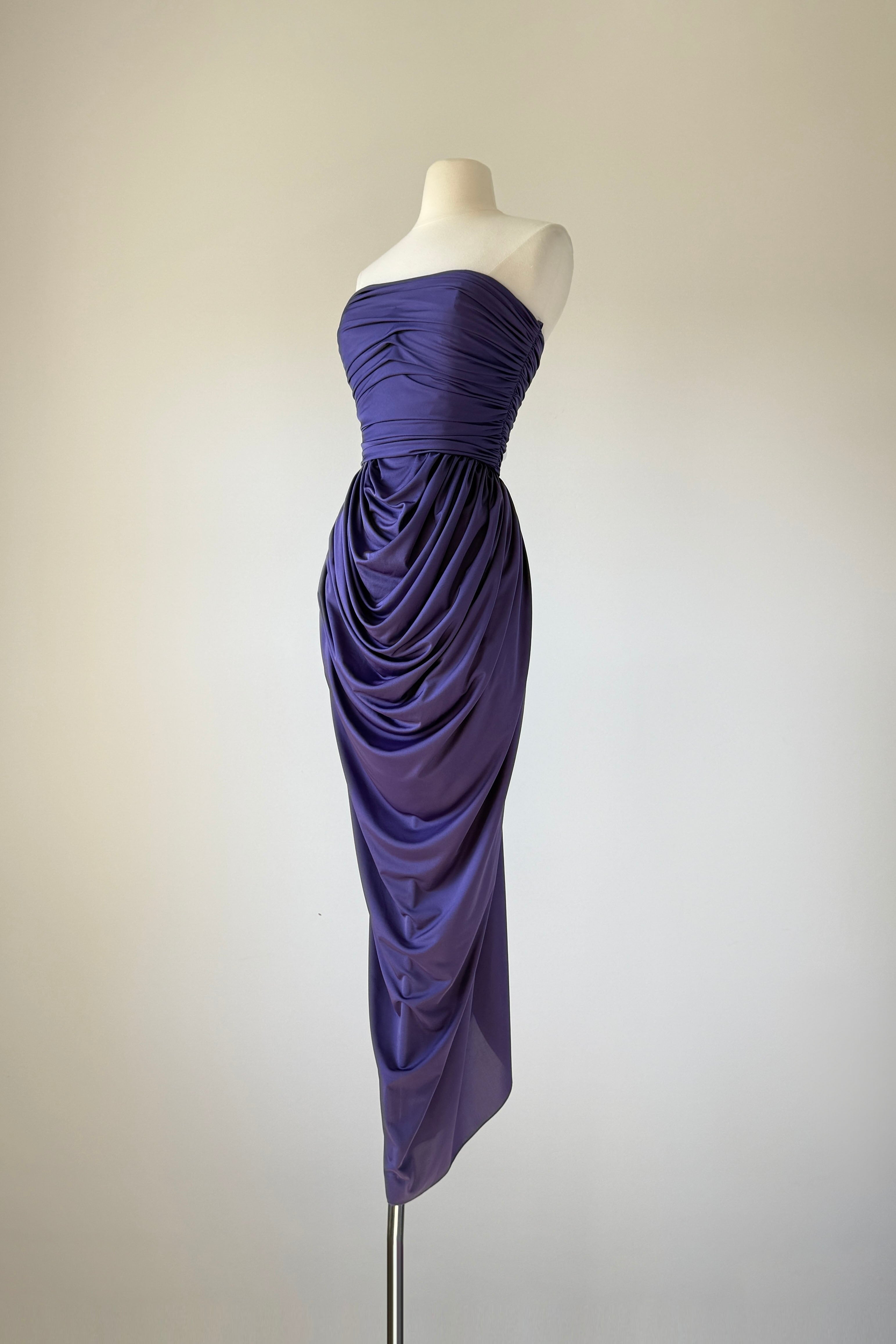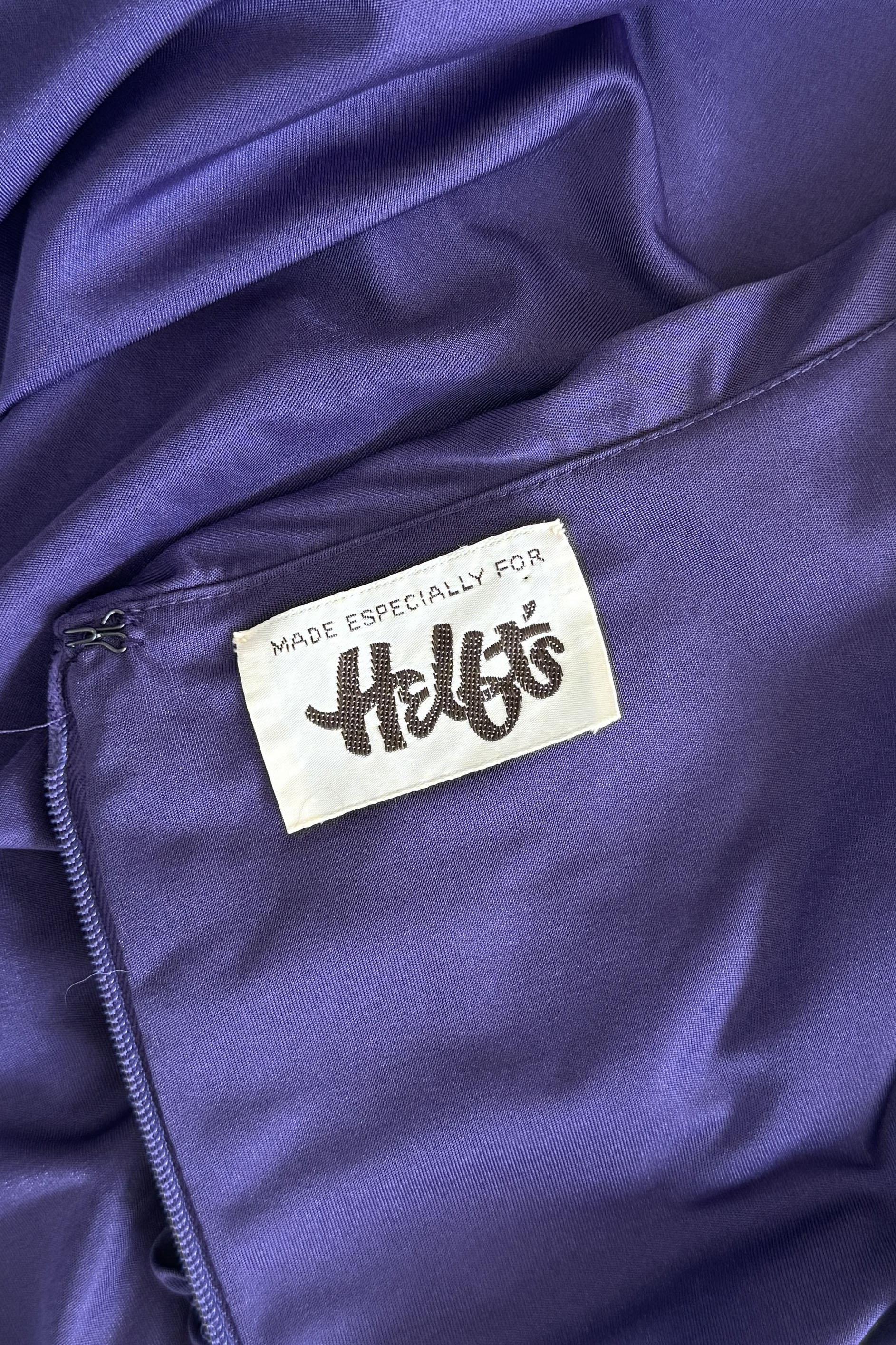 VINTAGE DRESSVintage 1970s dress. Features deep royal purple, strapless bodice, draped skirt. Back zipper. Poly. Made for Helft's. Excellent condition. Fits like XS/S. Length 50Bodice 9Bust 34Waist 26Hip up to 46As with all vintage, please expect wear consistent with age. All sales are final. No order cancellations.0833 | 2612