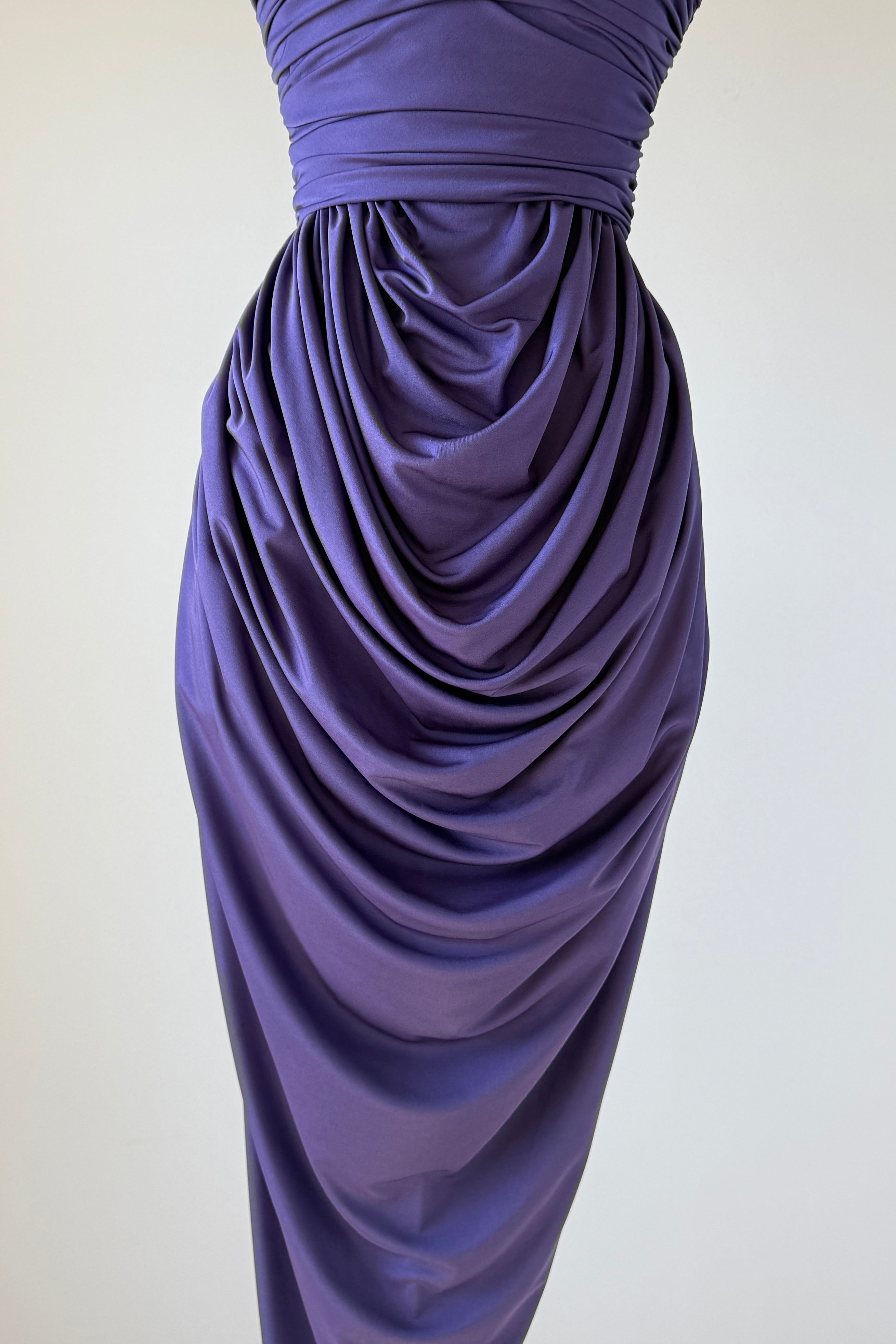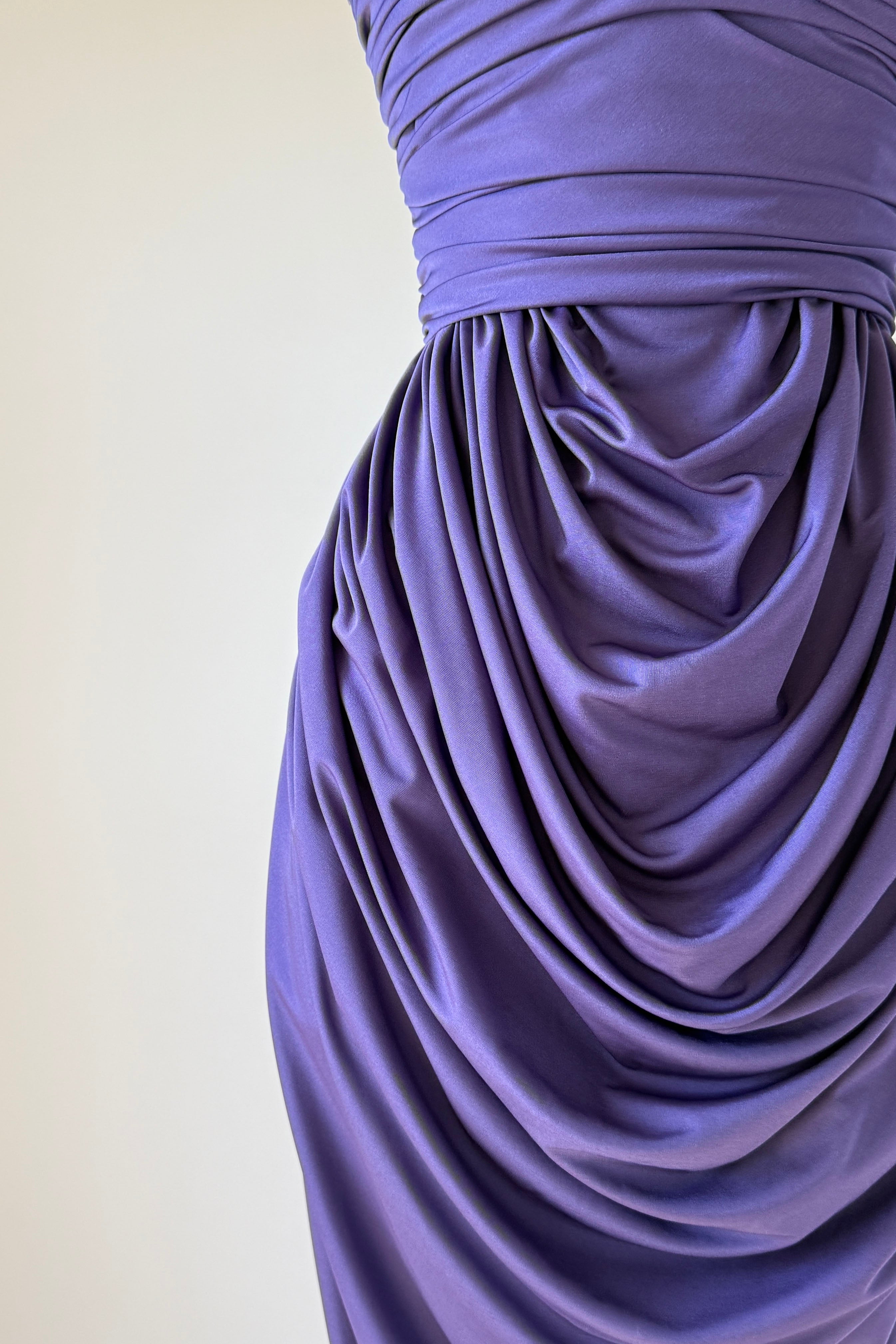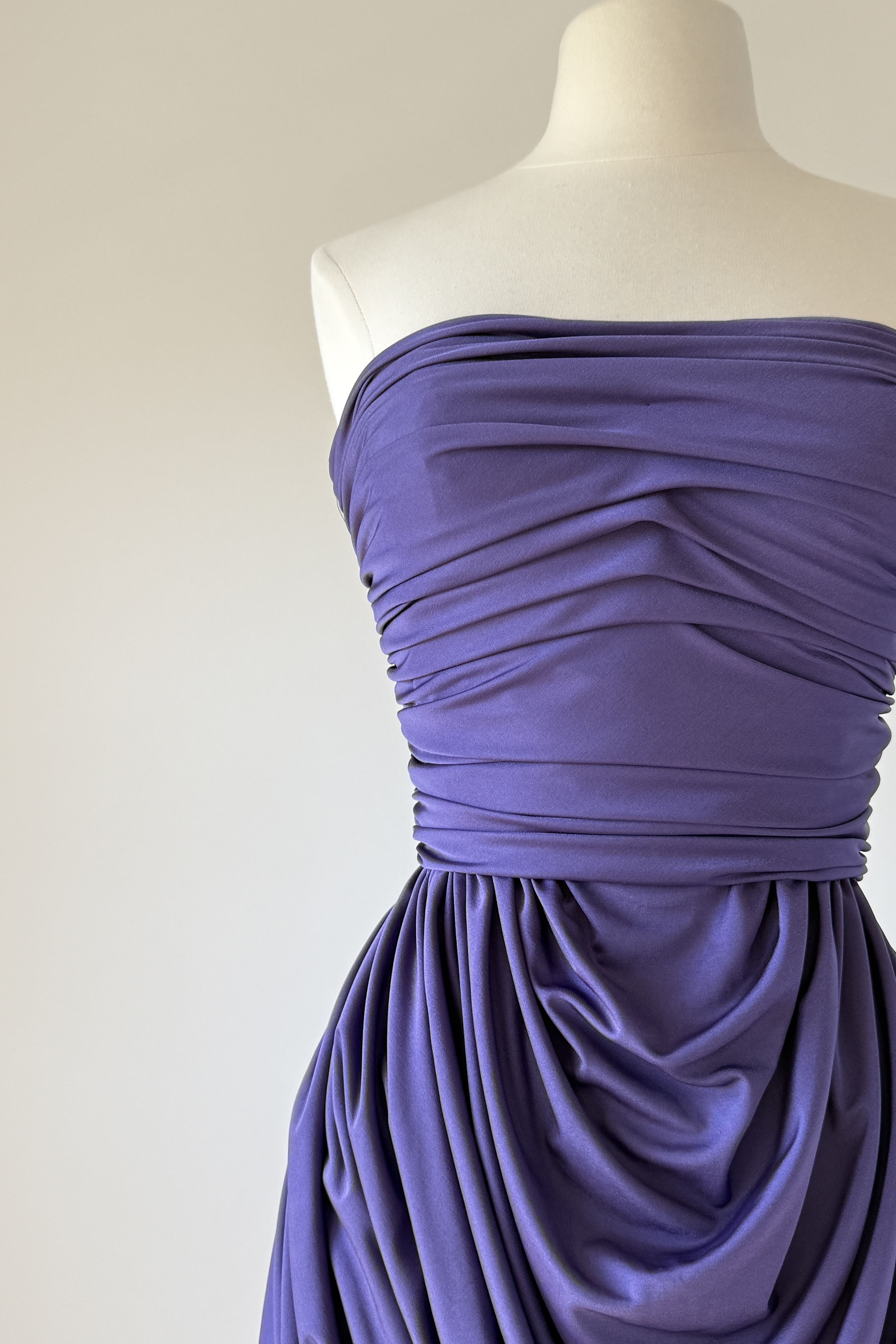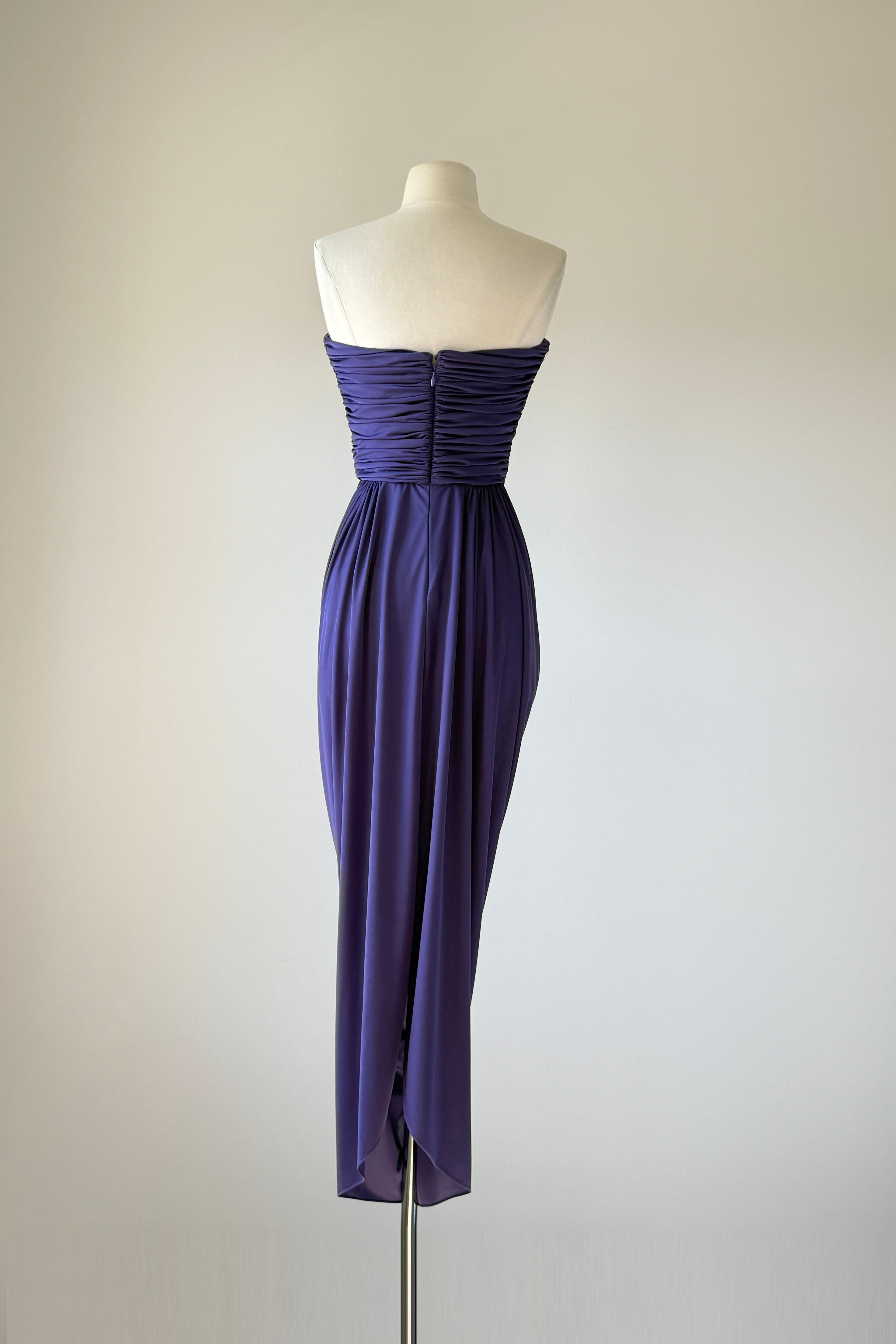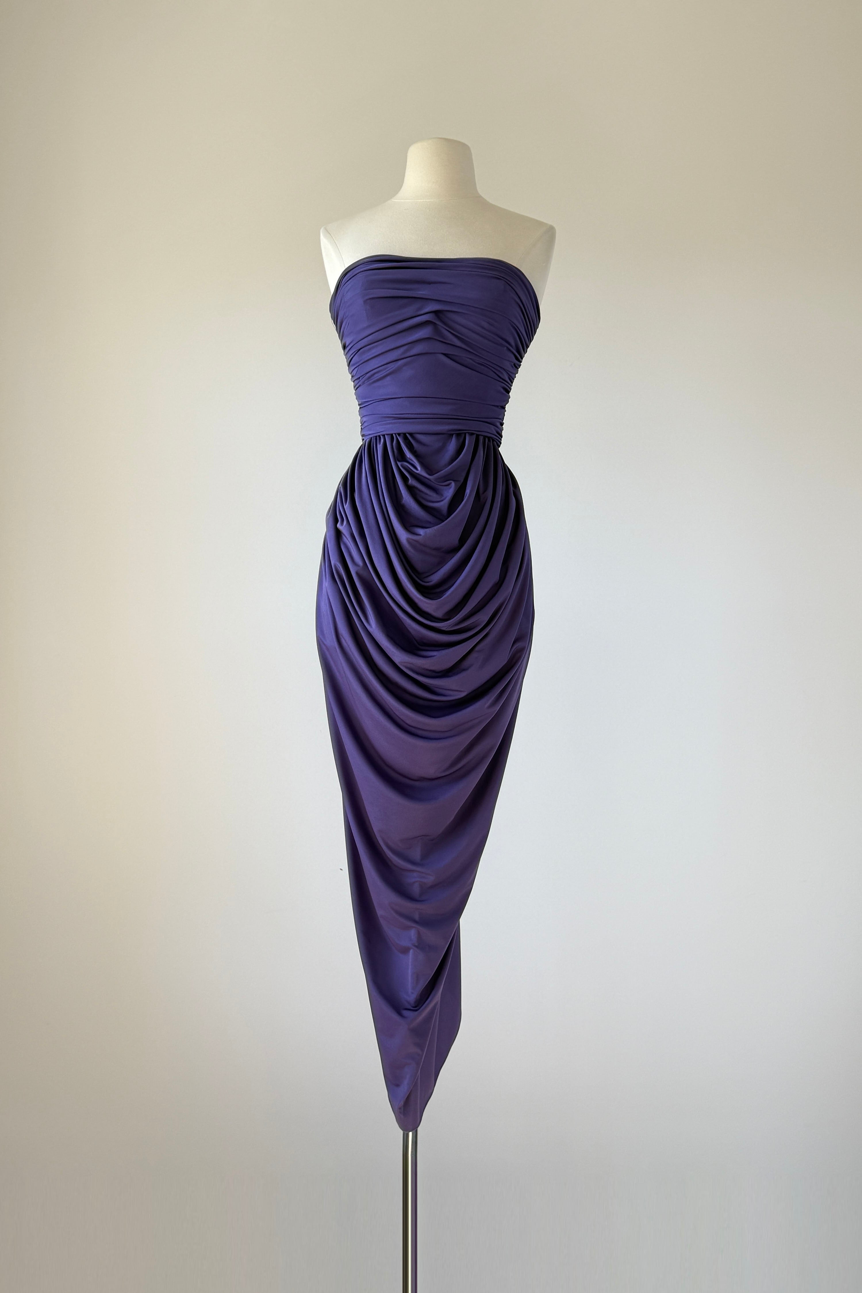 VINTAGE DRESSVintage 1970s dress. Features deep royal purple, strapless bodice, draped skirt. Back zipper. Poly. Made for Helft's. Excellent condition. Fits like XS/S. Length 50Bodice 9Bust 34Waist 26Hip up to 46As with all vintage, please expect wear consistent with age. All sales are final. No order cancellations.0833 | 2612