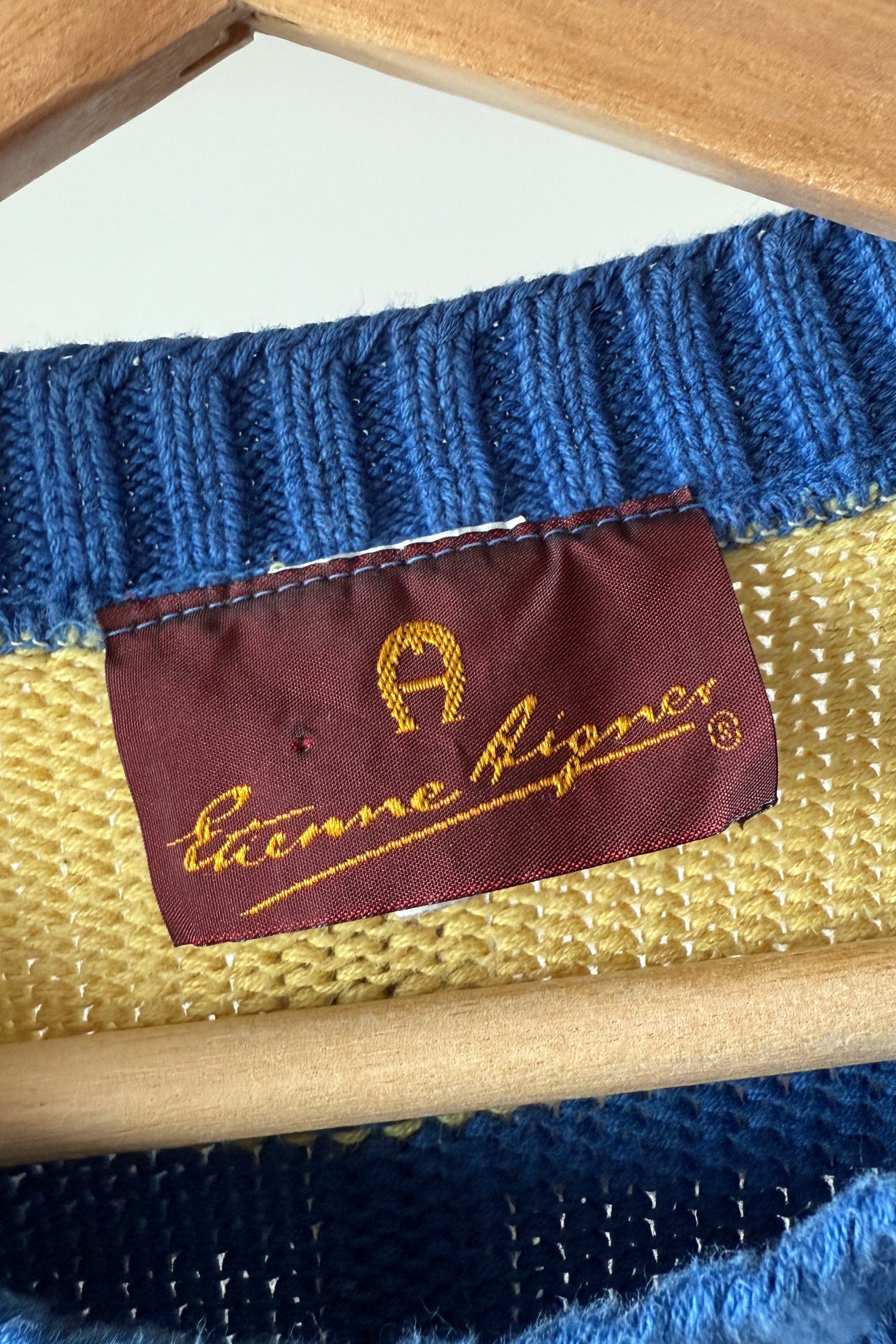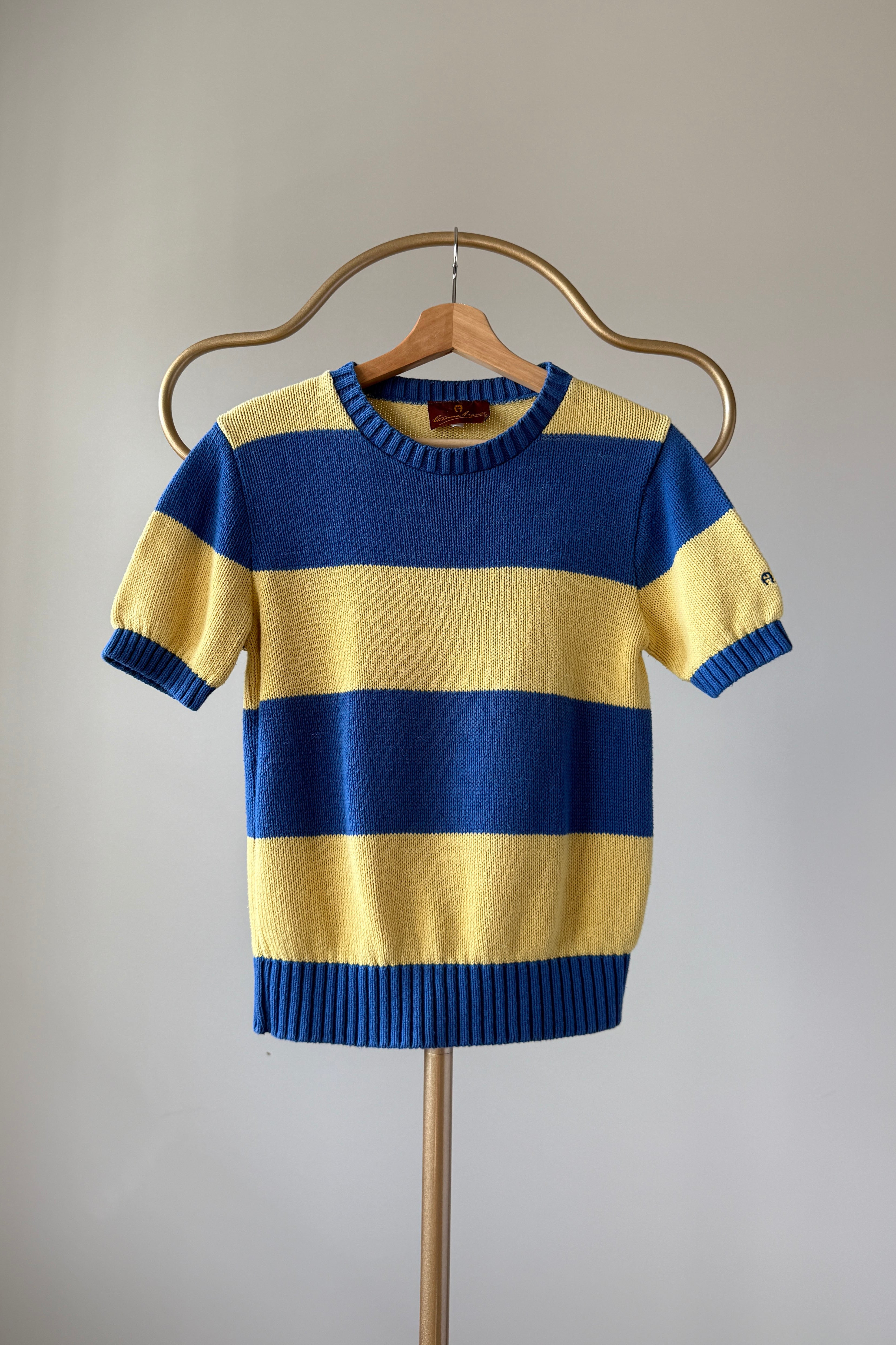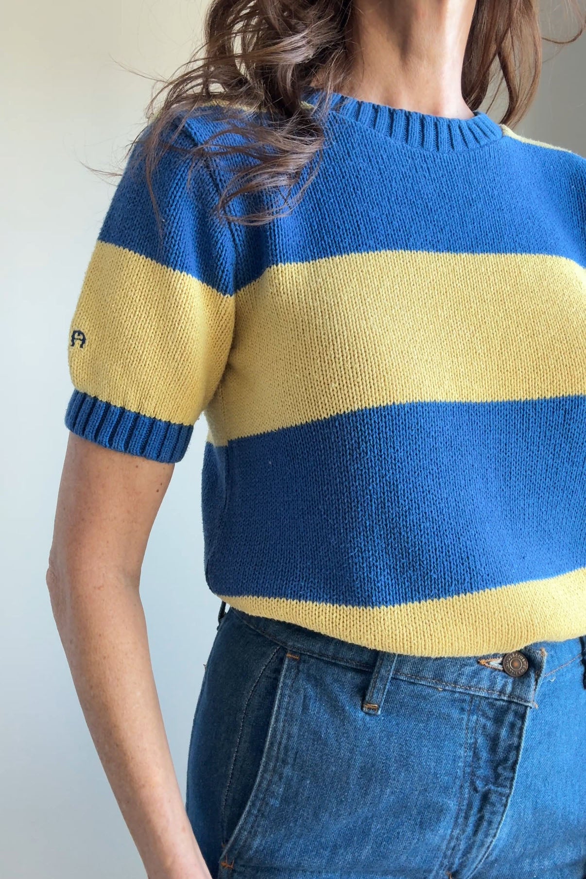 VINTAGE SWEATERVintage 1980s sweater. Feature wide blue + yellow stripe patter, short sleeves, logo at sleeves. Cotton. By Etienne Aigner. Excellent condition. S/M. Length 23Bust 38-40As with all vintage, please expect wear consistent with age. All sales are final. No order cancellations.0688 | 2606