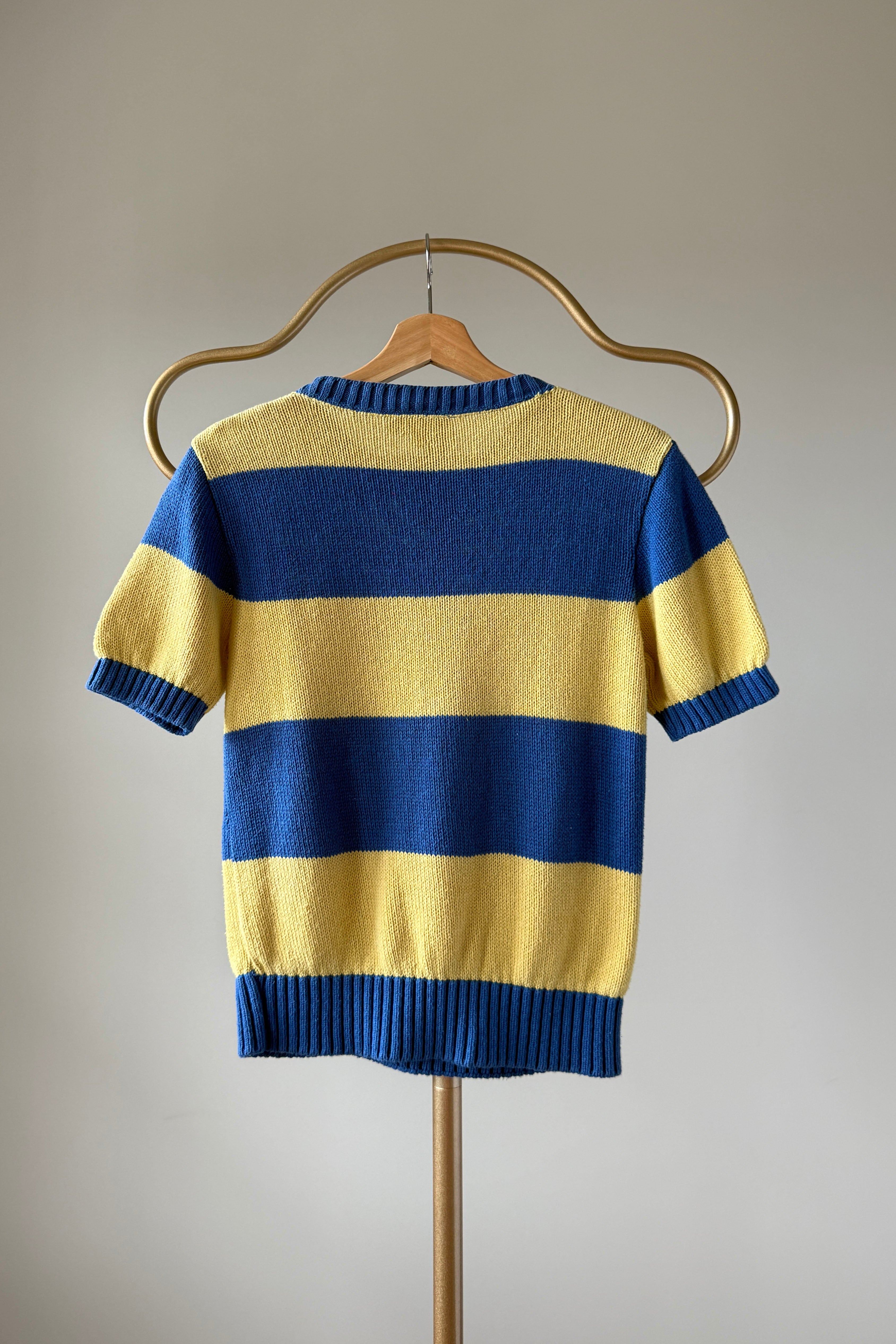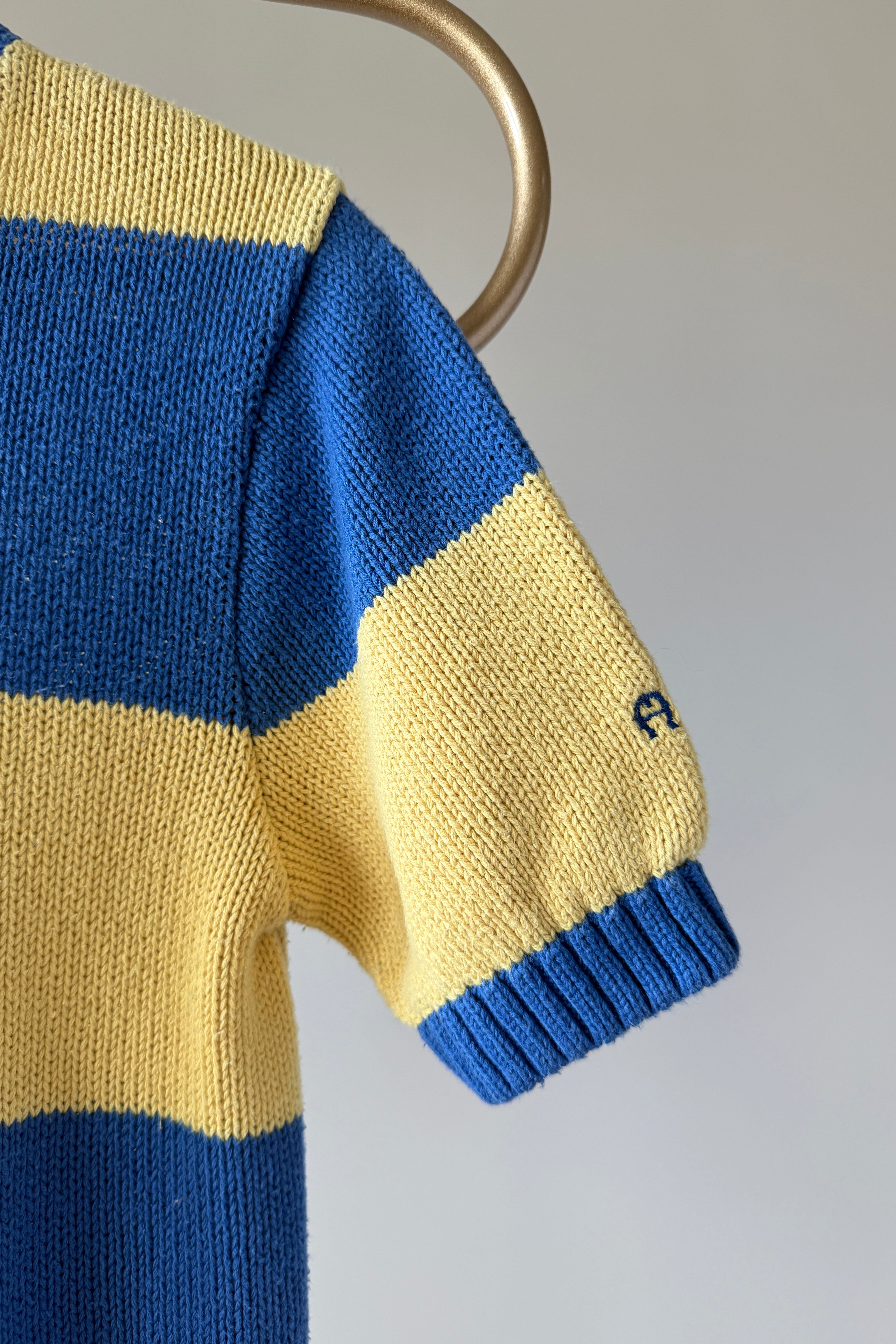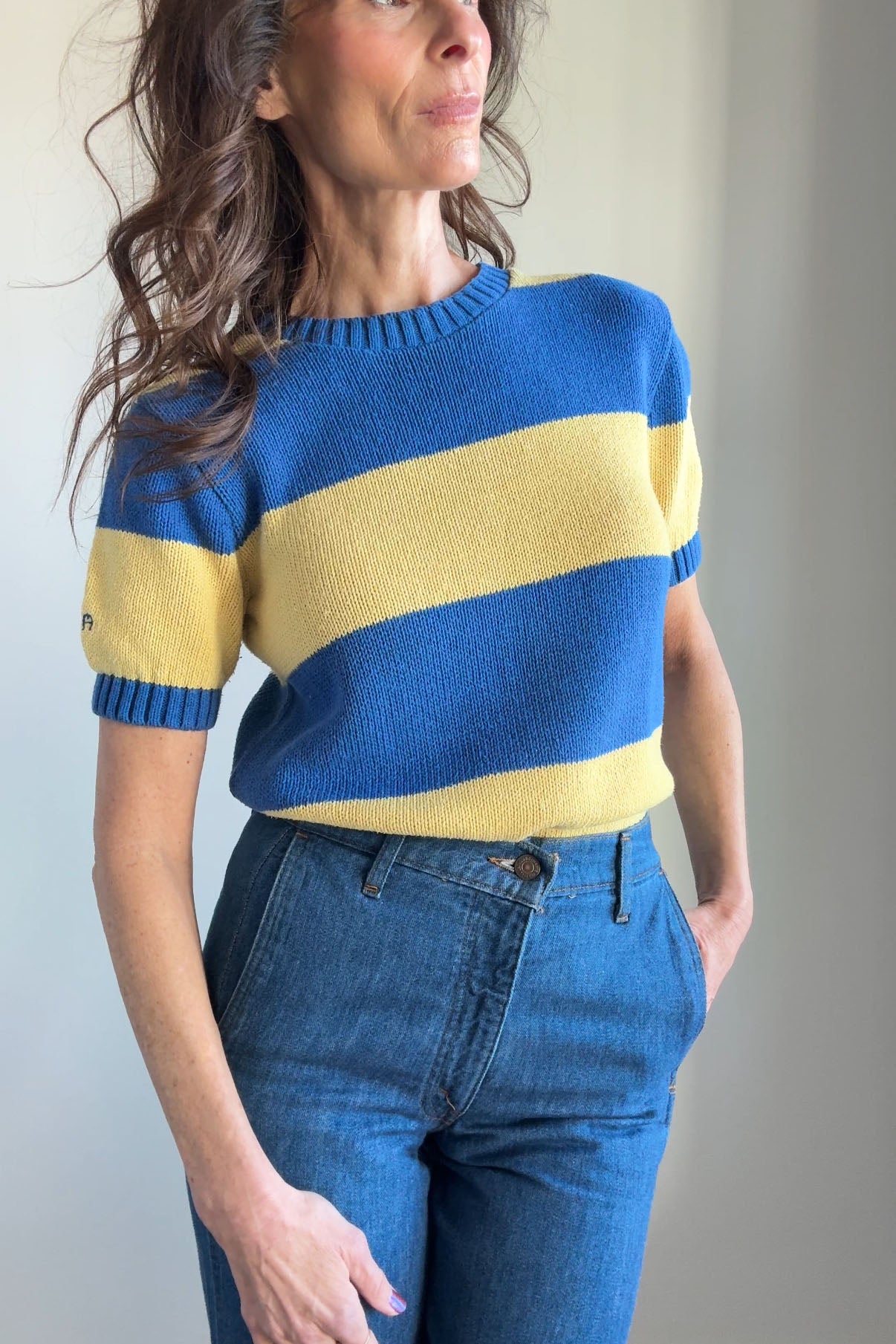 VINTAGE SWEATERVintage 1980s sweater. Feature wide blue + yellow stripe patter, short sleeves, logo at sleeves. Cotton. By Etienne Aigner. Excellent condition. S/M. Length 23Bust 38-40As with all vintage, please expect wear consistent with age. All sales are final. No order cancellations.0688 | 2606