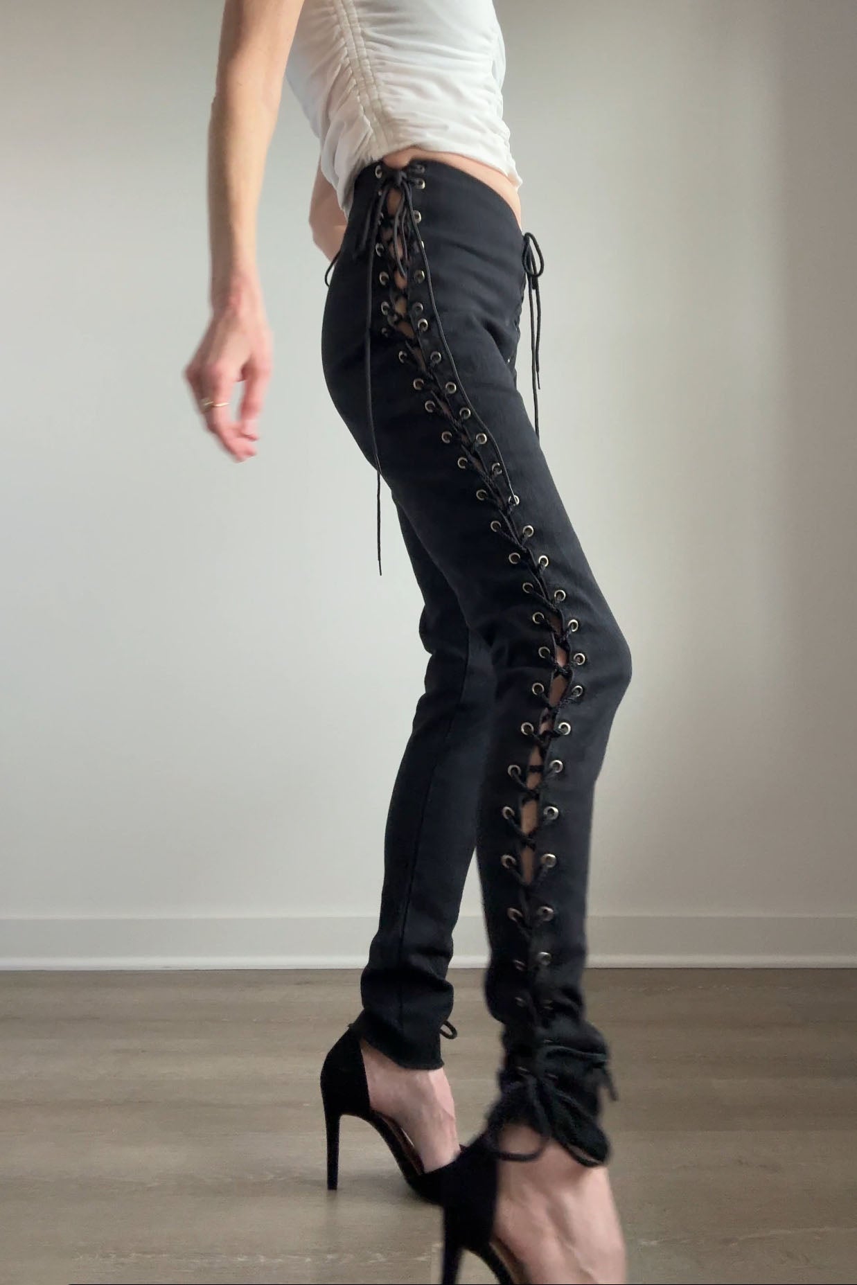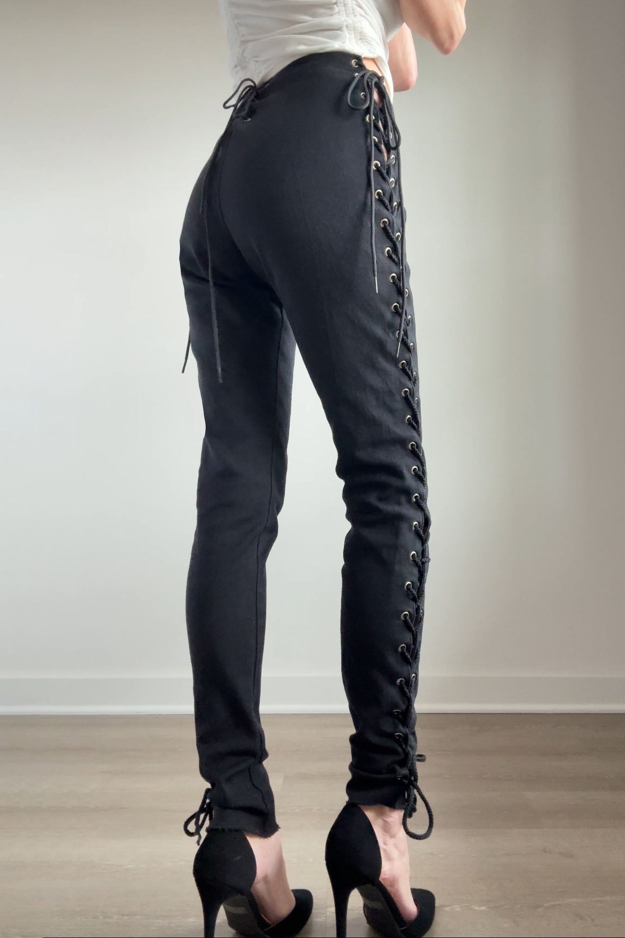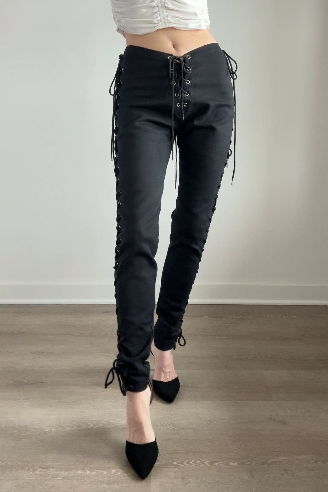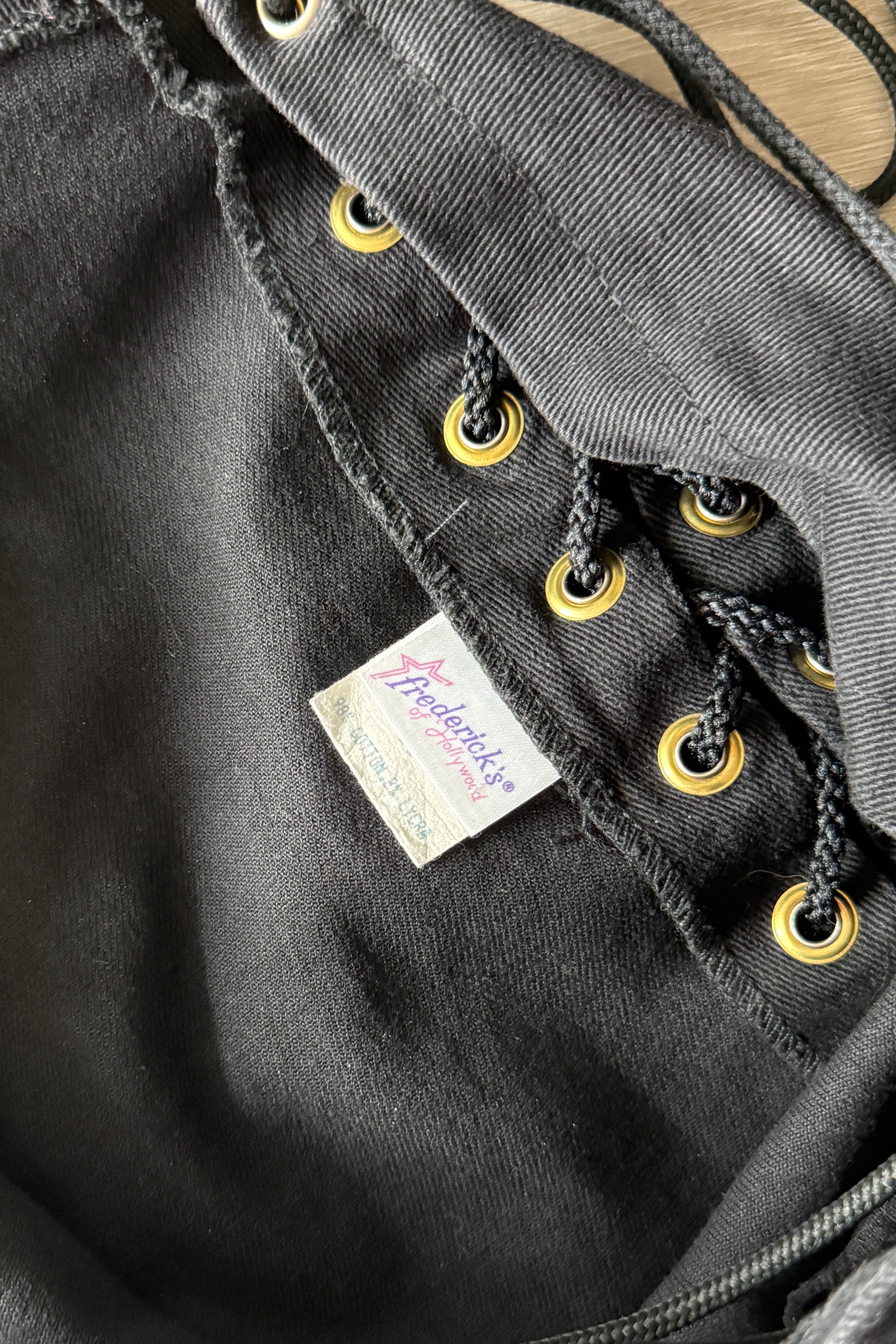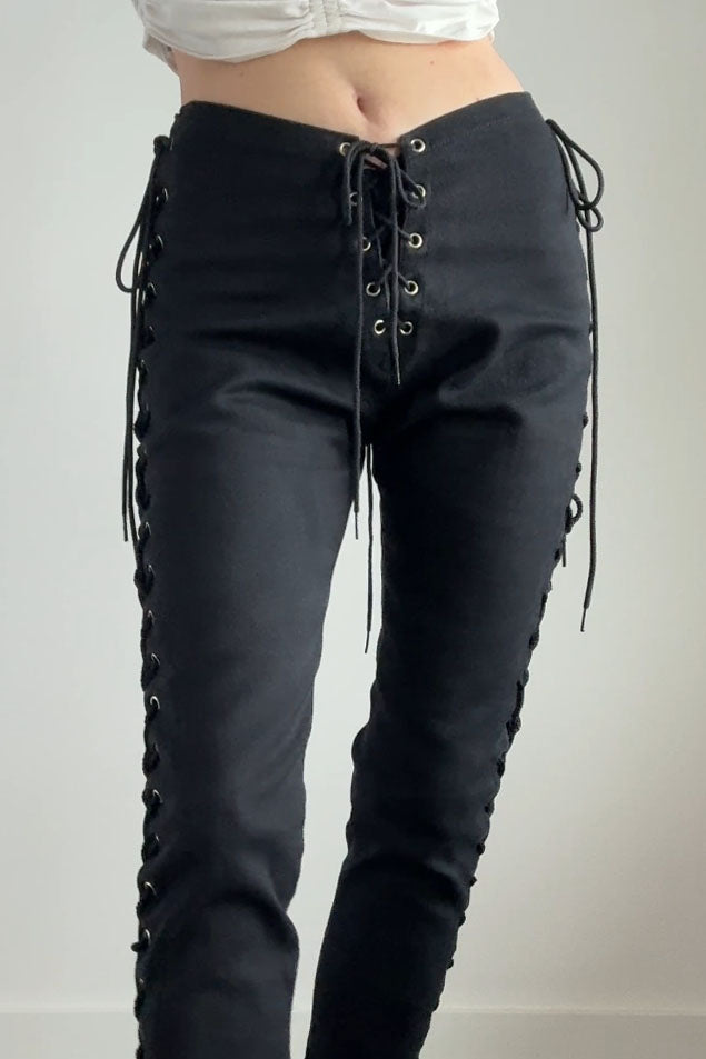 VINTAGE DENIMVintage black cotton/lycra lace up pants by Frederick's of Hollywood. Excellent condition.Fits like m/l. Marked "11".Length 39Rise 10Inseam 31Waist 28-32Hips up to 44As with all vintage, please expect wear consistent with age. All sales are final. No order cancellations.0742 | 2605