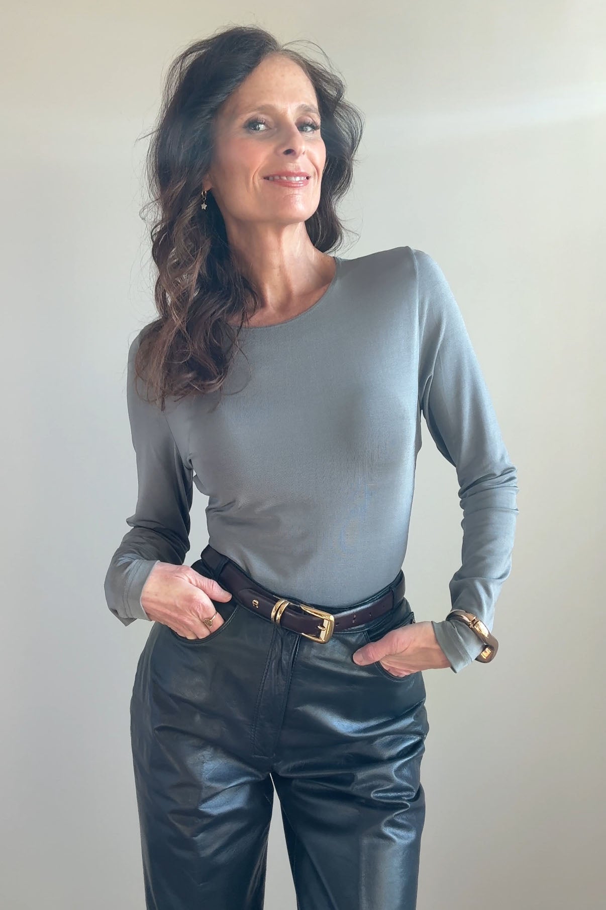 Cordovan leather belt with gold buckle.