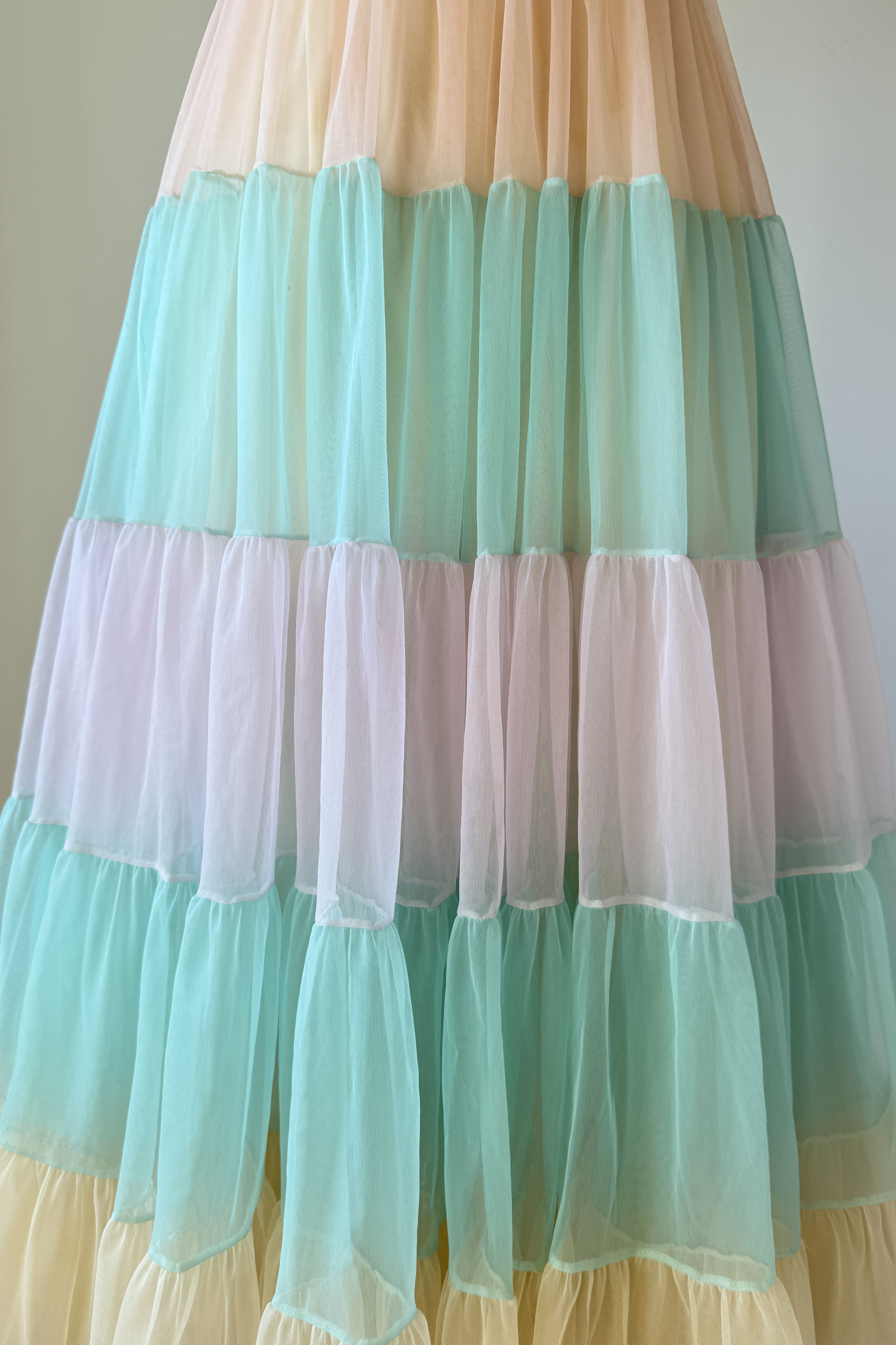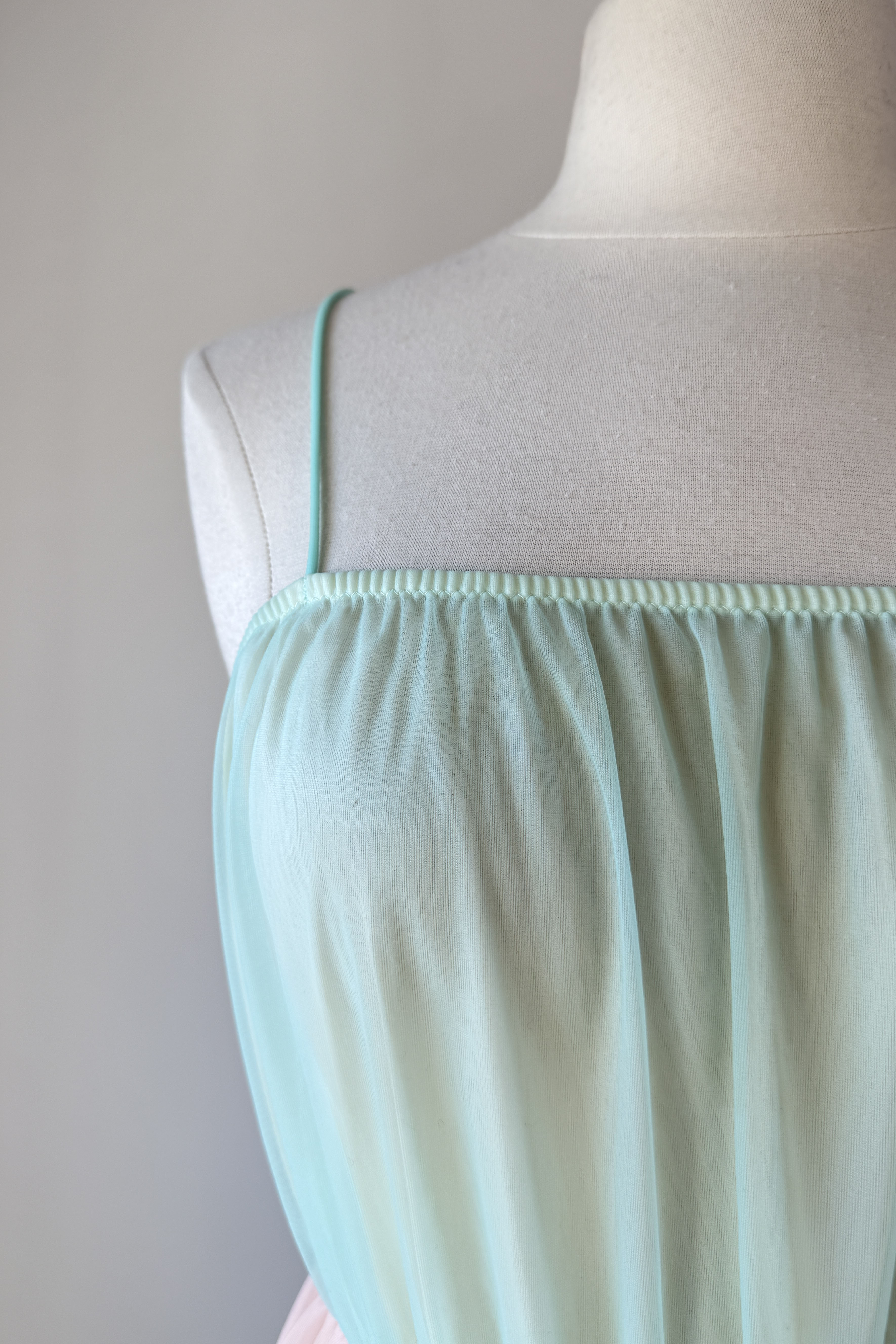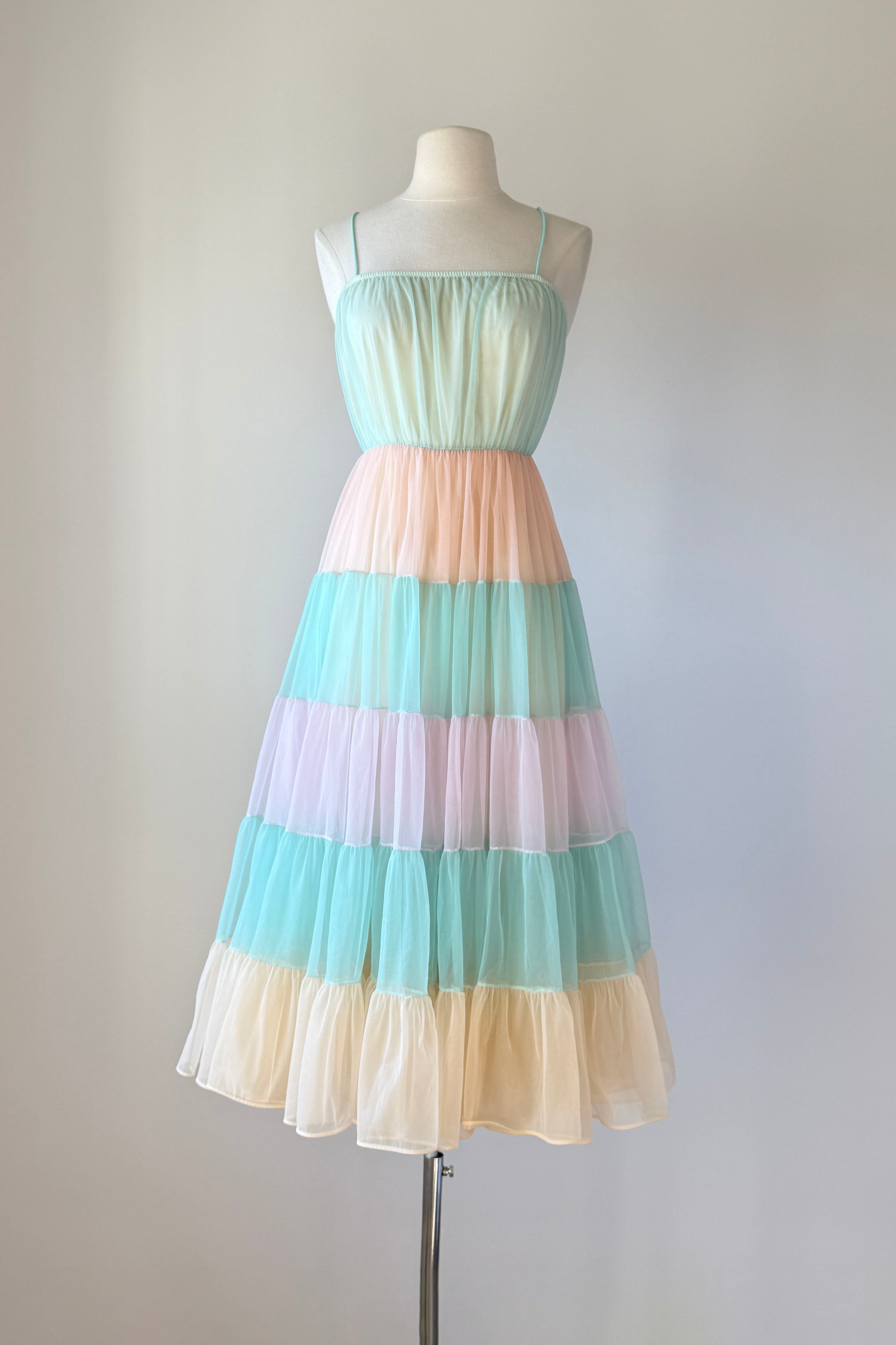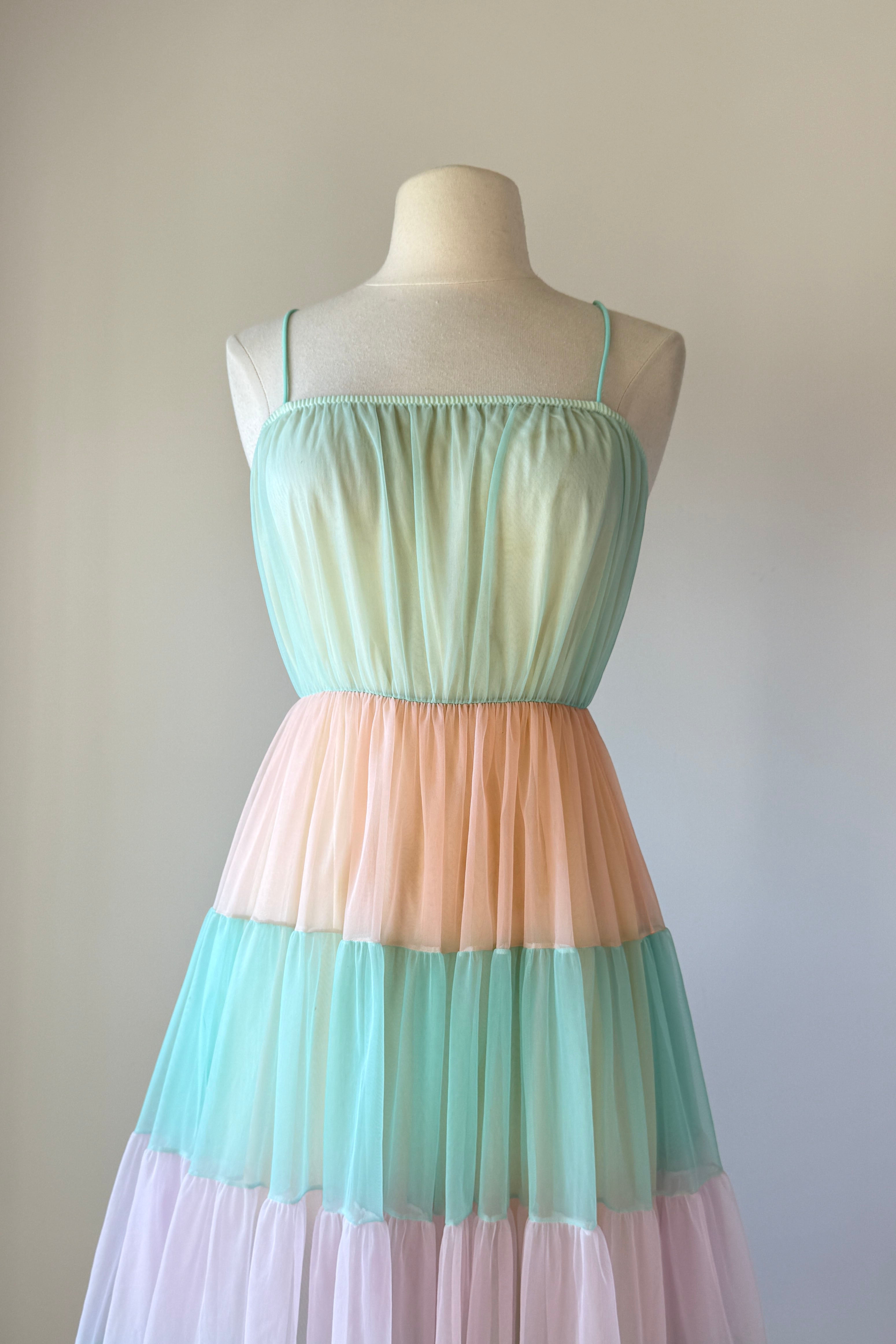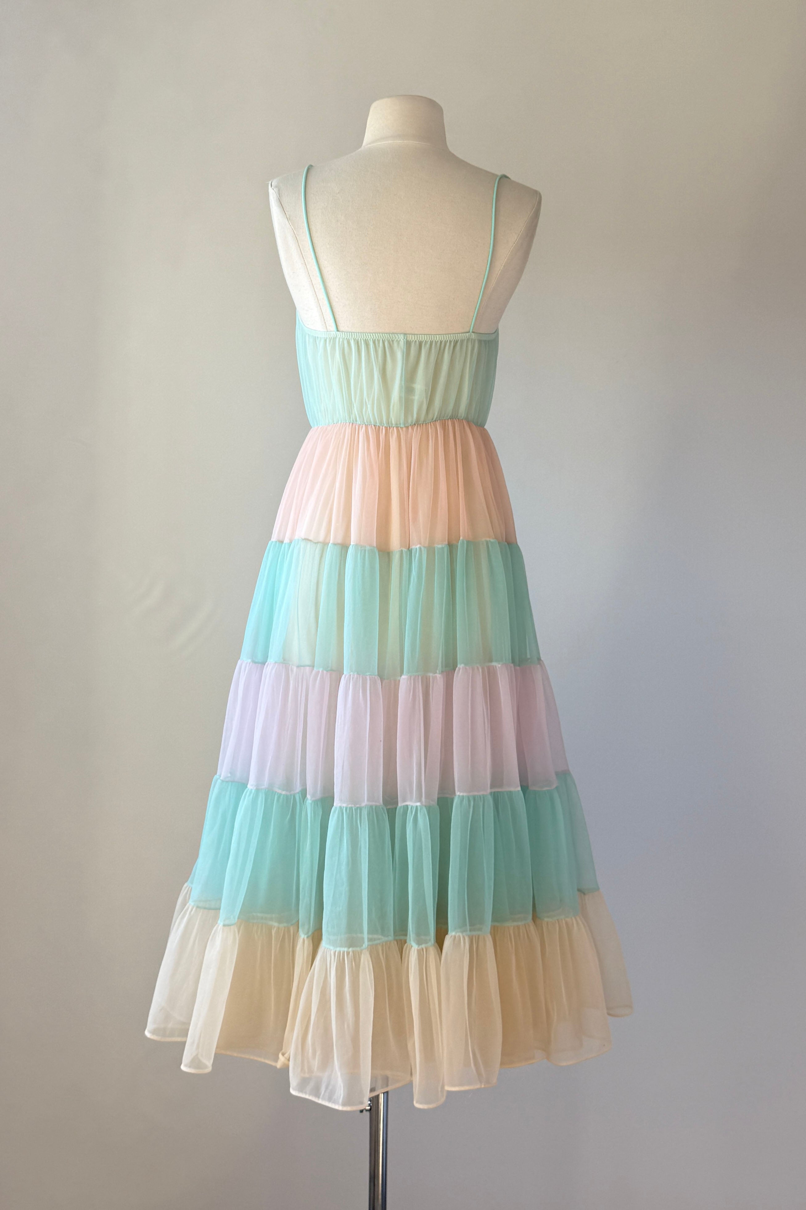 VINTAGE NIGHTIE by VANITY FAIRVintage pastel stripe slip with lining, elastic at bust and waist. Nylon. By Vanity Fair.Excellent condition. Fits like s/m.Length 48Bodice 16Bust up to 38Waist up to 32As with all vintage, please expect wear consistent with age. All sales are final. No order cancellations.0715 | 2603