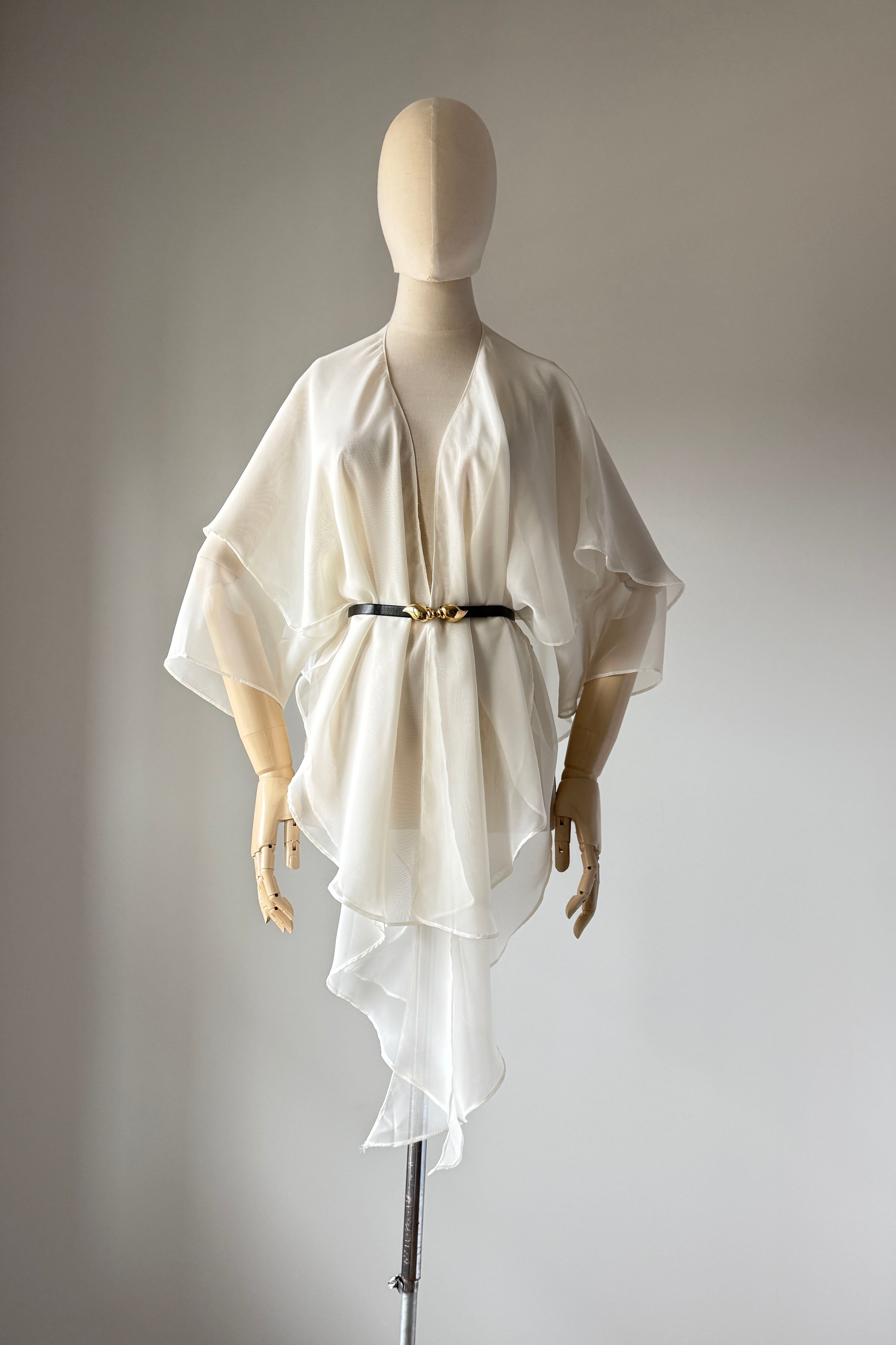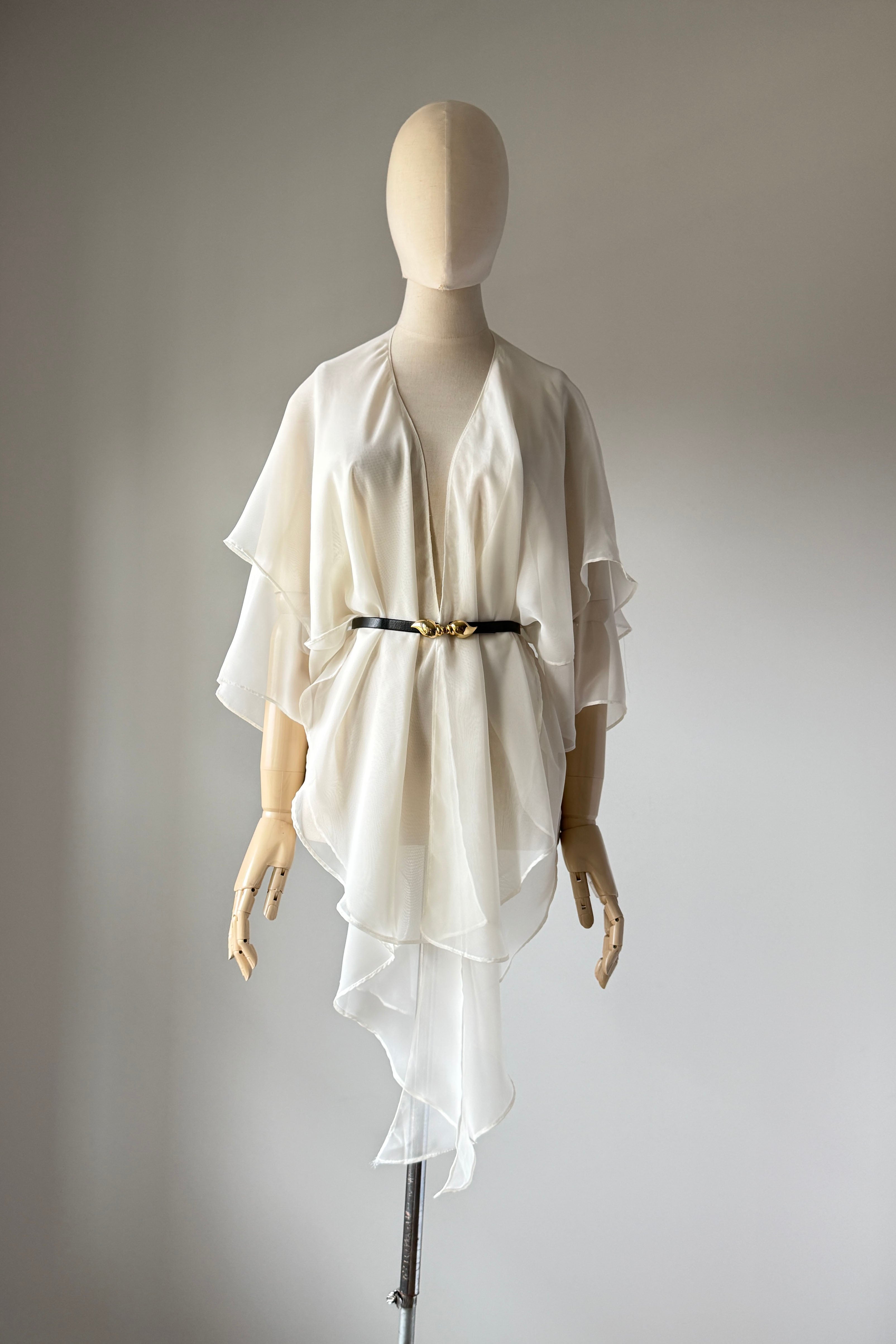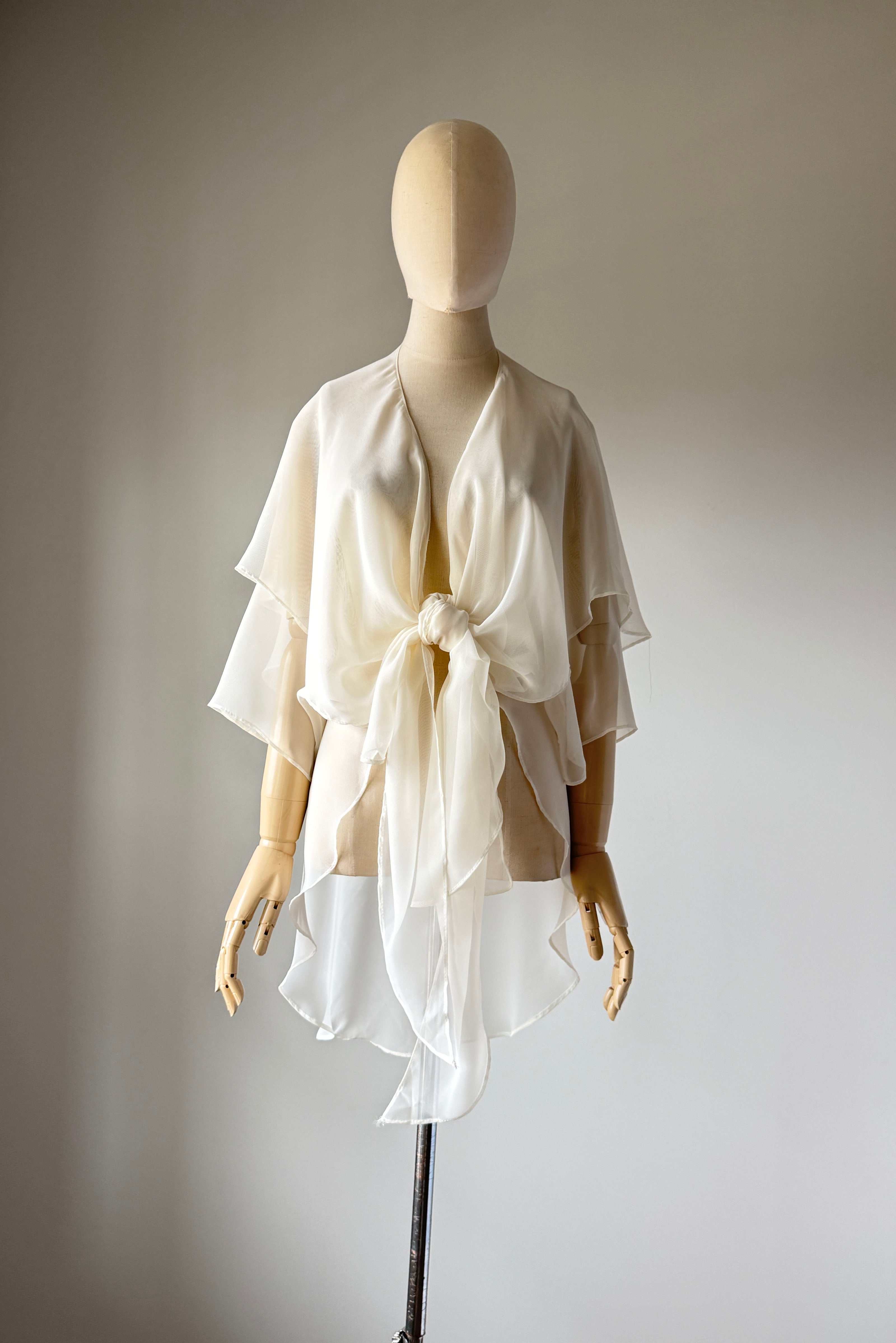 VINTAGE BLOUSEVintage 1980s sheer ivory rayon blouse by Susan Roselli for Vijack. Chiffon. Excellent condition.OSFM.Length 36As with all vintage, please expect wear consistent with age. All sales are final. No order cancellations.0707 | 2605