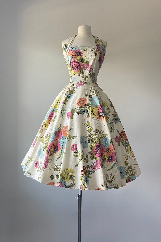 1950s Floral Rhinestone Halter Dress by Toni Todd | SMALL