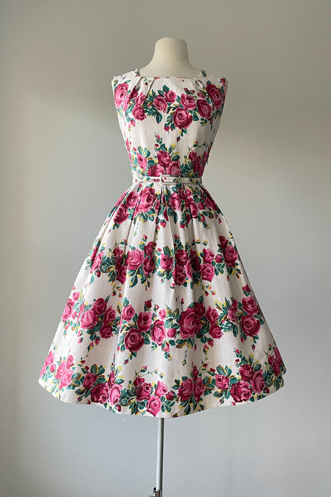 1950s Deep Pink Rose Print Barkcloth Dress | SMALL