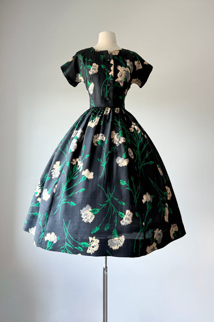 Vintage 1950s Black Silk White Carnation Print Dress | SMALL