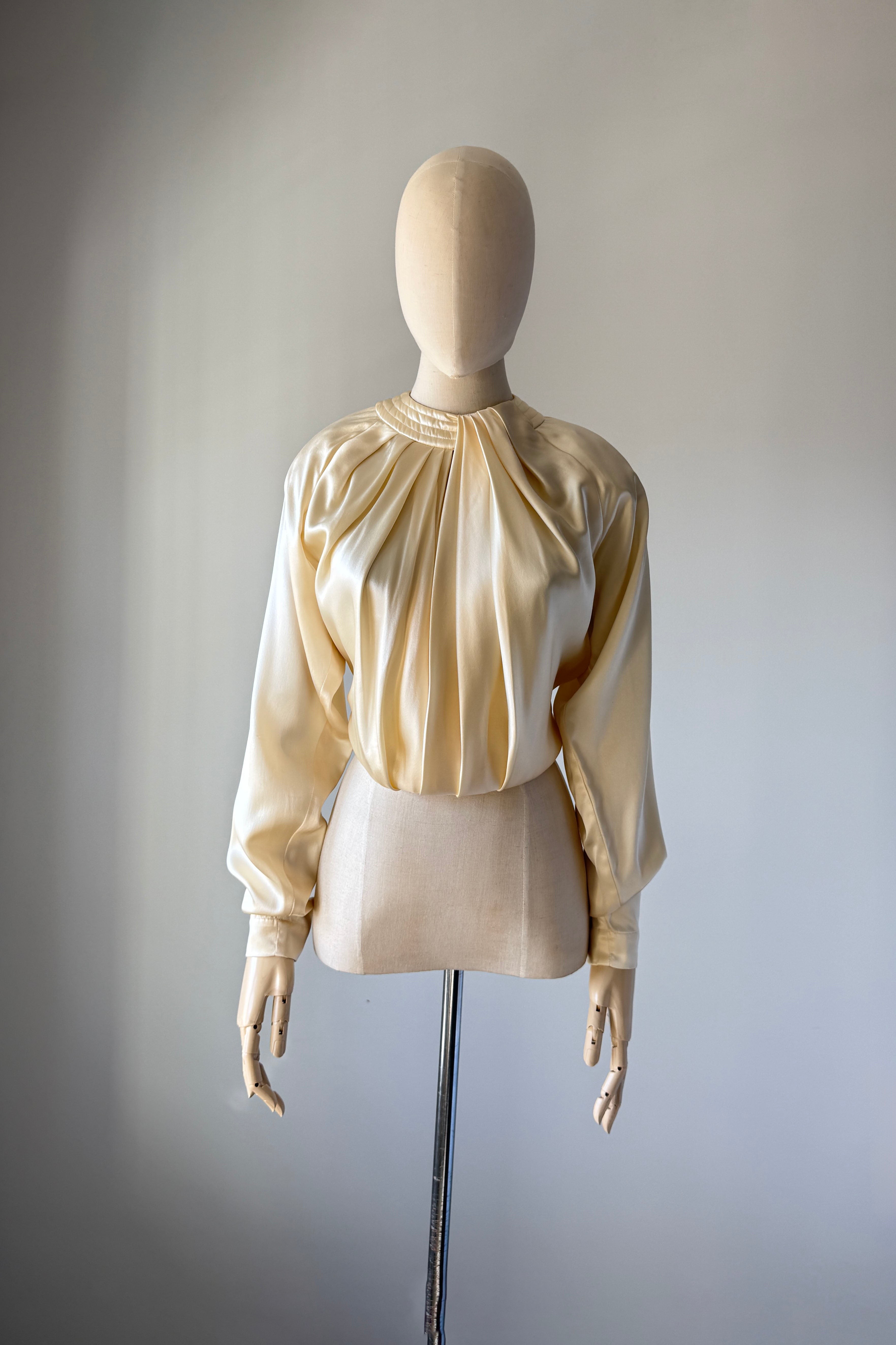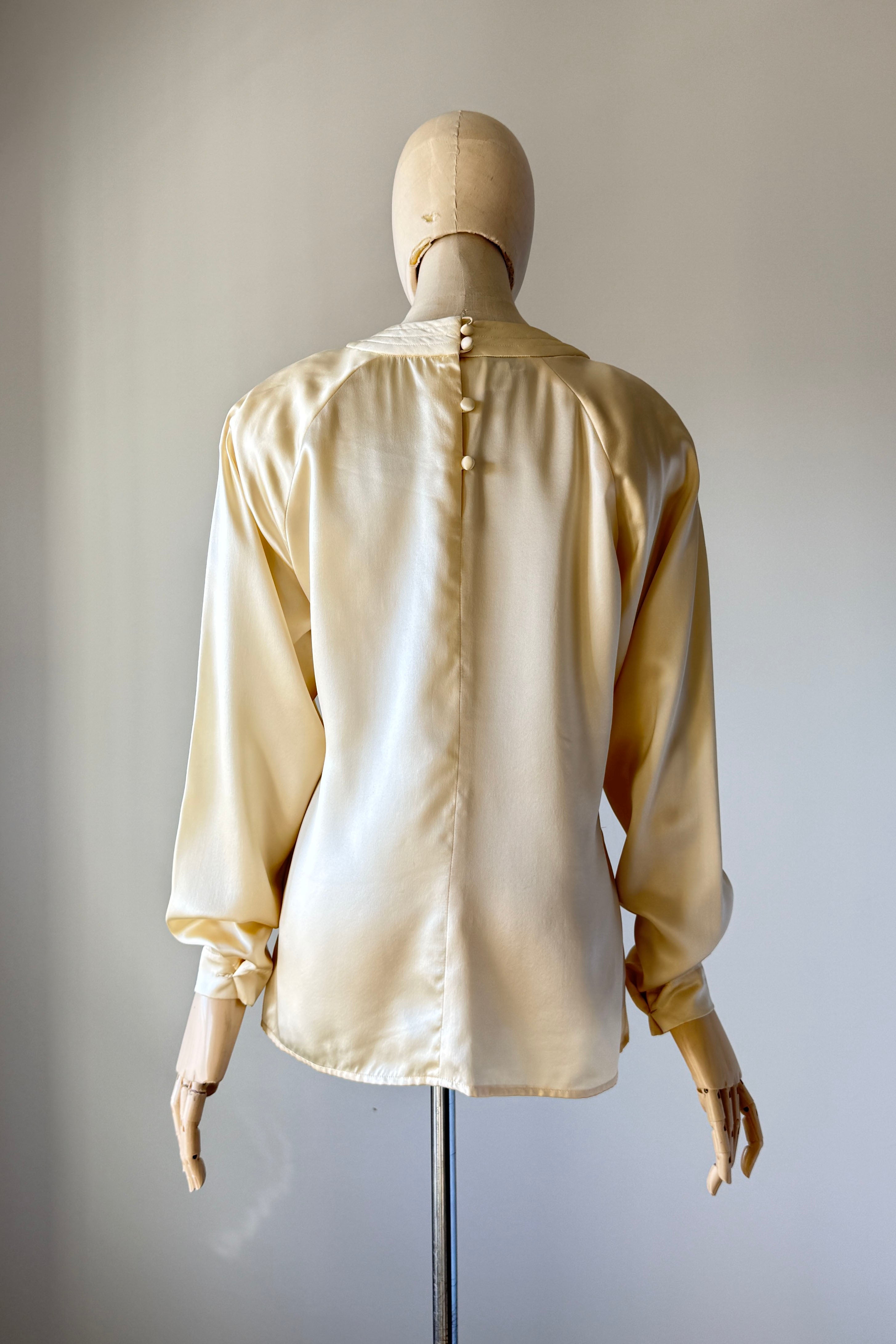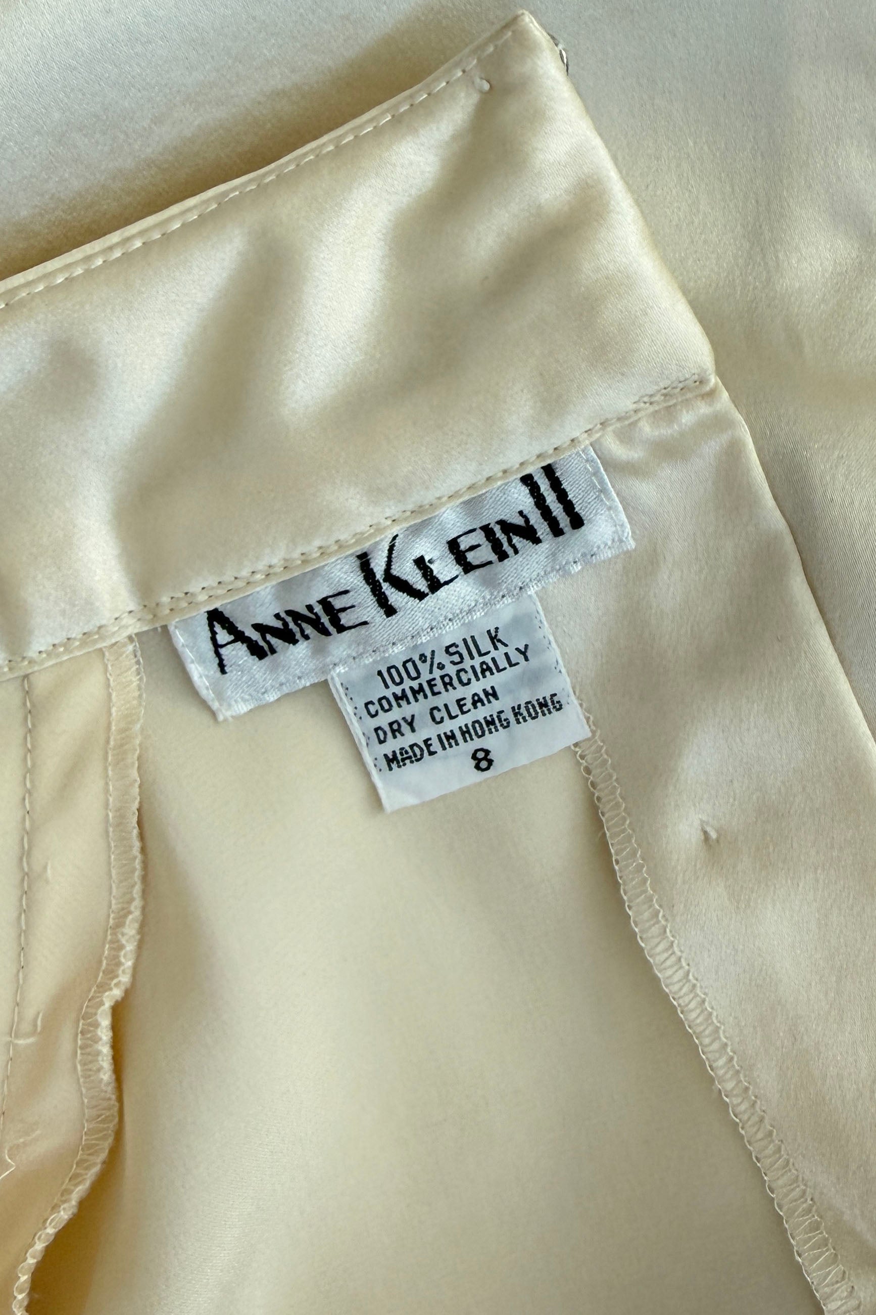 VINTAGE BLOUSEVintage candlelight ivory silk blouse by Anne Klein II. Buttons behind neck with adjustable button closure at wrists. Excellent condition.Fits like medium. Marked size "8".Length 25Bust 38As with all vintage, please expect wear consistent with age. All sales are final. No order cancellations.0813 | 2605