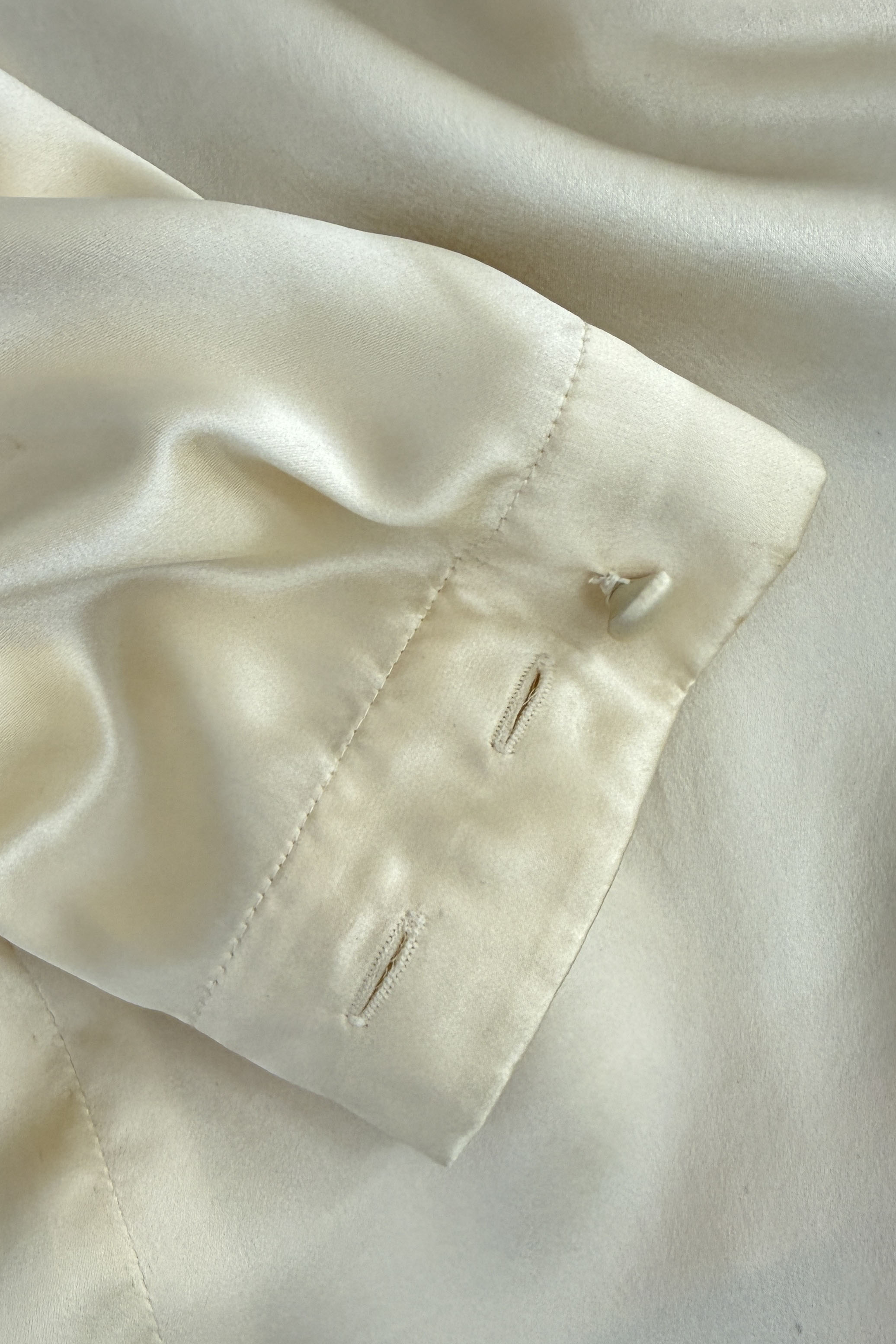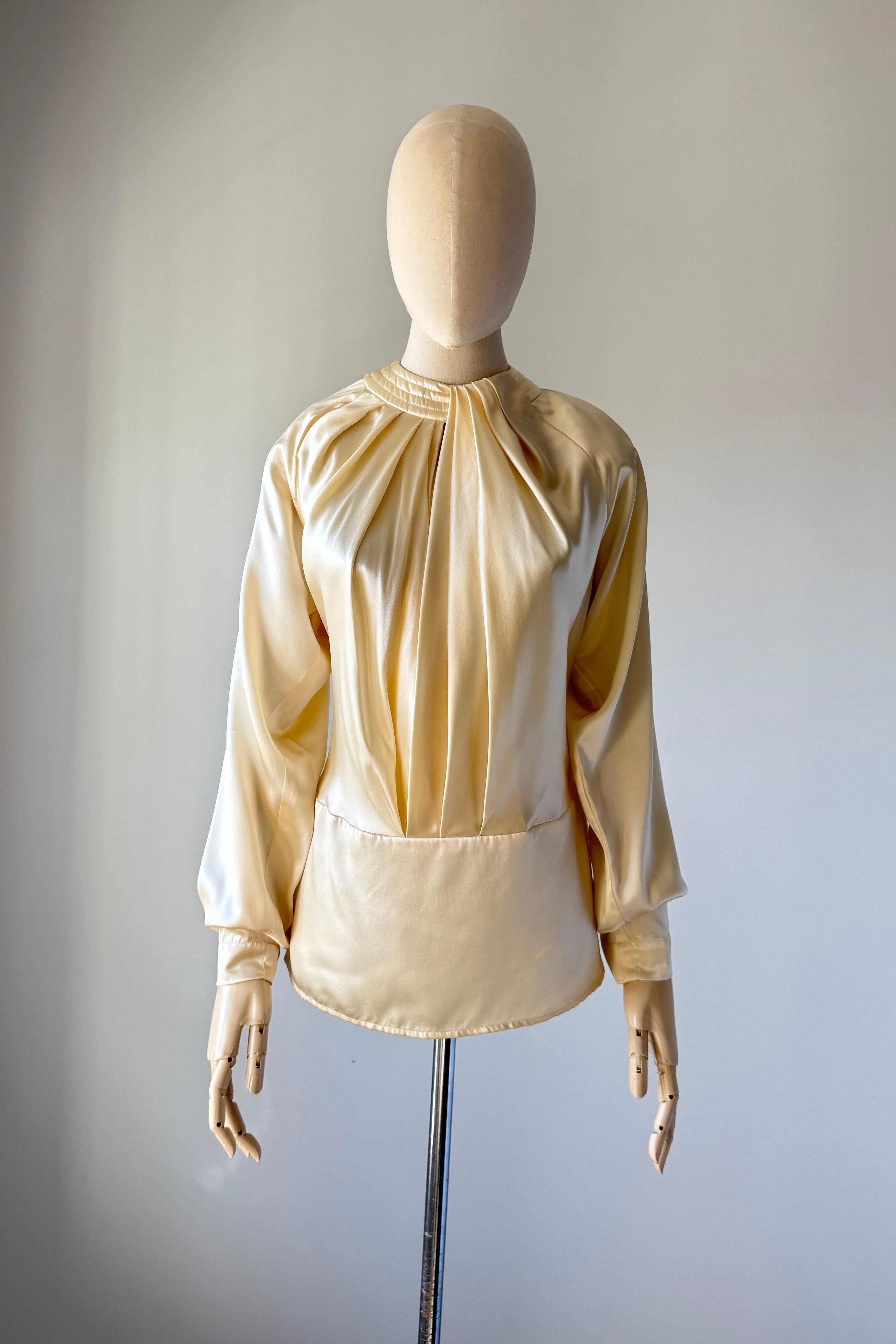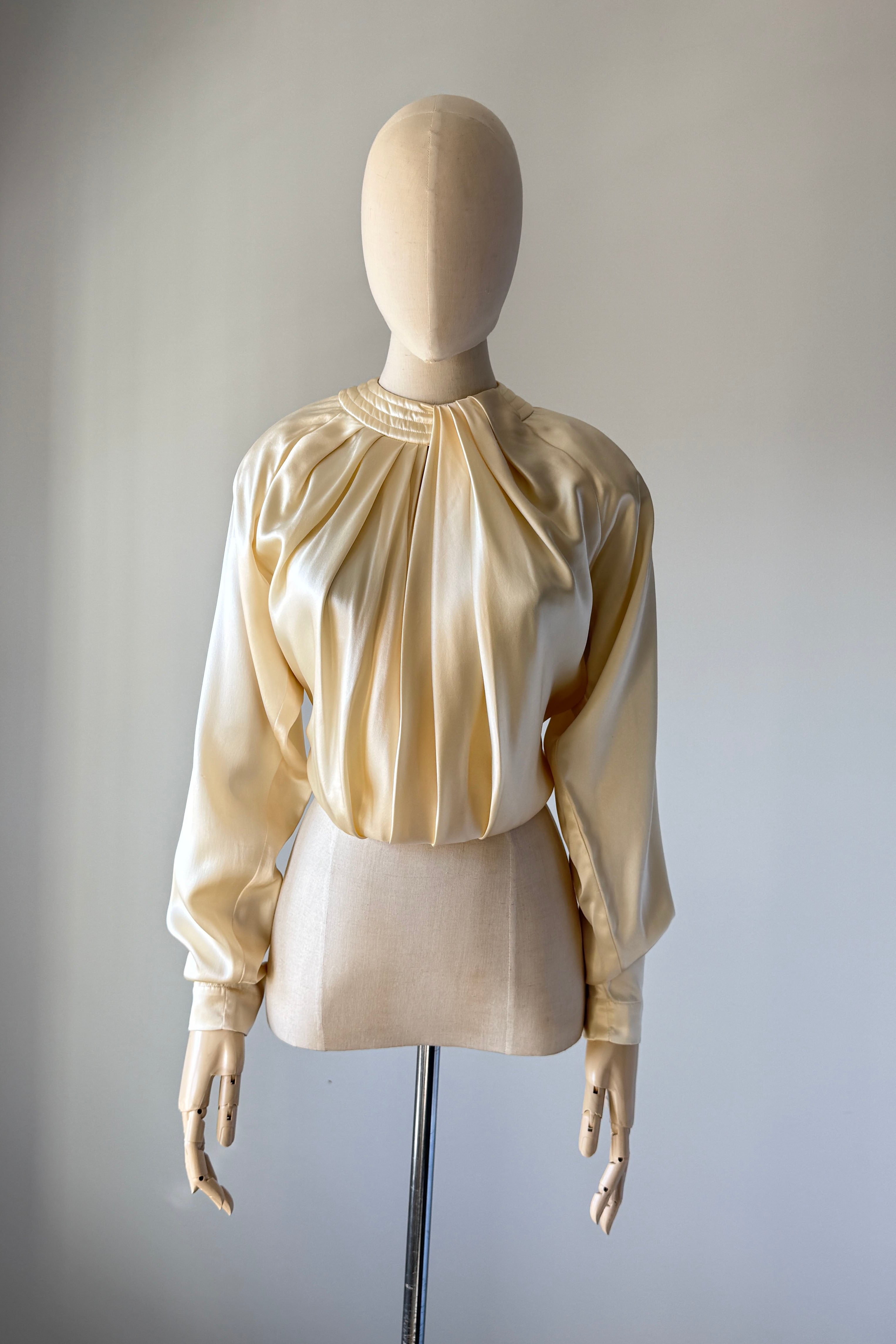 VINTAGE BLOUSEVintage candlelight ivory silk blouse by Anne Klein II. Buttons behind neck with adjustable button closure at wrists. Excellent condition.Fits like medium. Marked size "8".Length 25Bust 38As with all vintage, please expect wear consistent with age. All sales are final. No order cancellations.0813 | 2605