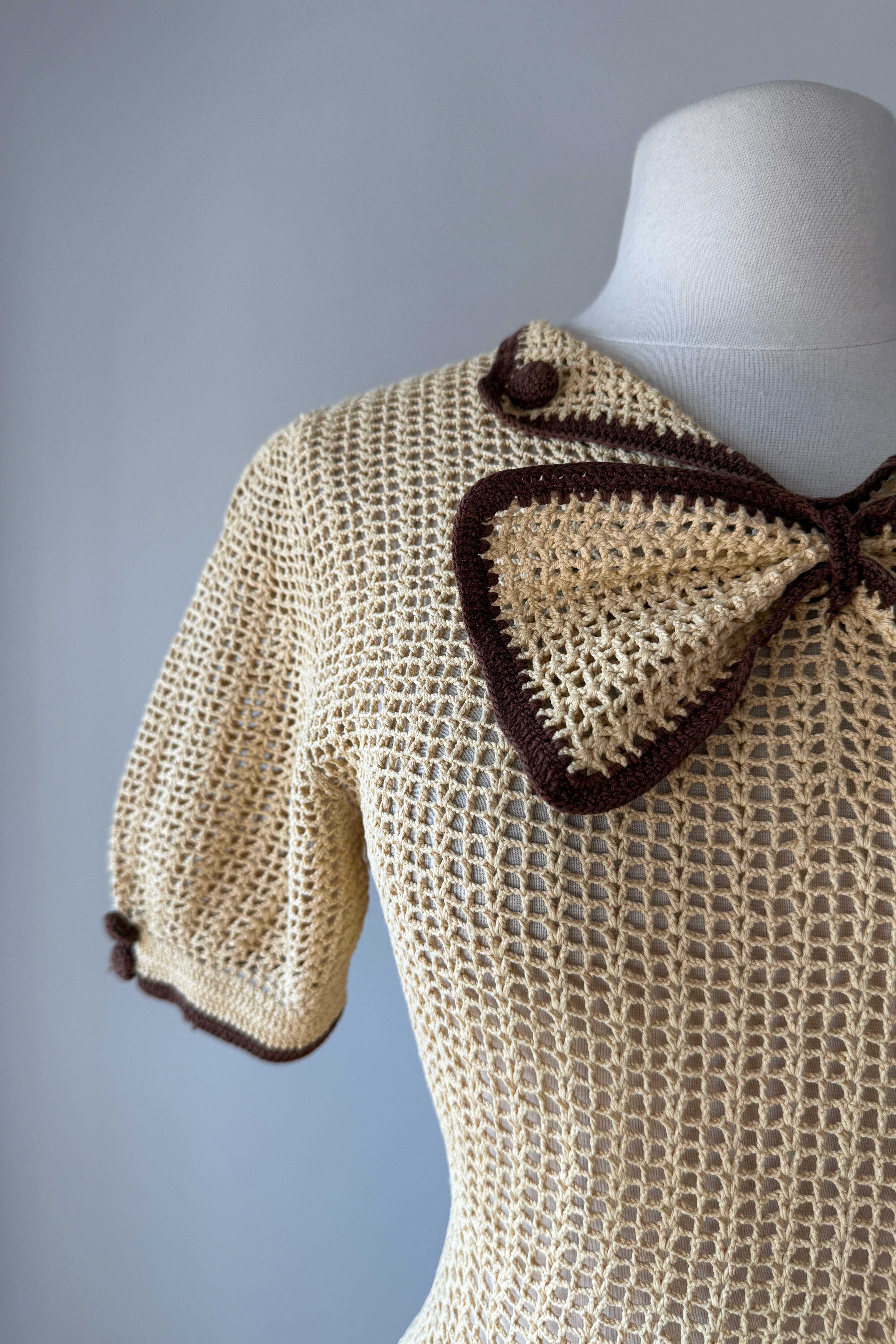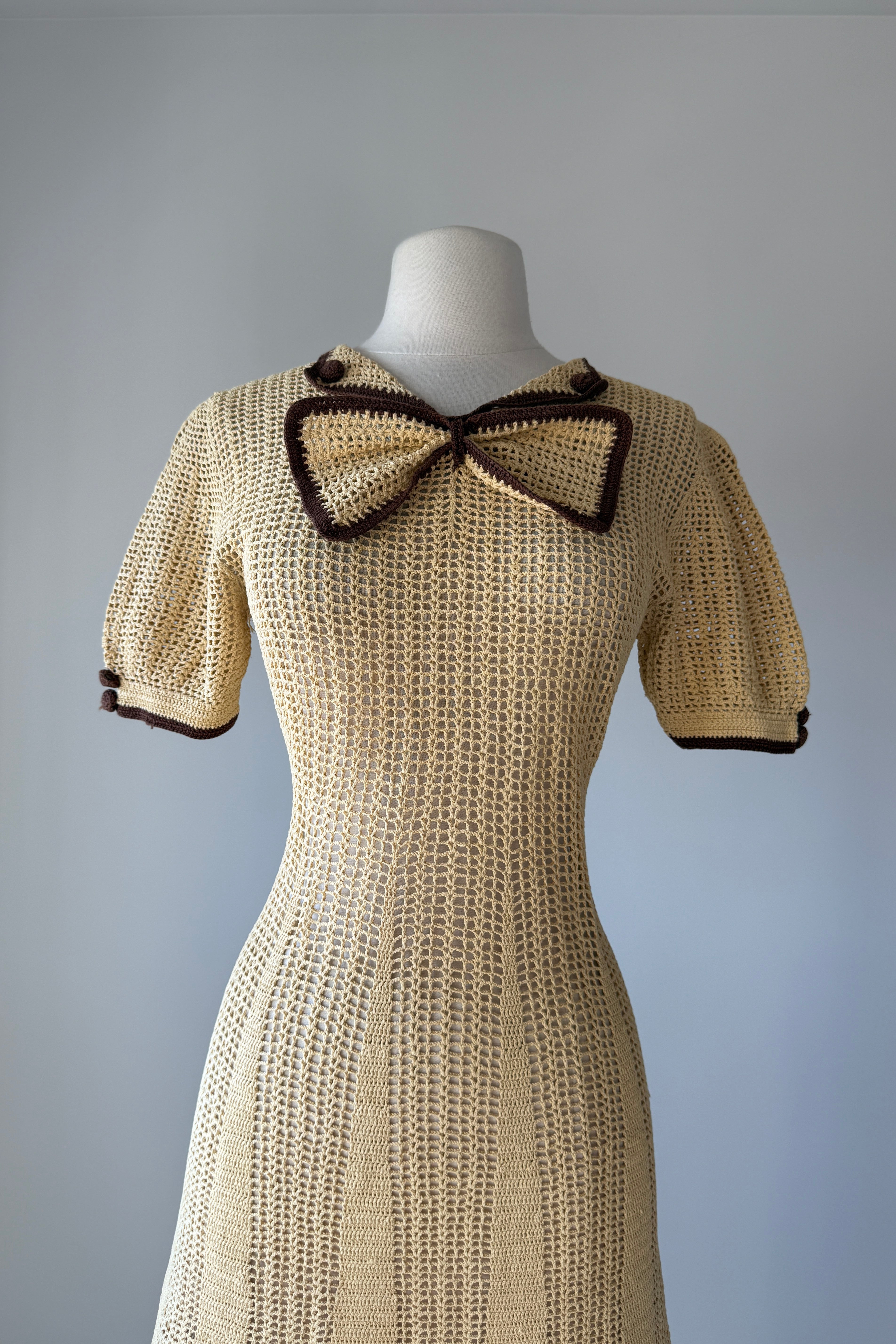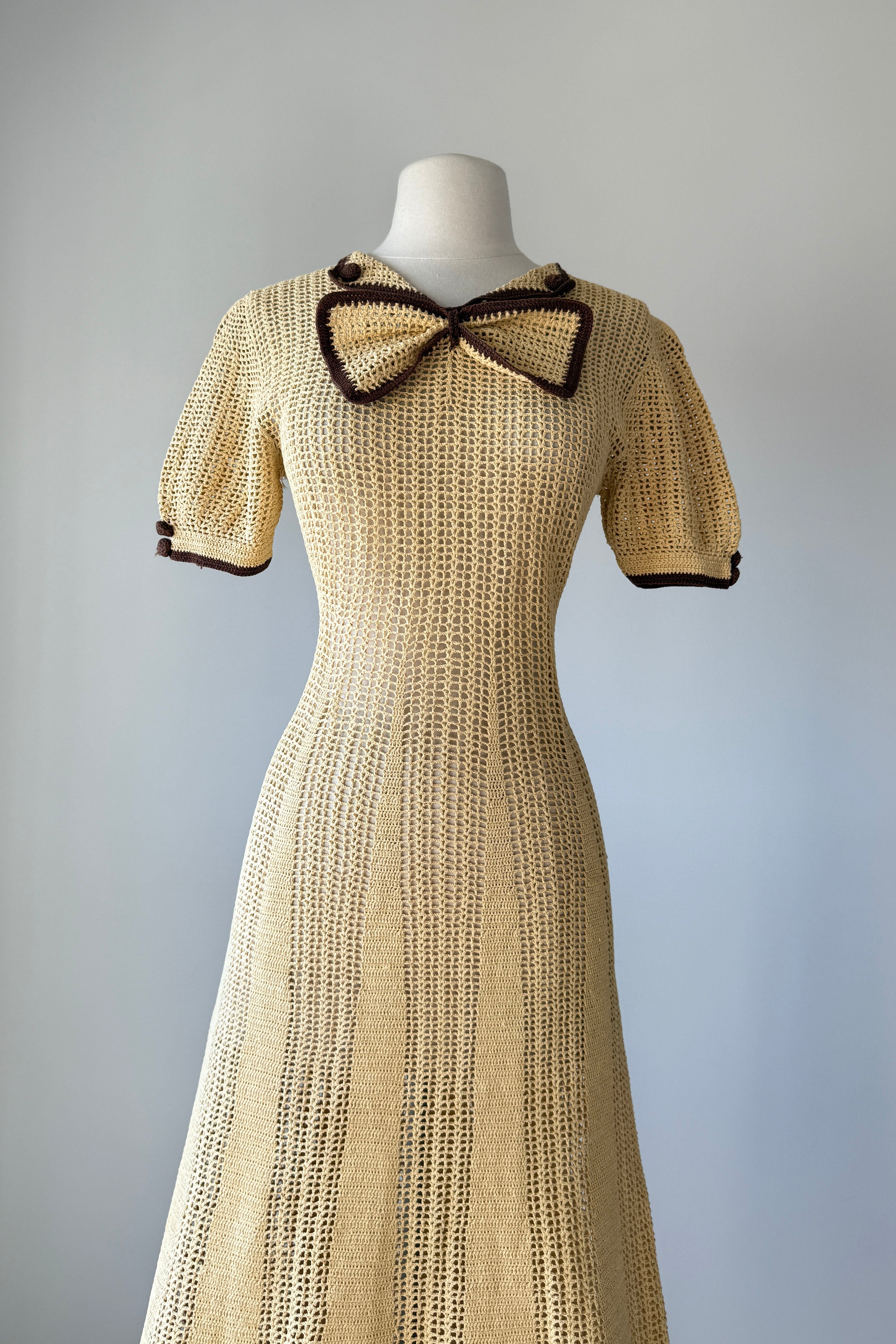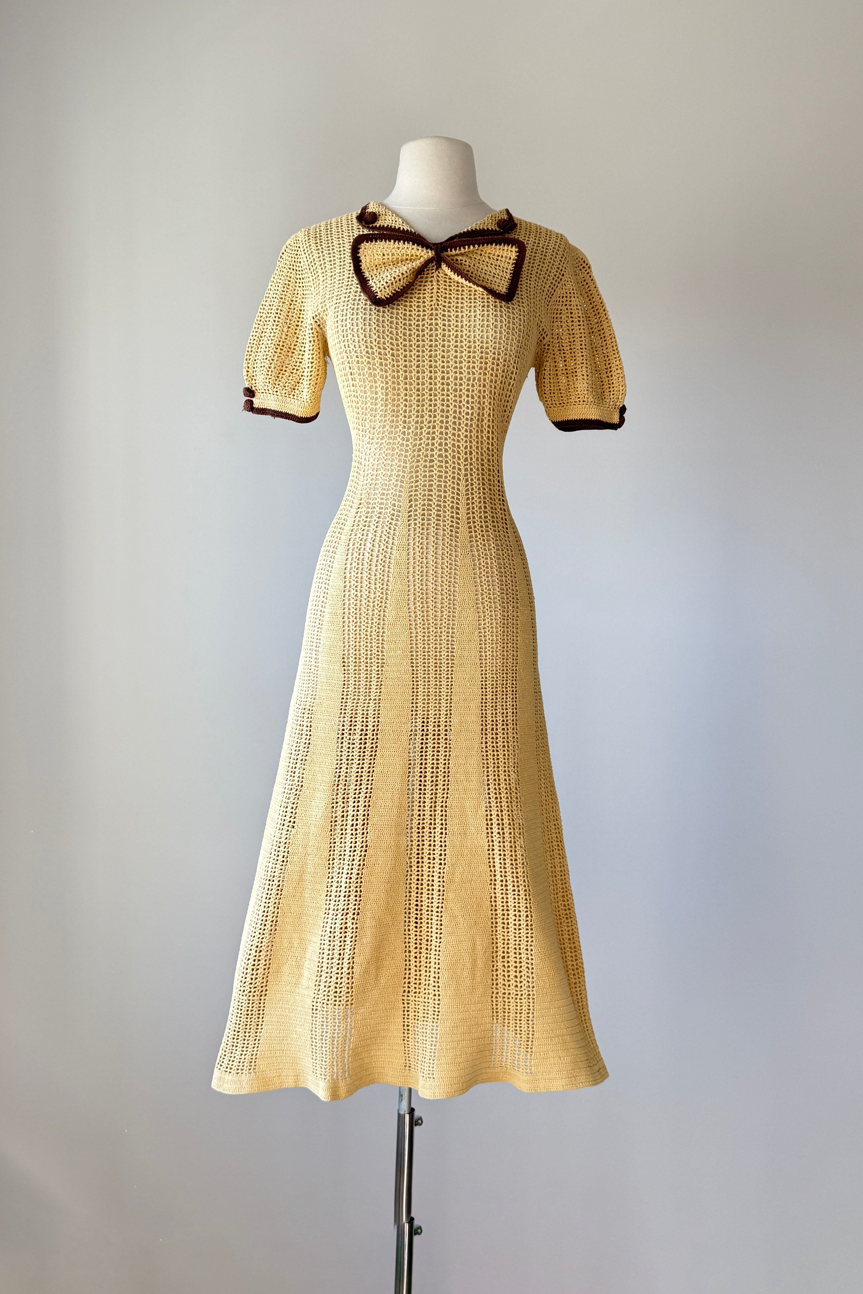 VINTAGE KNIT DRESSVintage 1930s hand knit dress. Butter yellow + chocolate brown. Buttons at sleeves, removable bow tie at neckline. No closures - pulls on. Heavy knit beautifully done.Excellent condition. Fits like xs/s.Length 47.5Bodice 16Bust up to 38Waist 27-30Hips up to 36As with all vintage, please expect wear consistent with age. All sales are final. No order cancellations.0426 | 2603