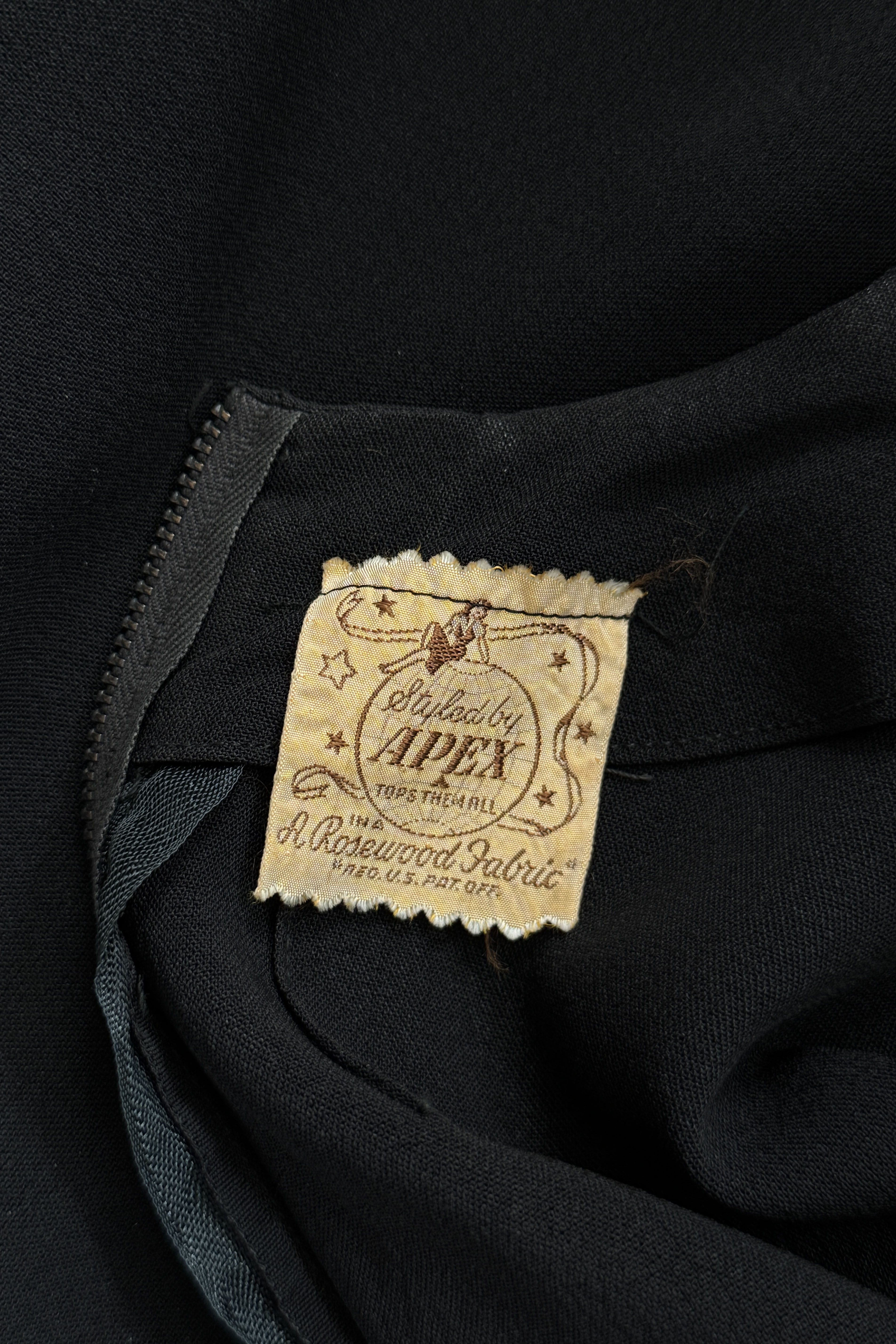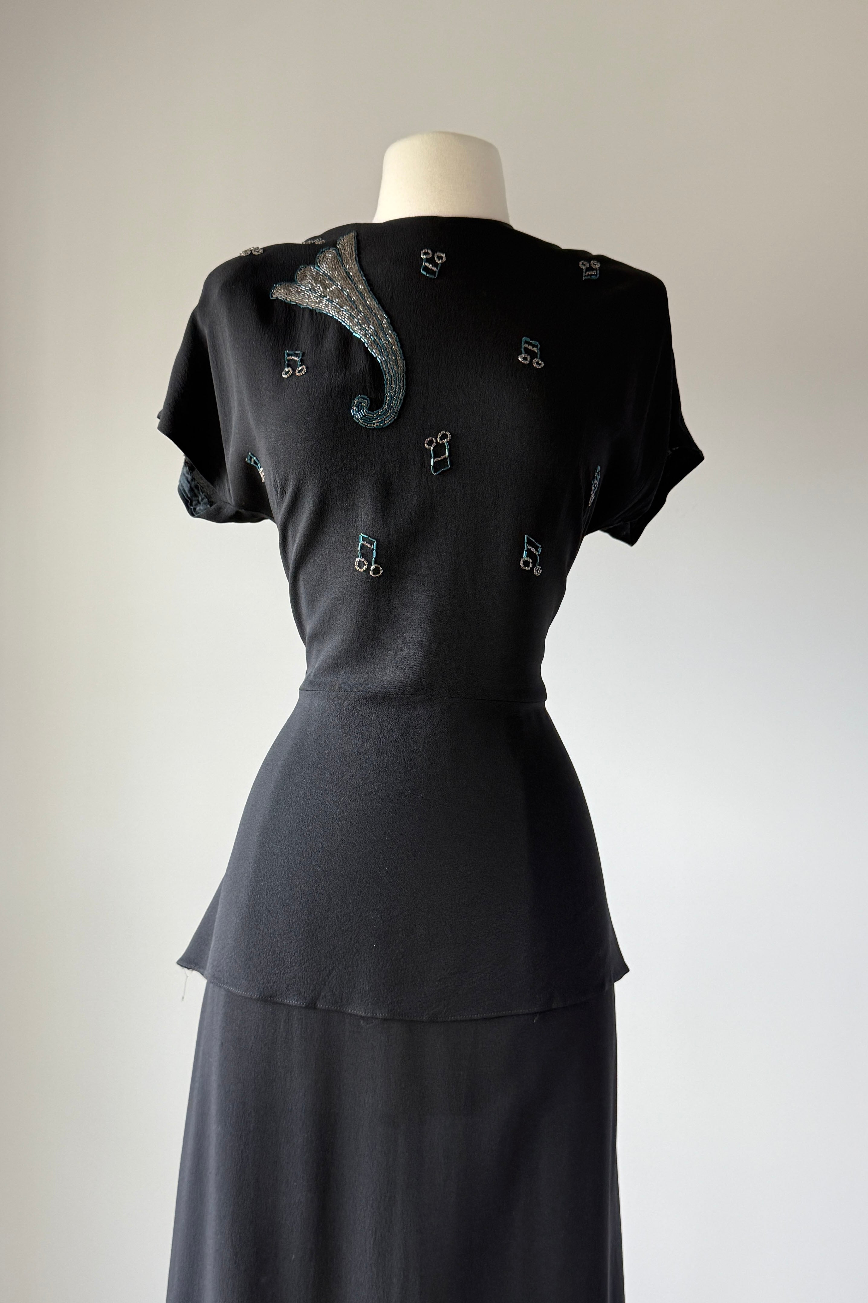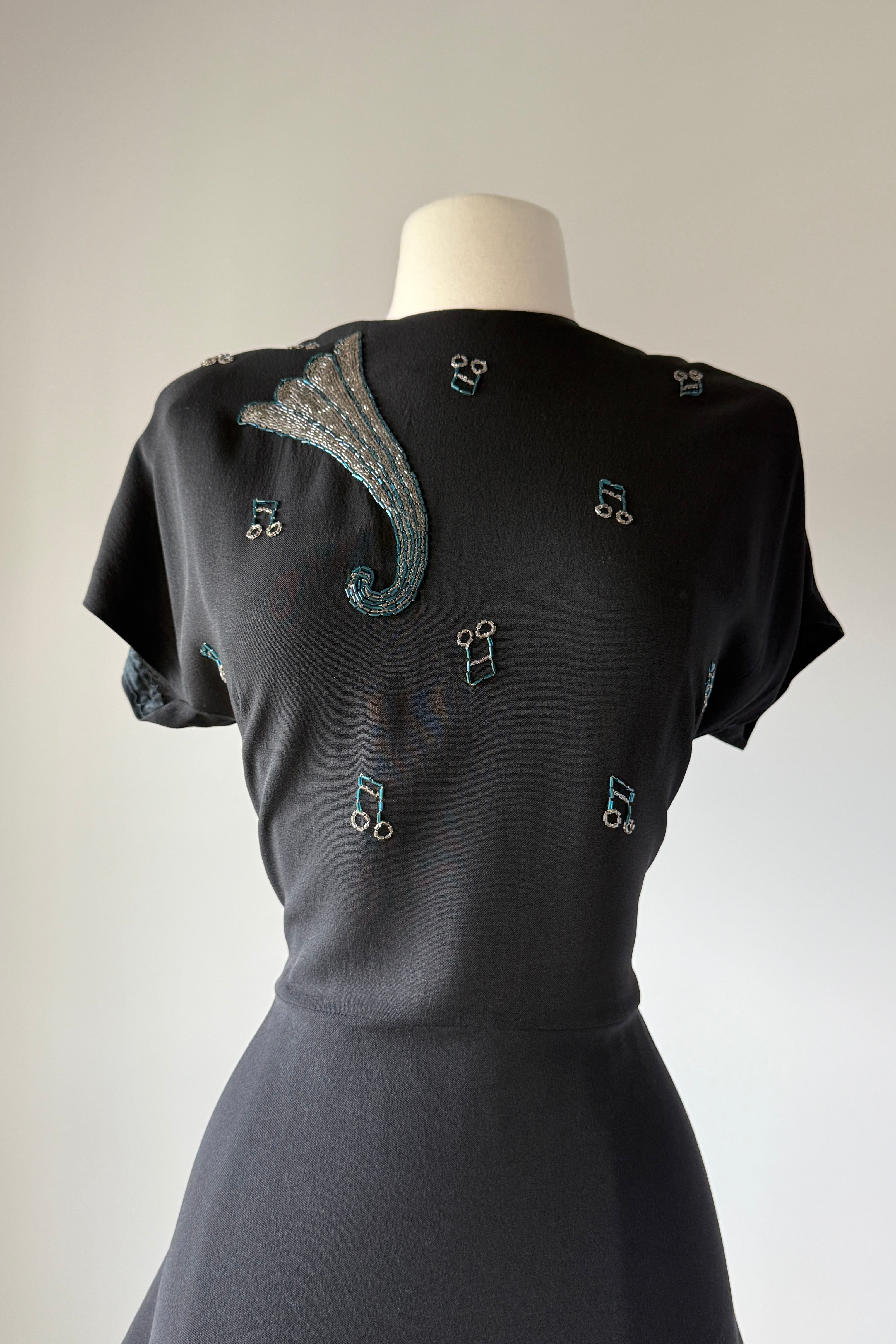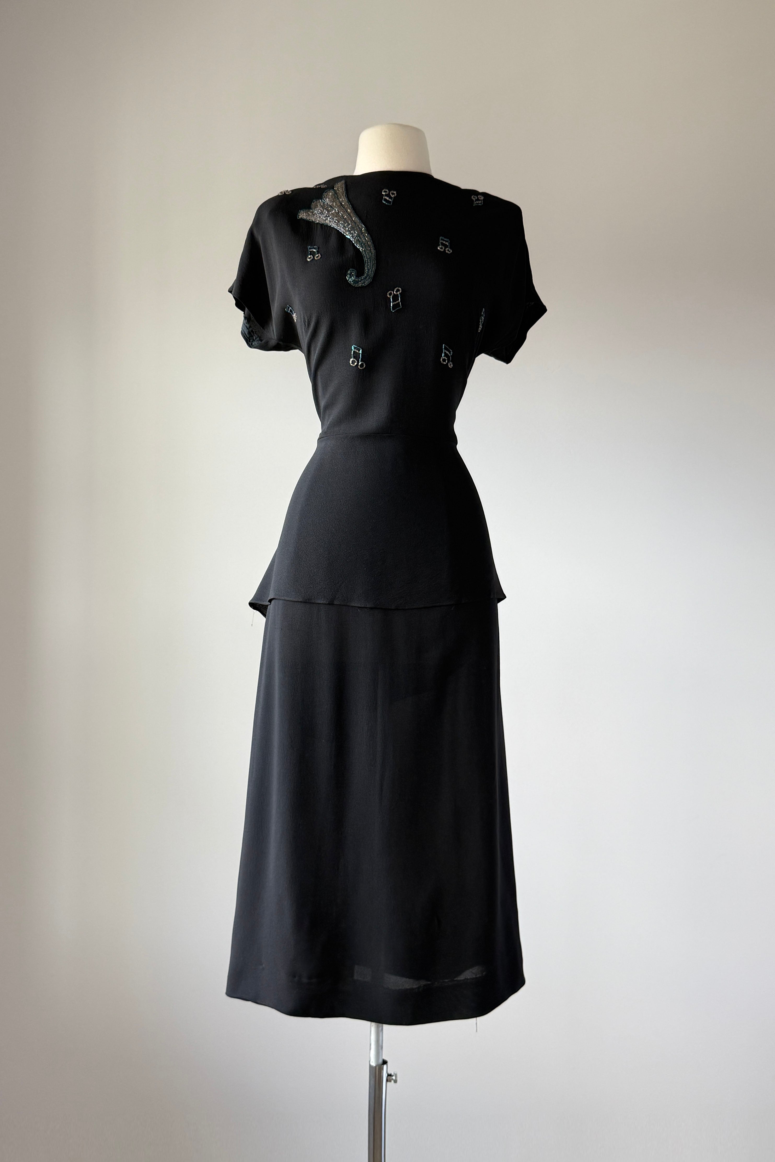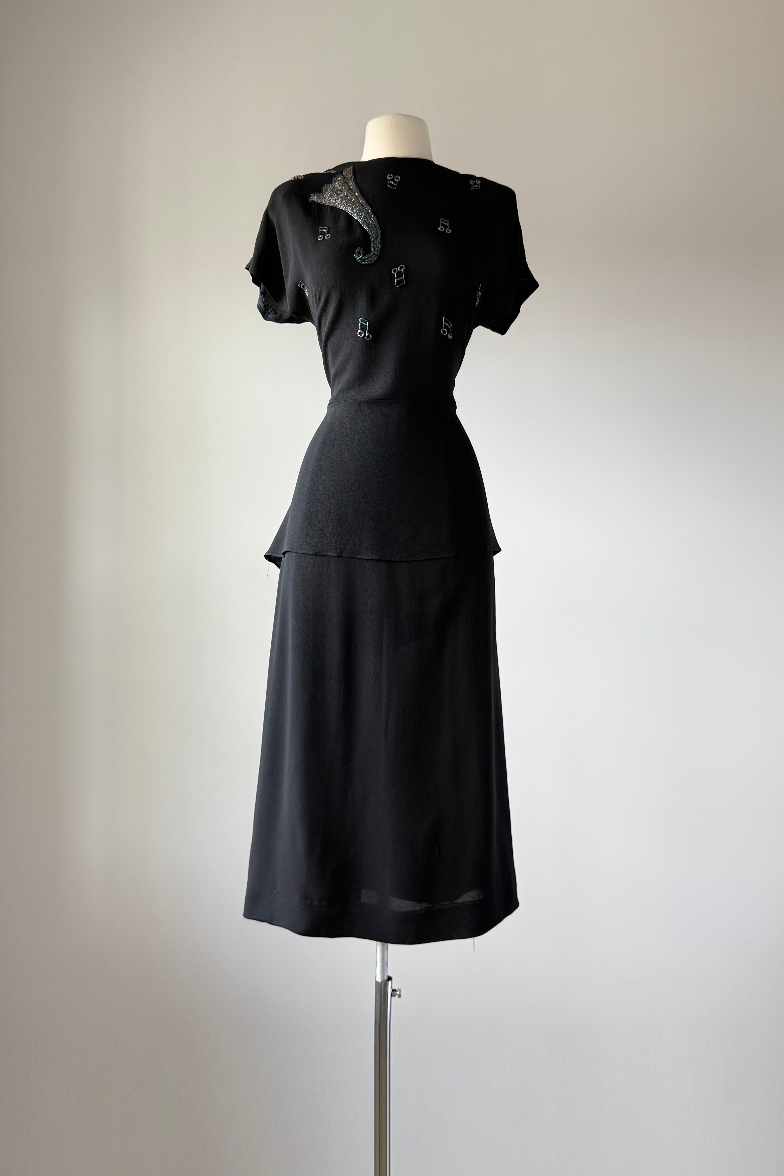 VINTAGE DRESS BY APEX1940s black rayon crepe dress with beaded music notes theme on bodice. Peplum skirt, metal back zipper. By Apex.One tiny pull at back left peplum otherwise - excellent condition. Fits like LARGELength 50Bodice 18Bust 40Waist 30Hip 42As with all vintage, please expect wear consistent with age. All sales are final. No order cancellations.0722 | 2548