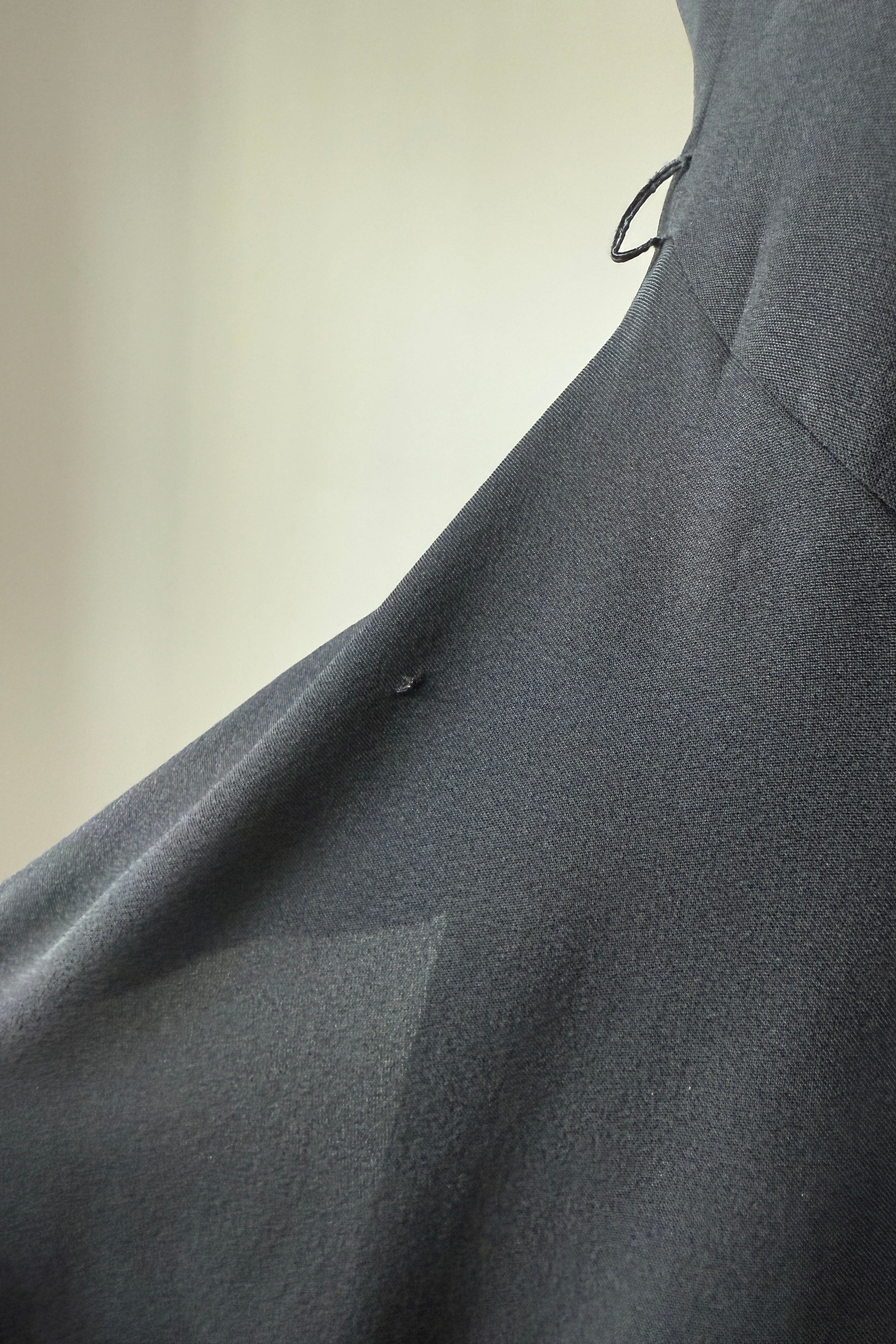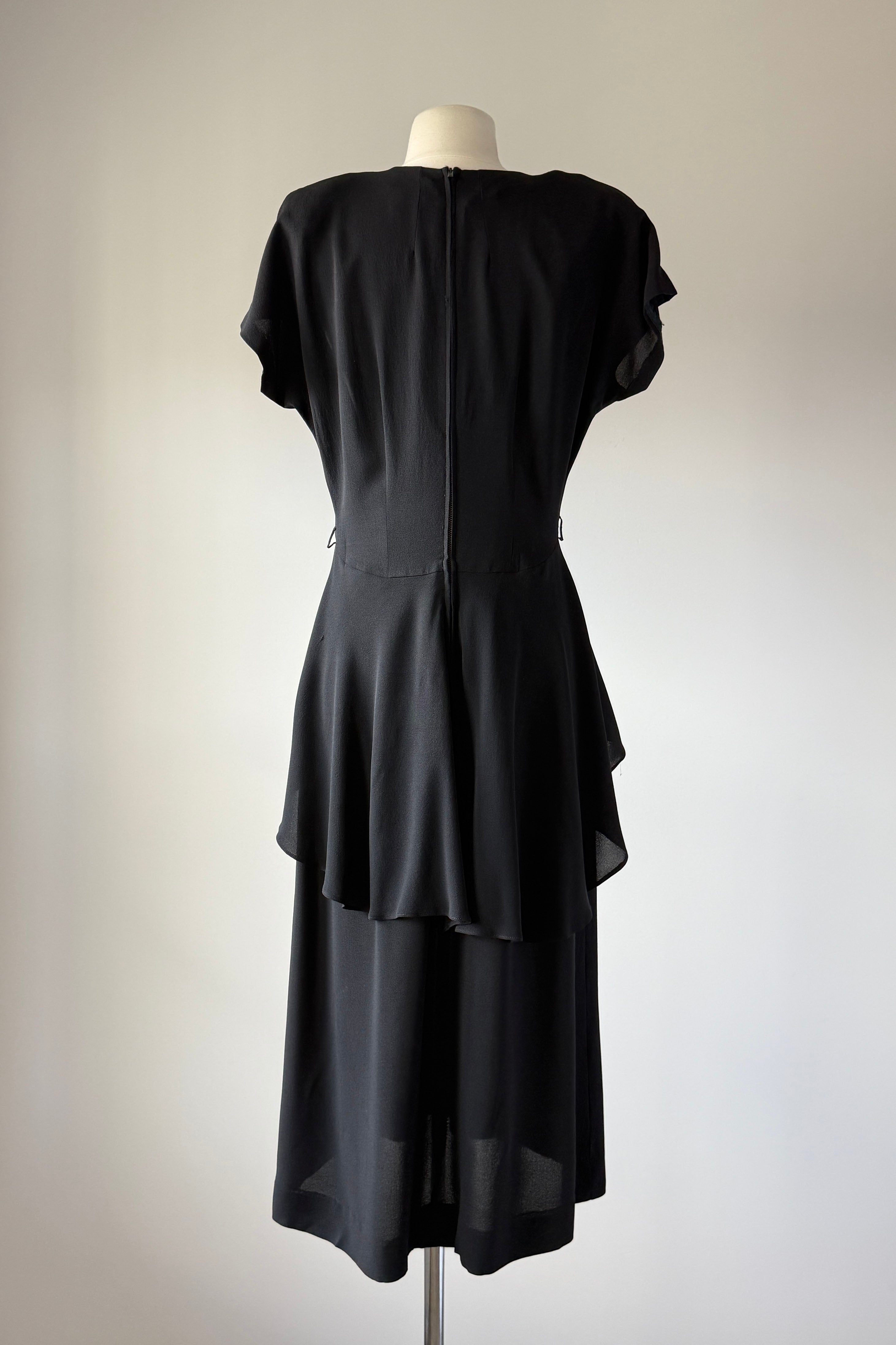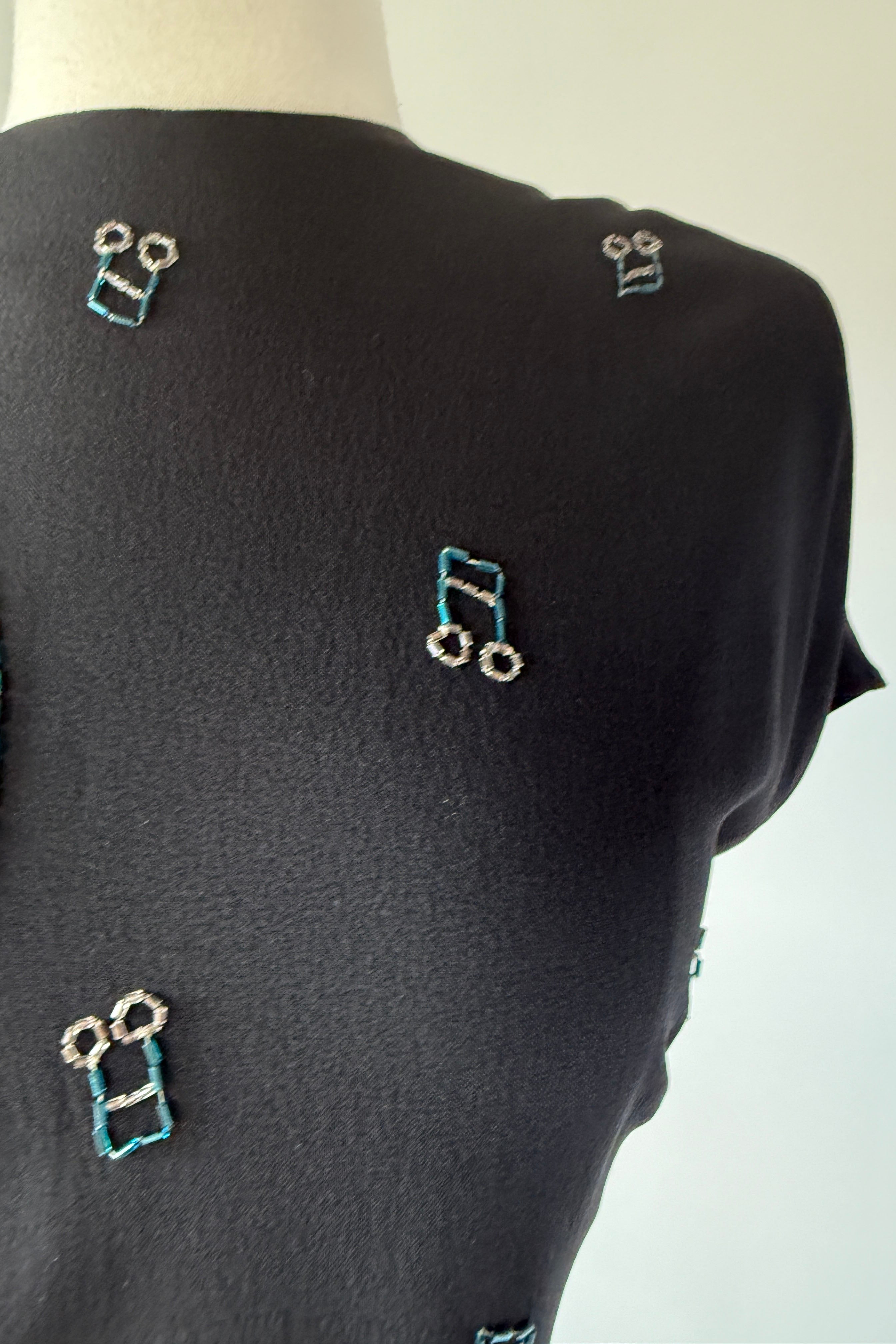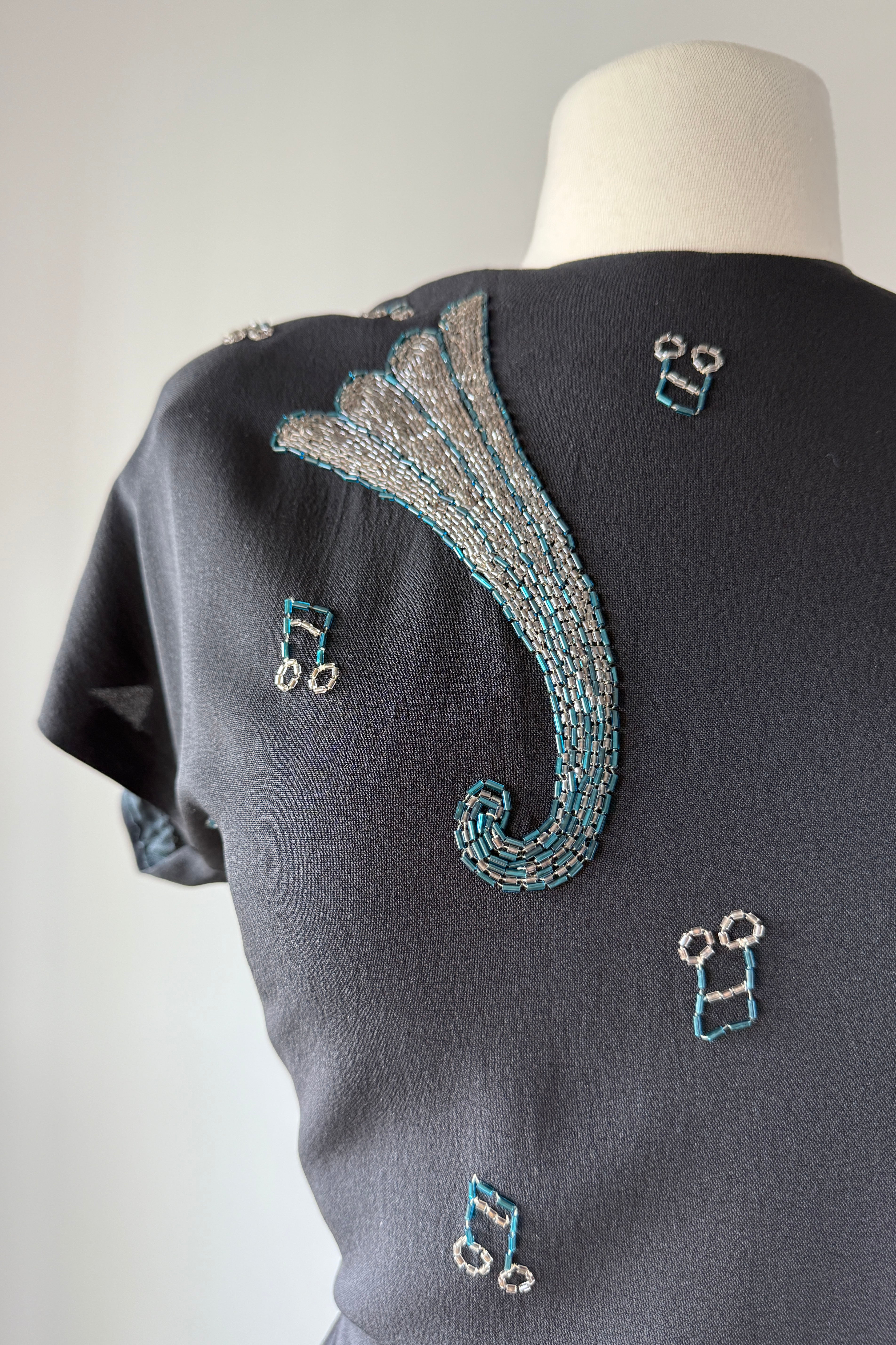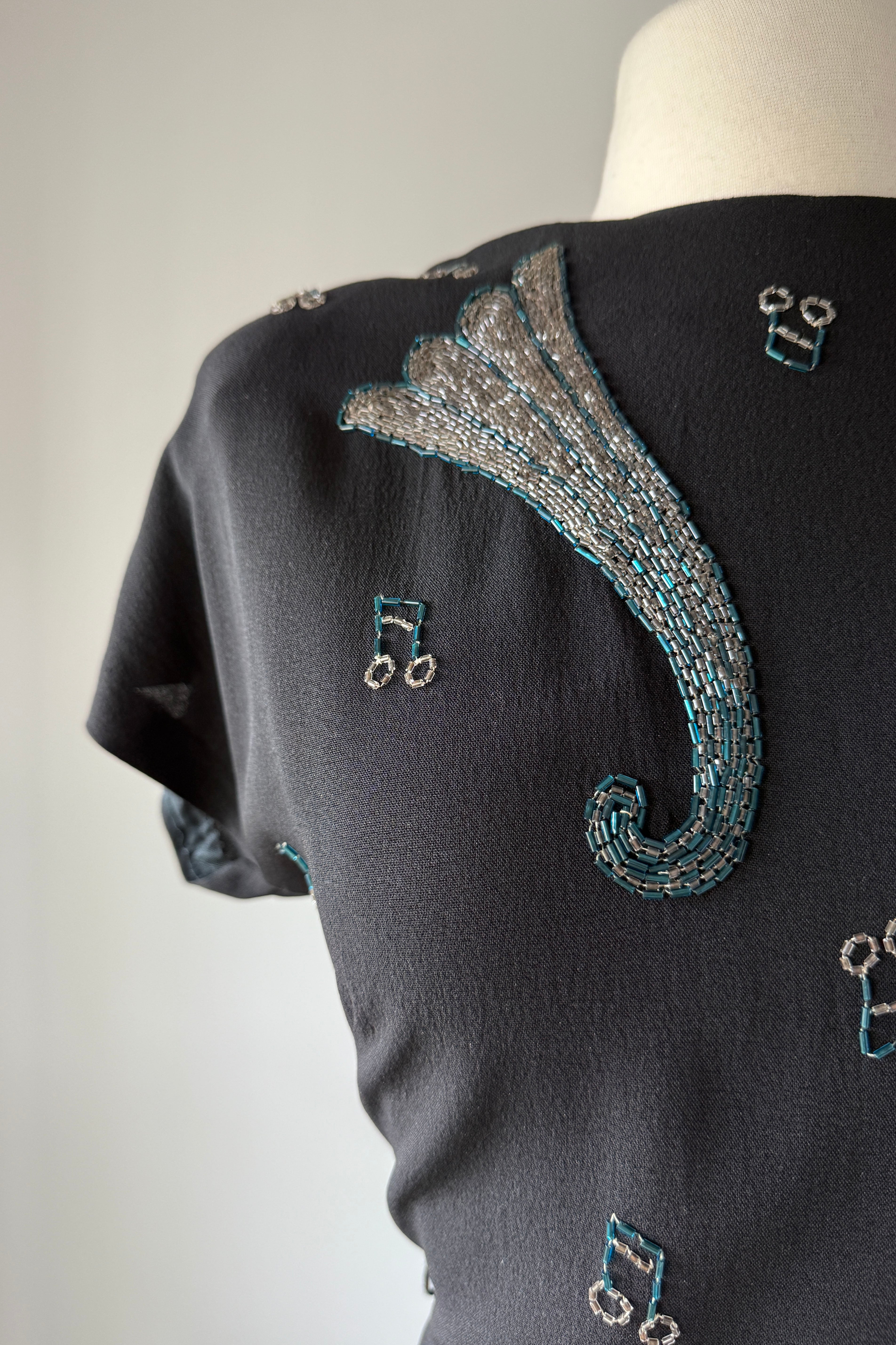 VINTAGE DRESS BY APEX1940s black rayon crepe dress with beaded music notes theme on bodice. Peplum skirt, metal back zipper. By Apex.One tiny pull at back left peplum otherwise - excellent condition. Fits like LARGELength 50Bodice 18Bust 40Waist 30Hip 42As with all vintage, please expect wear consistent with age. All sales are final. No order cancellations.0722 | 2548