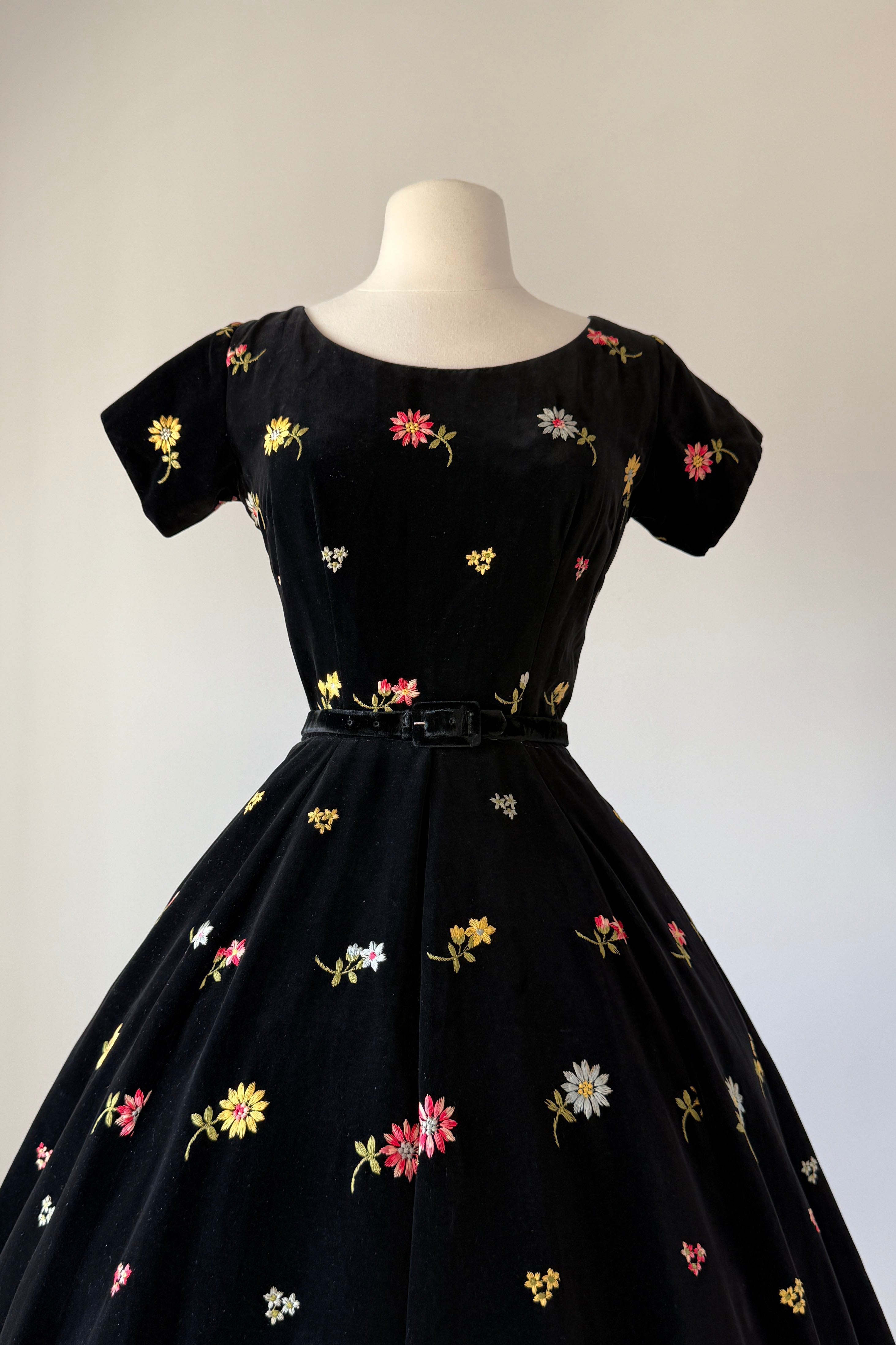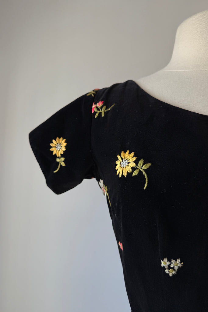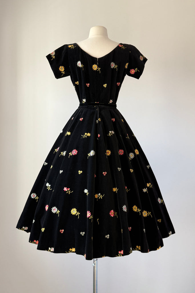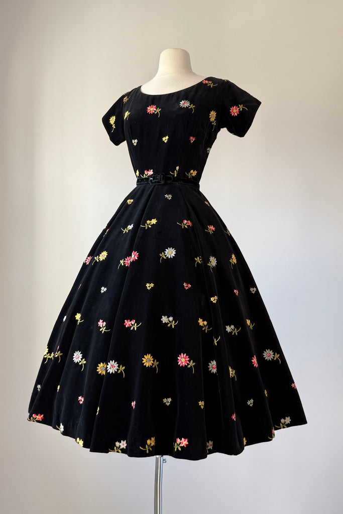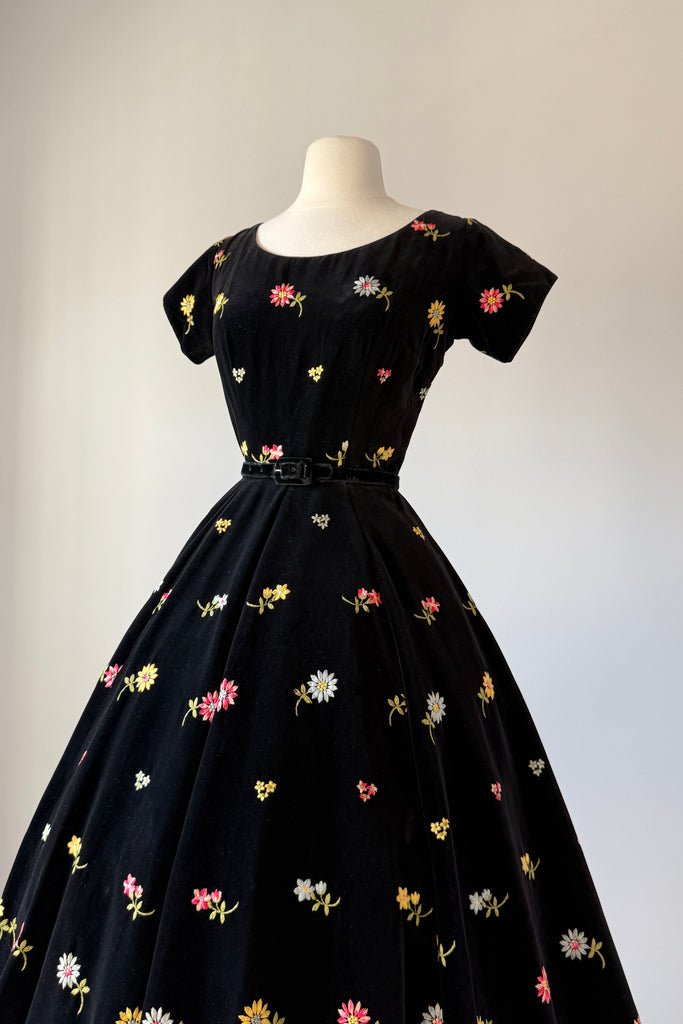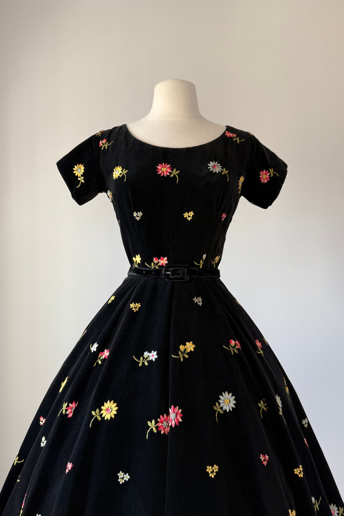 Vintage 1950s black cotton velvet, colorful floral embroidery, skirt pockets. Original matching belt. By Anne Fogarty.