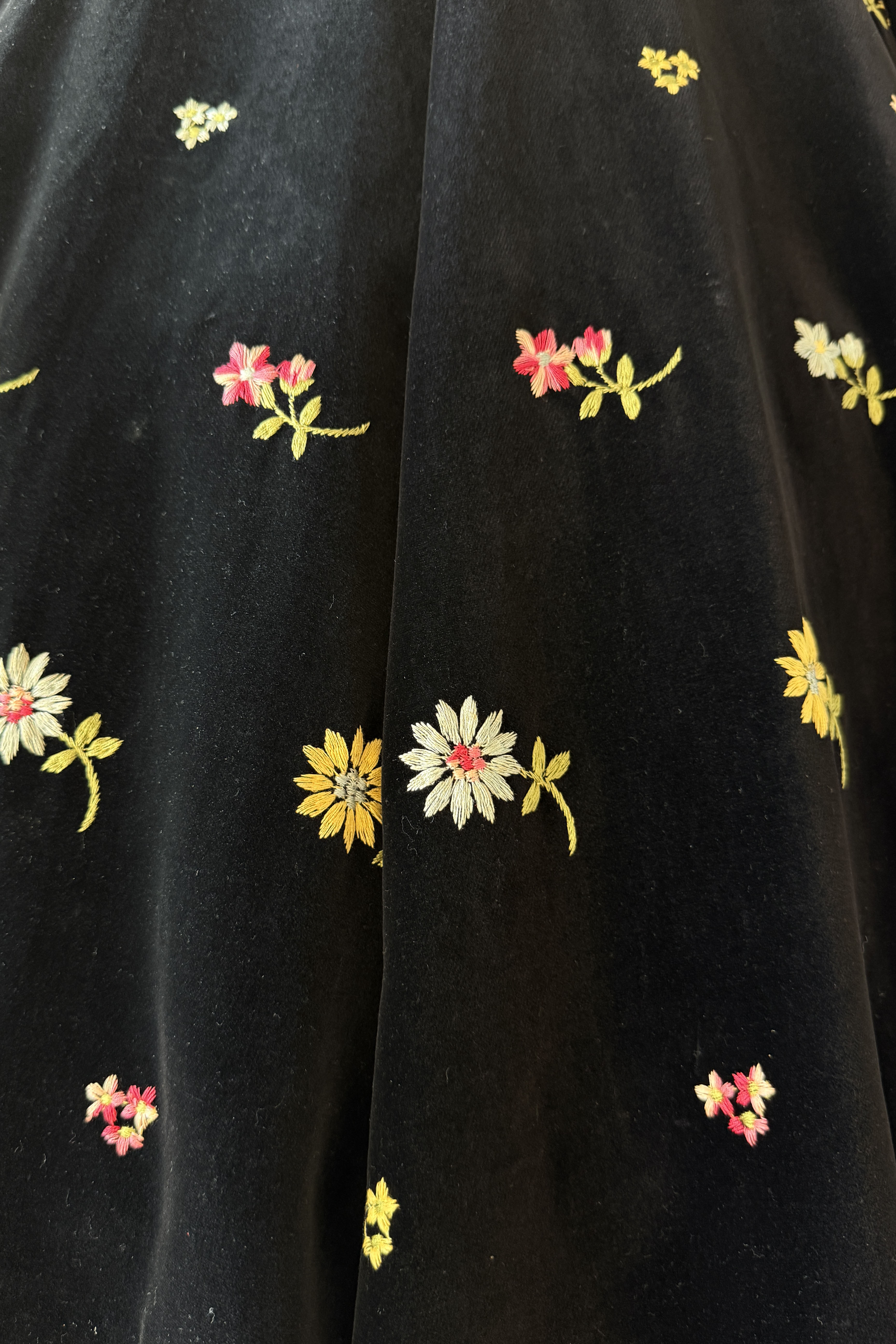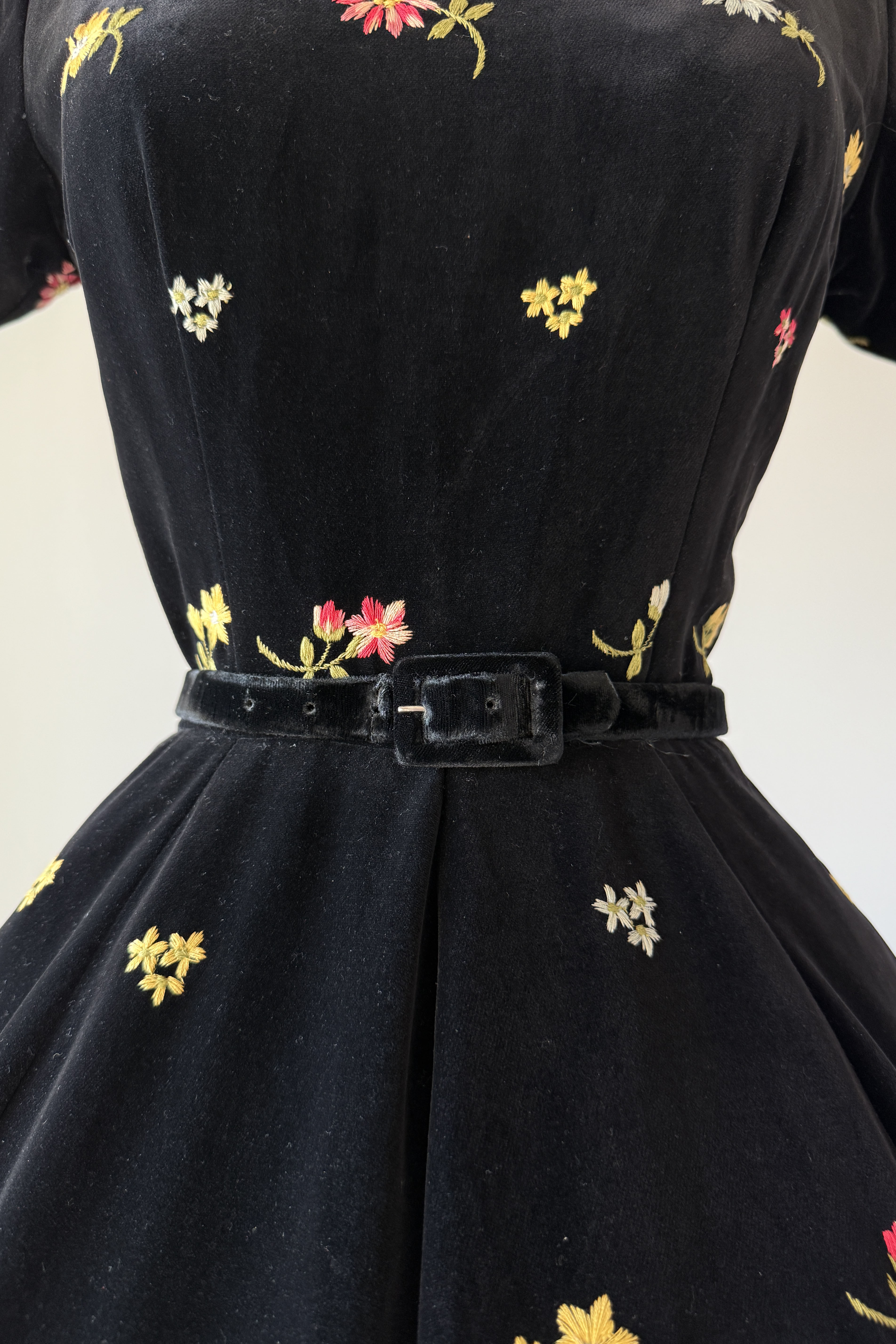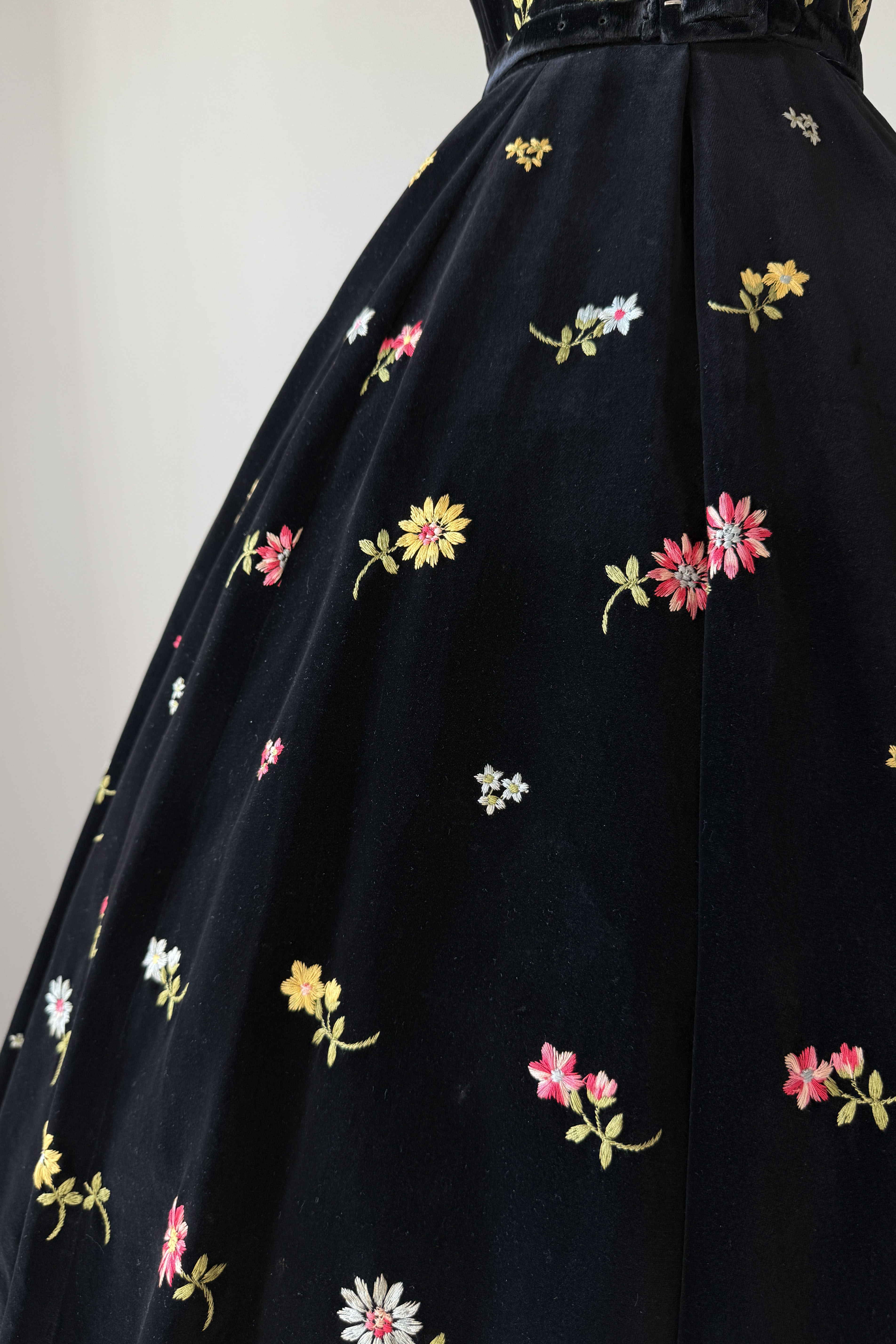 Vintage 1950s black cotton velvet, colorful floral embroidery, skirt pockets. Original matching belt. By Anne Fogarty.