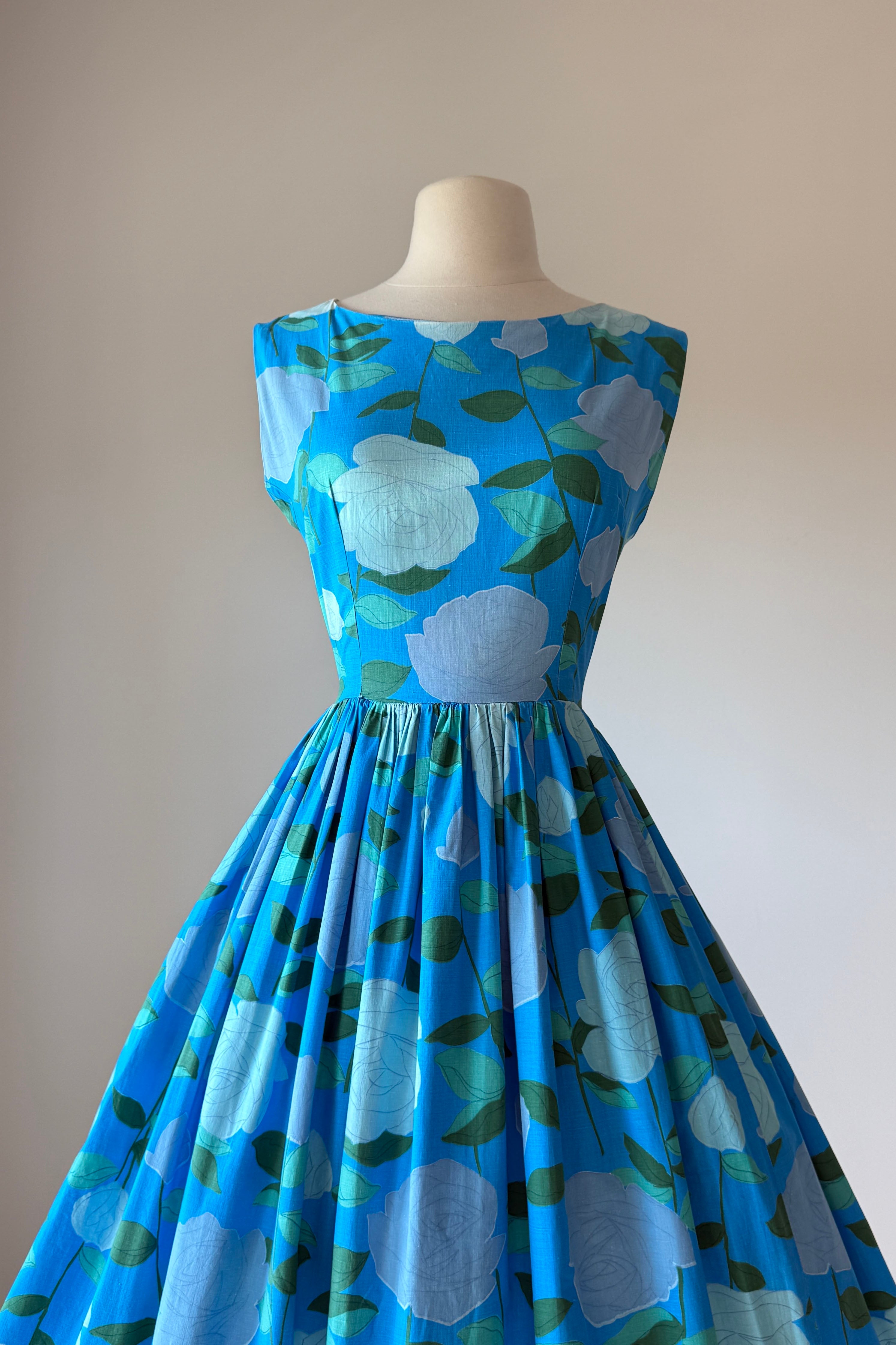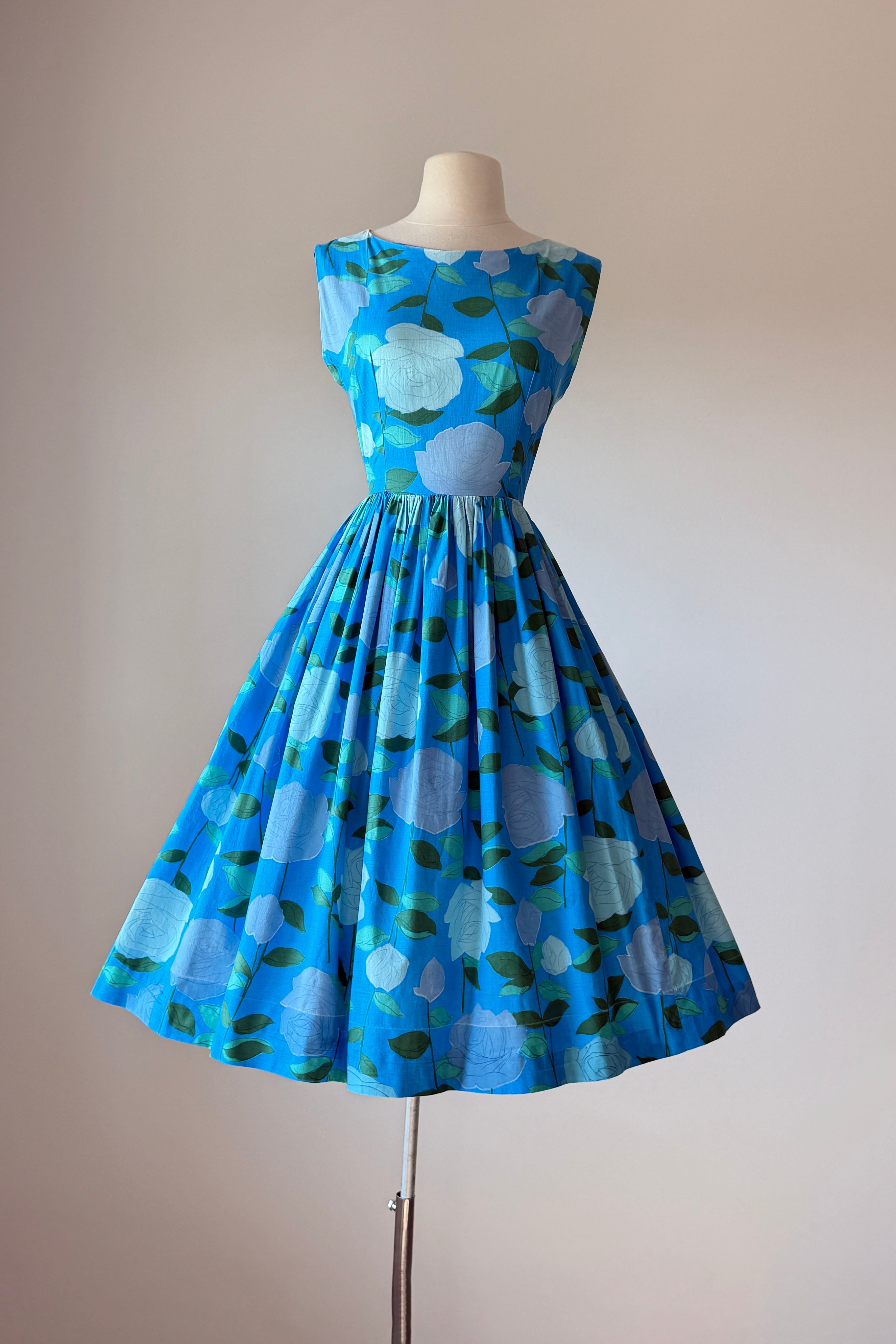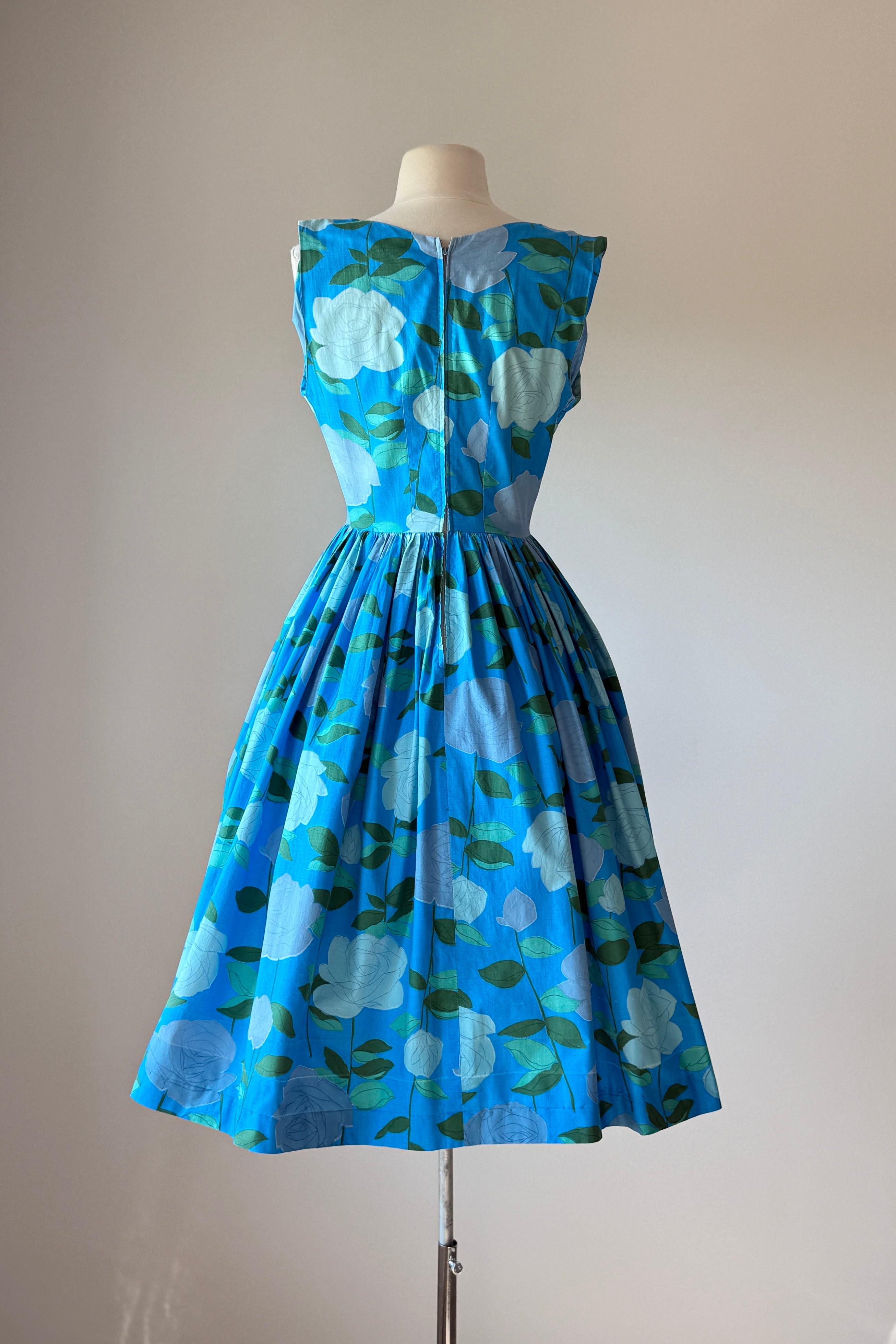 VINTAGE DRESS Vintage 1950s dress. Features large scale rose print on blue background, metal back zipper. Flat cotton. Good condition. Crease marks at hem where it's been let out to original lenght.Fits like XS.Length 43Bodice 16Bust 34Waist 23As with all vintage, please expect wear consistent with age. All sales are final. No order cancellations.0959 | 2615