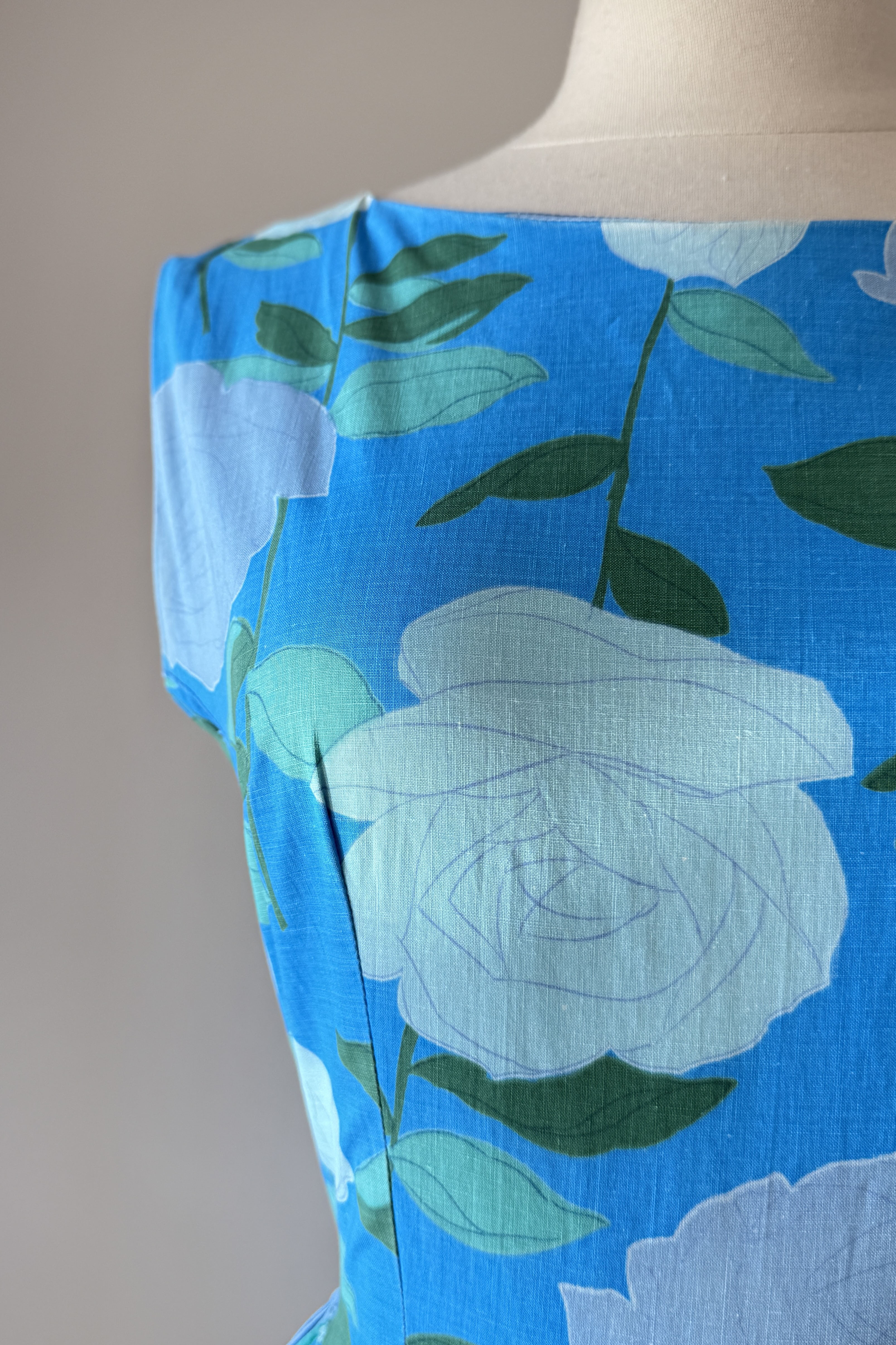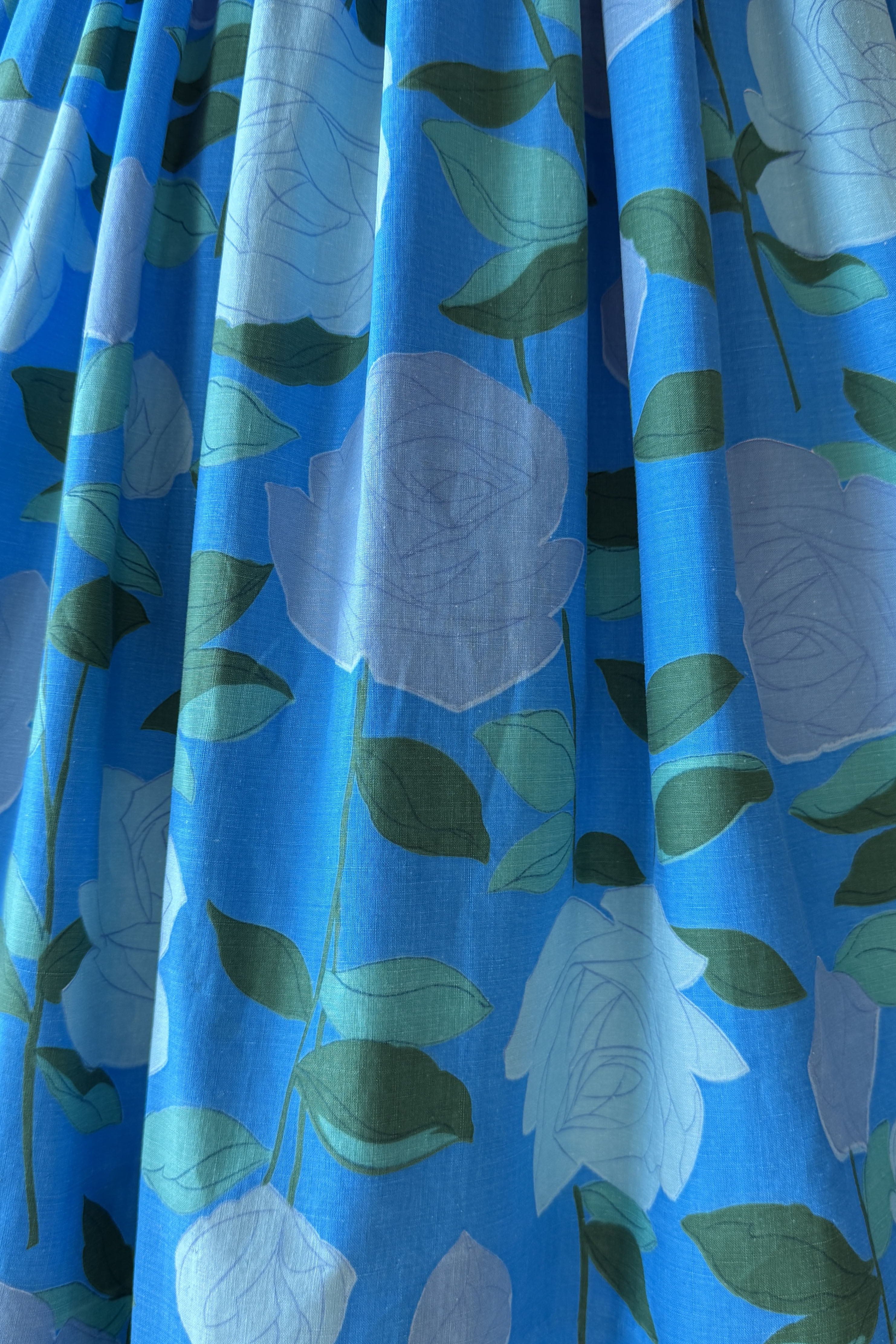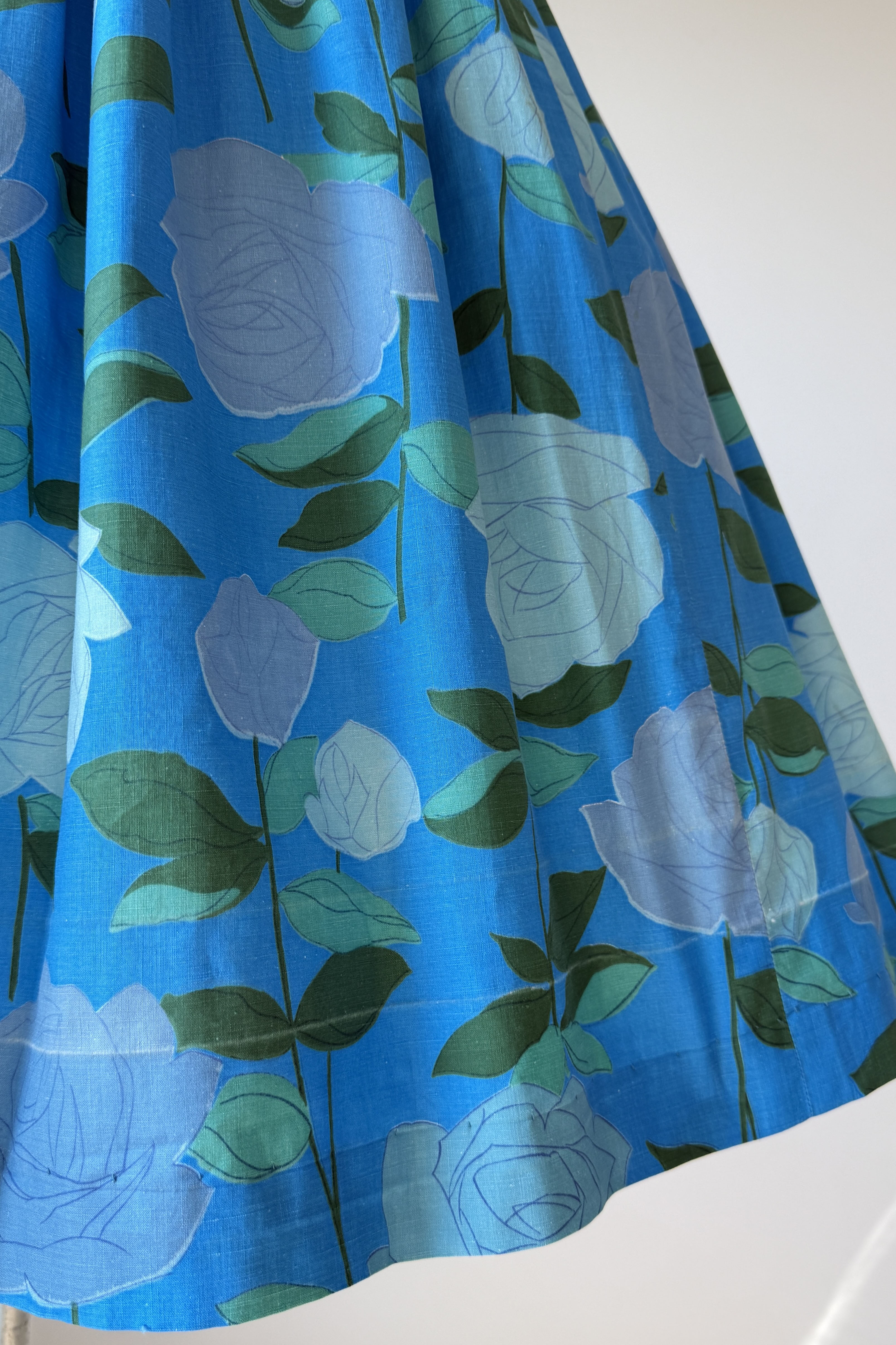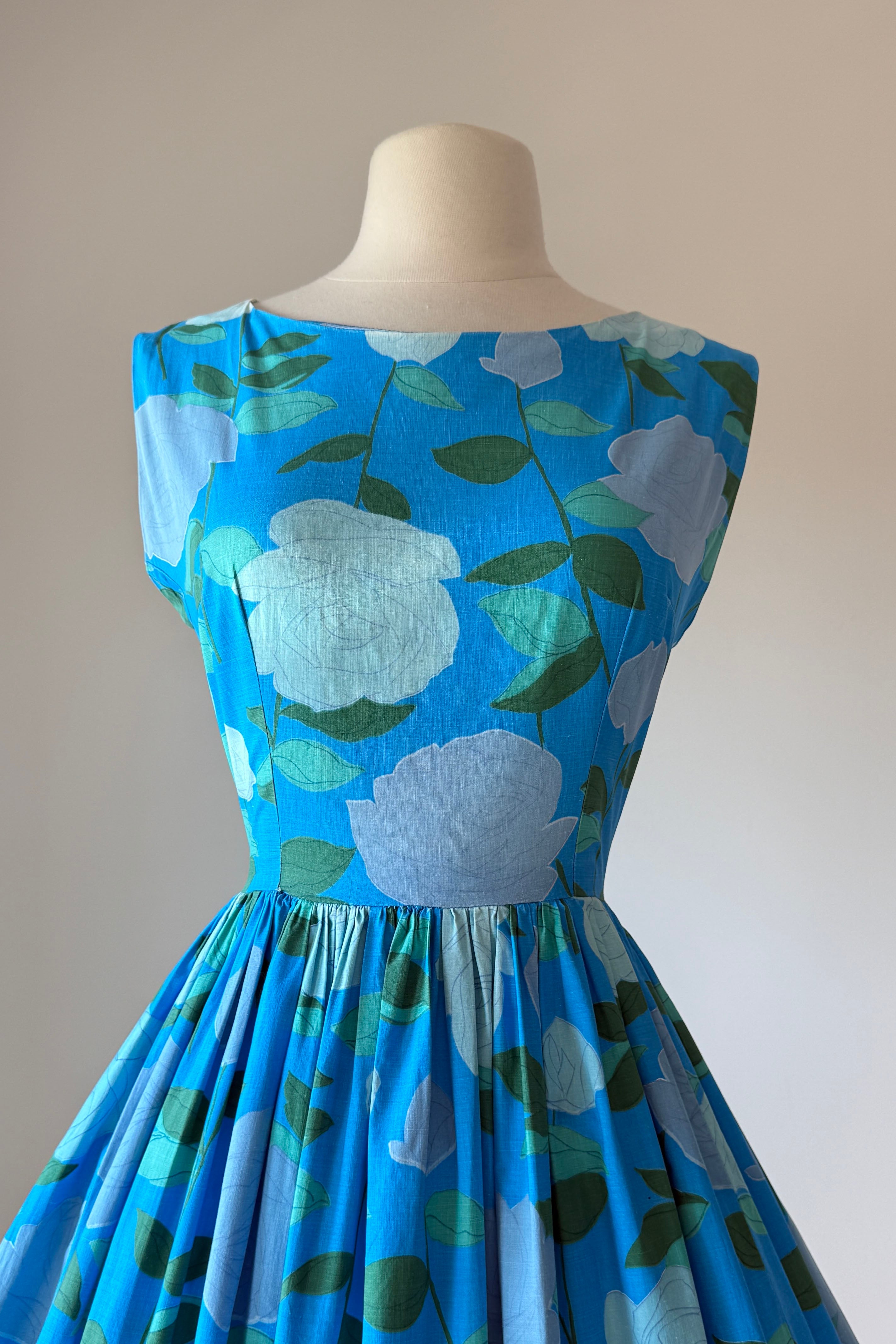 VINTAGE DRESS Vintage 1950s dress. Features large scale rose print on blue background, metal back zipper. Flat cotton. Good condition. Crease marks at hem where it's been let out to original lenght.Fits like XS.Length 43Bodice 16Bust 34Waist 23As with all vintage, please expect wear consistent with age. All sales are final. No order cancellations.0959 | 2615